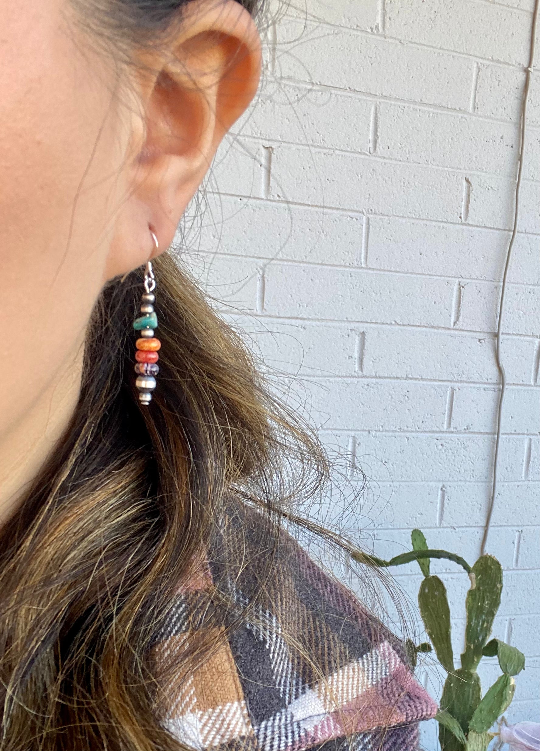 Navajo Made Multi Stone & Sterling Silver Pearl Dangle Earrings. They measure 1 3/4 inches long and 1/4 of an inch wide. Stones will differ due to natural stones.
