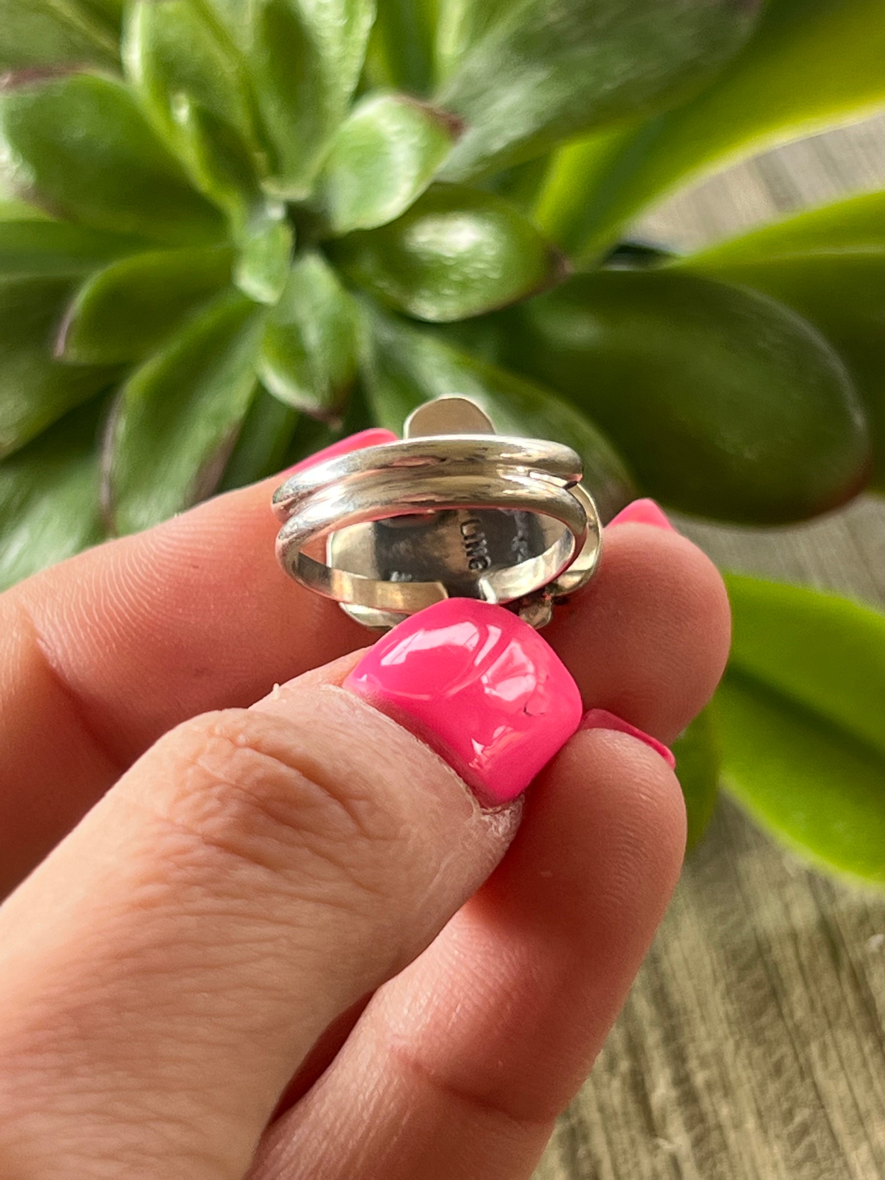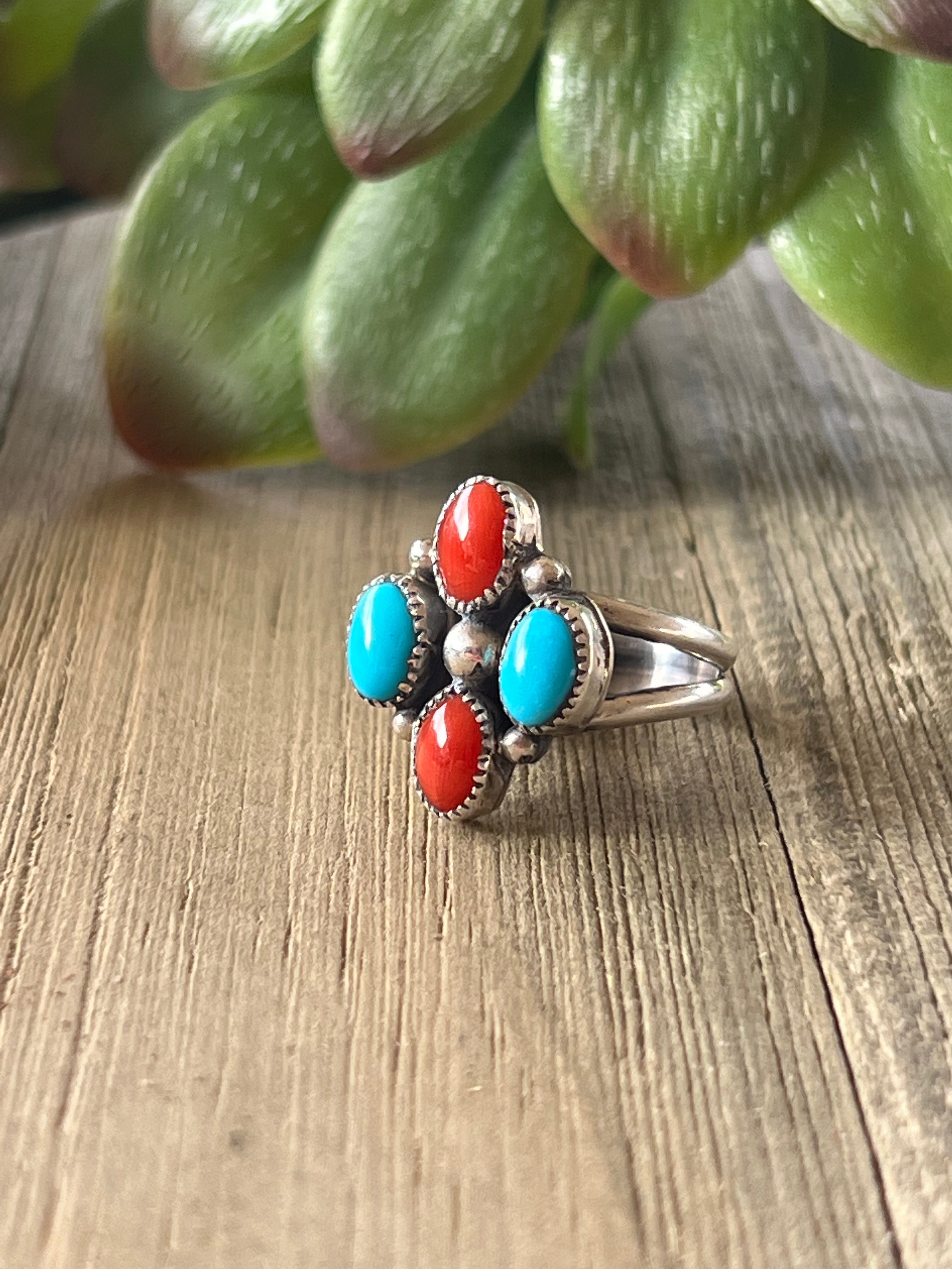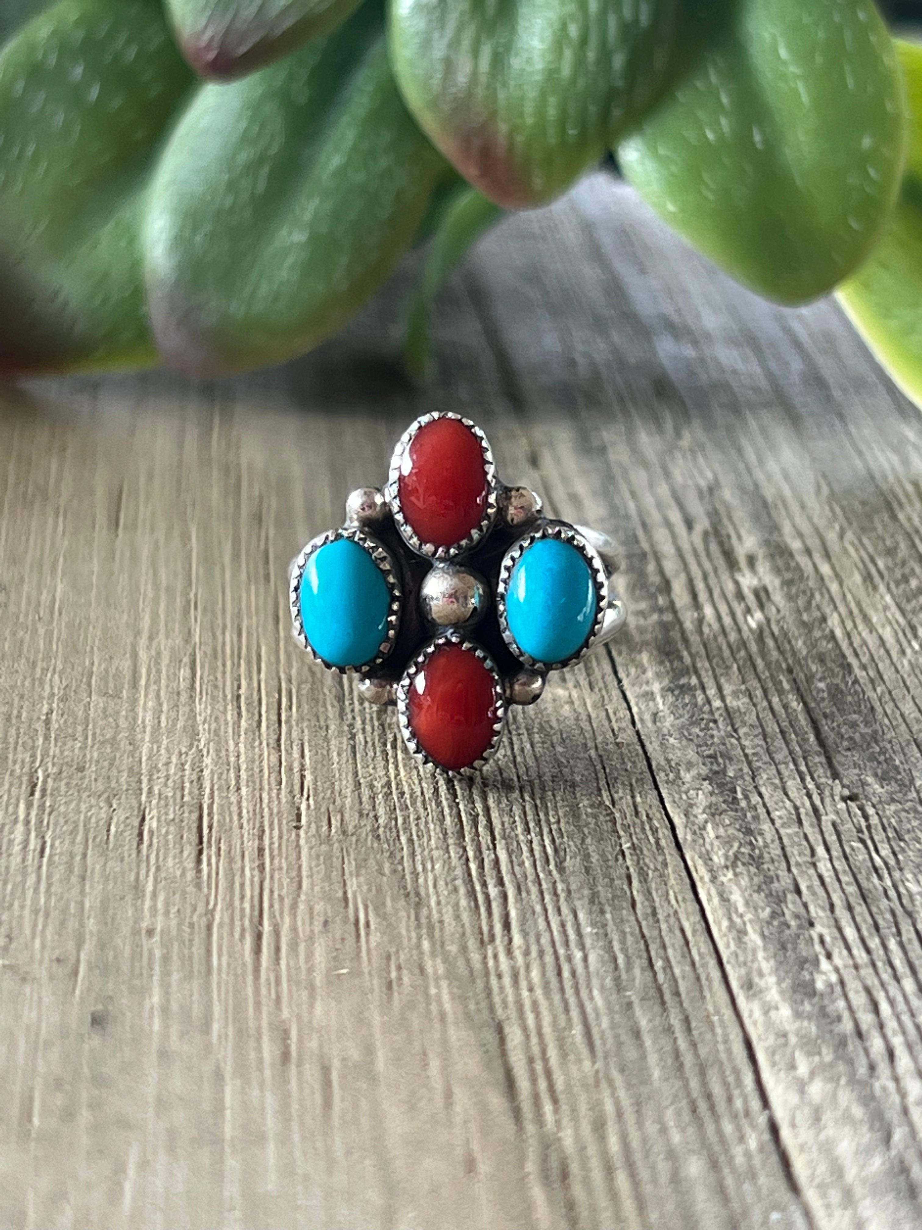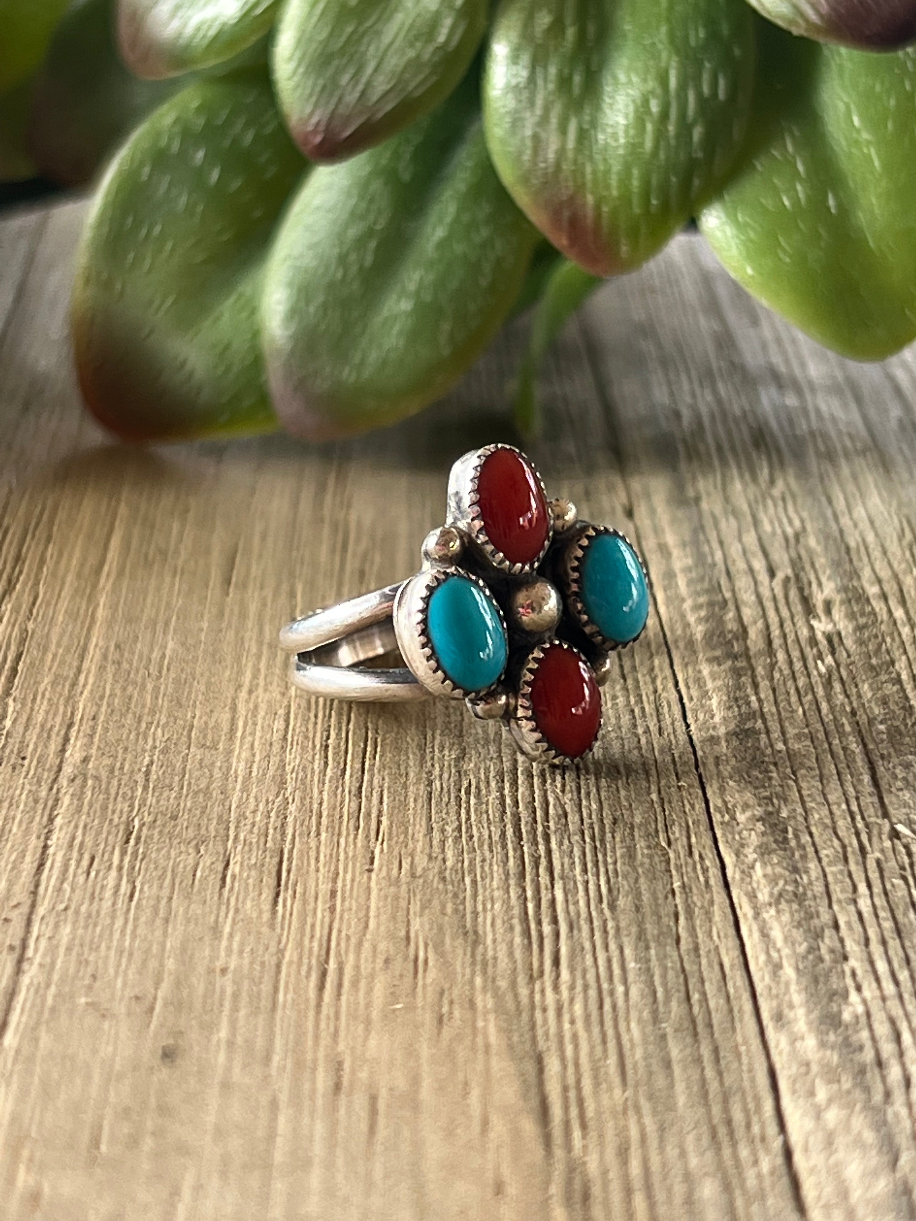 Navajo Made Multi Stone & Sterling Silver Ring. It measures 3/4 of an inch long and 5/8 of an inch wide. Signed by artist and stamped sterling silver.