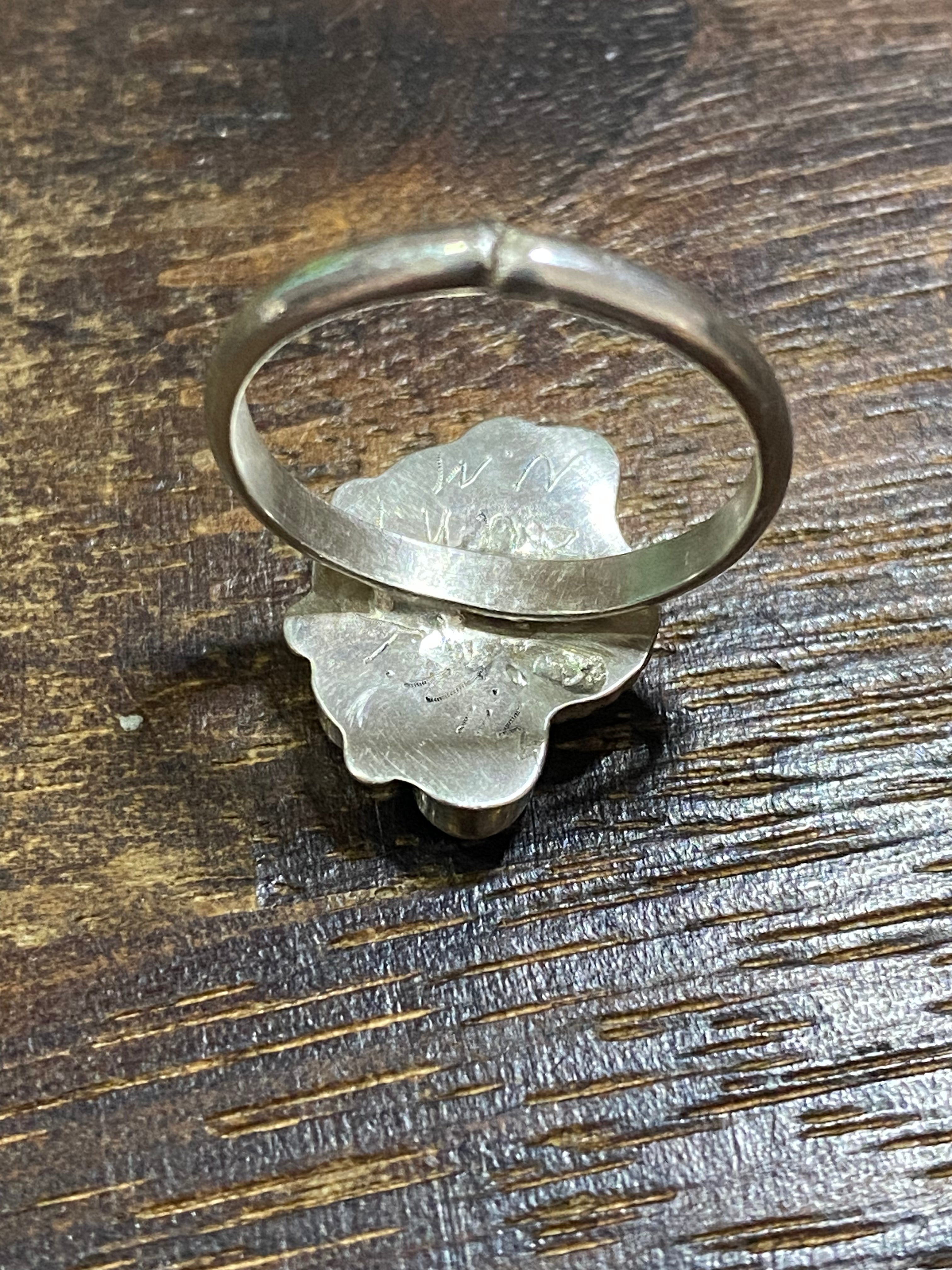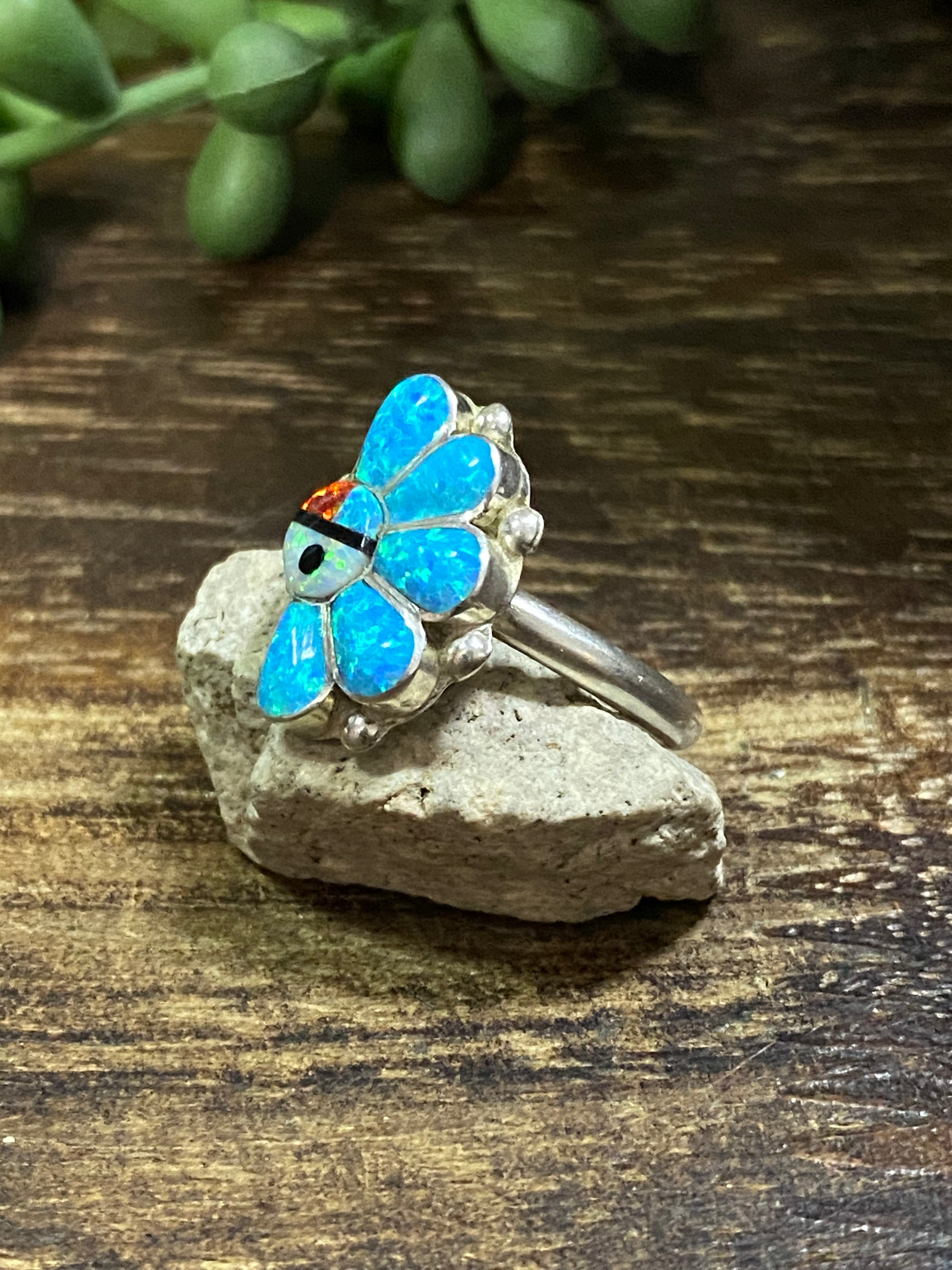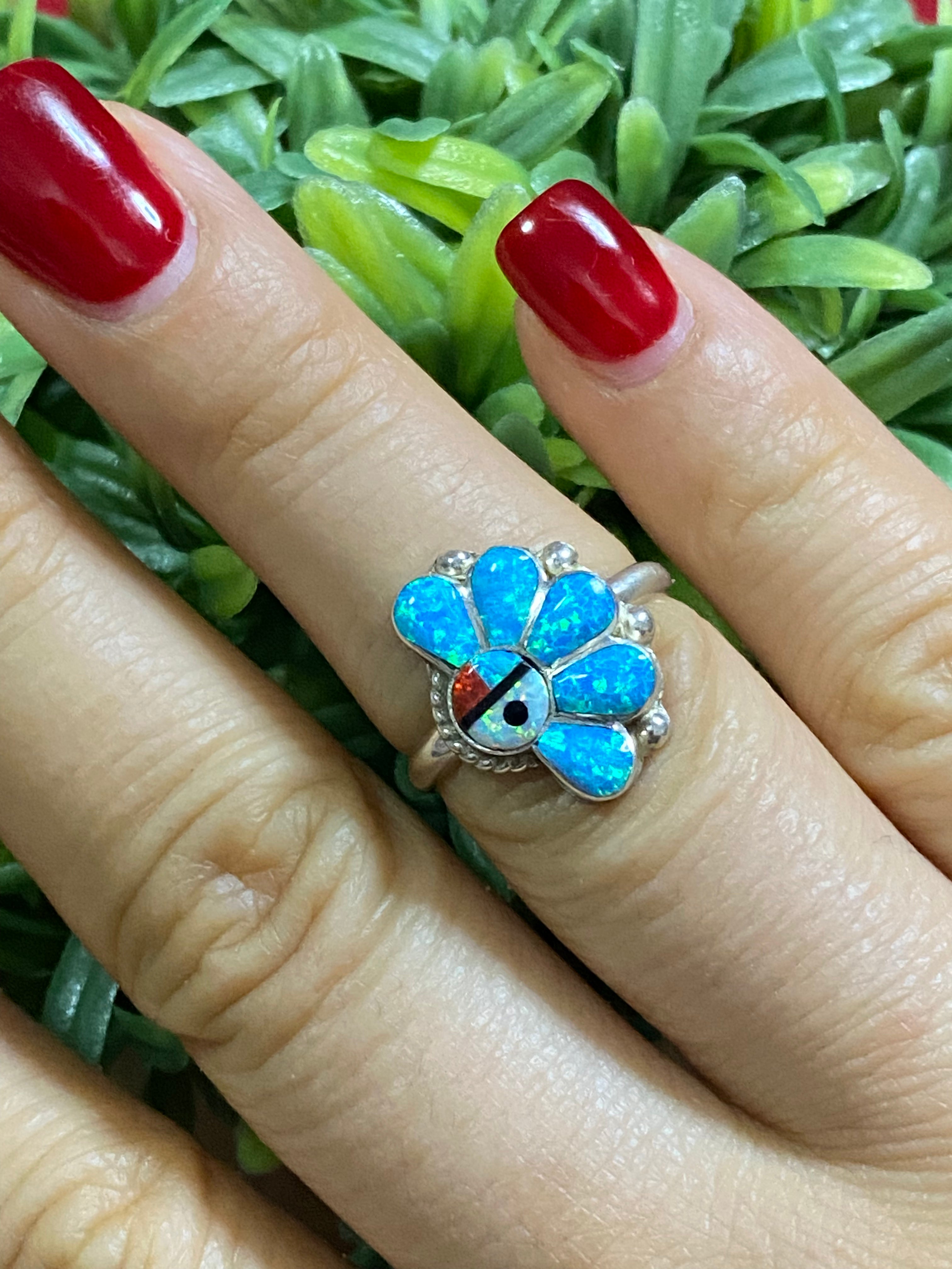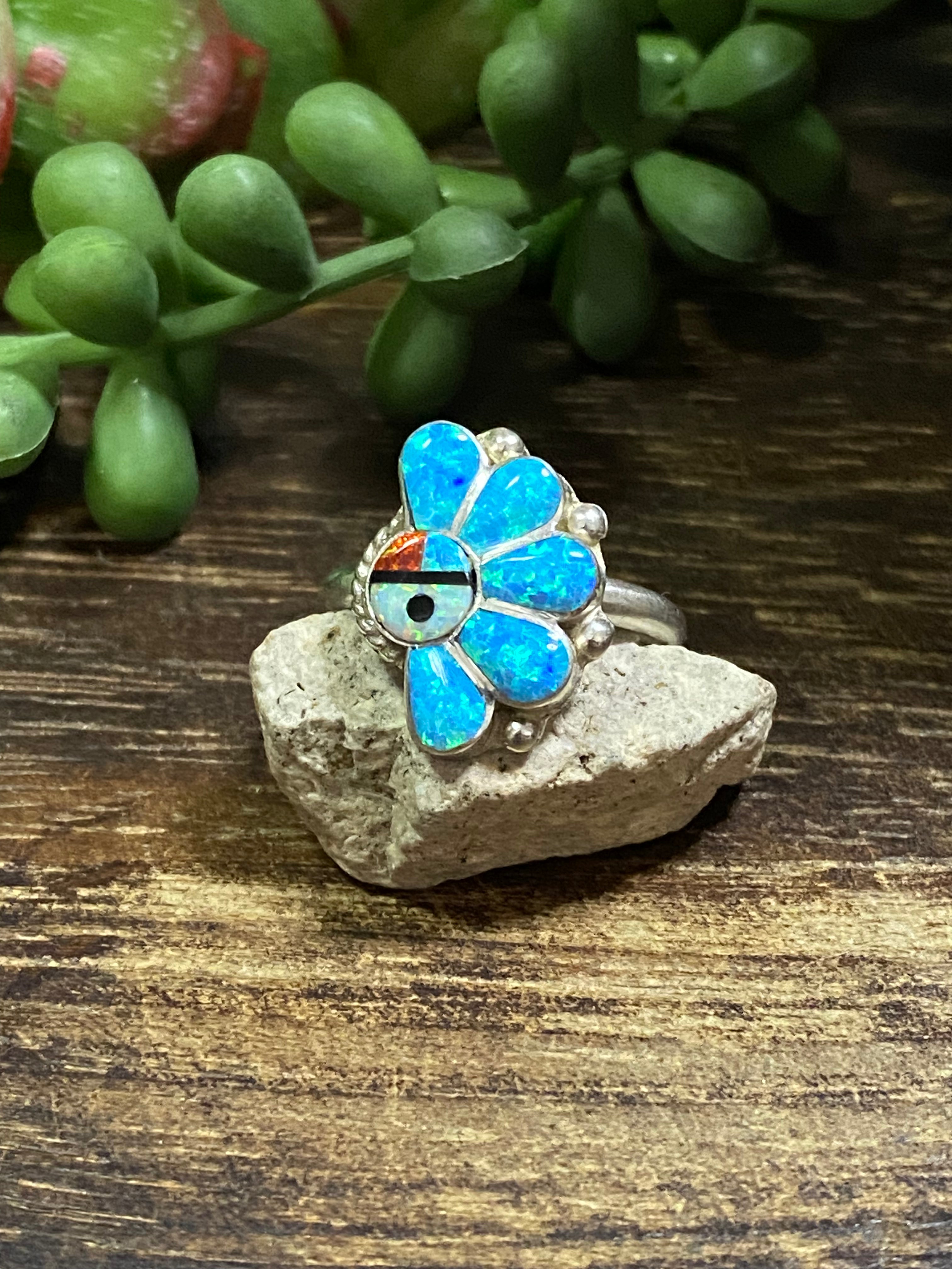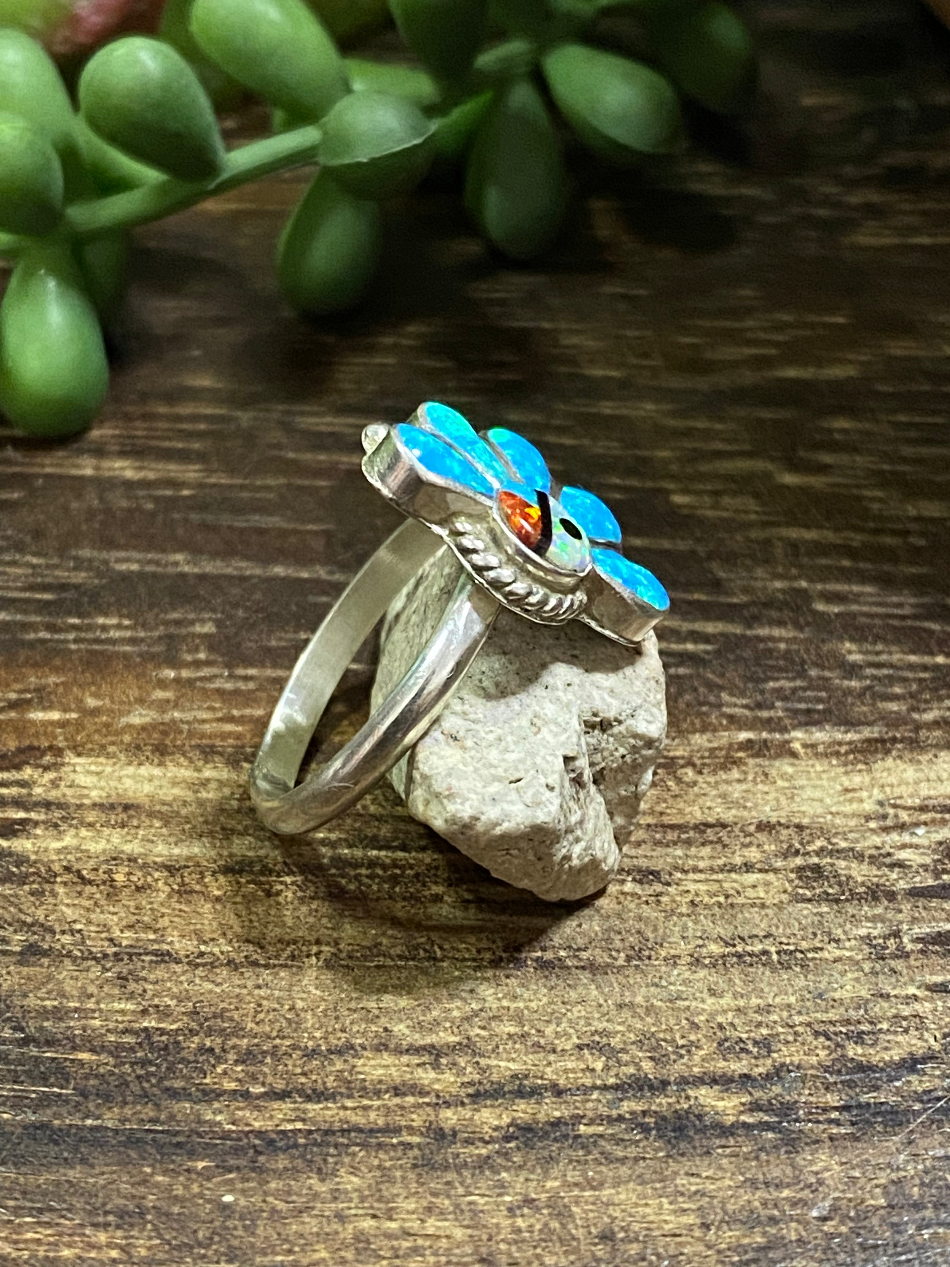 Navajo Made Multi Stone & Sterling Silver Sunface Inlay Ring Size 7.25