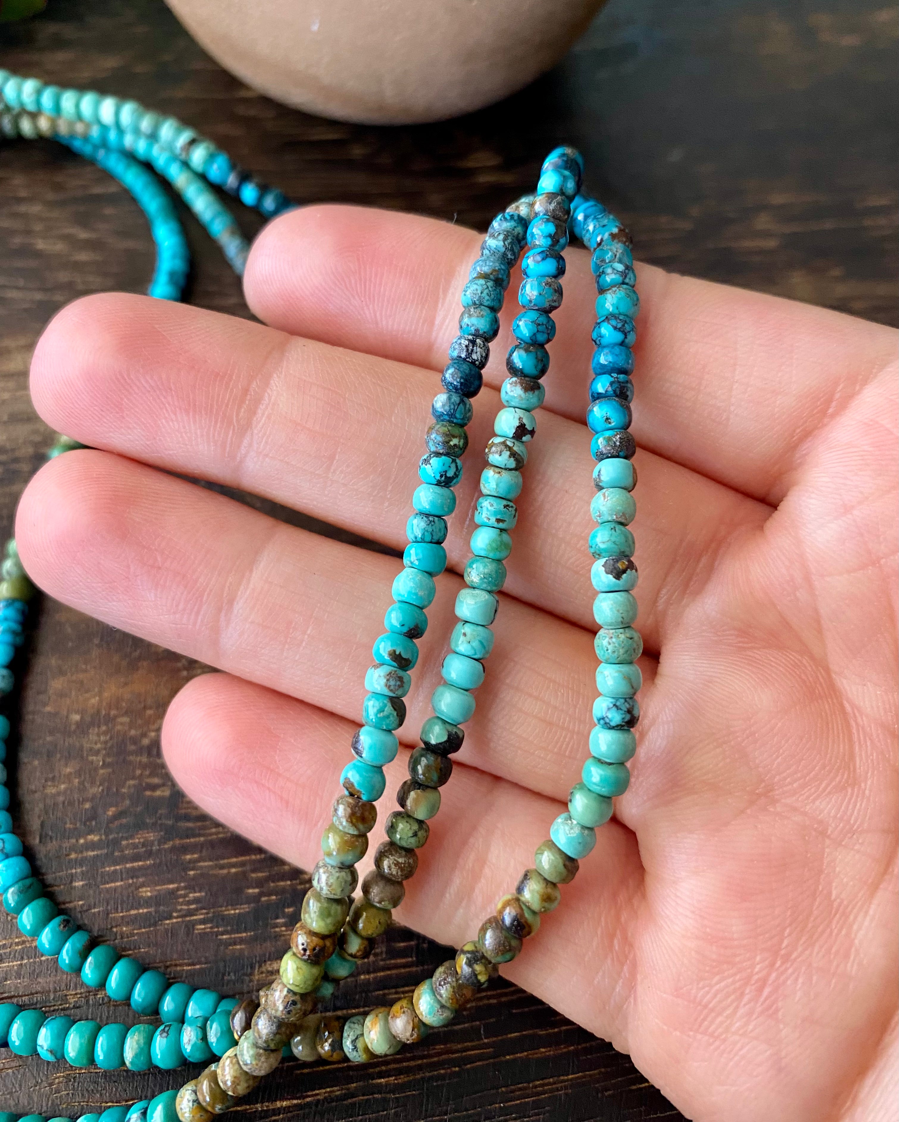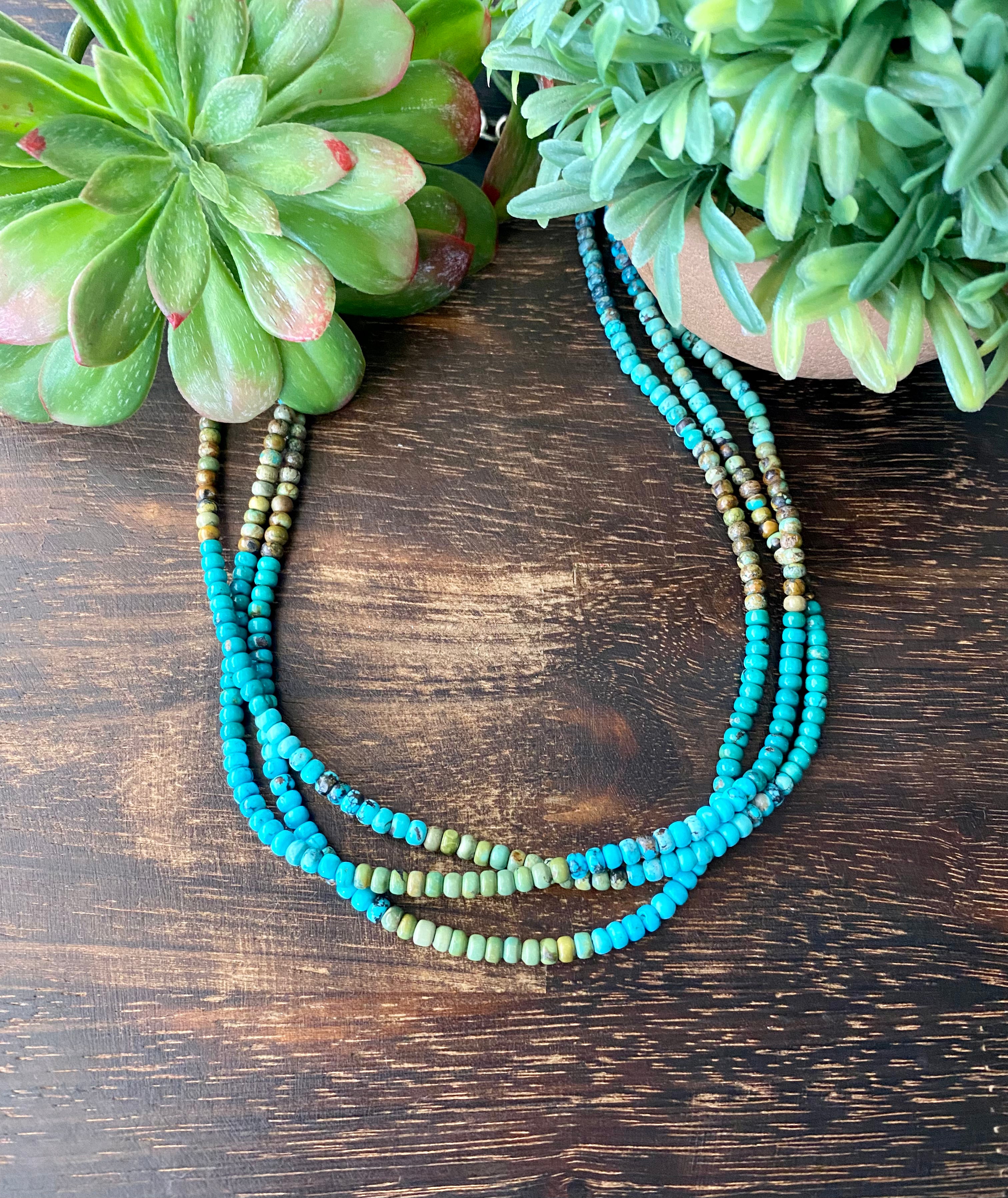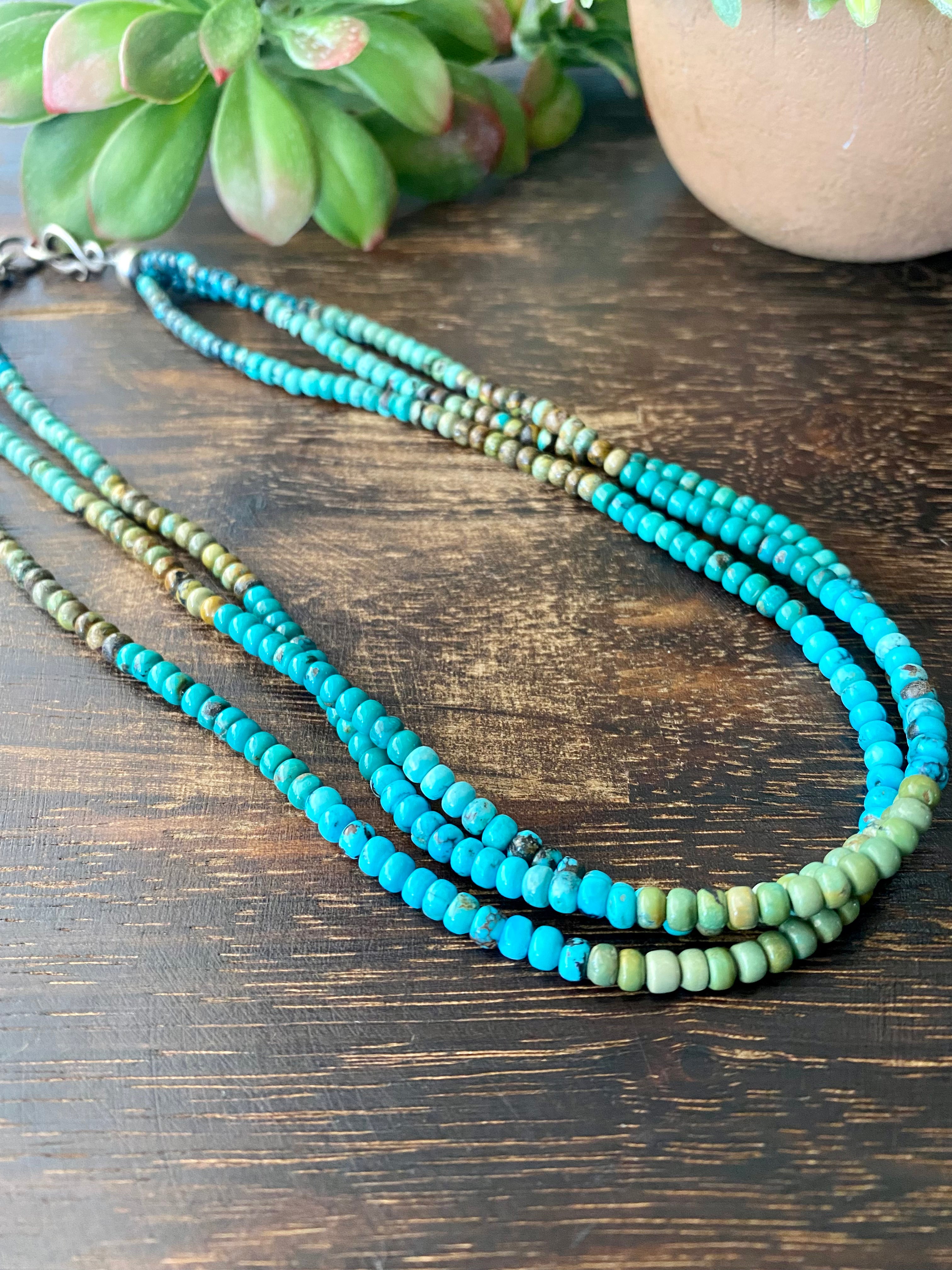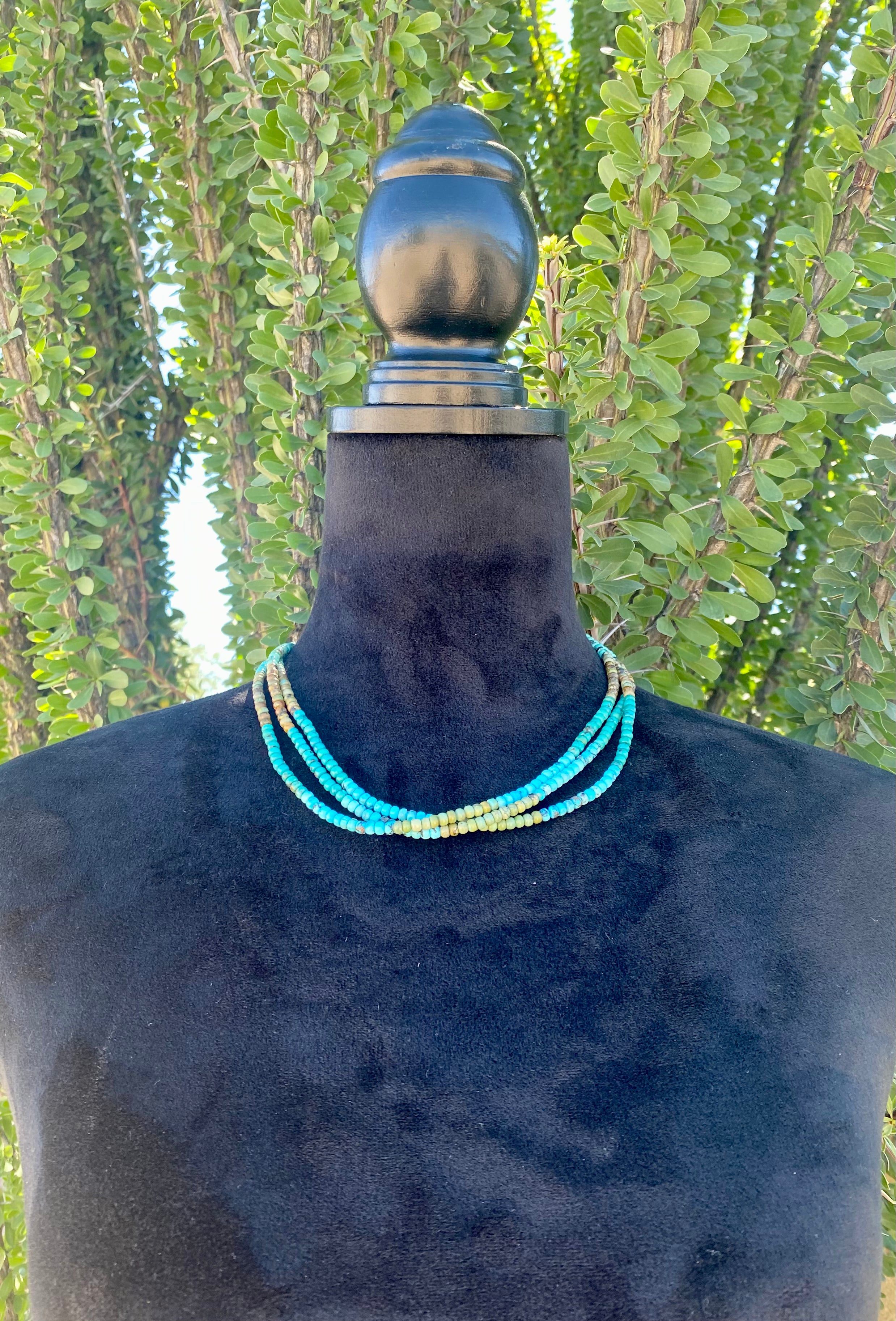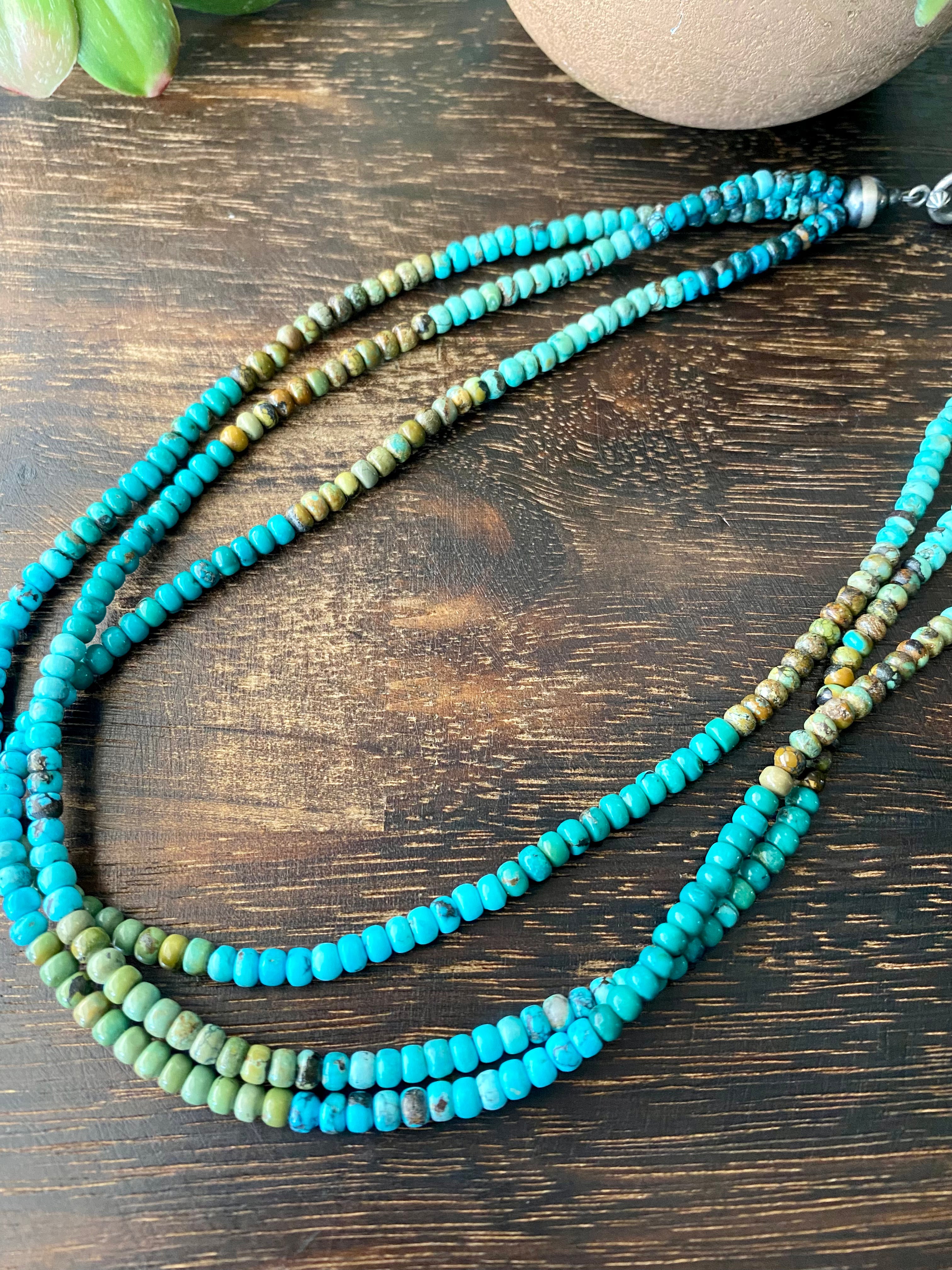 Navajo Made Multi Turquoise & Sterling Silver Multi Strand Pearl Necklace. It has 3 strands and the necklace itself measures 19 inches long but can adjust down to 17 1/2 inches. It is a beautiful necklace.