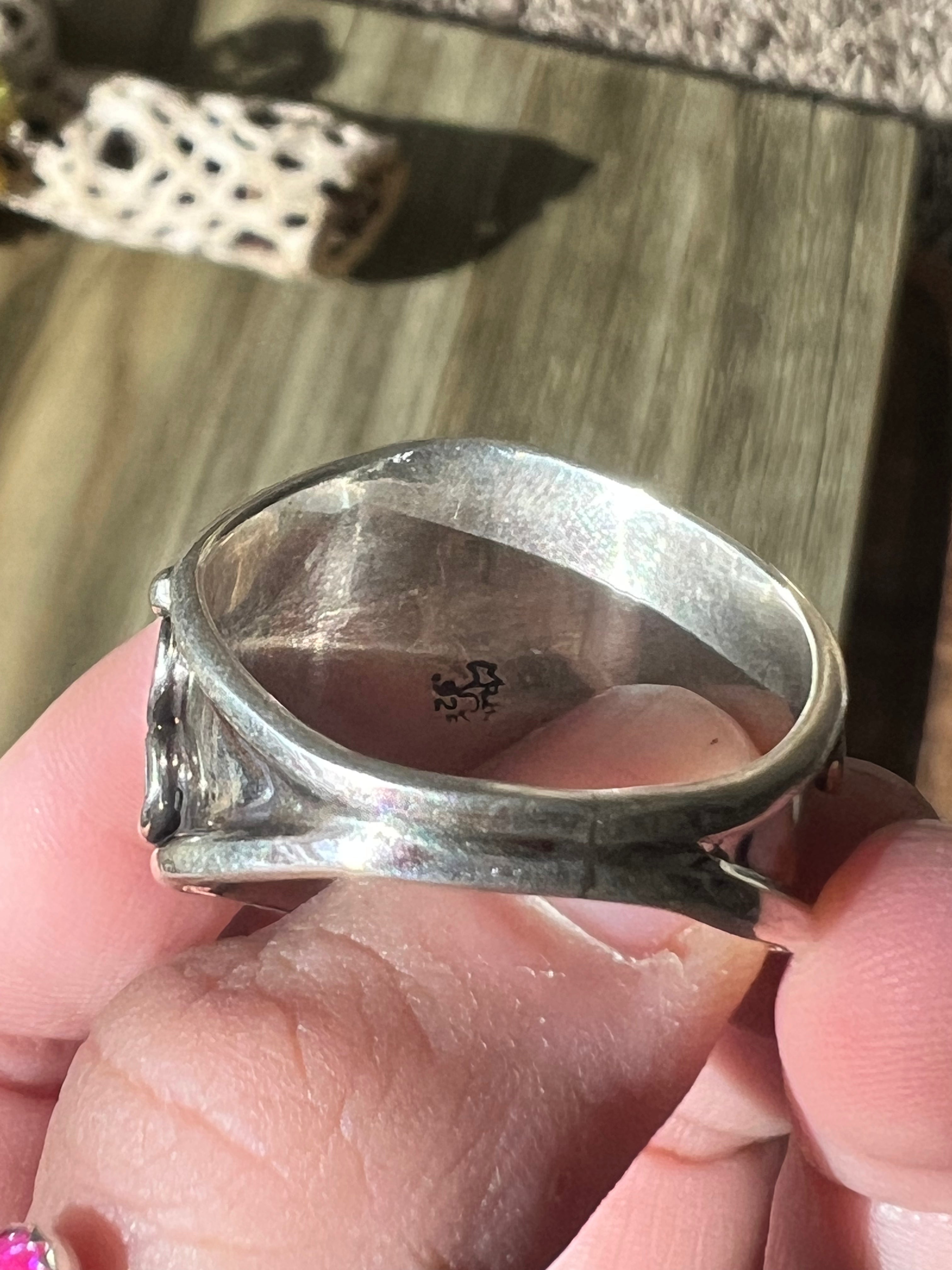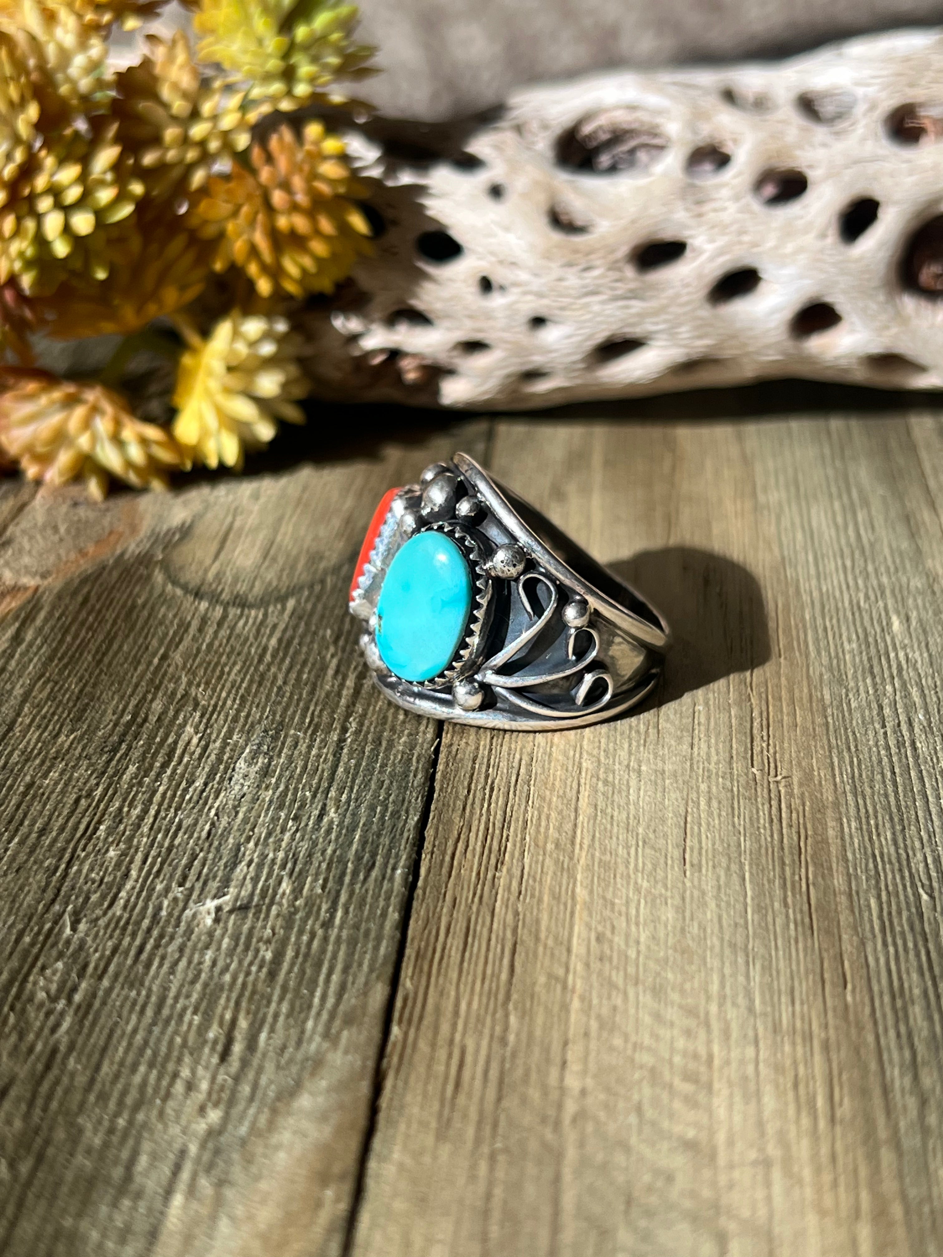 Navajo Made Mutli Stone & Sterling Silver Ring Size 13.25. It measures 7/8 of an inch long and just under 1 inch wide. Signed by artist and stamped sterling silver.