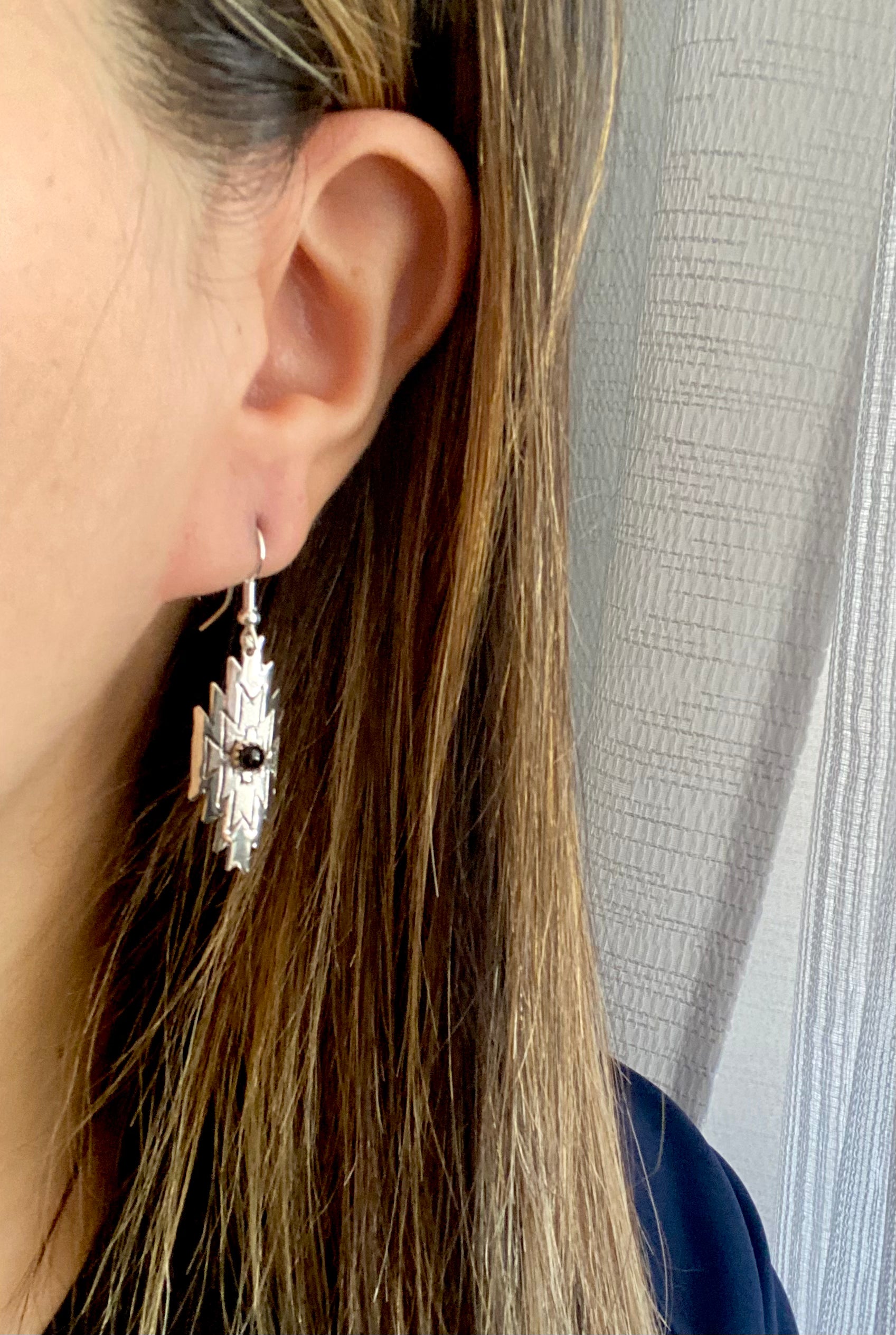 Navajo Made Onyx & Sterling Silver Dangle Earrings. They measure 2 inches long and just over 1/2 of an inch wide.
