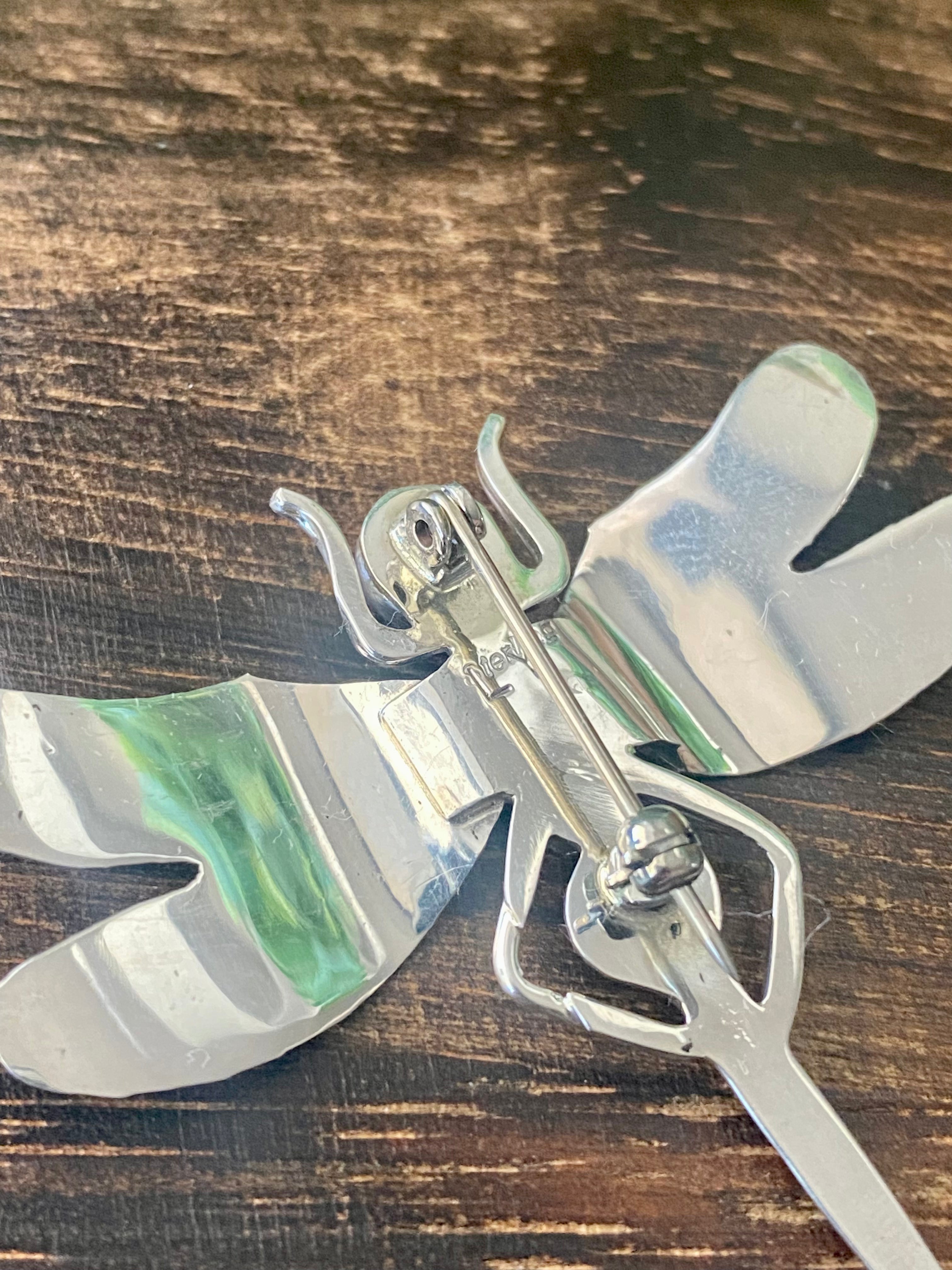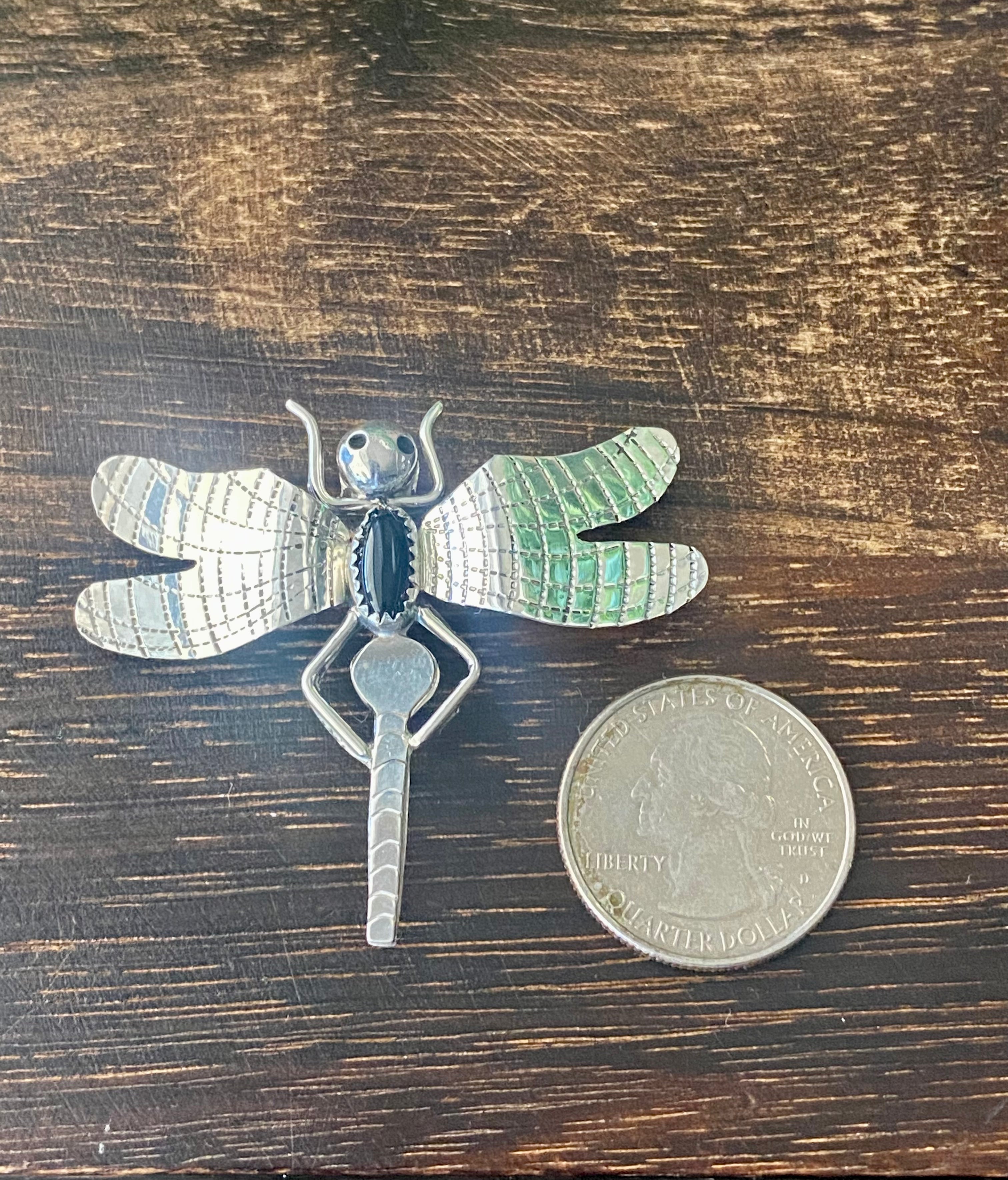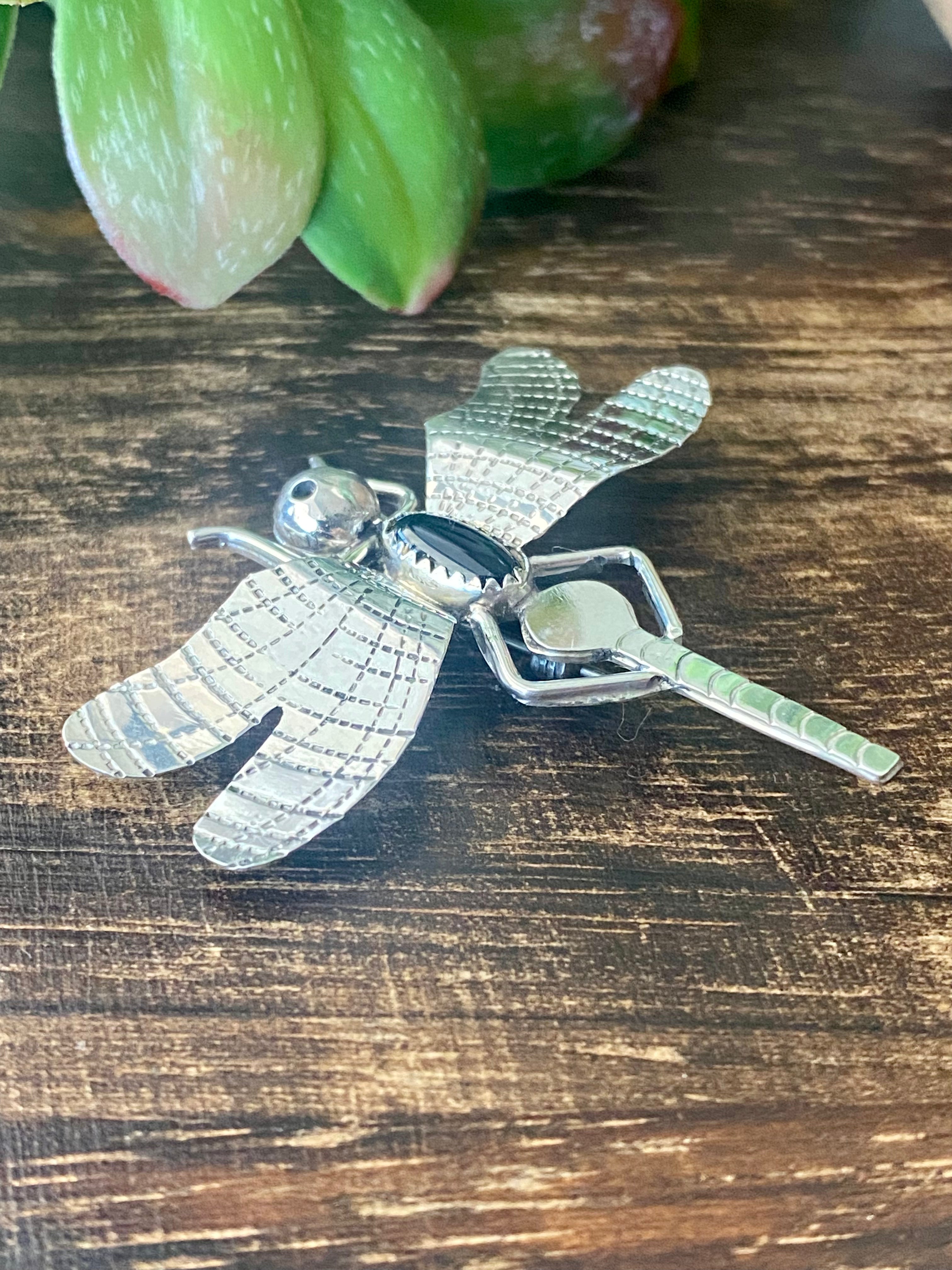 Navajo Made Onyx & Sterling Silver Dragonfly Pin. It measures 1 7/8 inches long and 2 1/8 inches wide. Signed by the artist and stamped sterling silver.