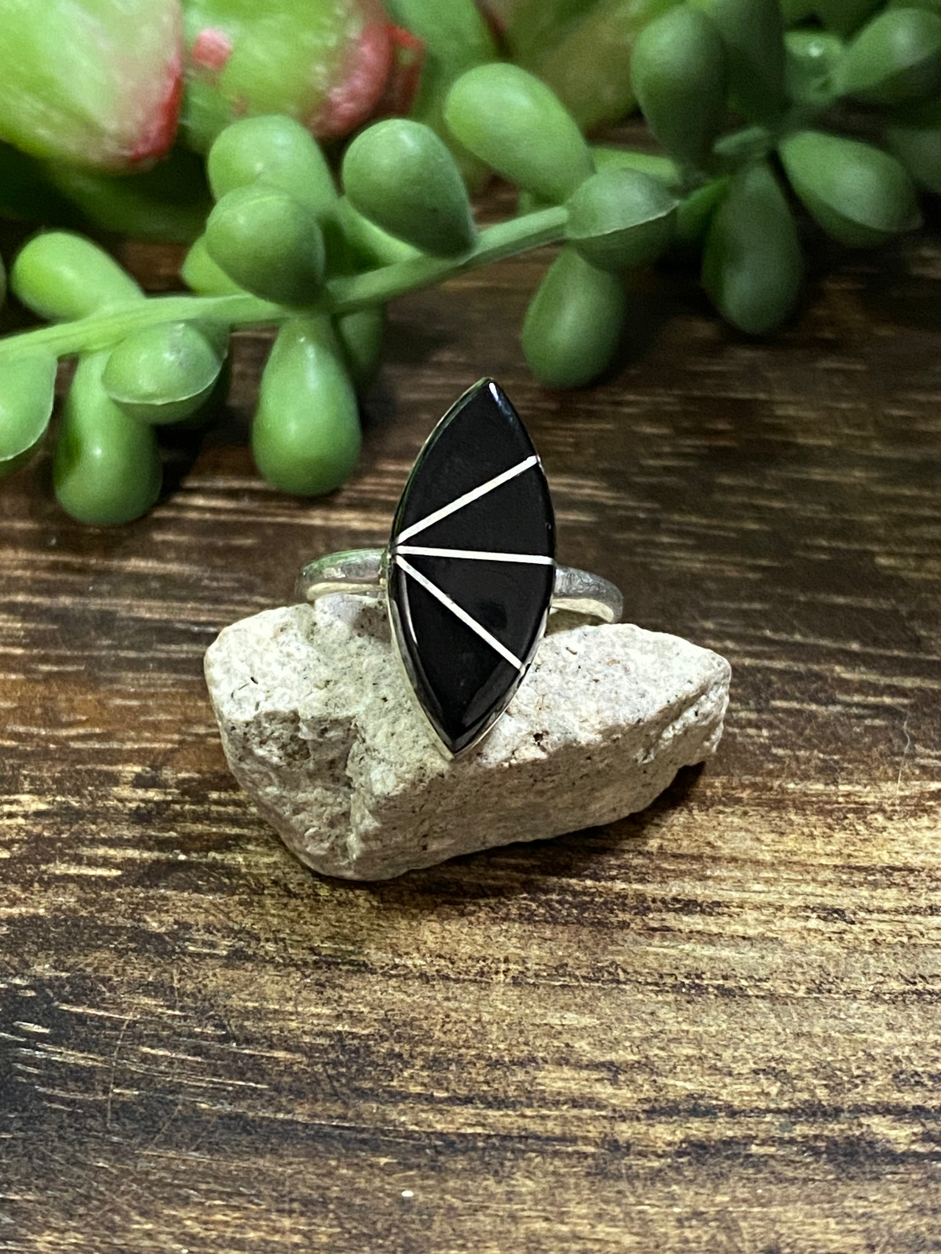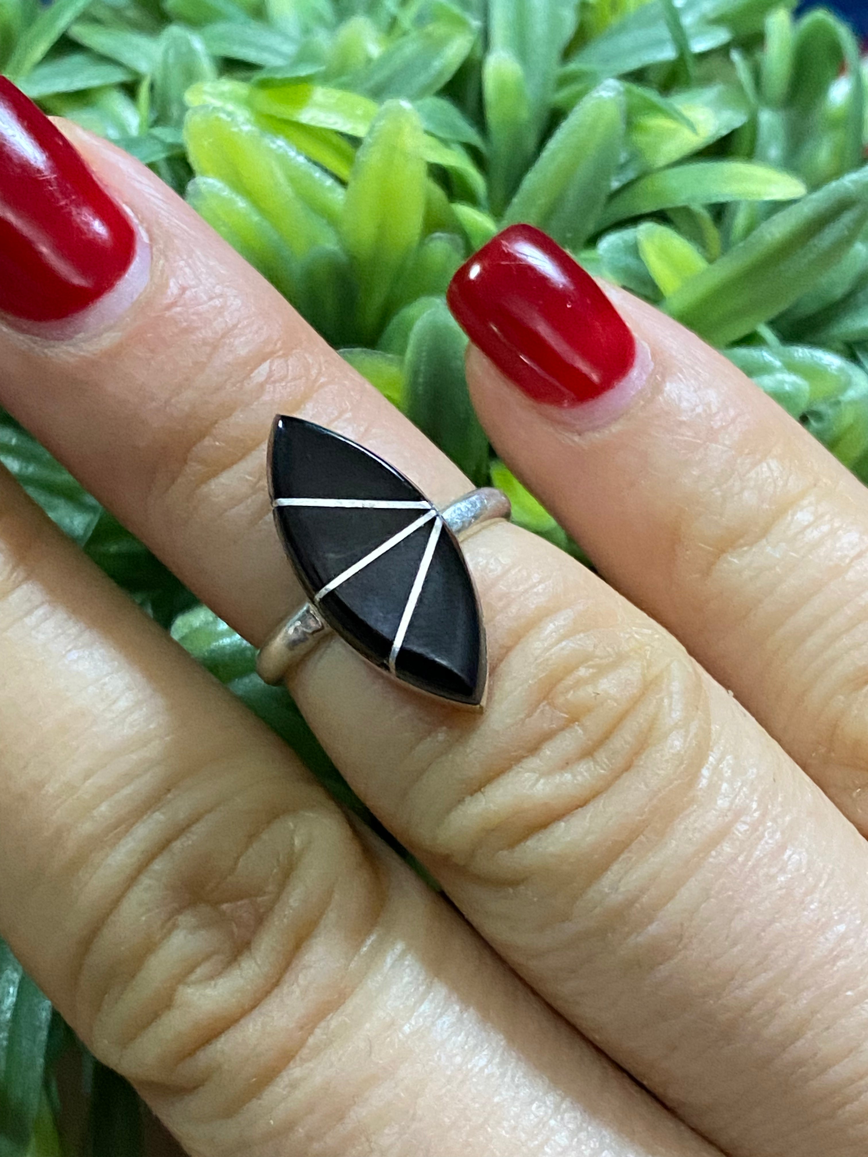 Navajo Made Onyx & Sterling Silver Inlay Ring Size 4.75. It measures 3/4 of an inch long and just over 1/4 of an inch wide. Signed by the artist.
