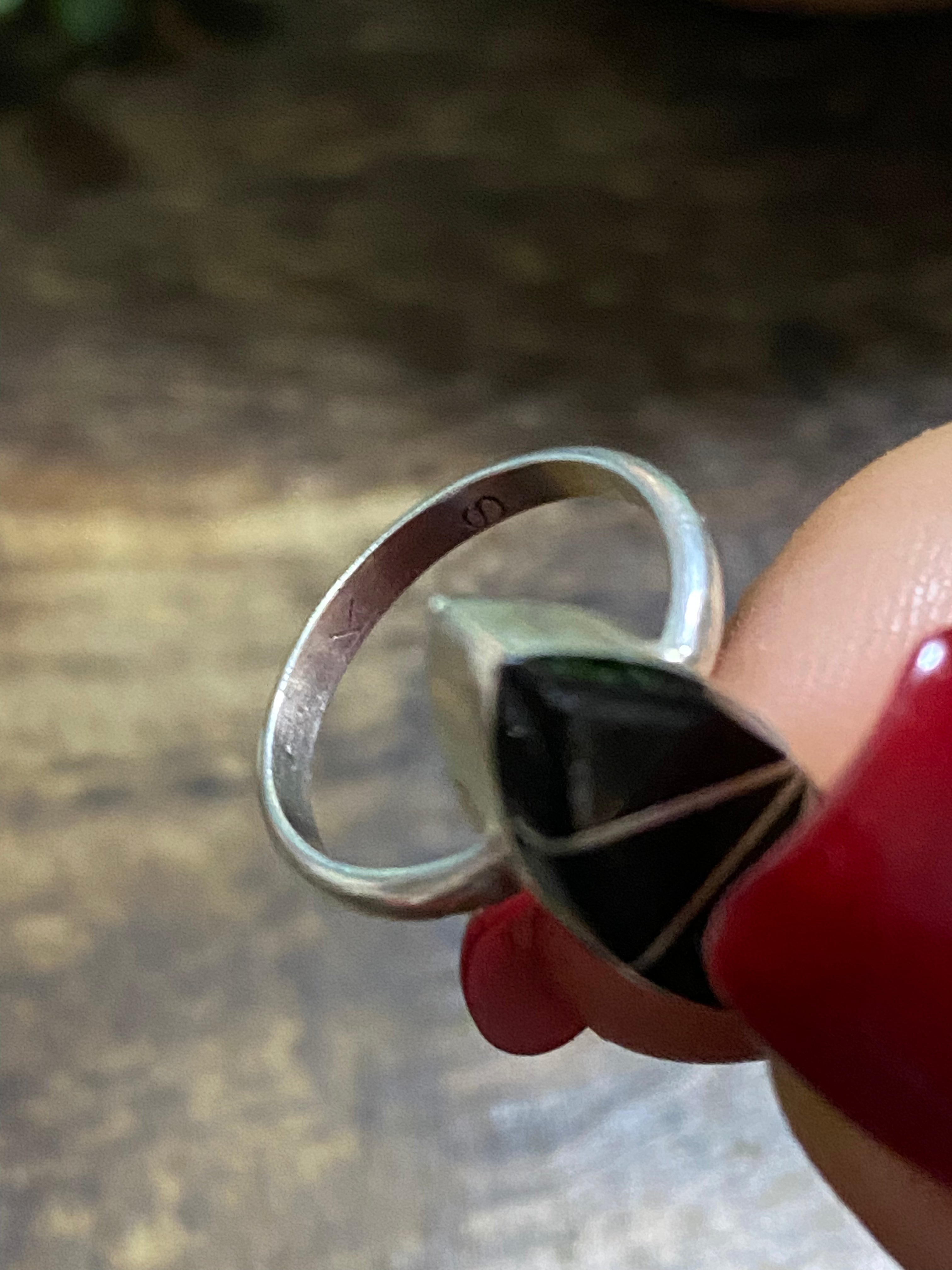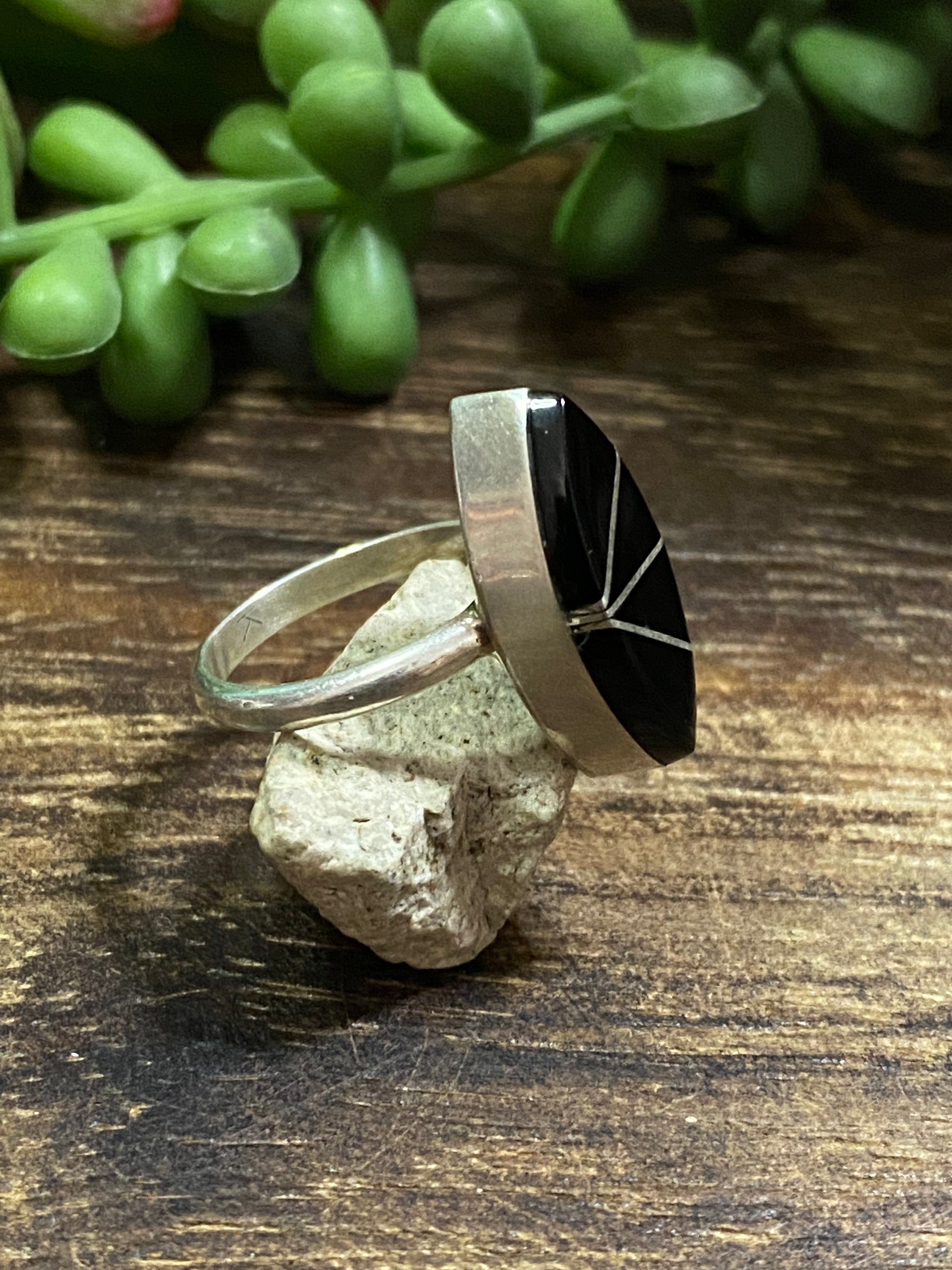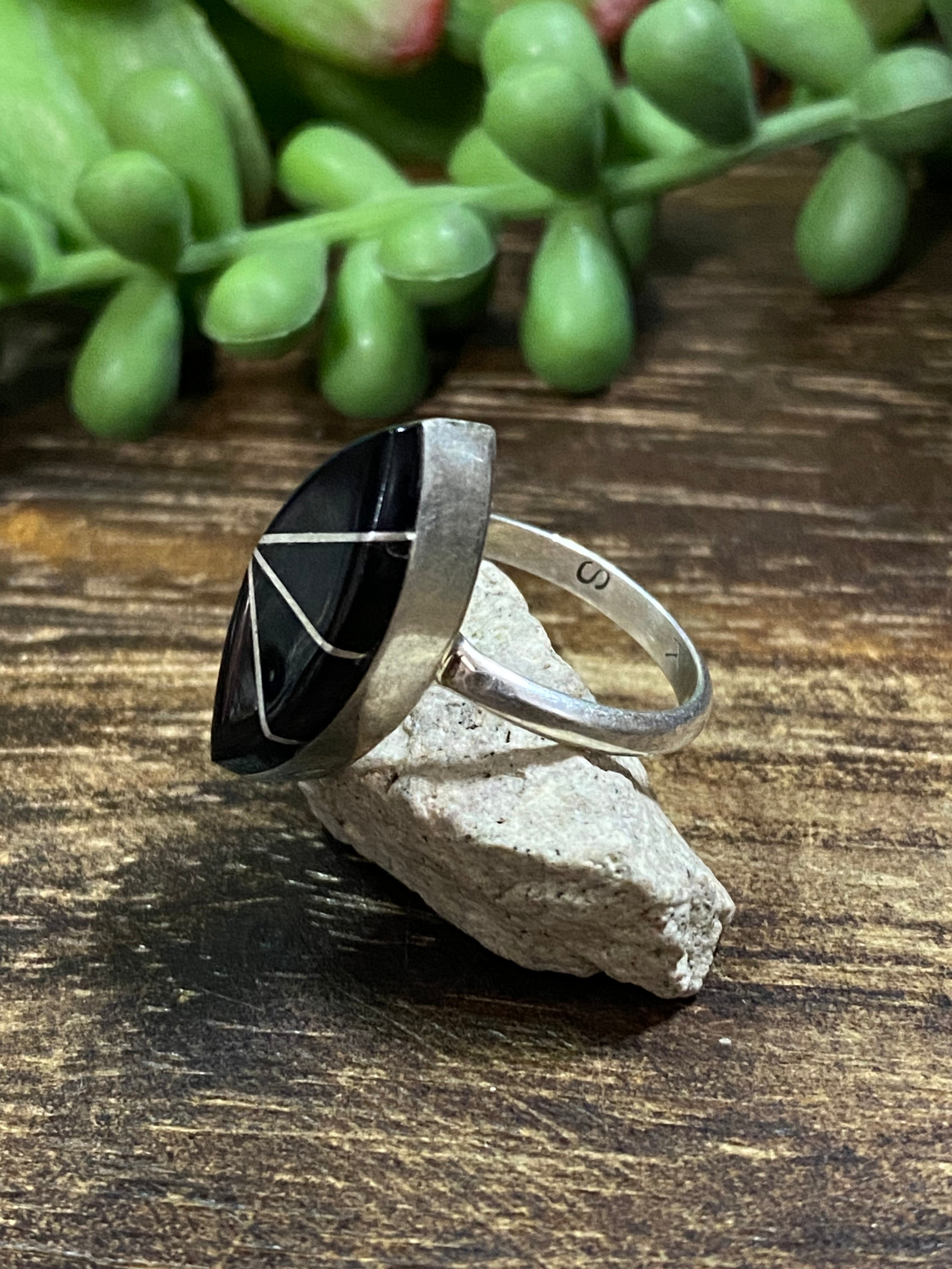 Navajo Made Onyx & Sterling Silver Inlay Ring Size 4.75