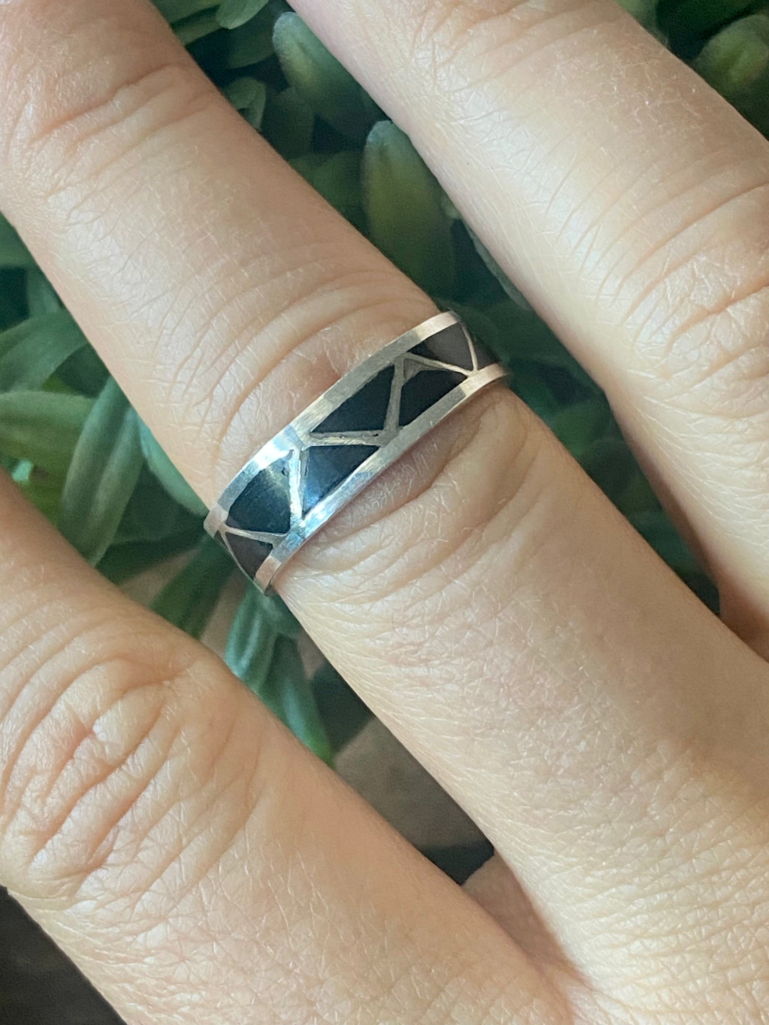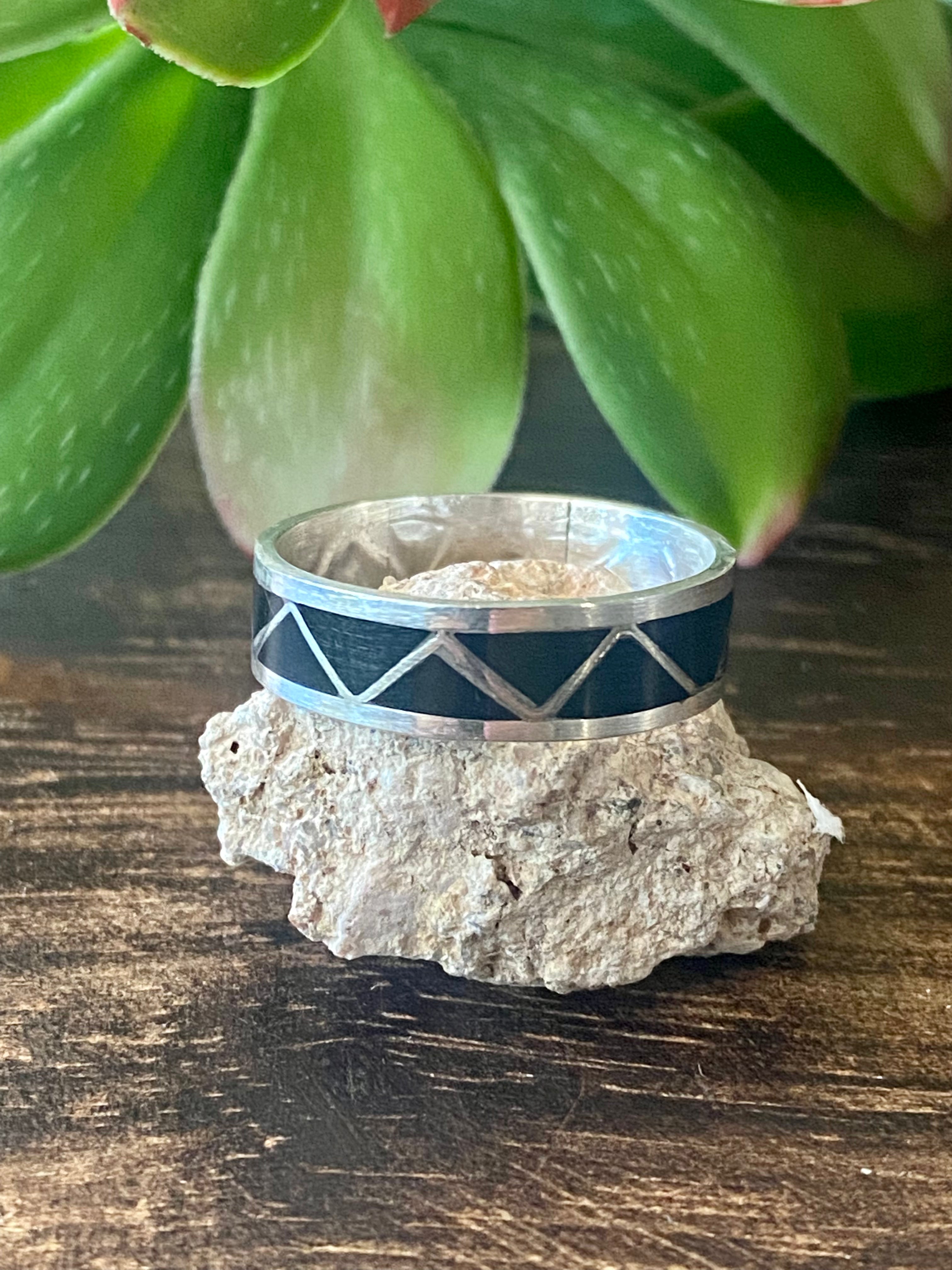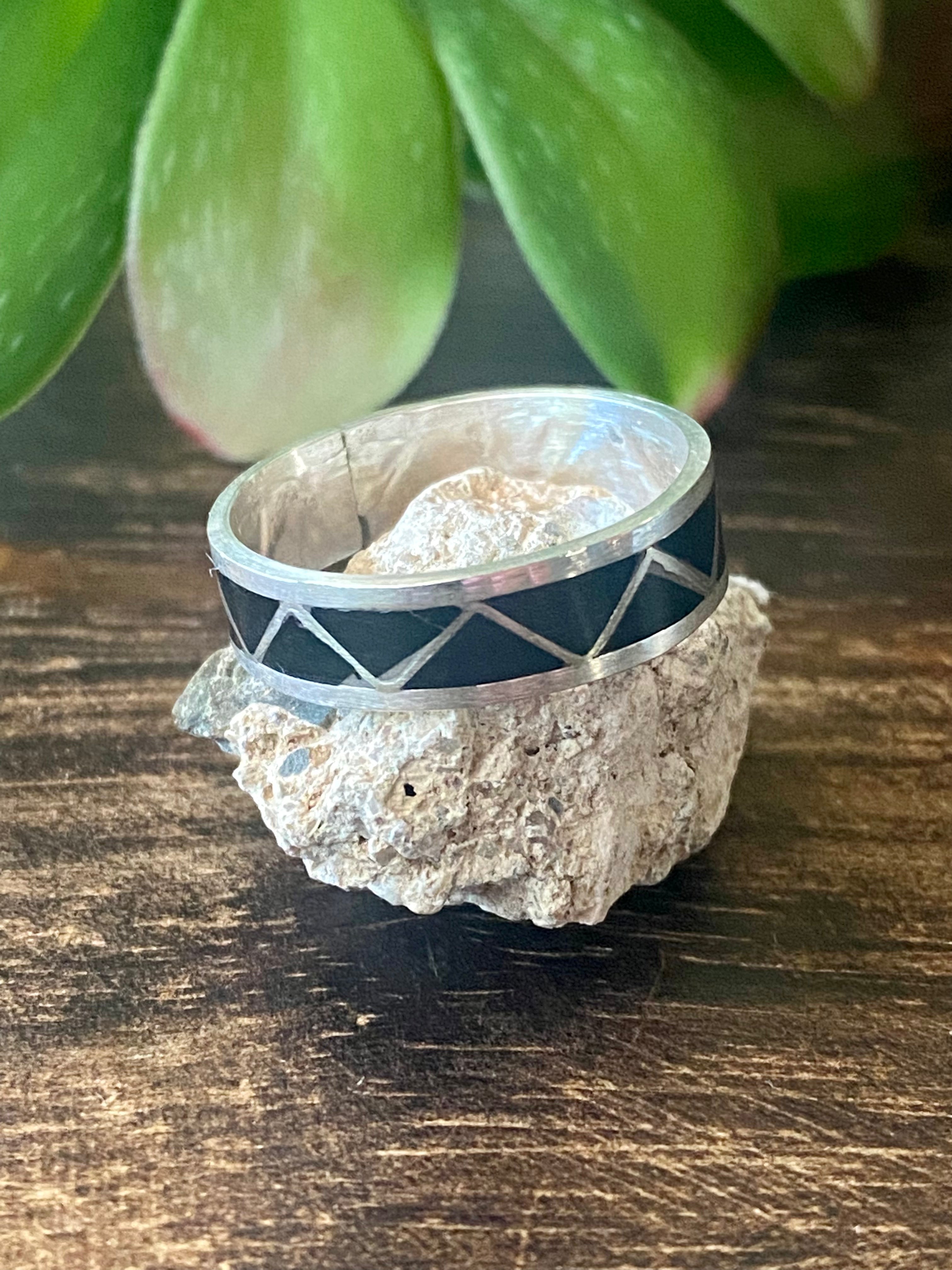 Navajo Made Onyx & Sterling Silver Inlay Ring Size 9.25