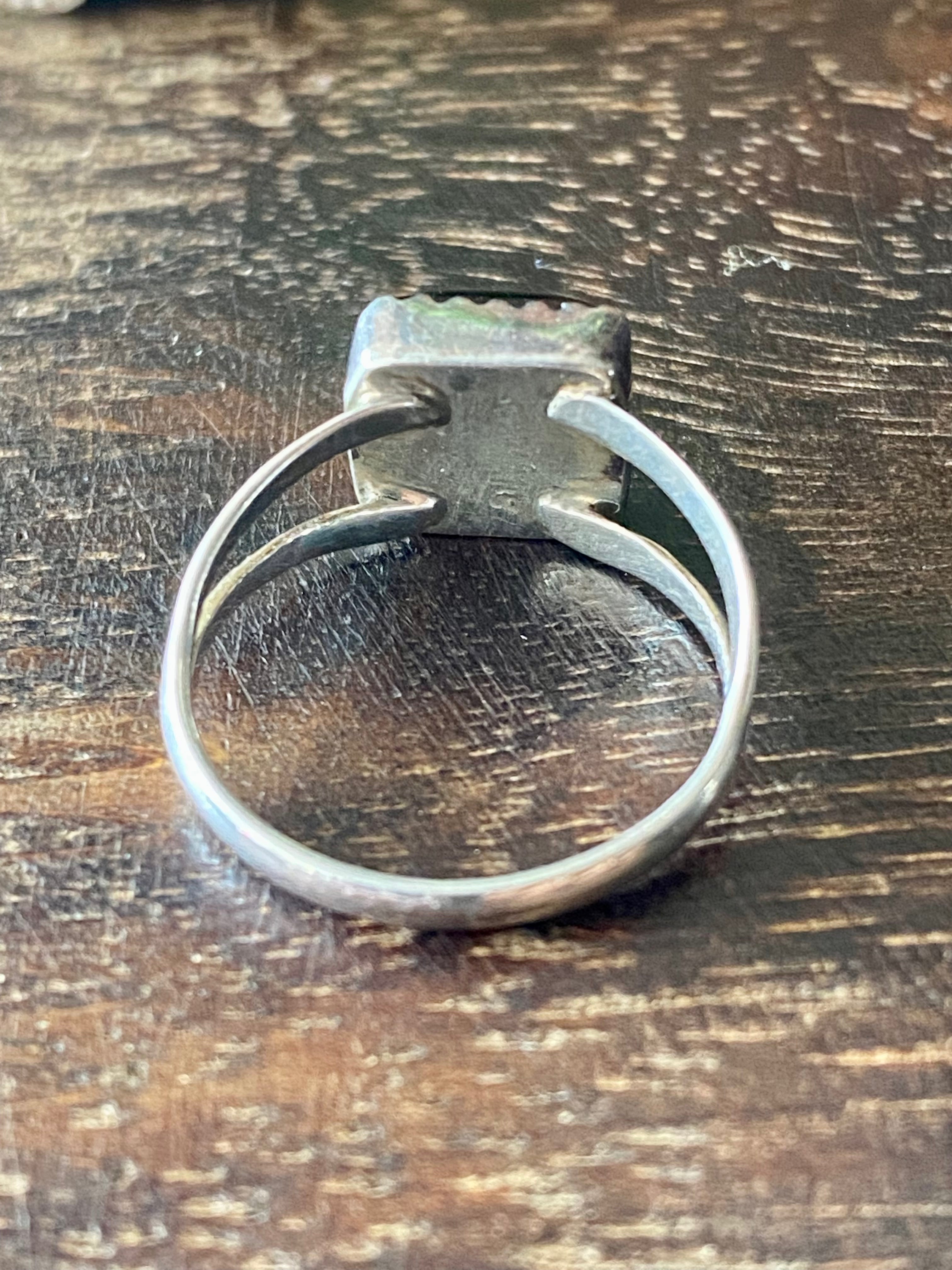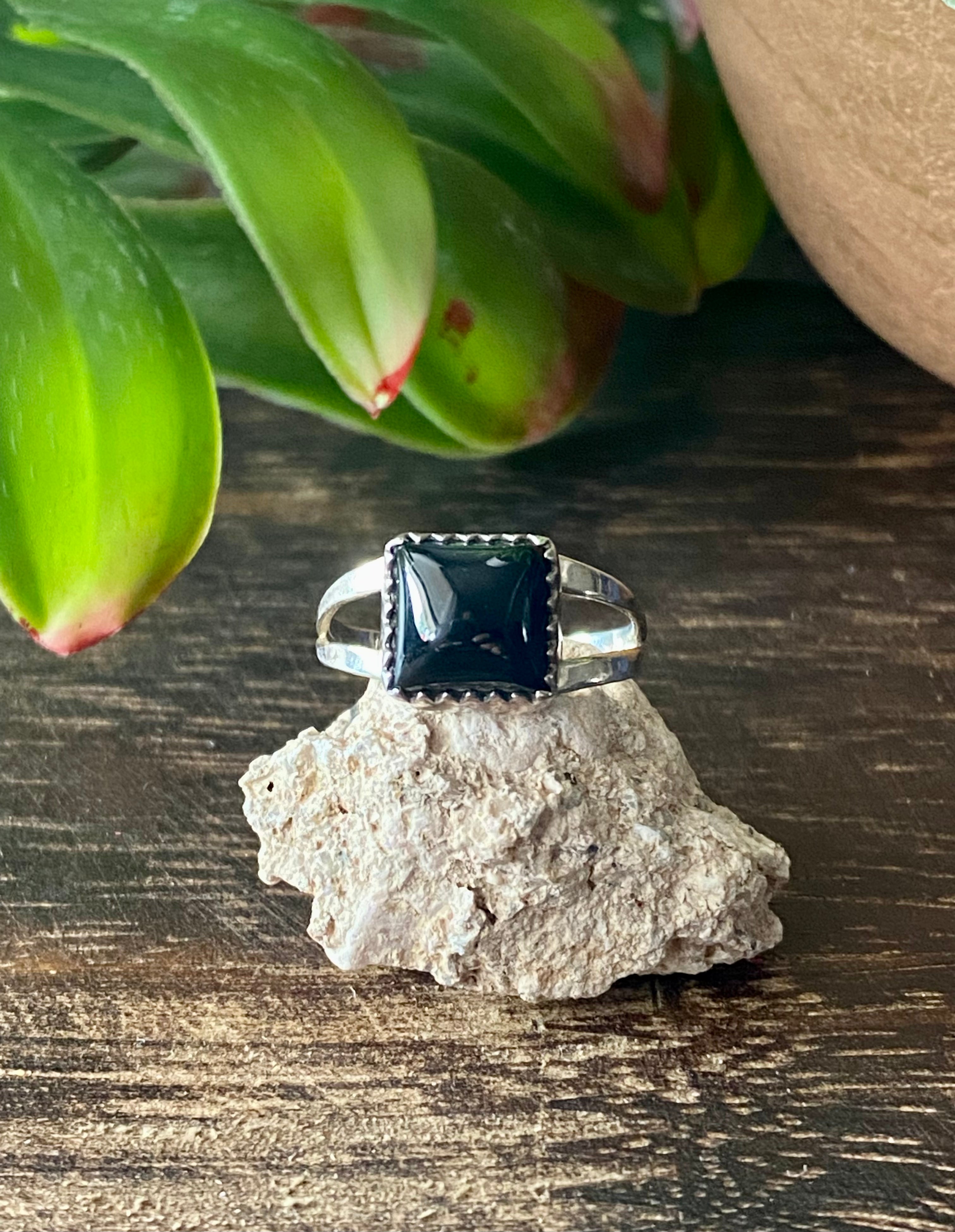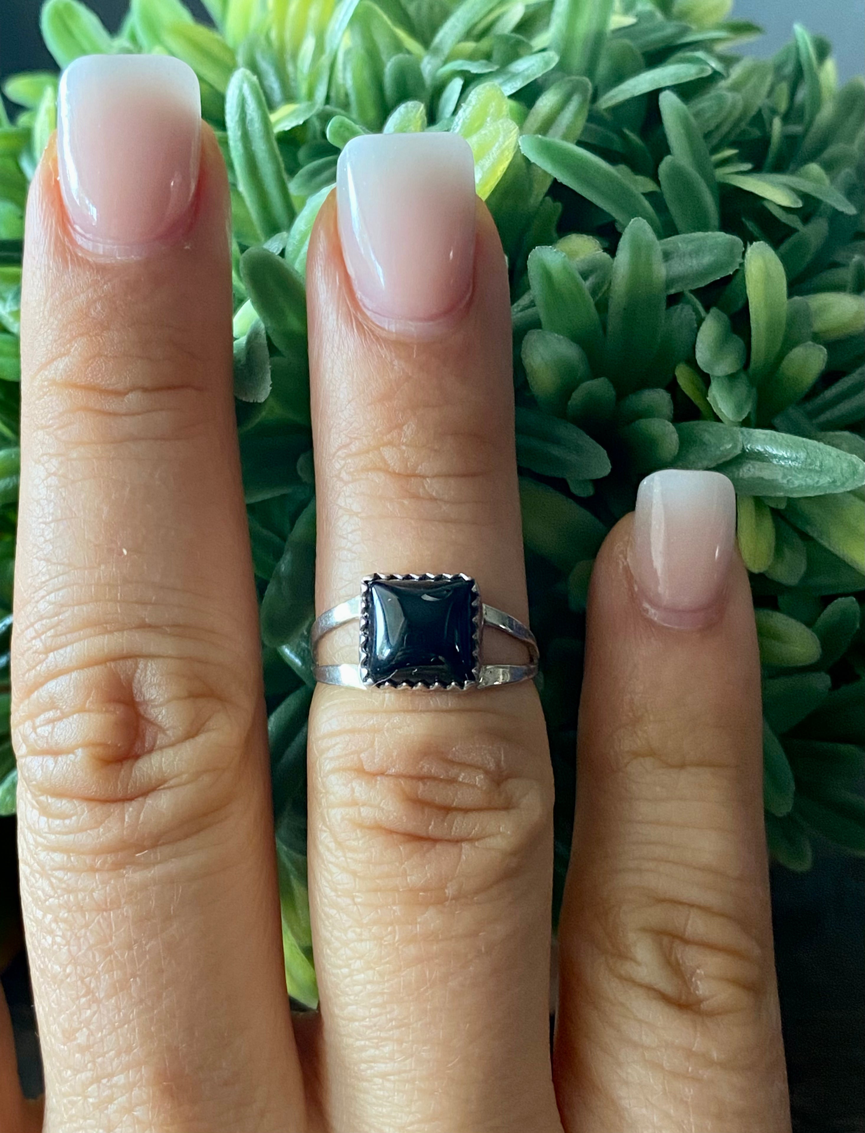 Navajo Made Onyx & Sterling Silver Ring Size 5.75. It measures 3/8 of an inch long and 3/8 of an inch wide.