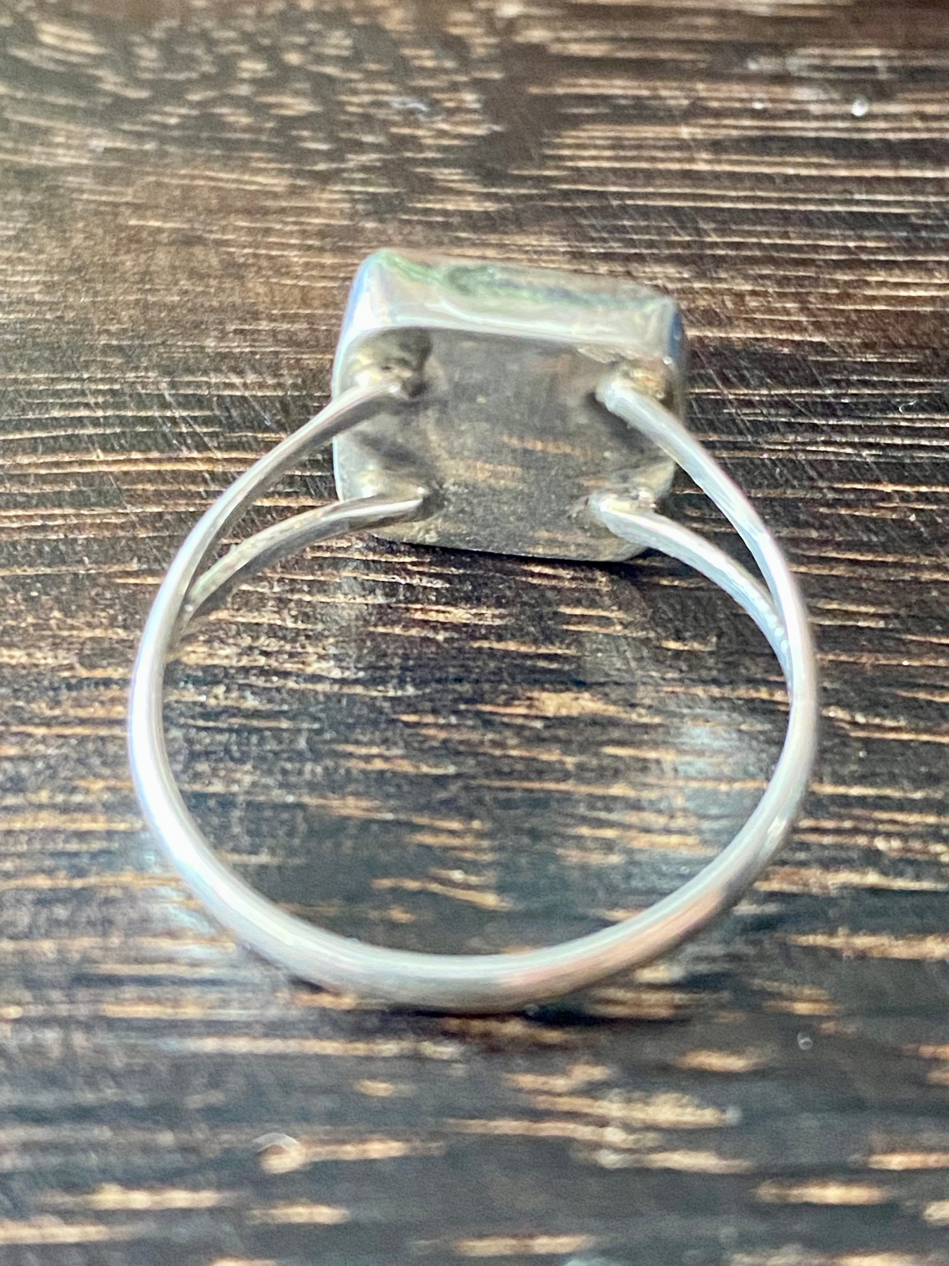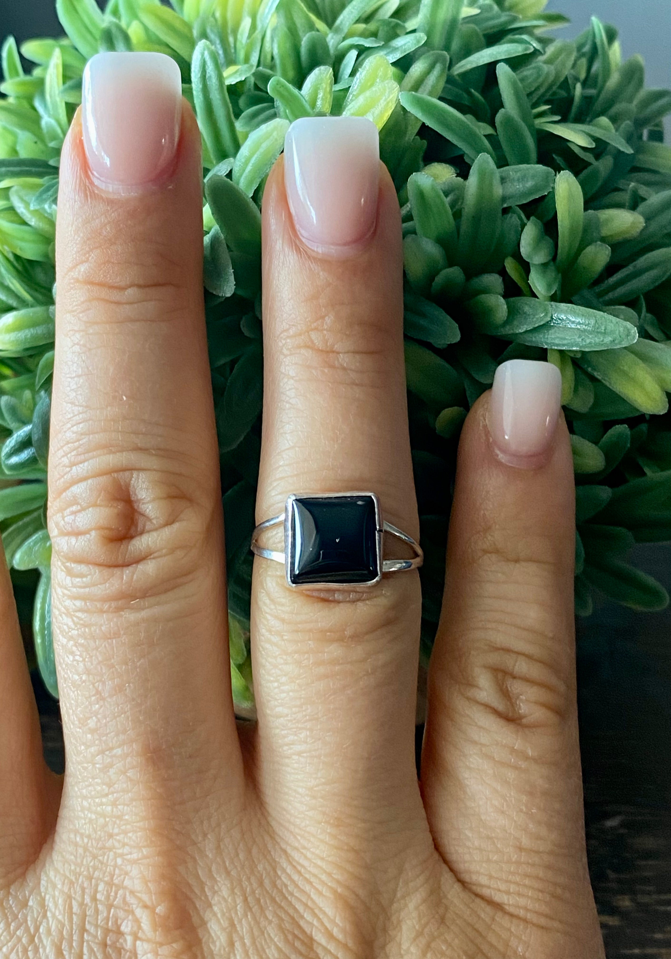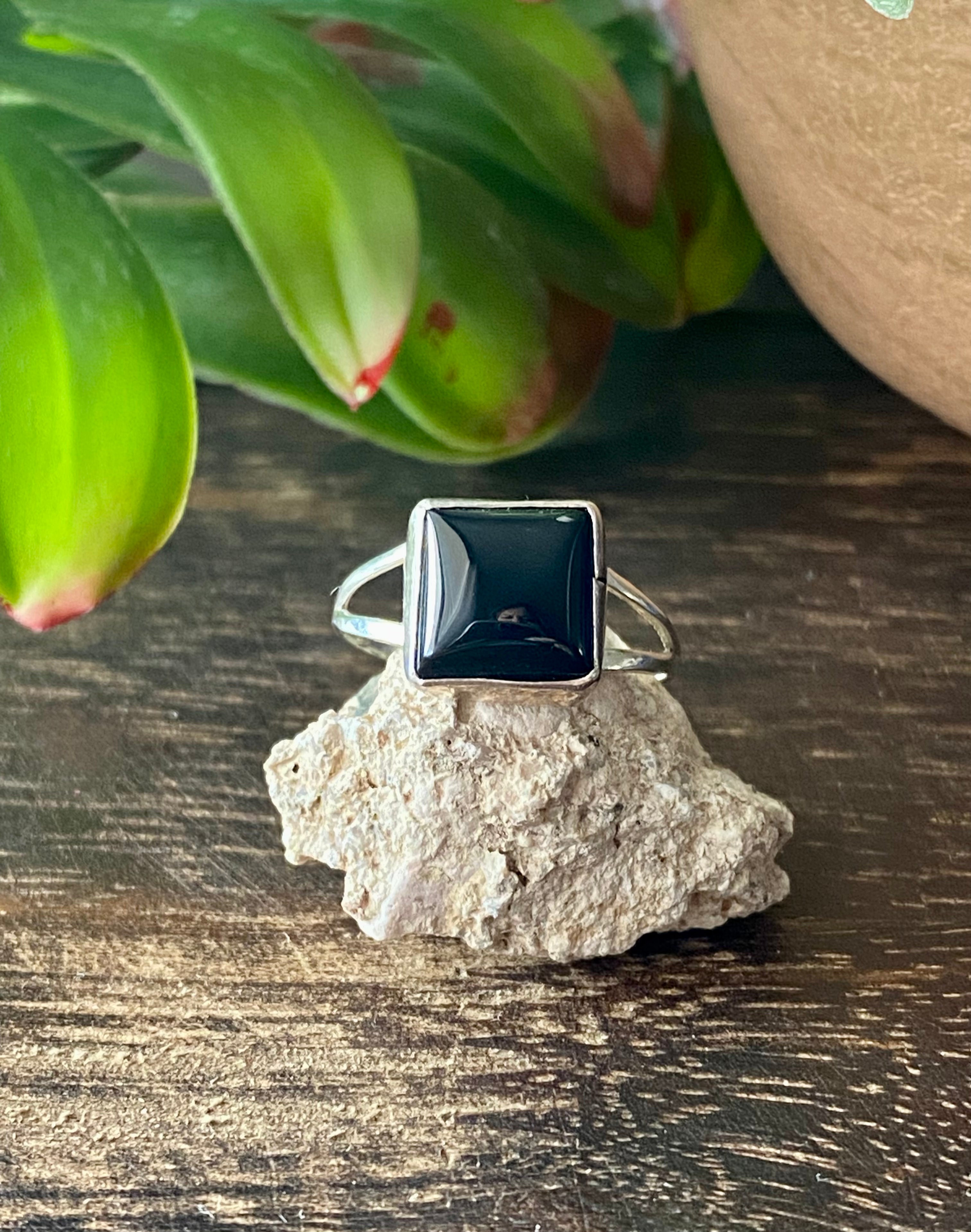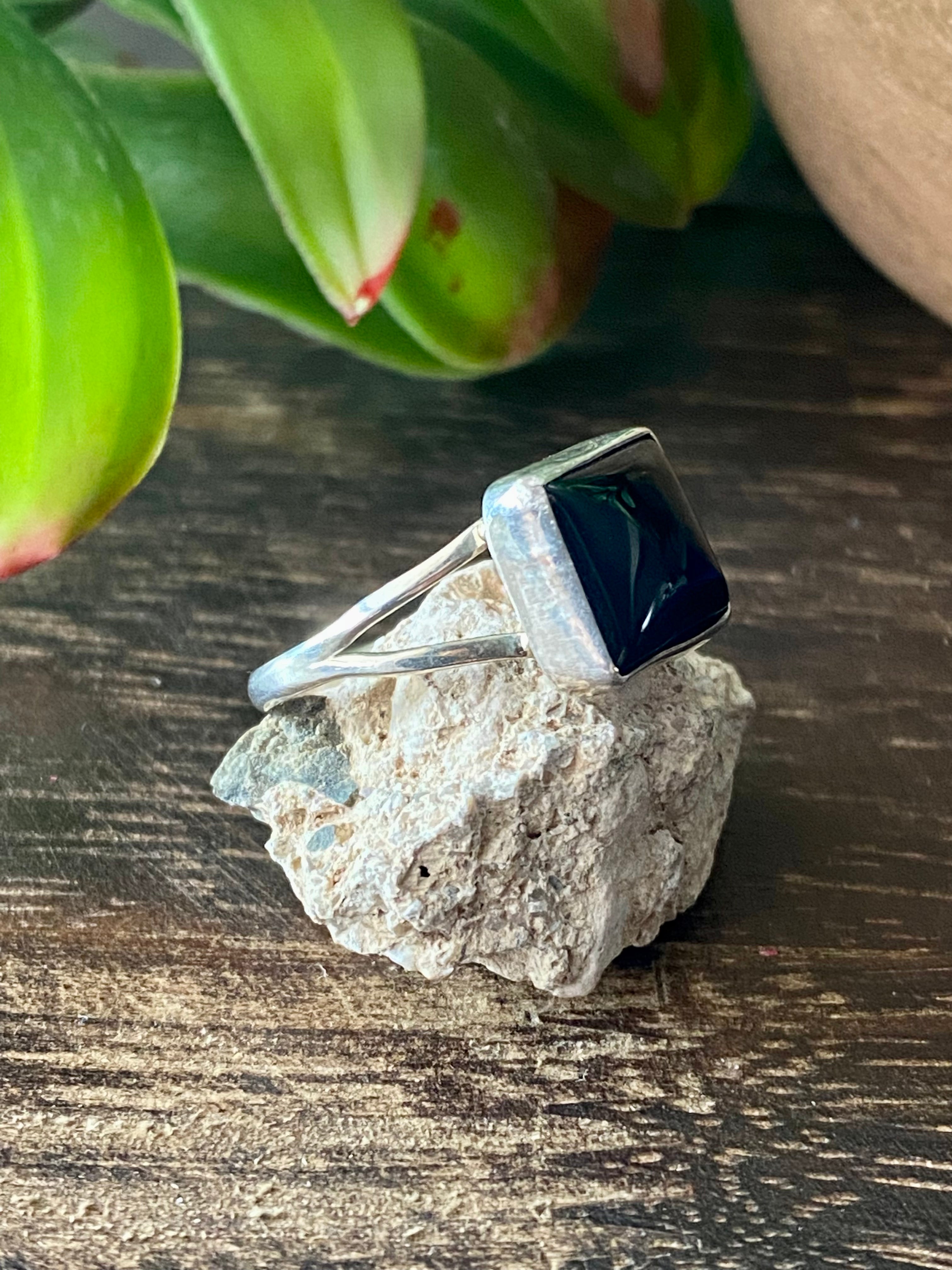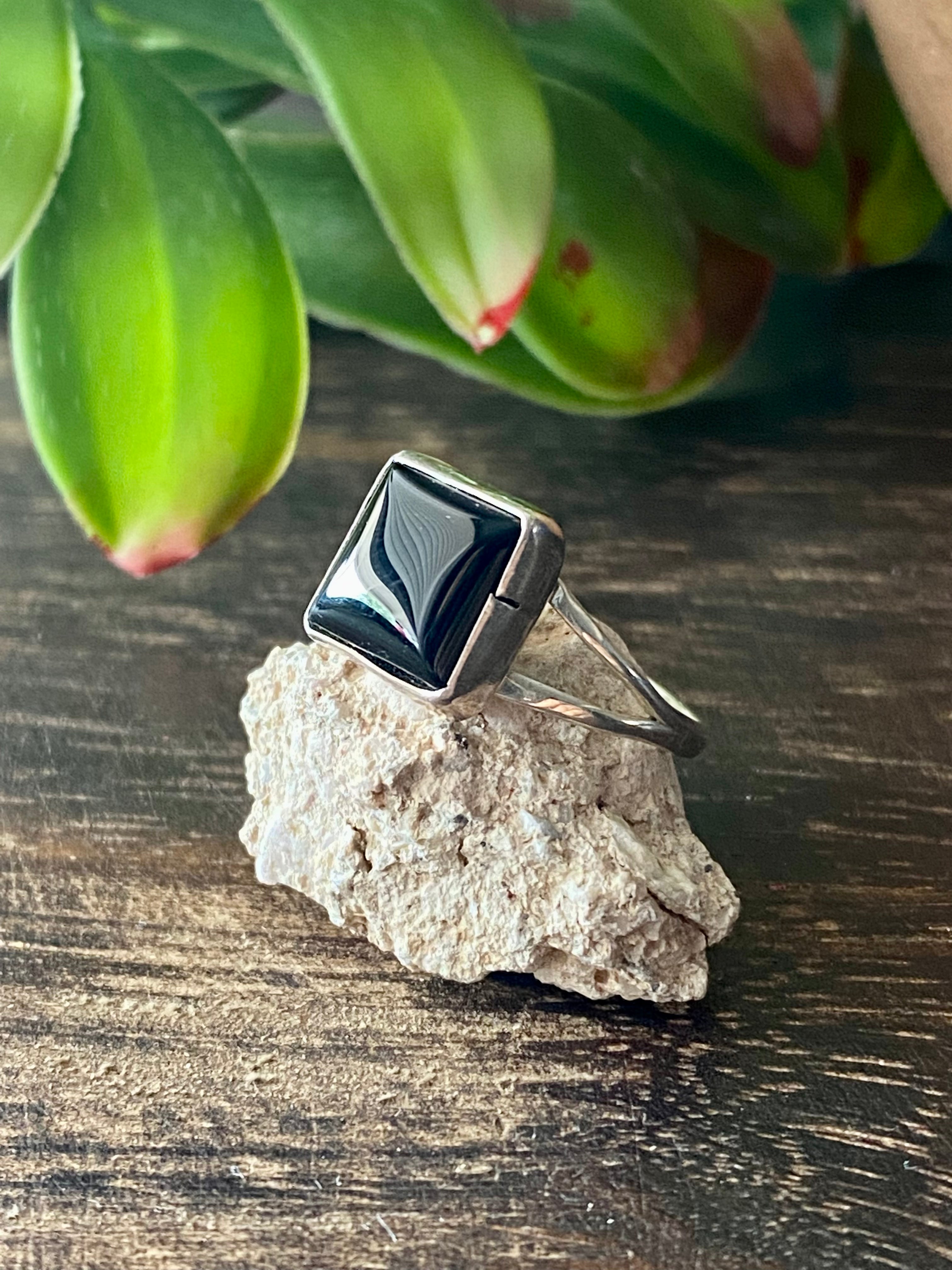 Navajo Made Onyx & Sterling Silver Ring Size 5.75. It measures 3/8 of an inch long and 3/8 of an inch wide.