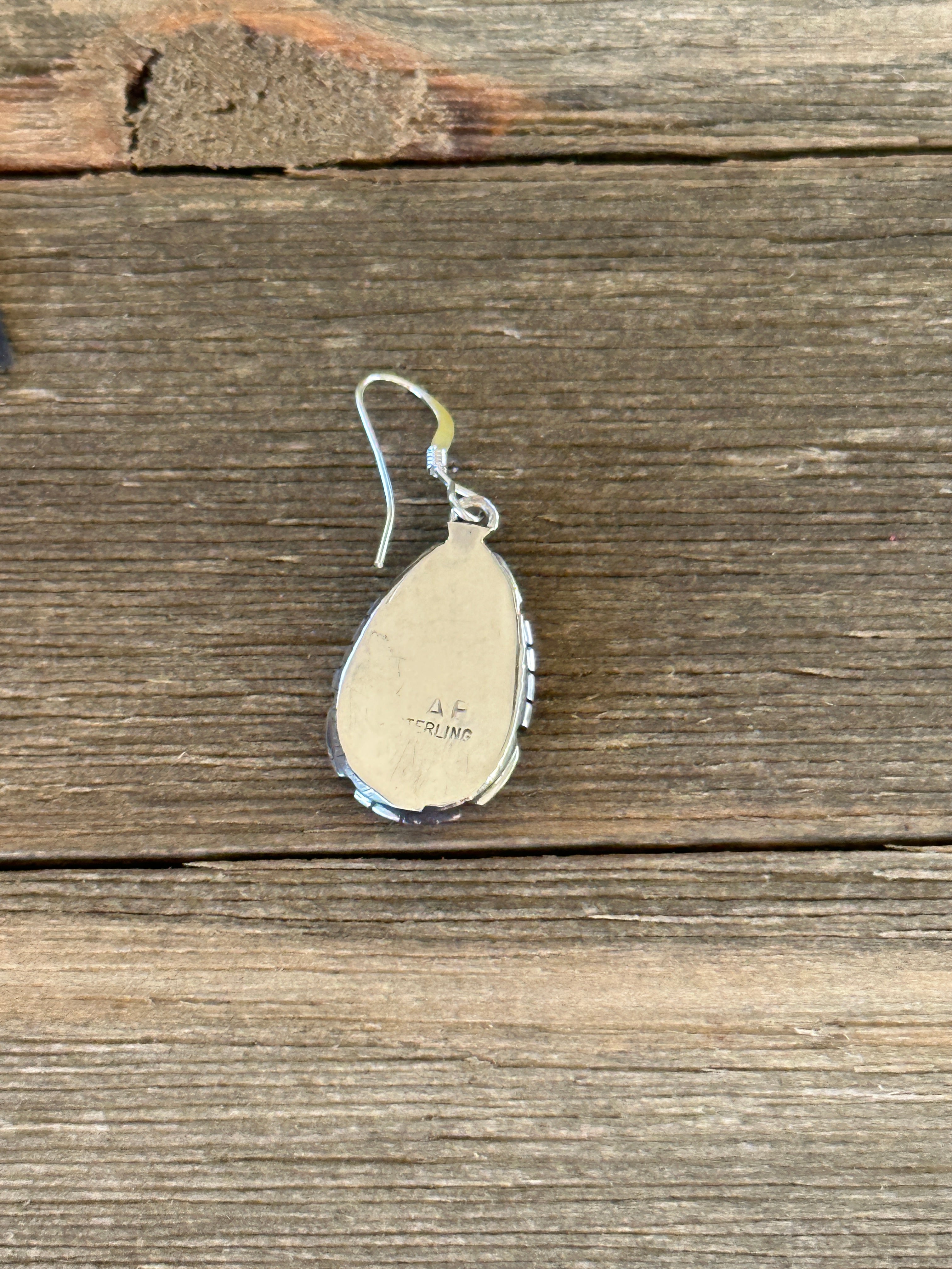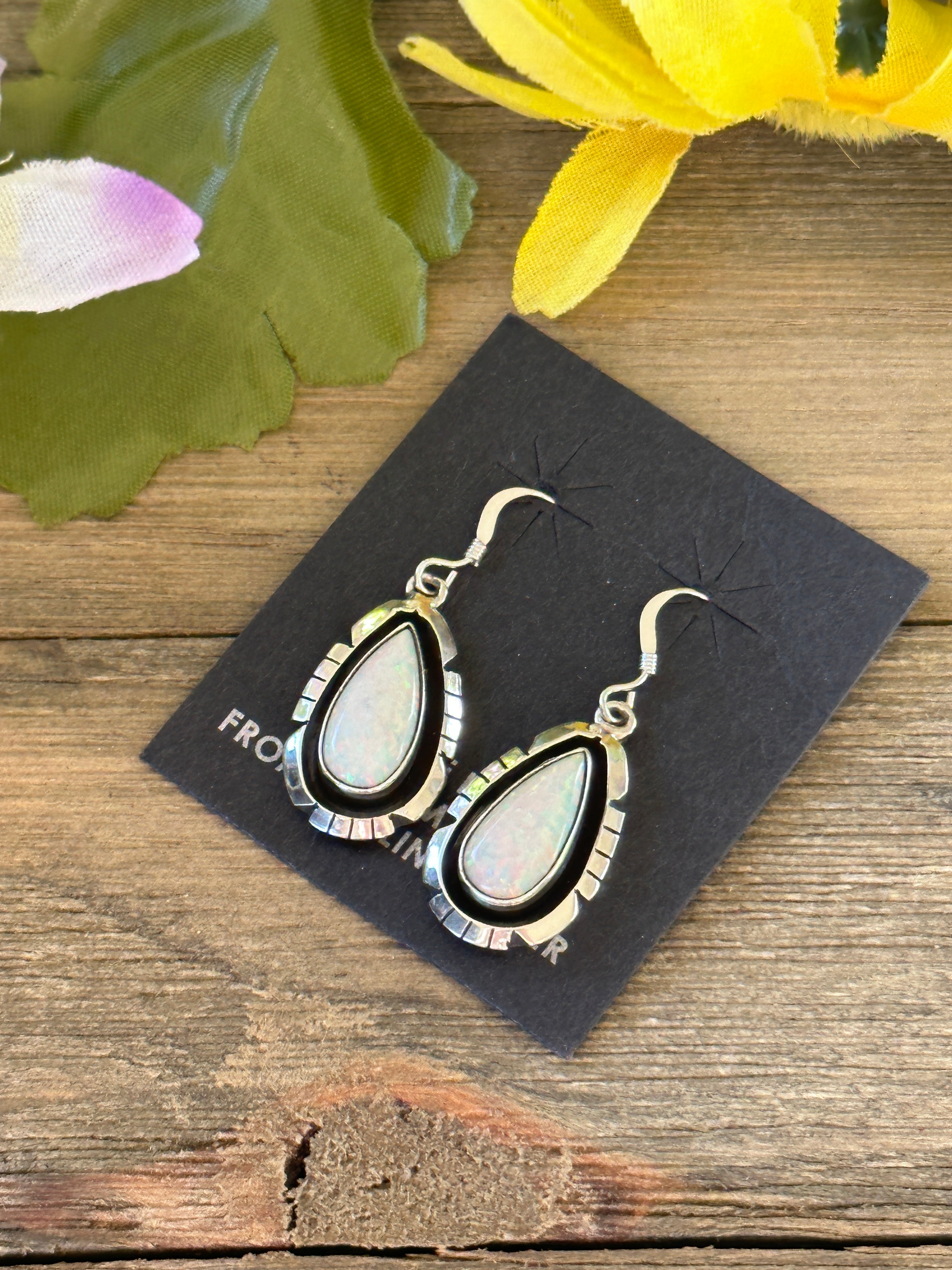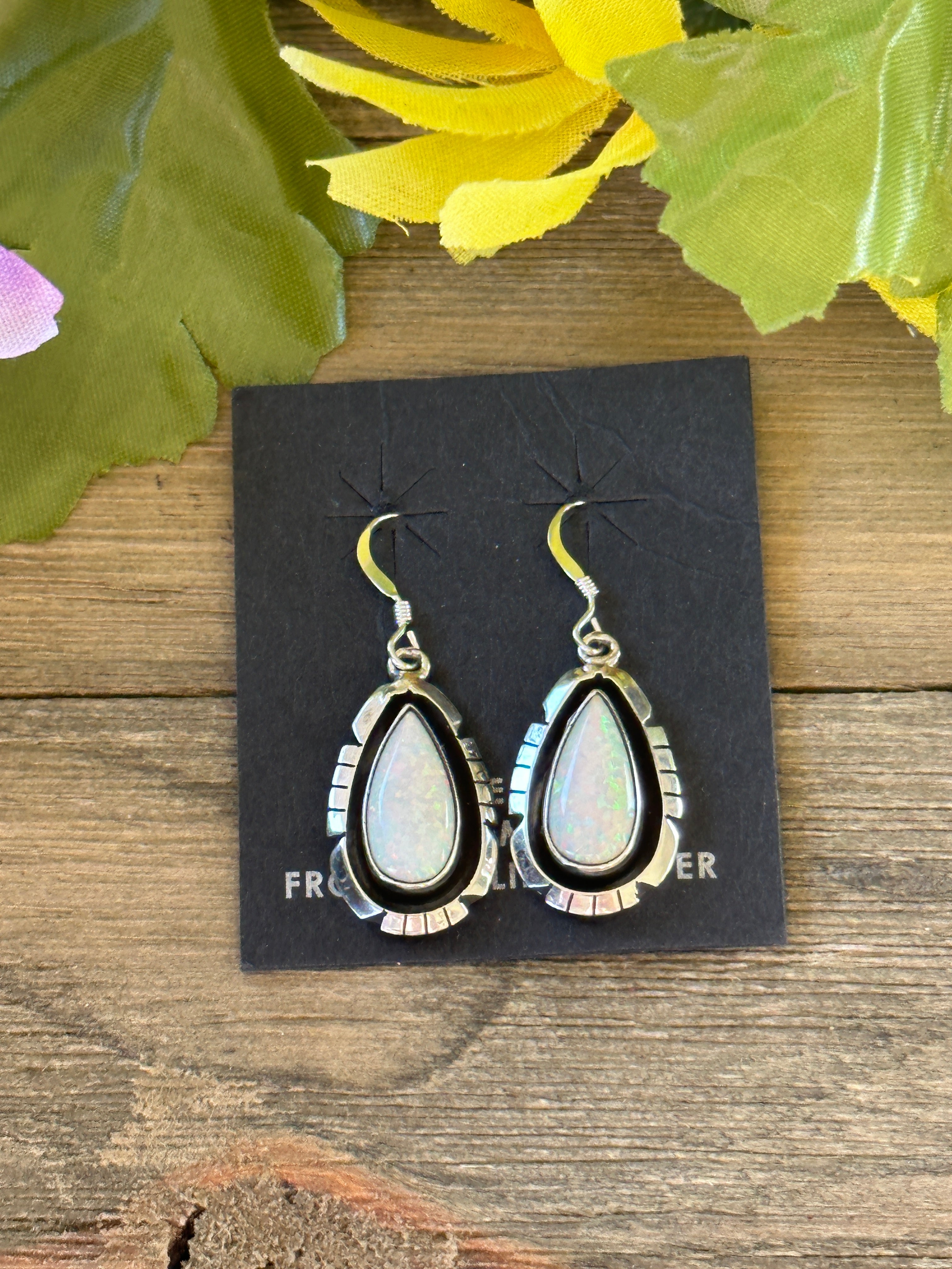 Navajo Made Opal (Man Made) & Sterling Silver Dangle Earrings. It measures 1 3/8 inches long and just over 1/2 of an inch wide. Signed by artist and stamped sterling silver.