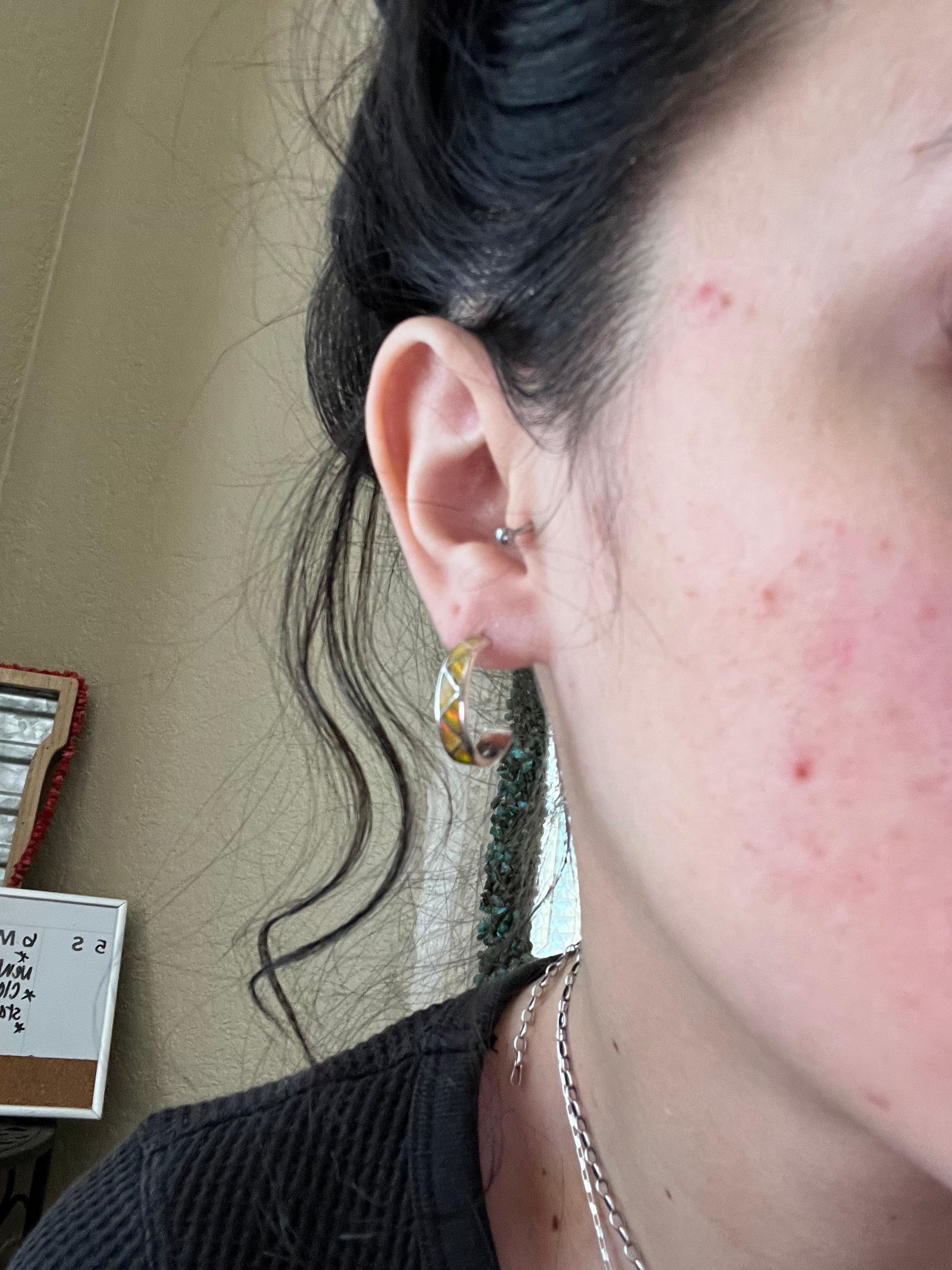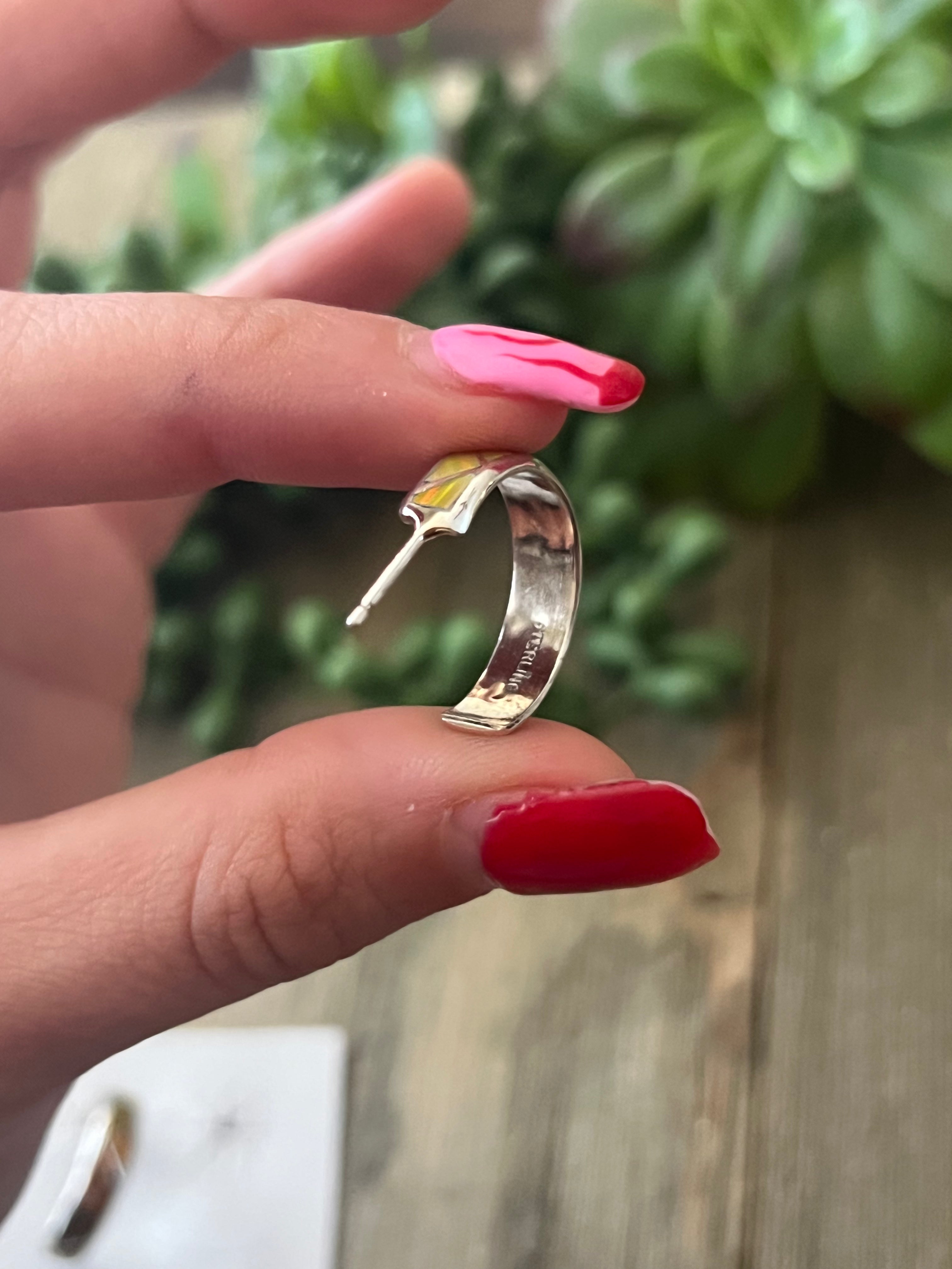 Navajo Made Opal (Man Made) & Sterling Silver Hoop Post Earrings. It measures 3/4 of an inch long and 1/4 of an inch wide.