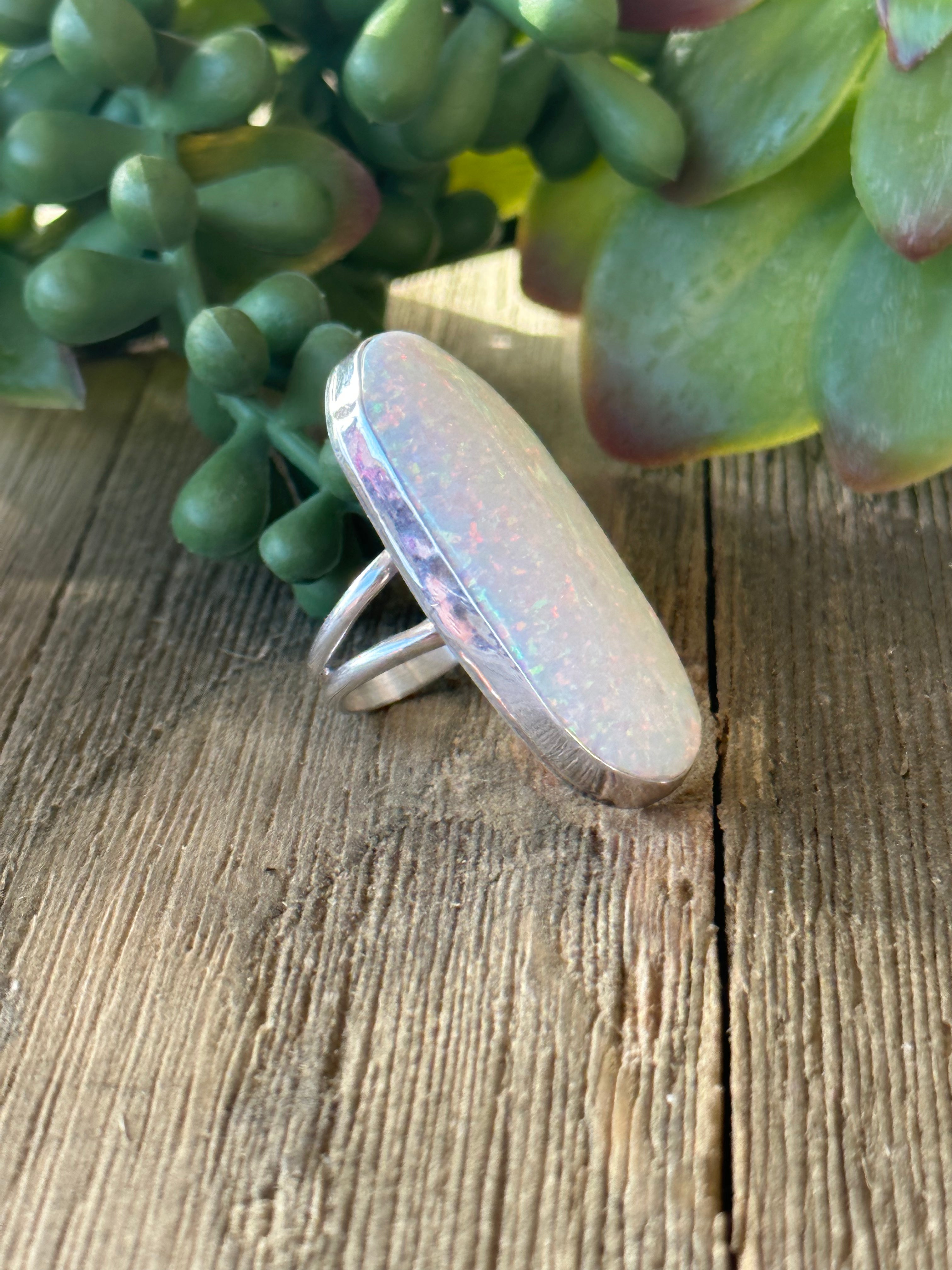 Navajo Made Opal (Man-Made) & Sterling Silver Ring Size 4.5. It measures 1 1/2 inches long and 5/8 of an inch wide. Signed by artist and stamped sterling silver.