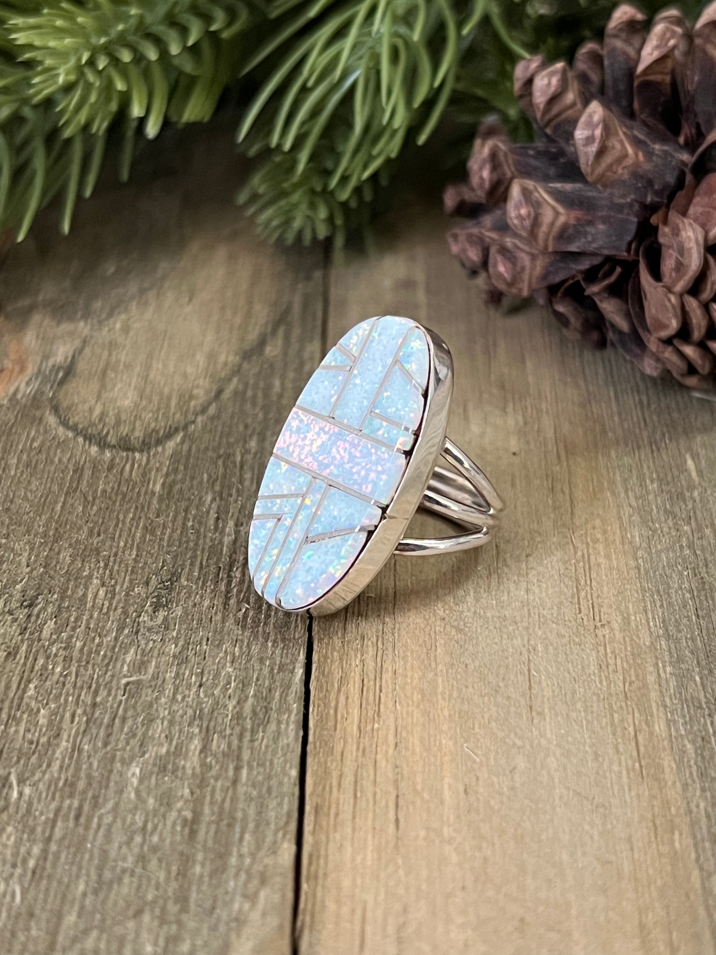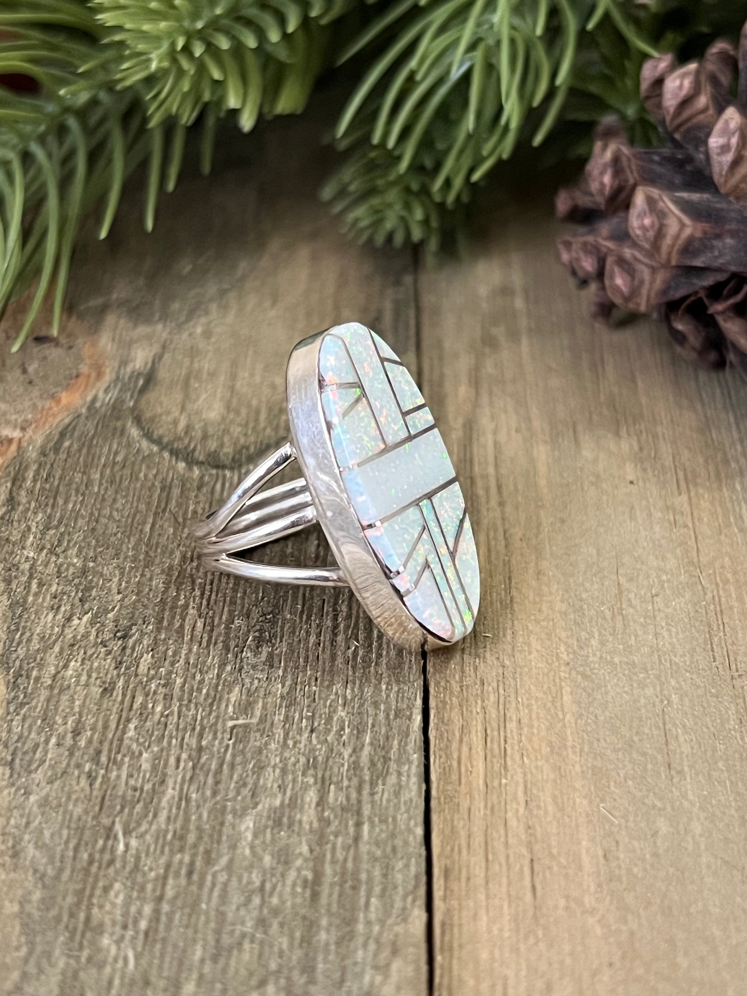 Navajo Made Opal (Man Made) & Sterling Silver Ring Size 5.5. It measures 1 1/4 inches long and just under 5/8 of an inch wide. Signed by artist and stamped sterling silver.