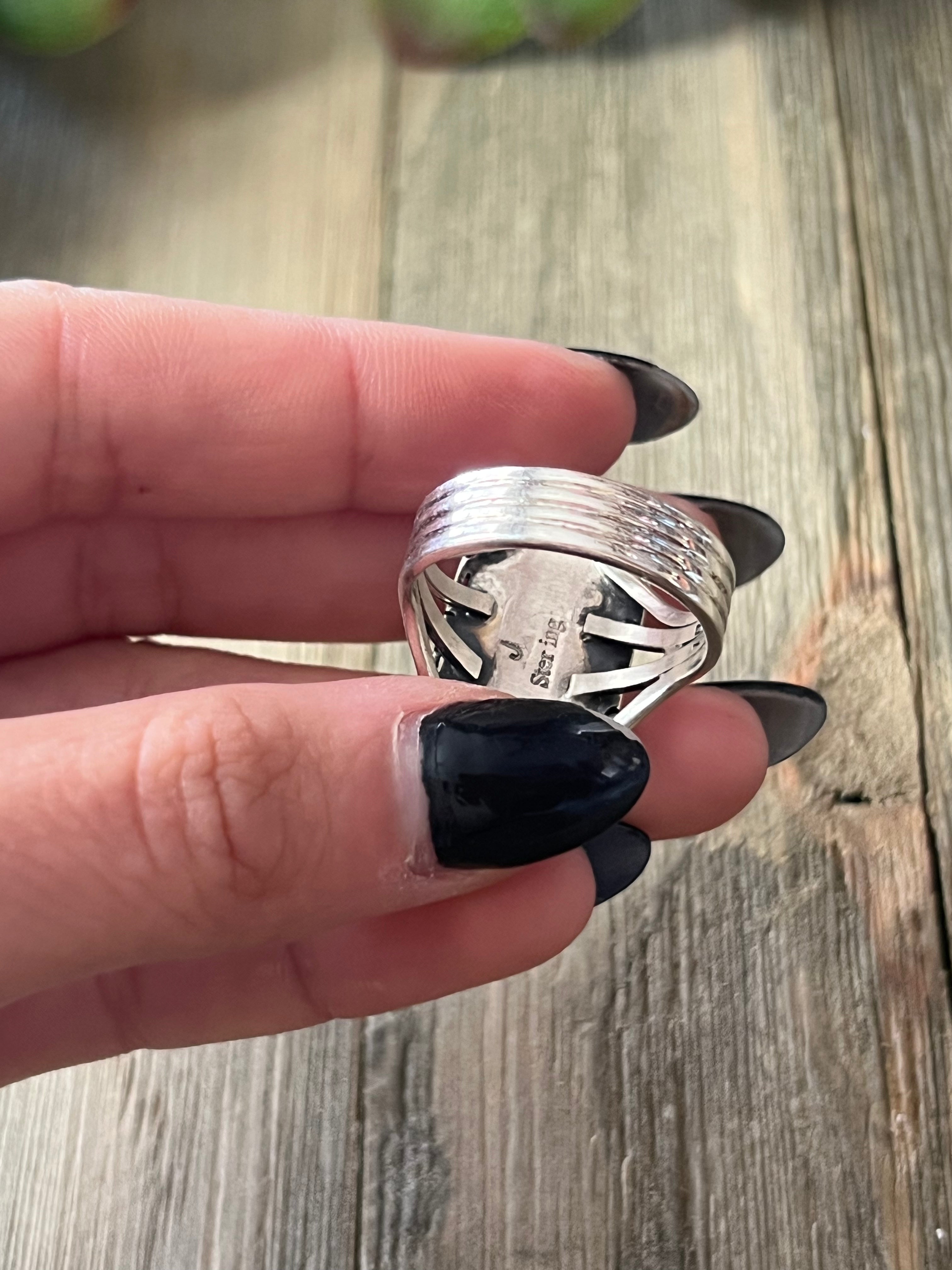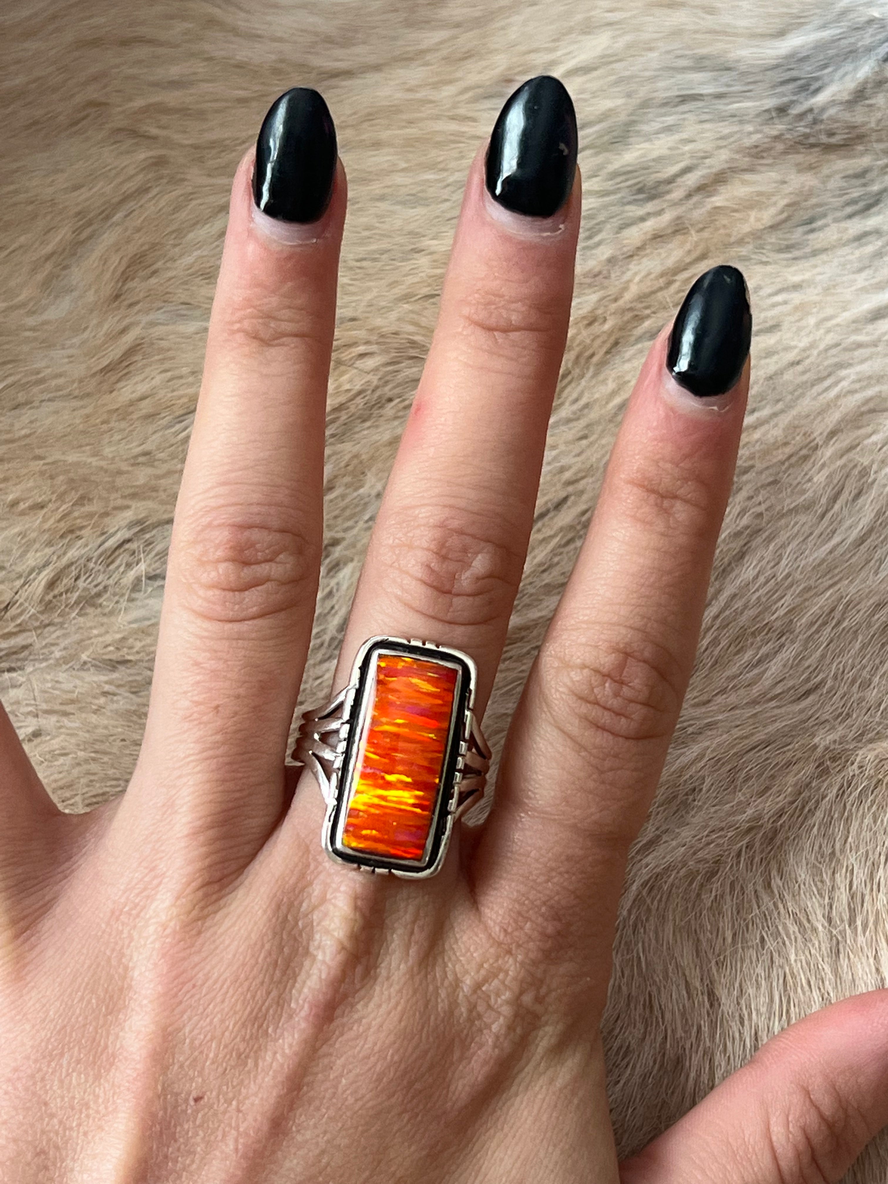 Navajo Made Orange Opal (Man Made) & Sterling Silver Ring. It measures 1 inch long and just over 1/2 of an inch wide. Signed by artist and stamped sterling silver.