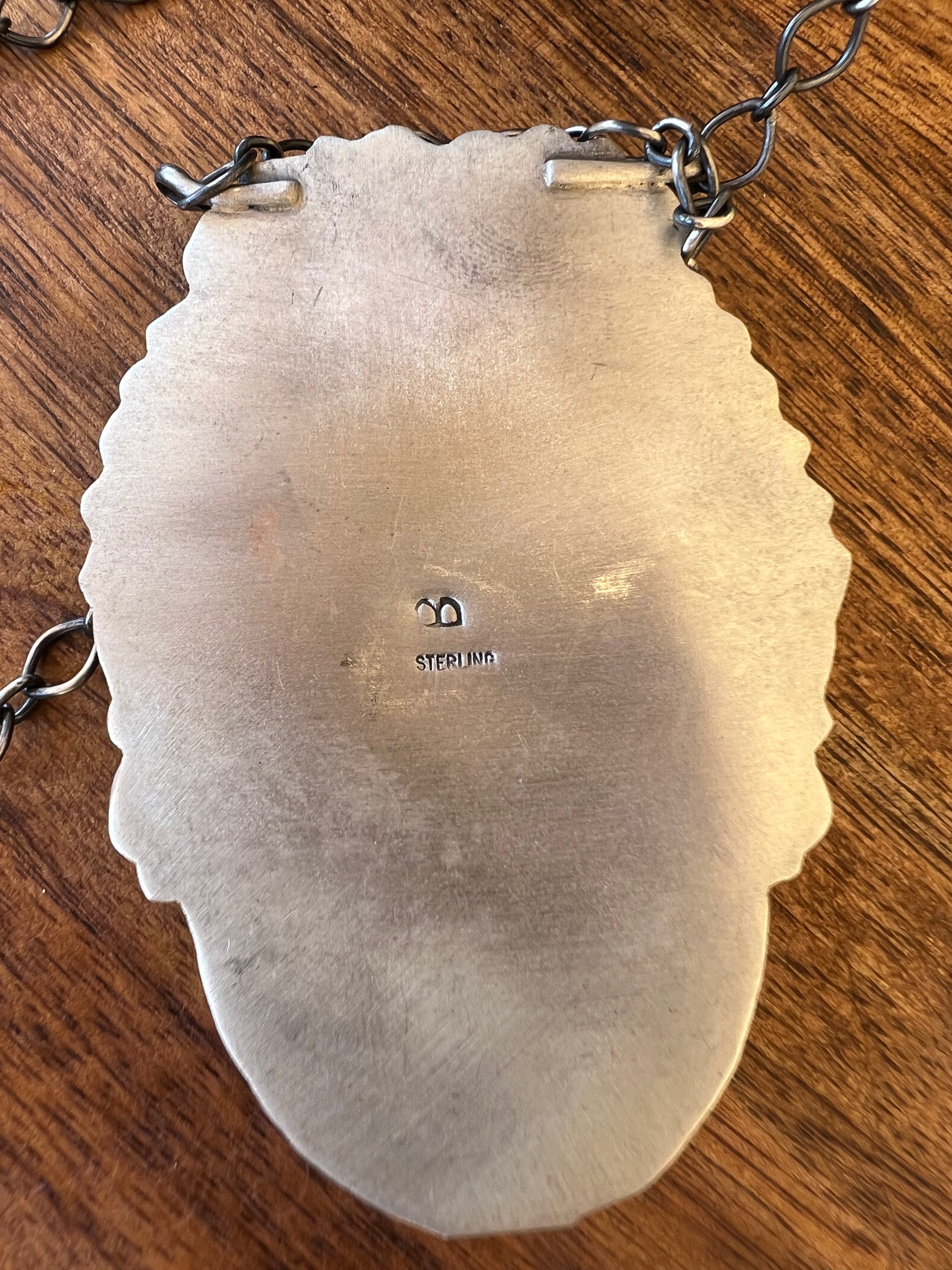 Navajo Made #8 Turquoise & Sterling Silver Necklace. It measures 20 3/4 inches long with hang while the necklace by itself measures 18 1/2 inches long and a width of 2 inches. Signed by the artist and stamped sterling silver.