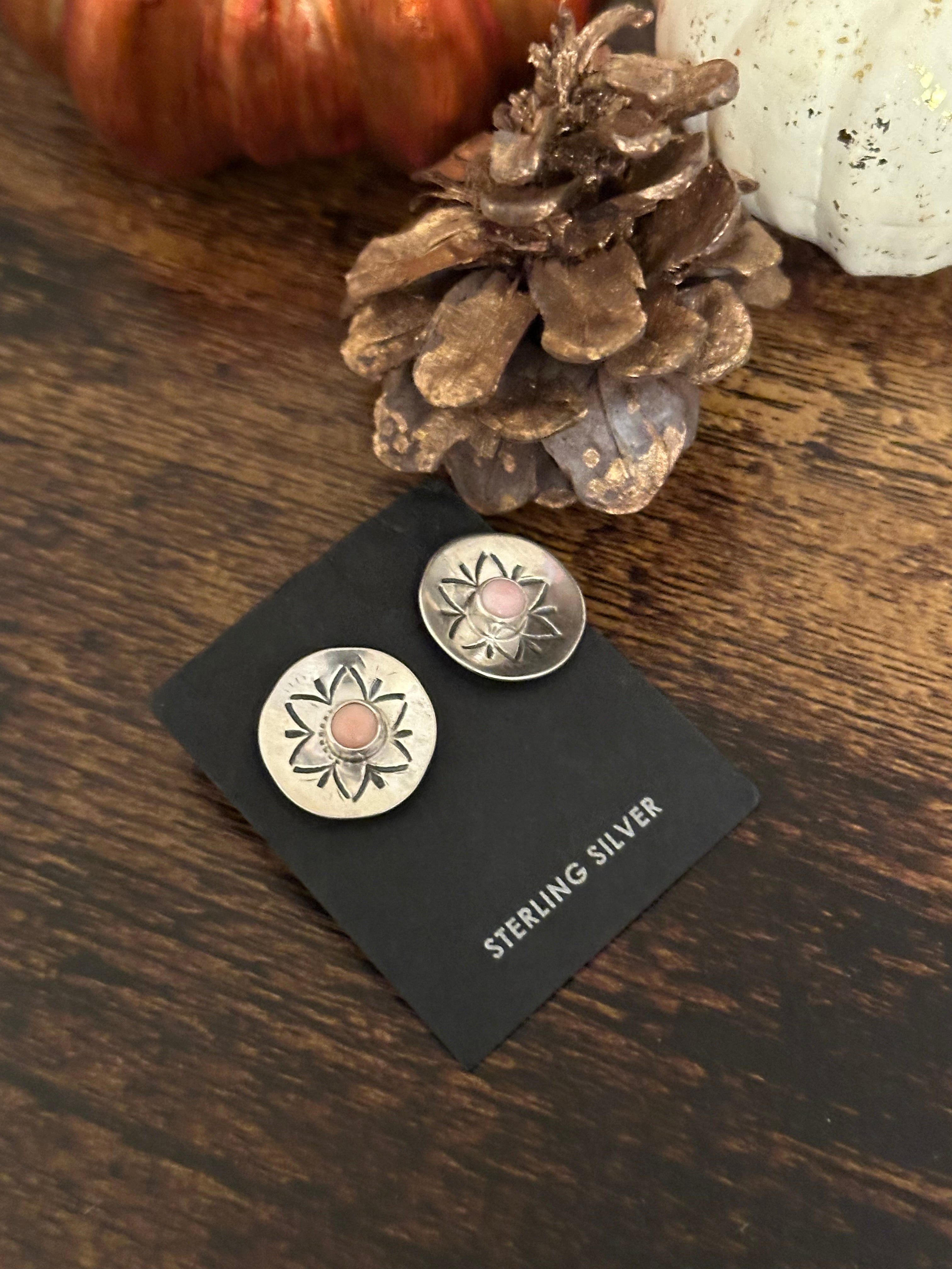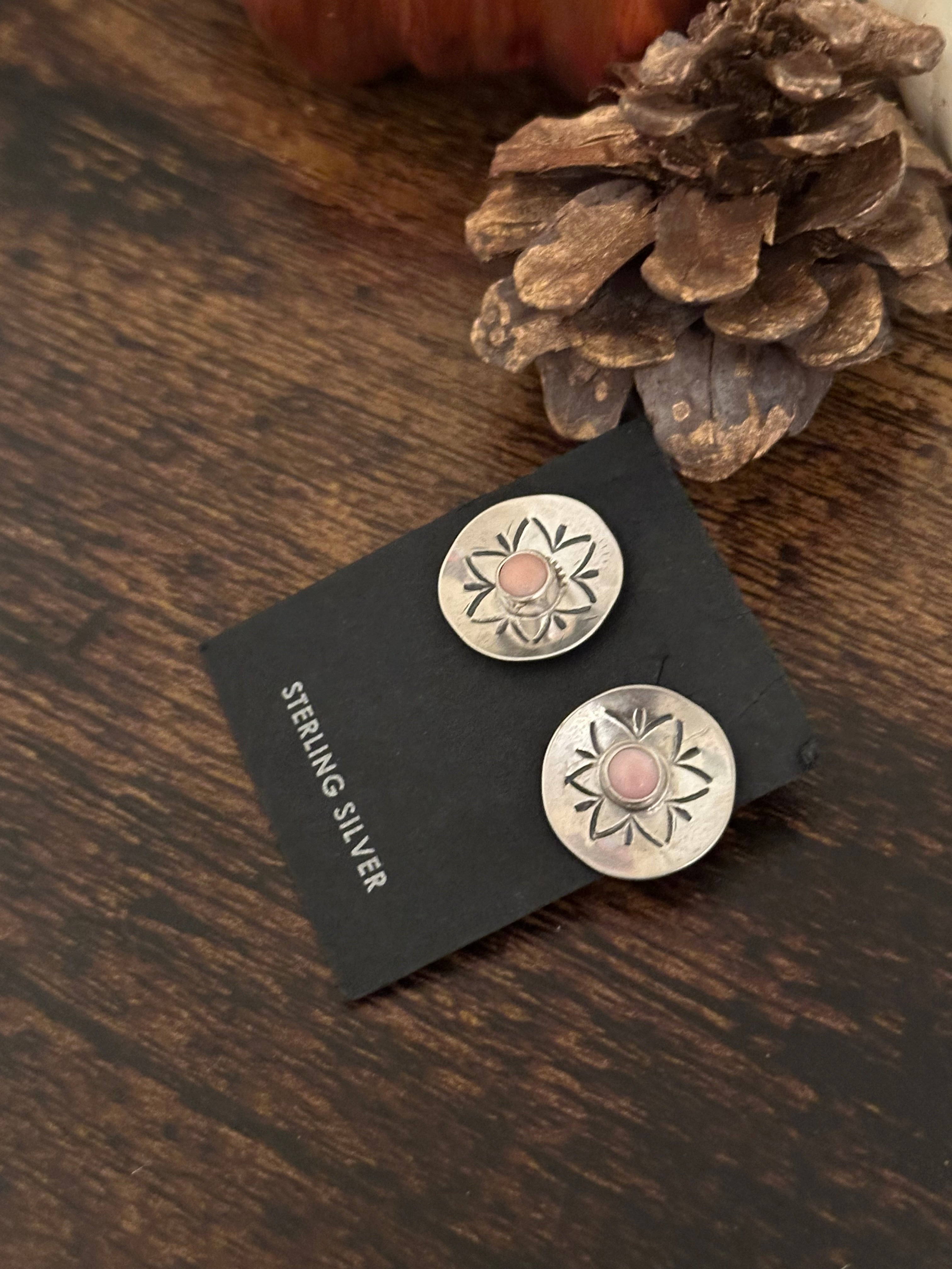 Beautiful post earrings. Navajo Made Pink Conch & Sterling Silver Post Earrings. It measures 5/8 of an inch round. Stones will differ due to natural stones. stamped.