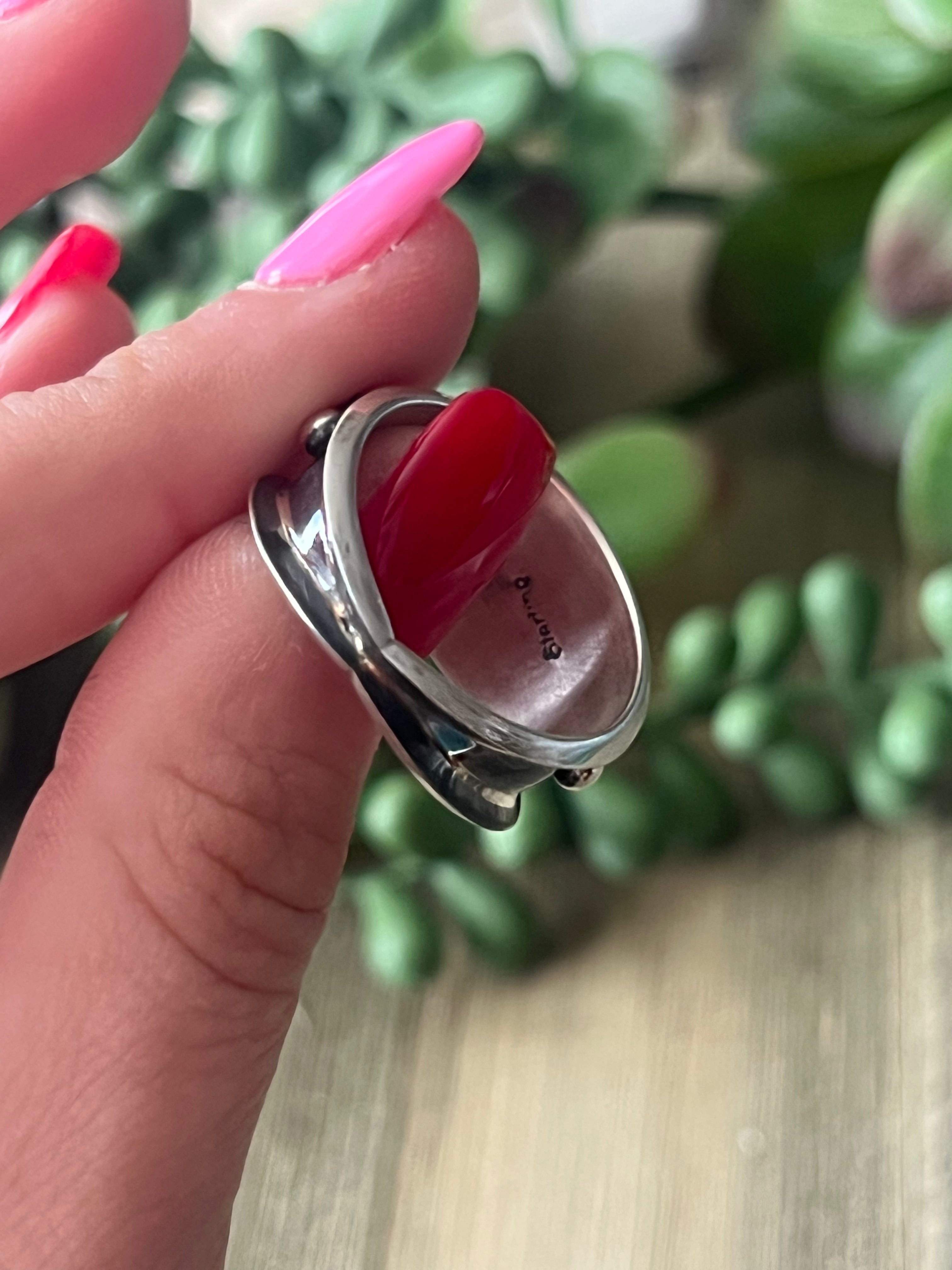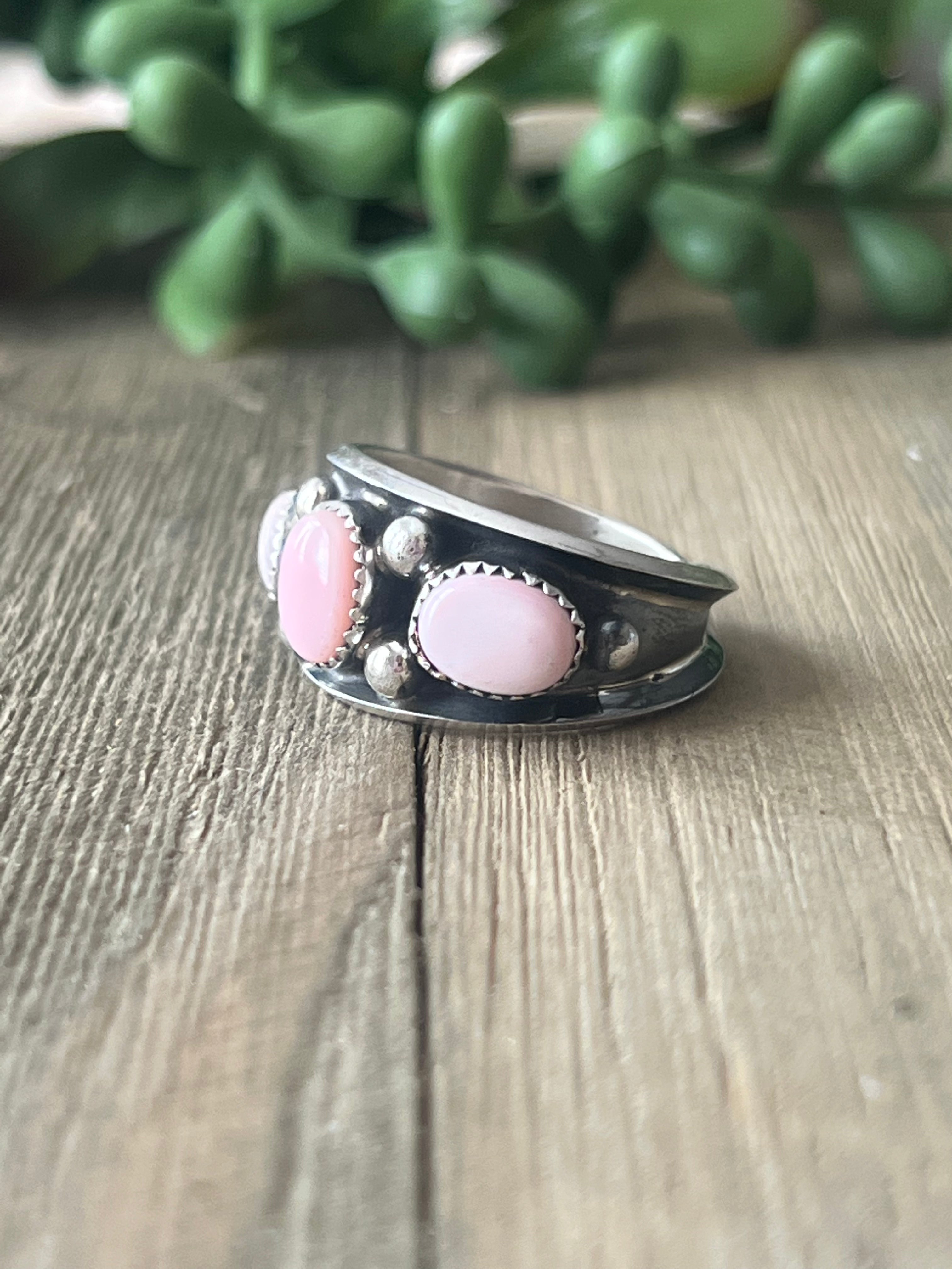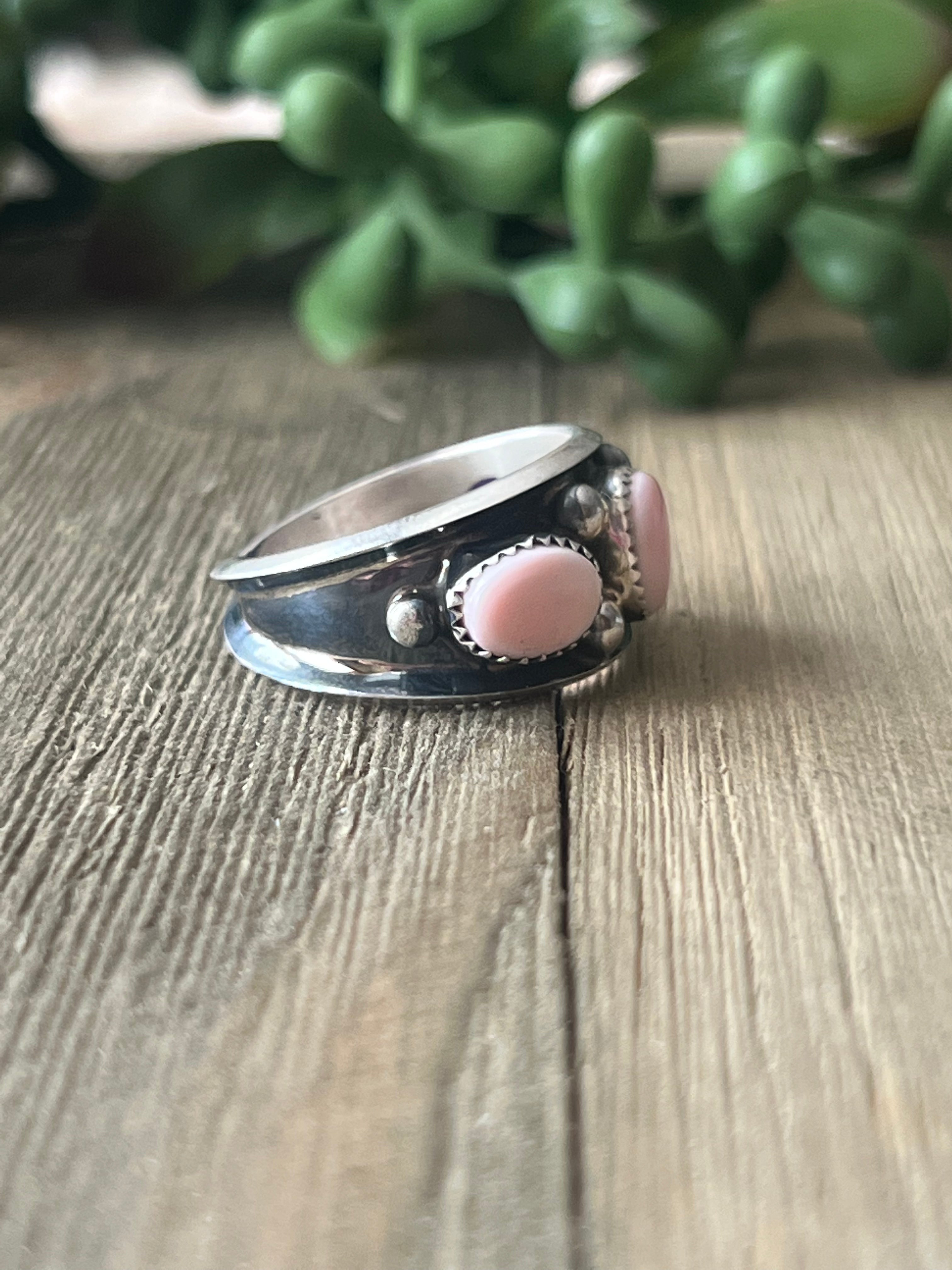 Navajo Made Pink Conch & Sterling Silver Ring. It measures 1/2 of an inch long. Signed by artist and stamped sterling silver. Stones will differ due to natural stone.