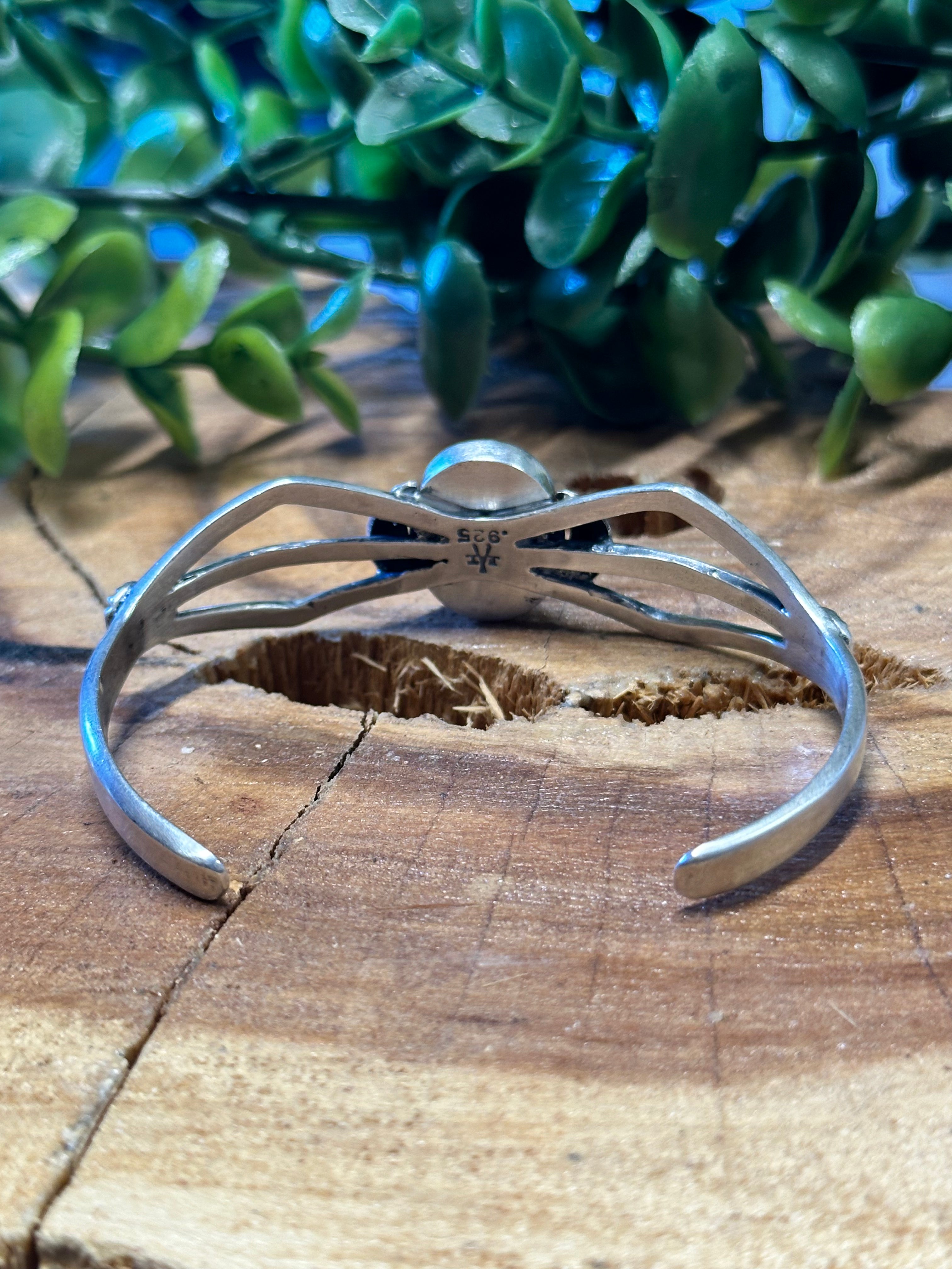 Navajo Made Pink Mohave & Sterling Silver Cuff Bracelet. It measures 3/4 of an inch wide with an inside circumference of 5 1/4 inches and a gap of 1 1/4 inches. Signed by artist and stamped sterling silver.