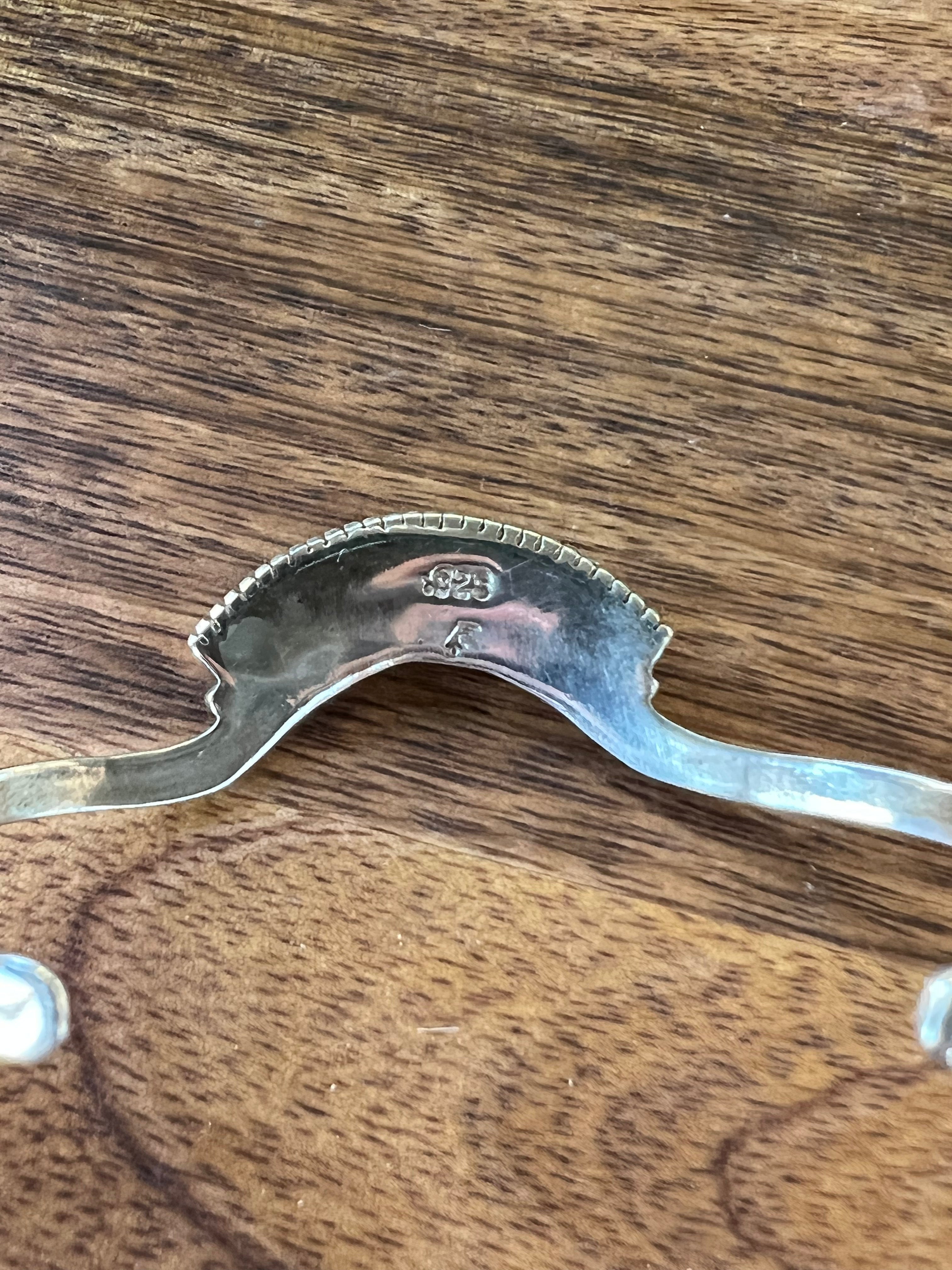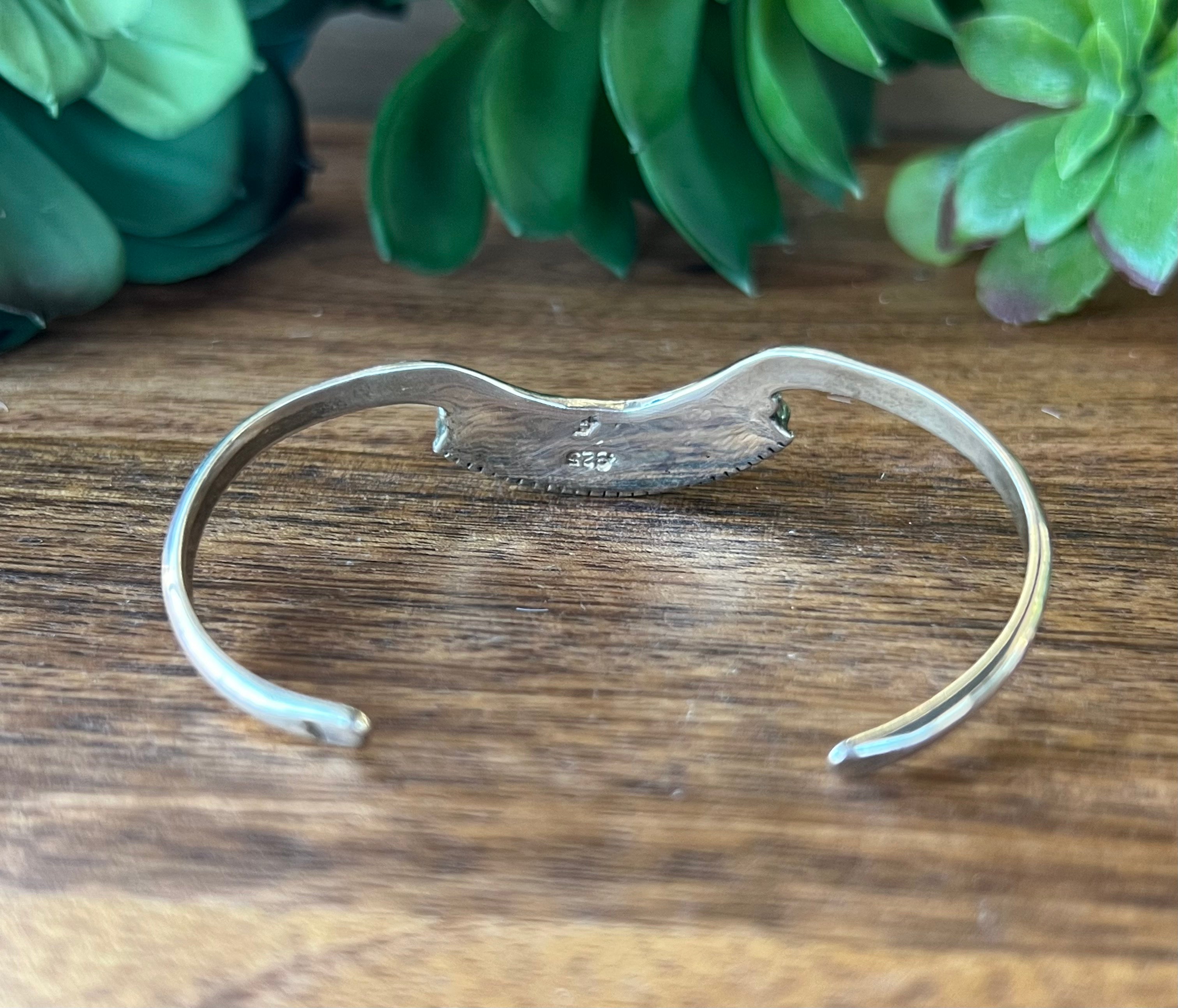 Navajo Made Pink Mohave Turquoise & Sterling Silver Cuff Bracelet. It measures 3/8 of an inch wide with an inside circumference of 5 1/2 inches and a gap of 1 1/4 inches-can be adjusted. Signed by the artist and stamped sterling silver.