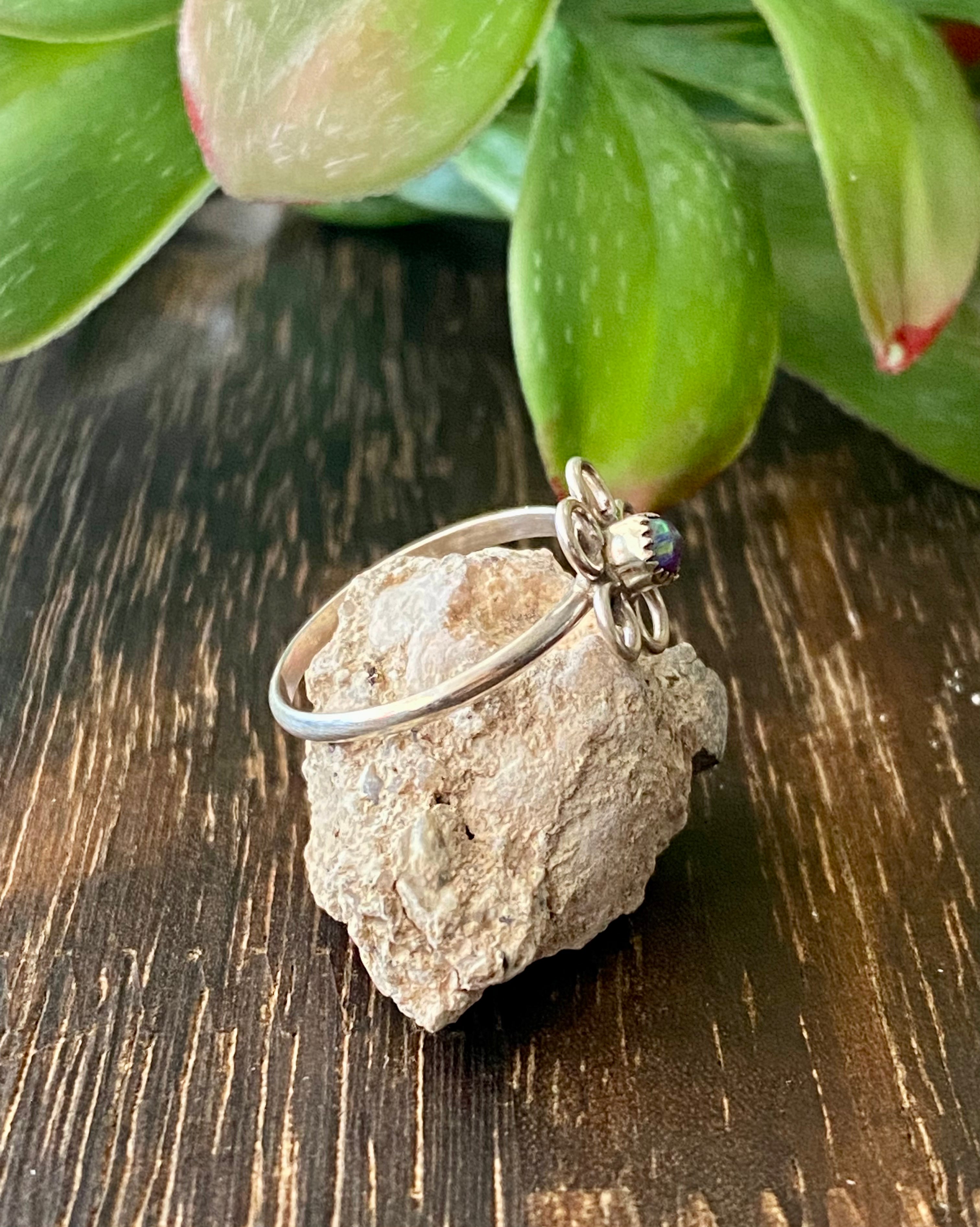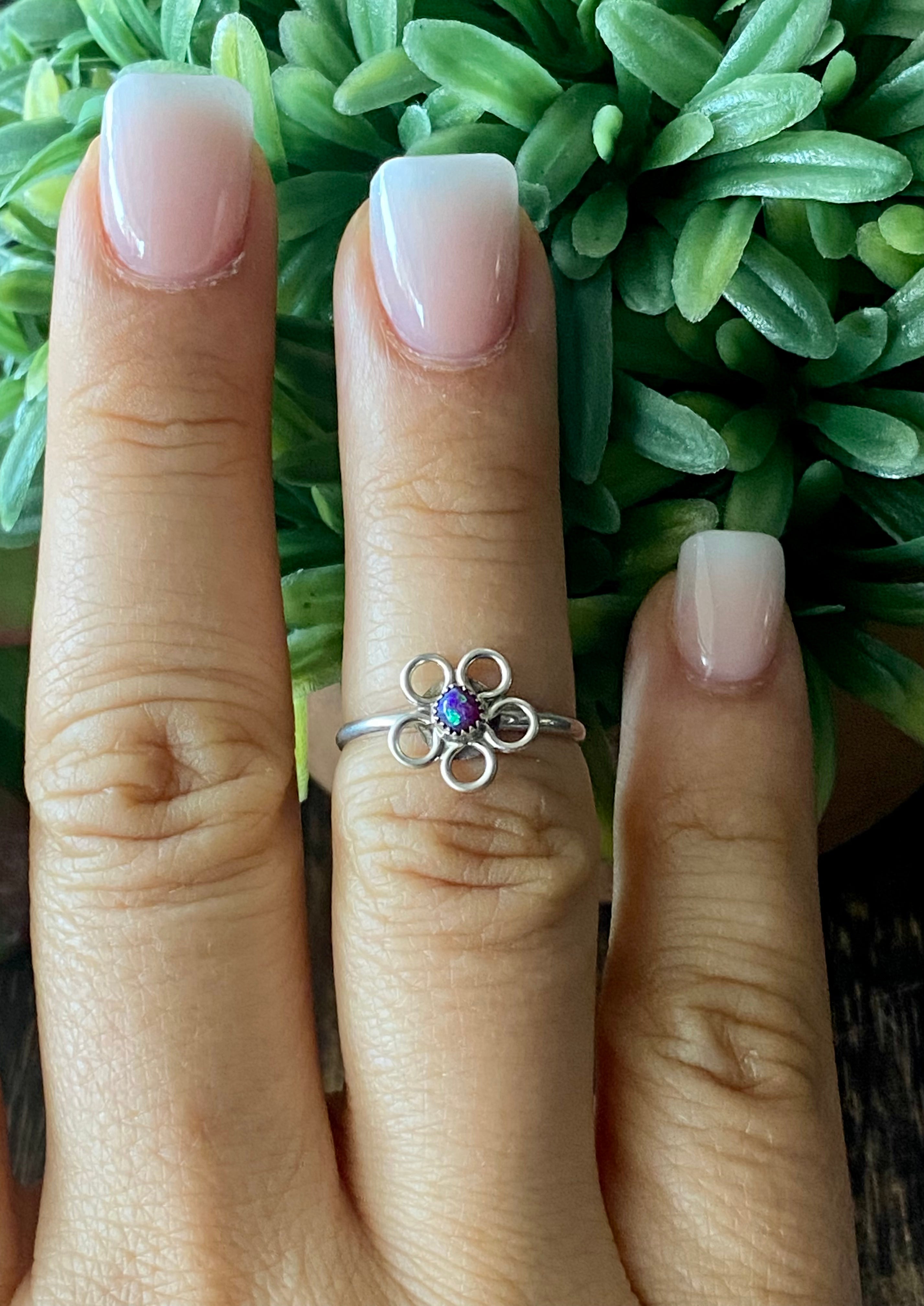 Navajo Made Purple Opal (Man-Made) & Sterling Silver Flower Ring Size 6.25. It measures just over 3/8 of an inch round.