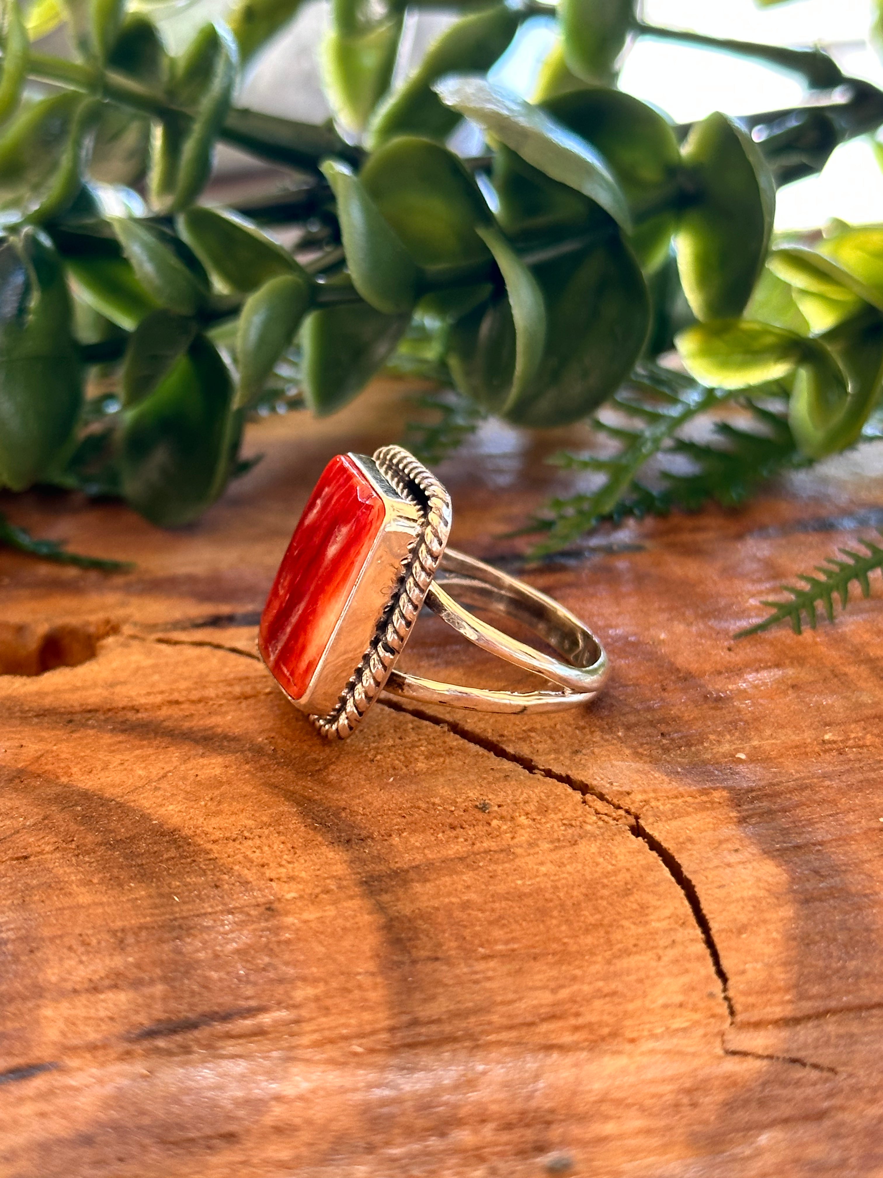 Navajo Made Red Spiny Oyster & Sterling Silver Ring Size 8.75
