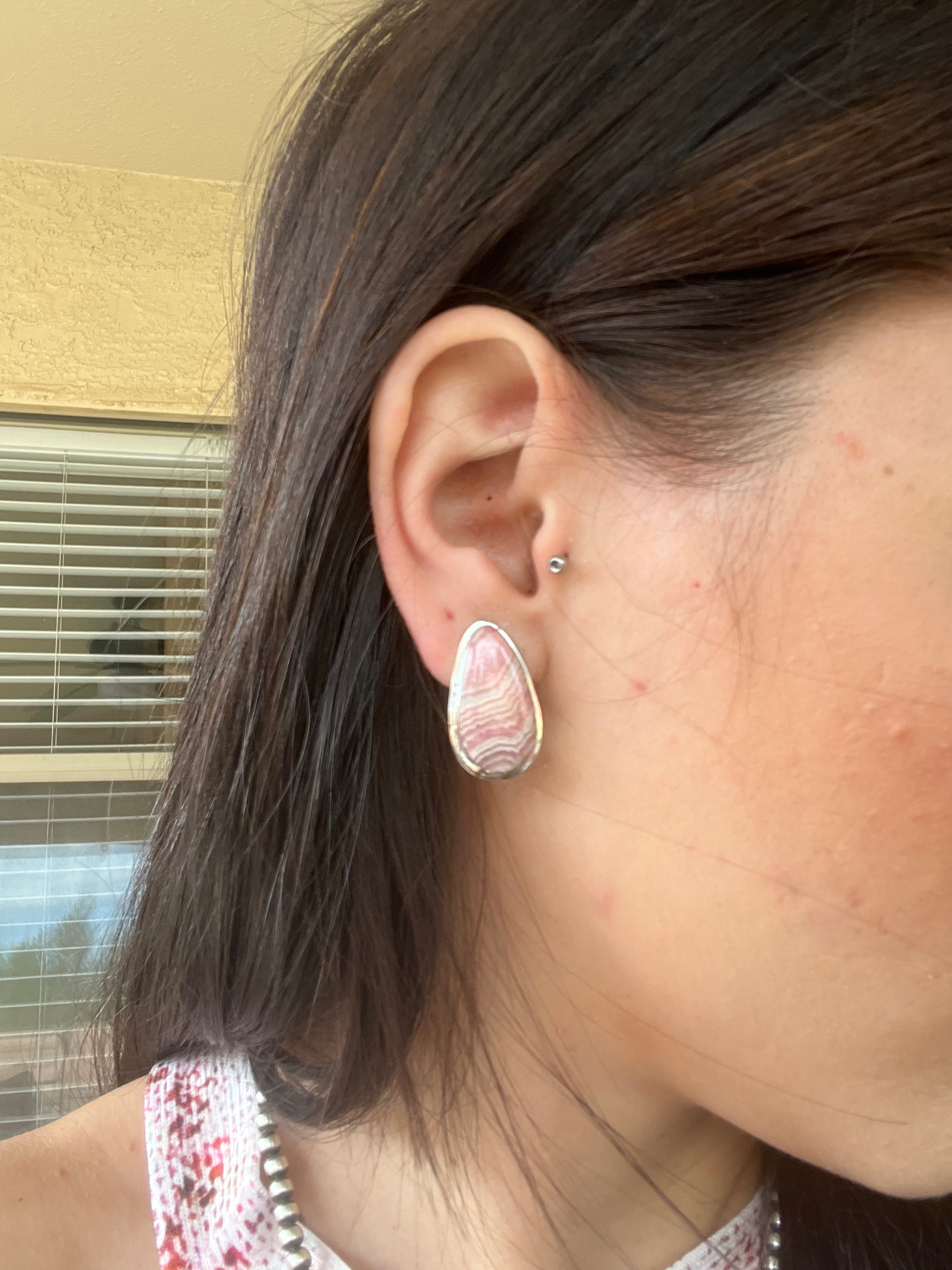 Navajo Made Rhodochrosite & Sterling Silver Clip On Earrings. It measures 1 inch long and 1/2 of an inch wide. Stamped sterling silver.