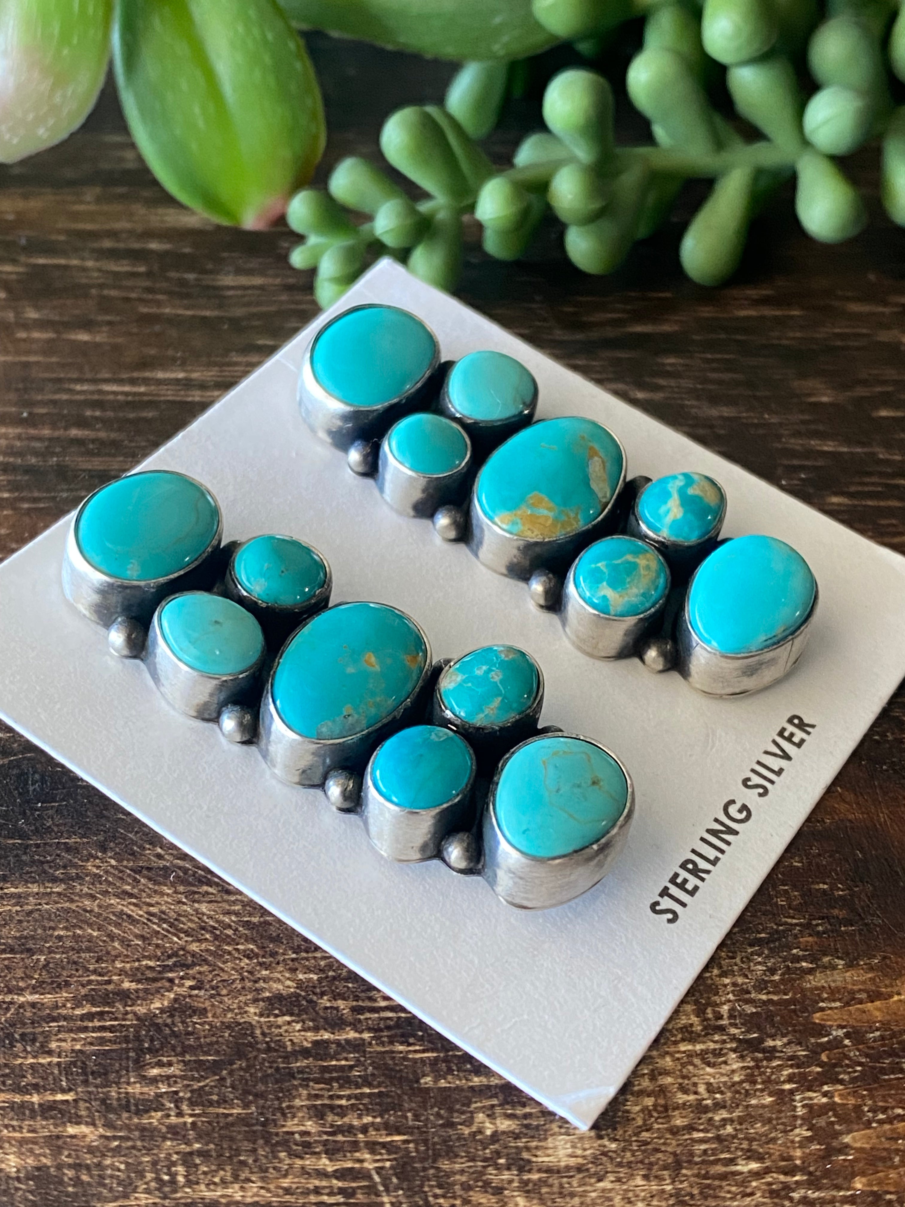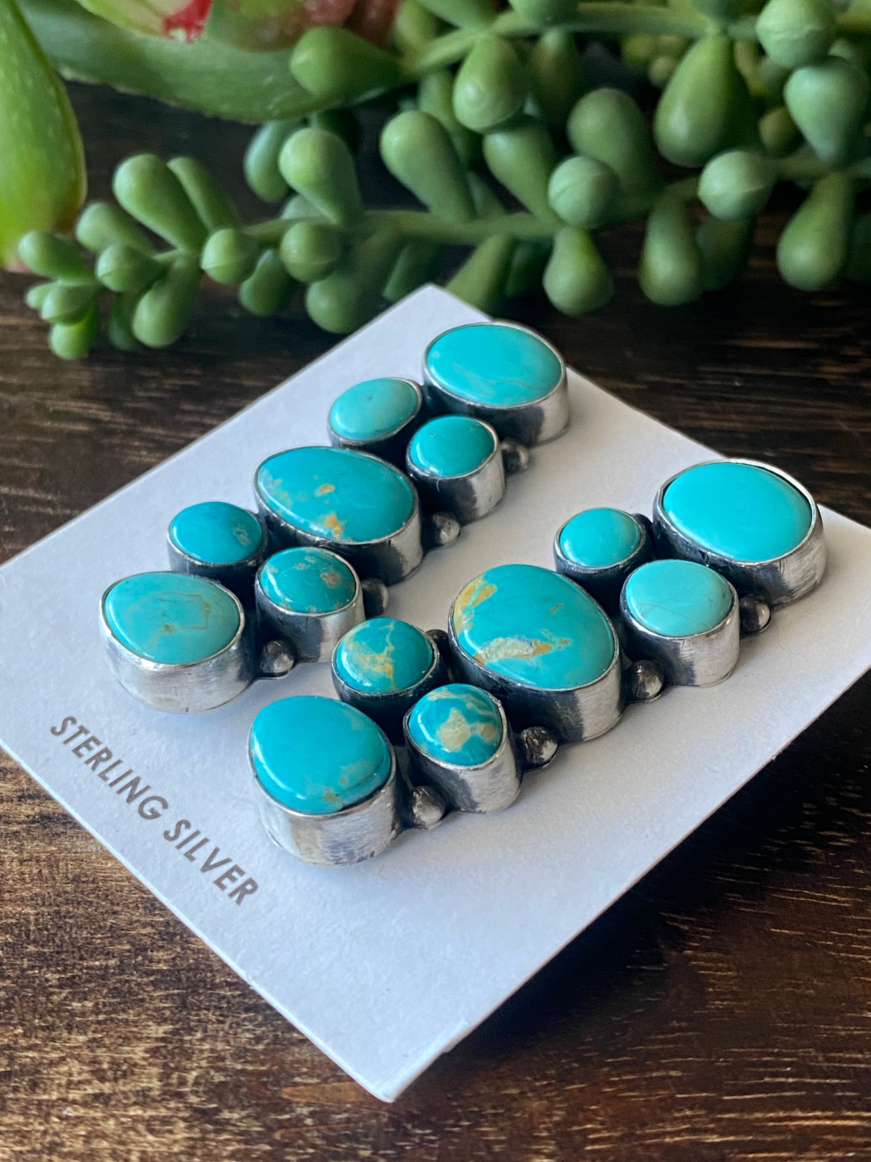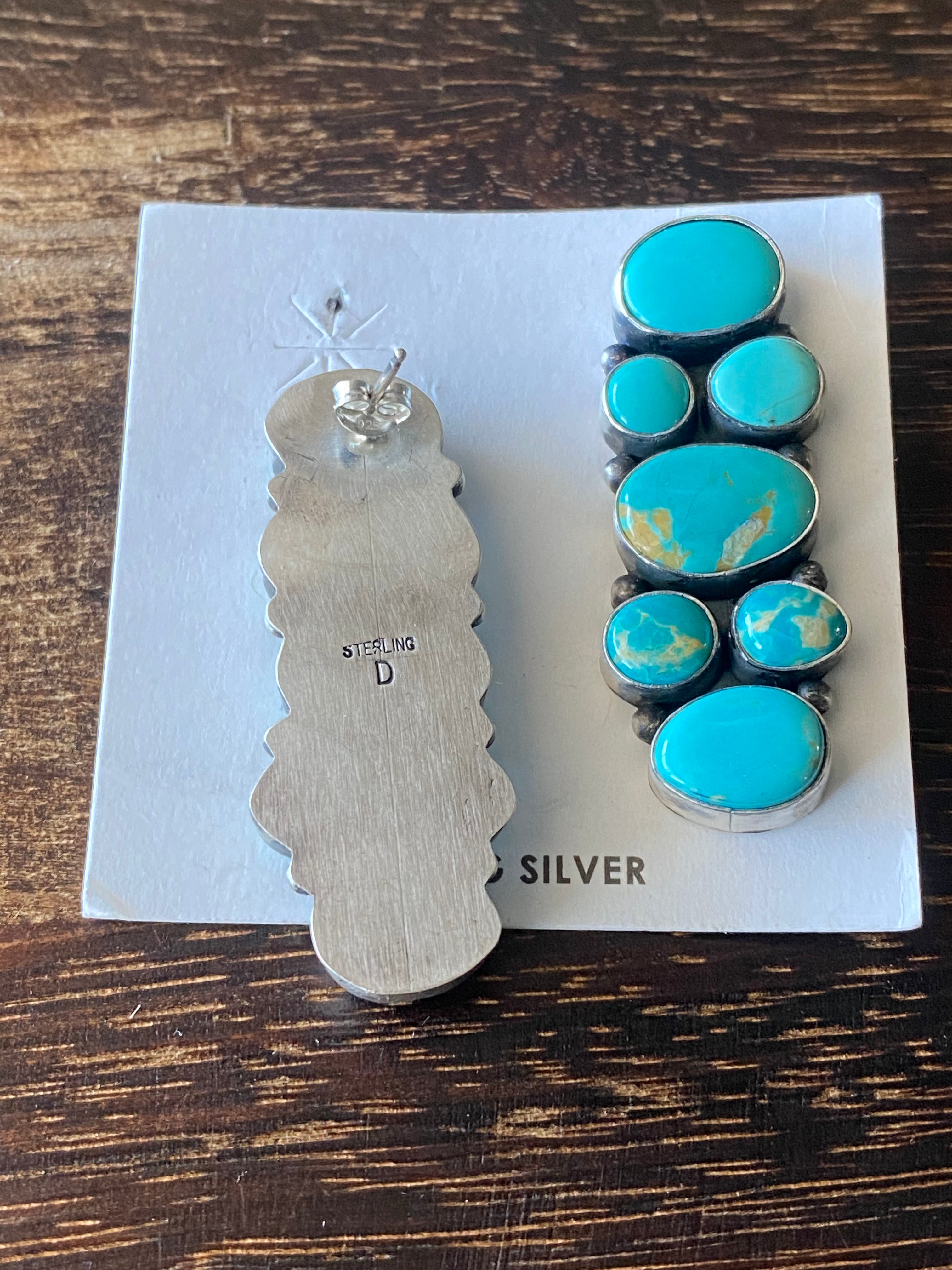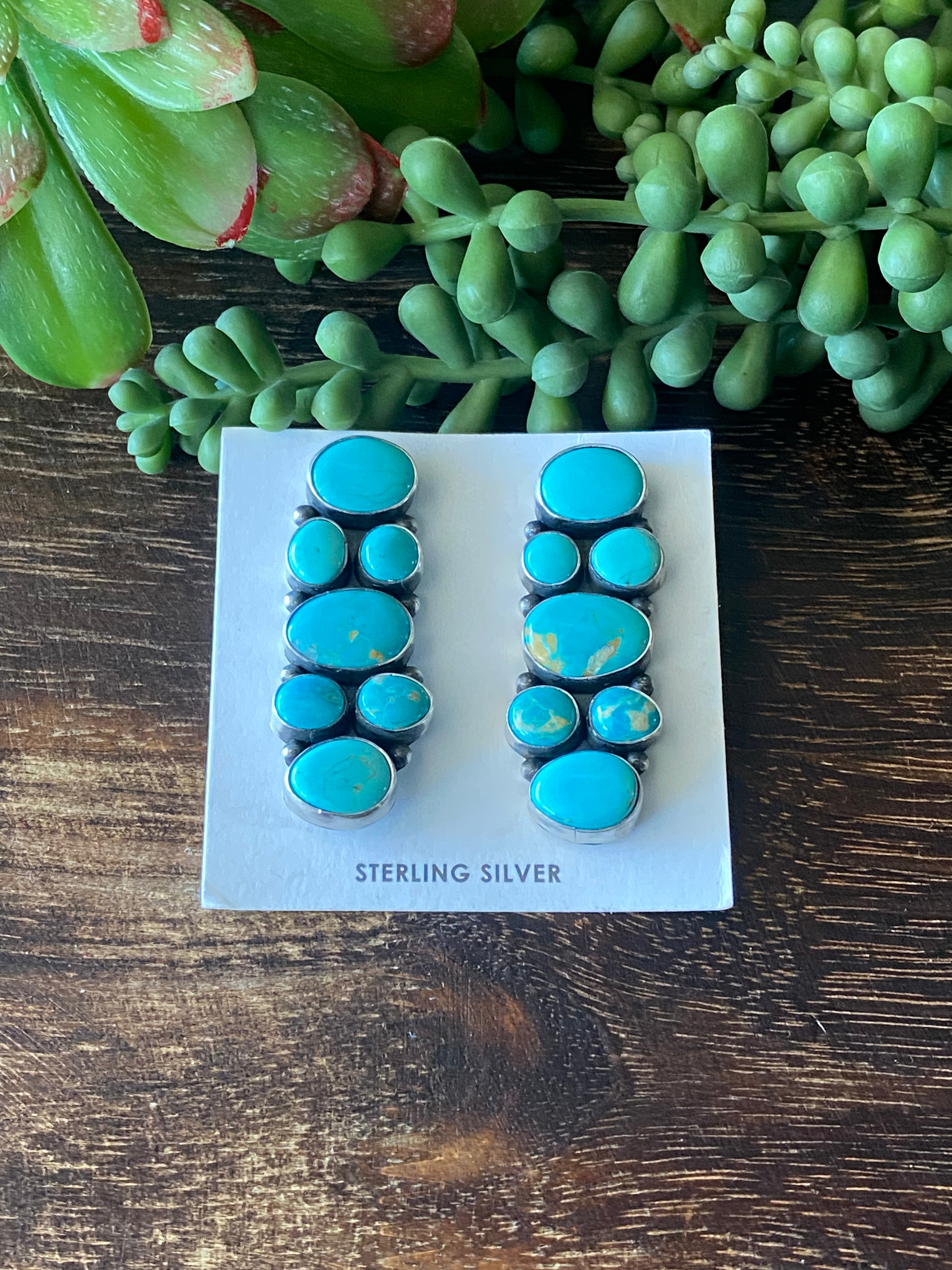 Navajo Made Royston Turquoise & Sterling Silver Cluster Post Earrings. They measure 1 7/8 inches long and 3/4 of an inch wide. Signed by the artist and stamped sterling silver.