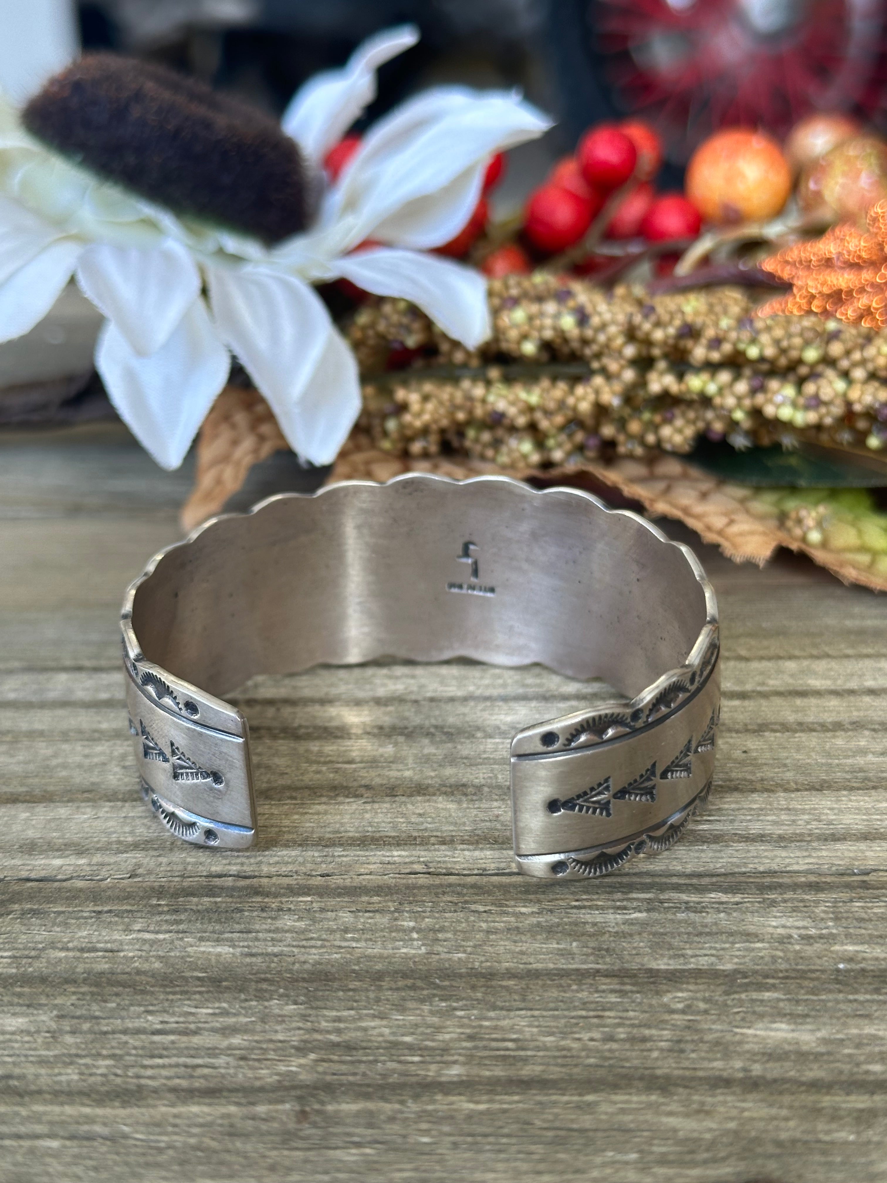 Navajo Made Royston Turquoise & Sterling Silver Cuff Bracelet. It measures 1 inch wide with an inside circumference of 5 7/8 inches and a gap of 1 inch. Signed by artist and stamped sterling silver.