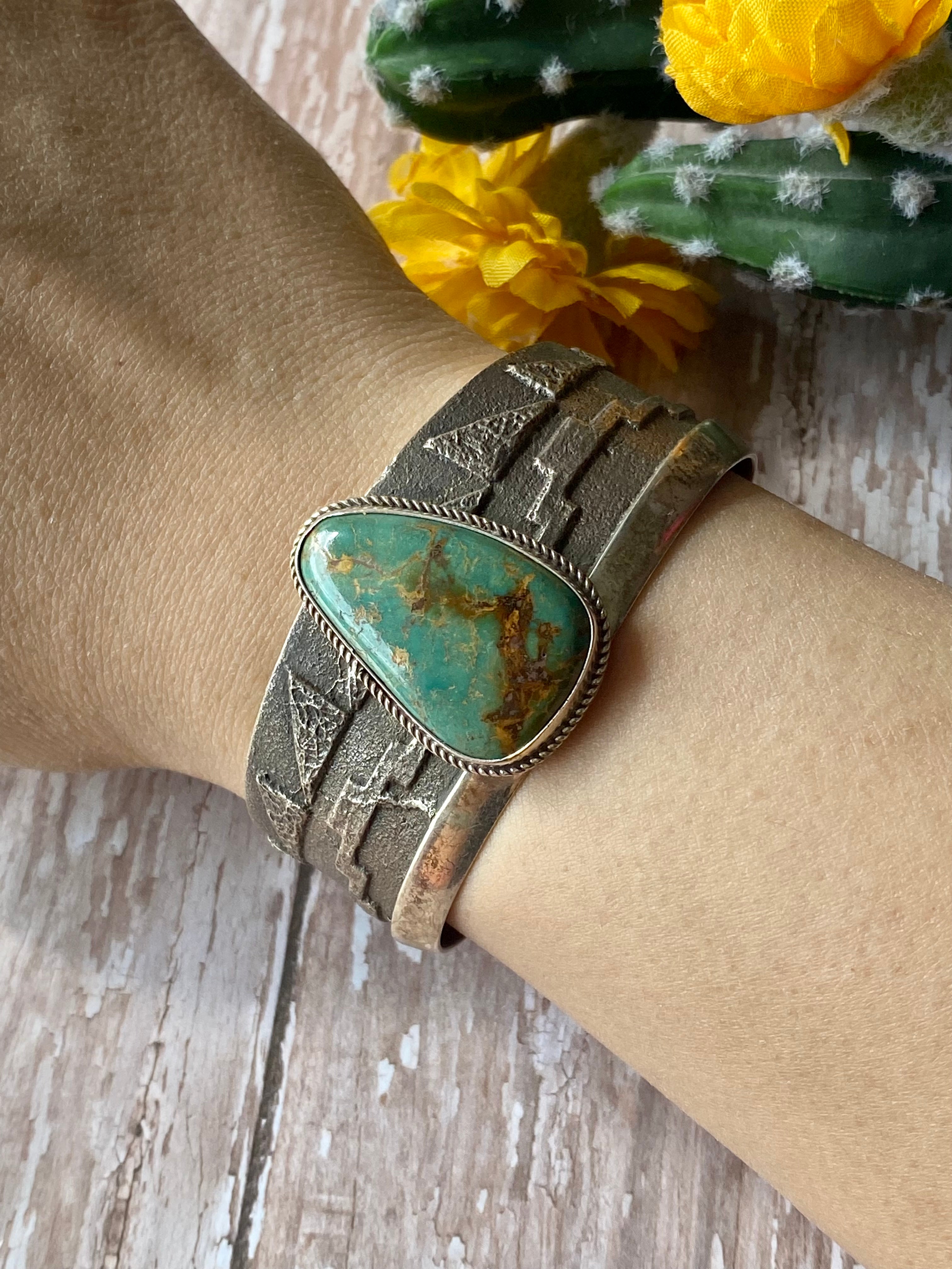 Vintage Navajo Made Royston Turquoise & Sterling Silver Tufa Cast Cuff Bracelet. It measures 1 3/8 inches wide with an inside circumference of 5 1/2 inches and a gap of 1 inch. It weights 65 grams. Signed by the artist and stamped sterling silver.