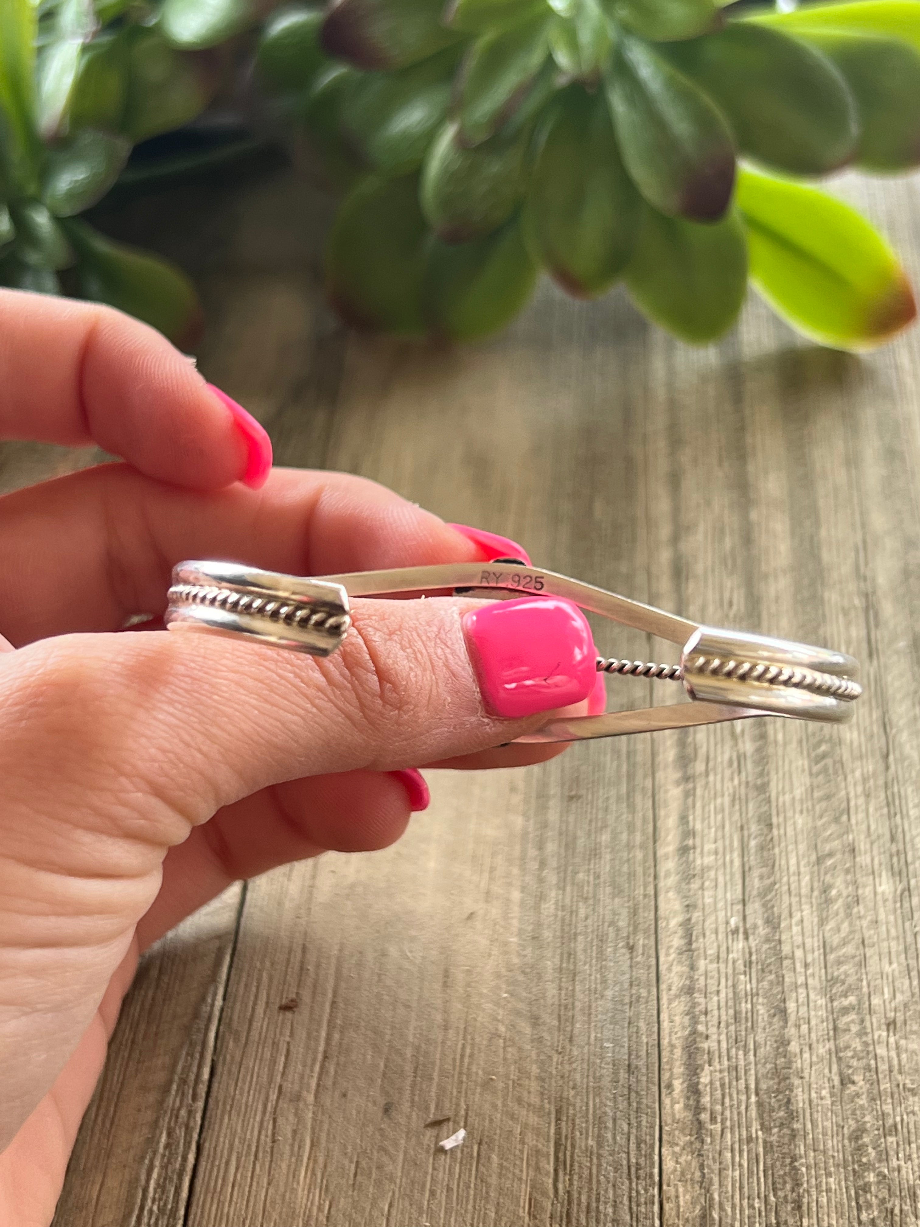 Navajo Made Sleeping Beauty & Sterling Silver Cuff Bracelet. It measures just over 3/4 of an inch wide with an inside circumference of just over 5 1/4 inches and a gap of 7/8 of an inch. Signed by the artist and stamped sterling silver.