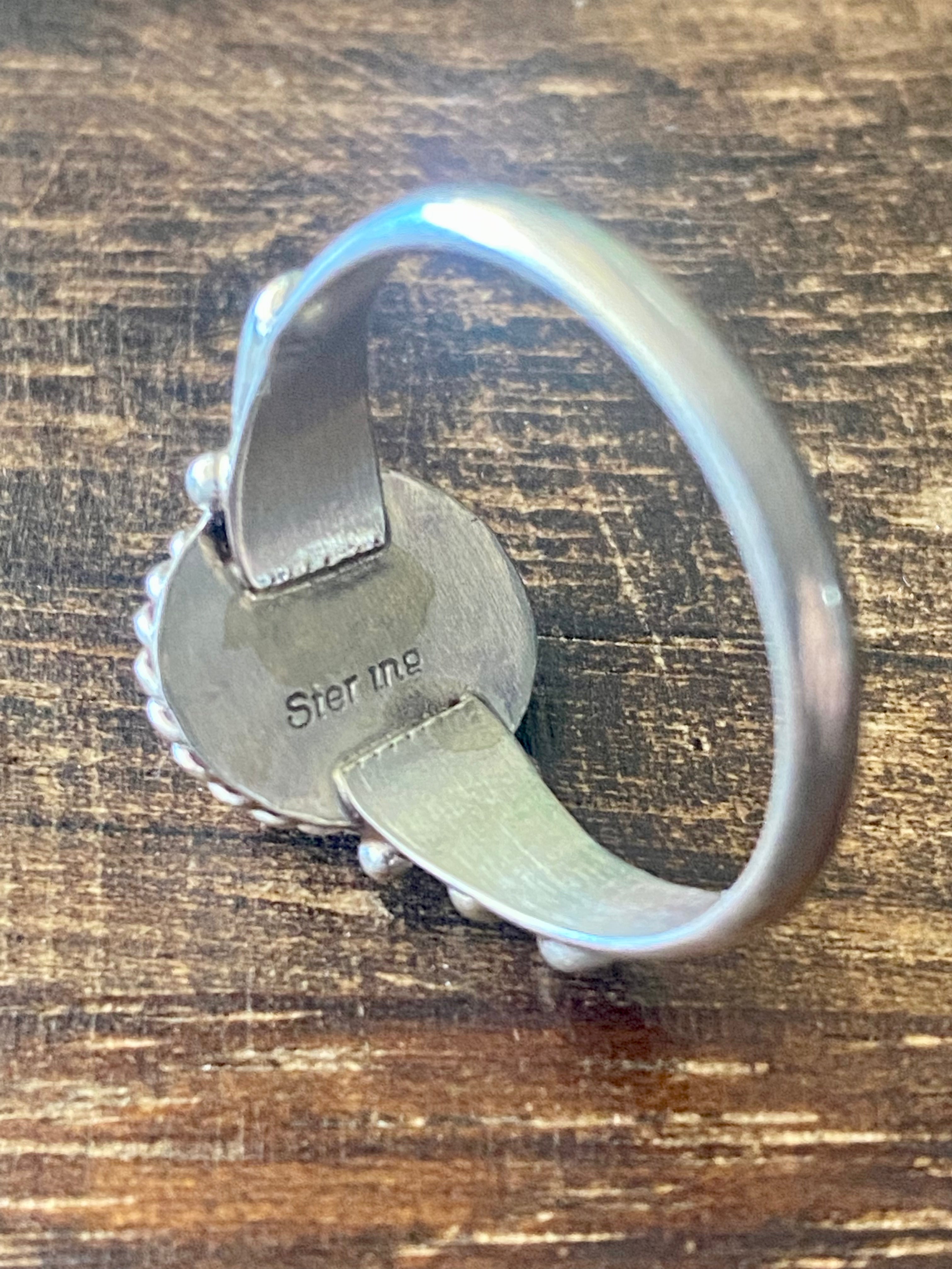 Navajo Made Spiny Oys & Sterling Silver Ring. It measures just over 1/2 of an inch long and 1/2 of an inch wide. Stones will differ due to natural stones. Stamped sterling silver.