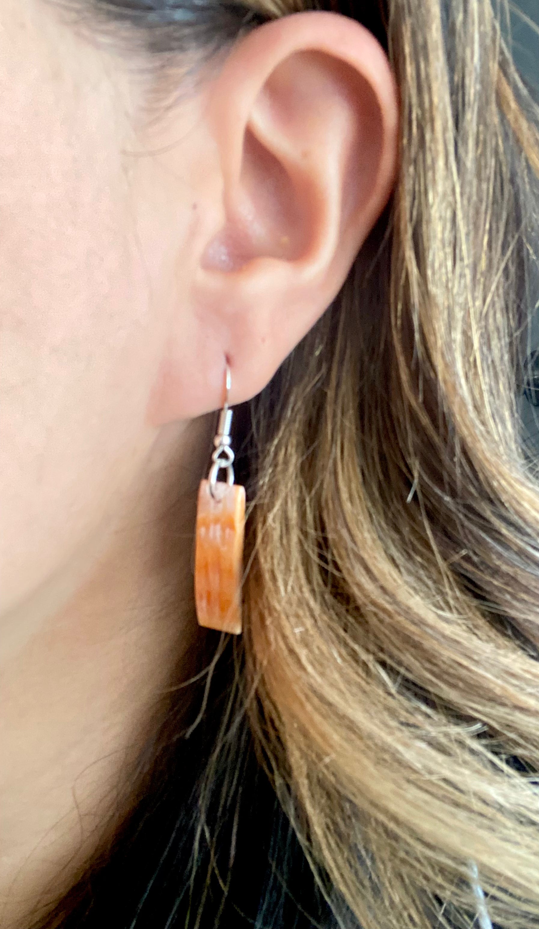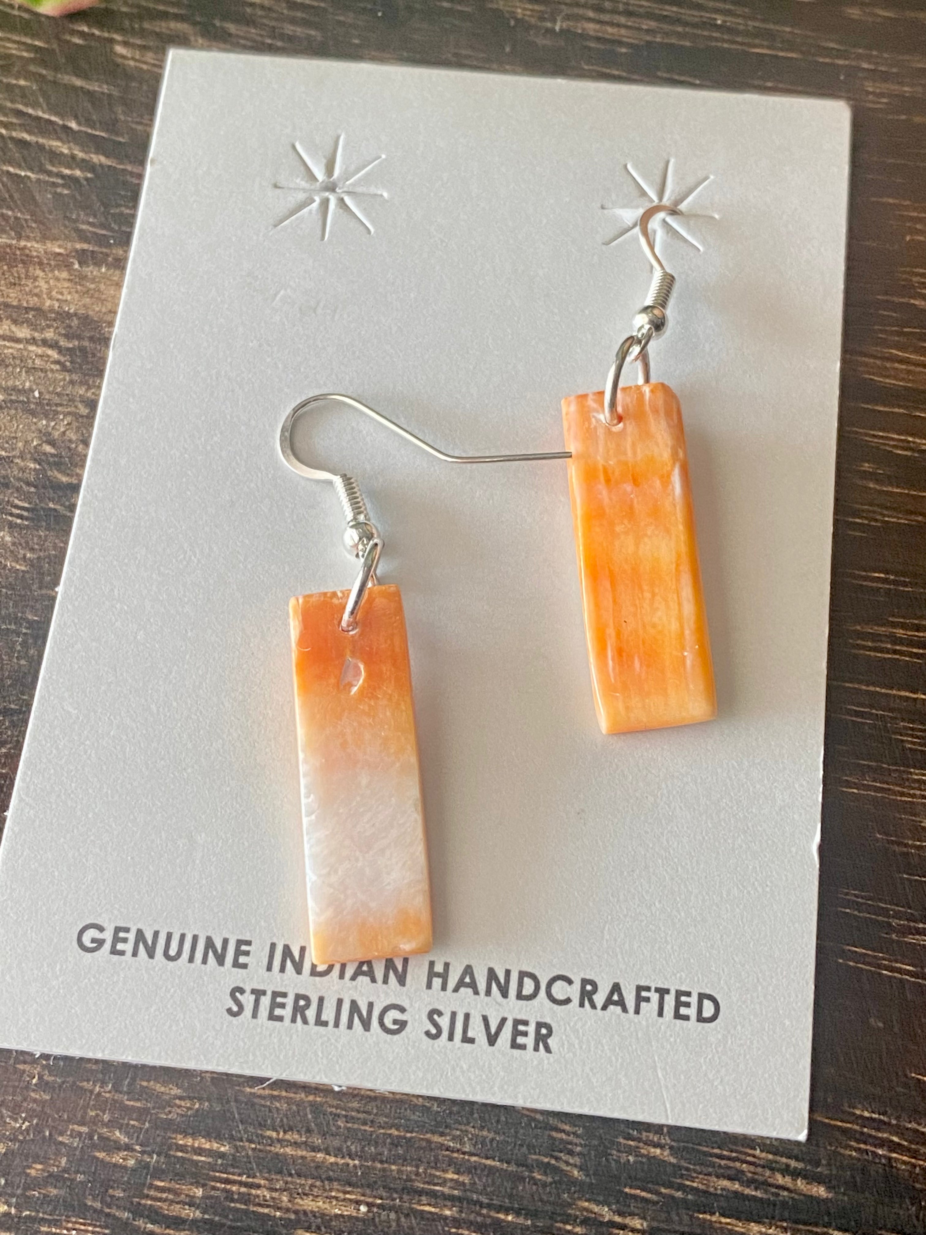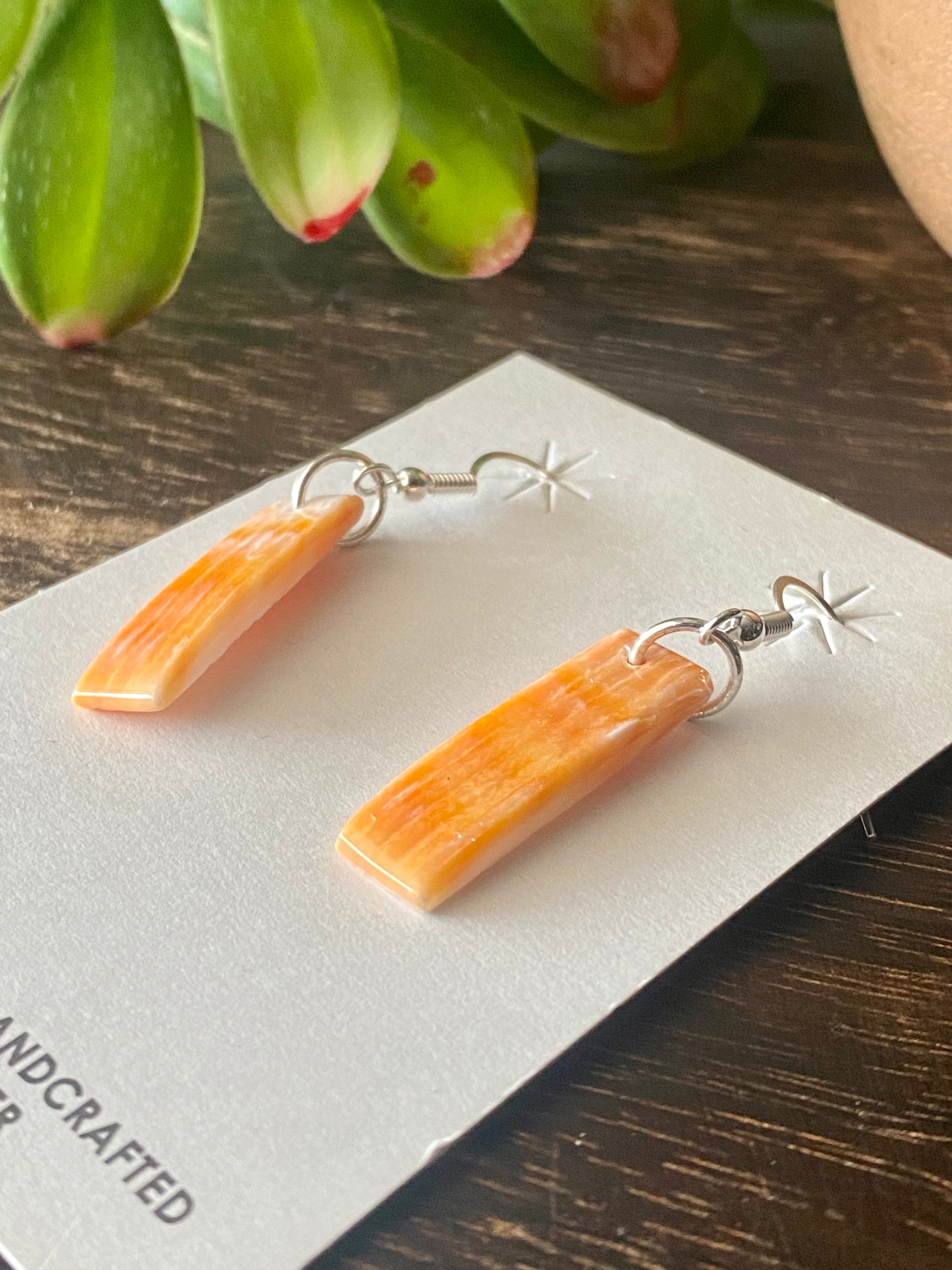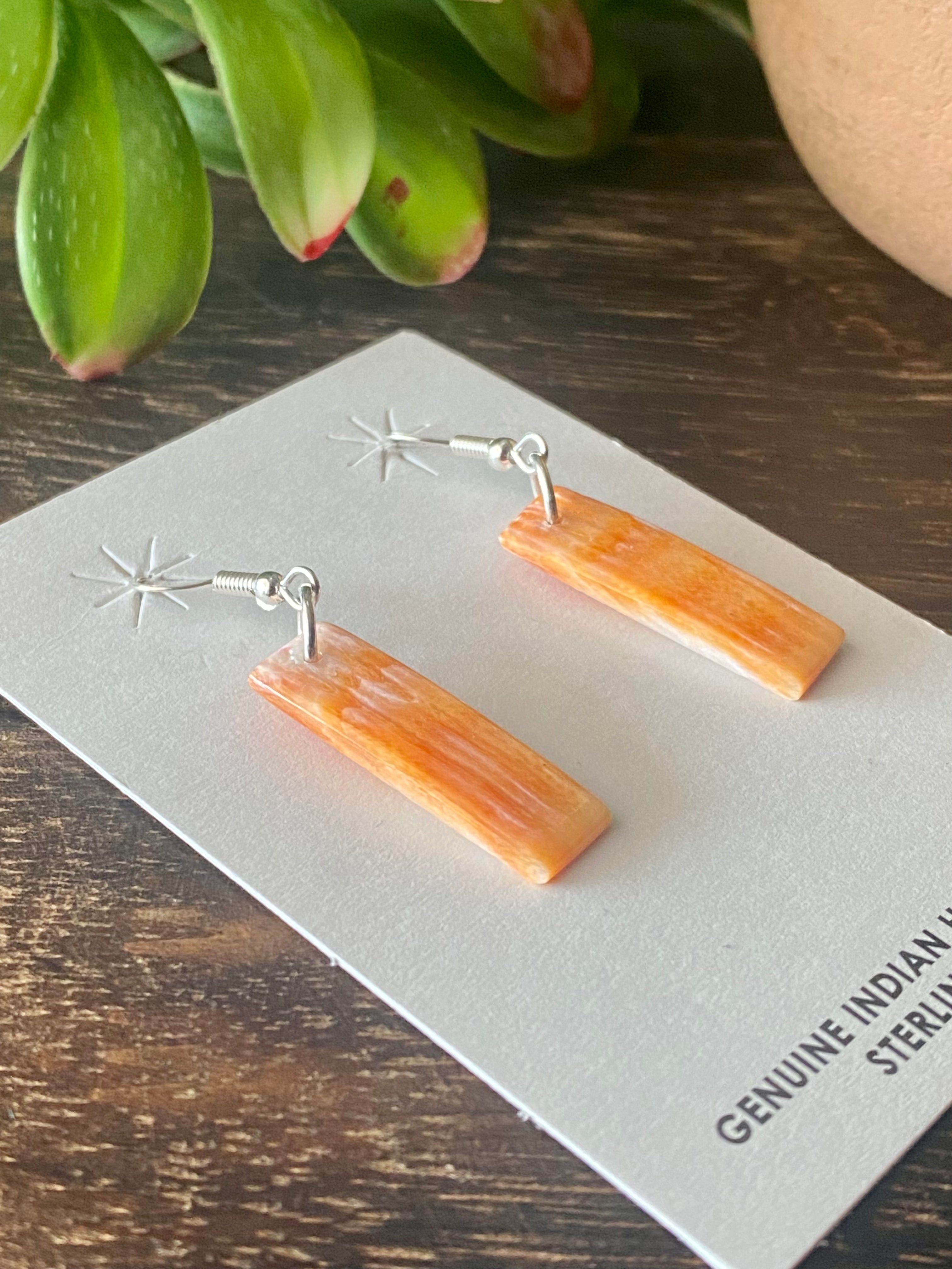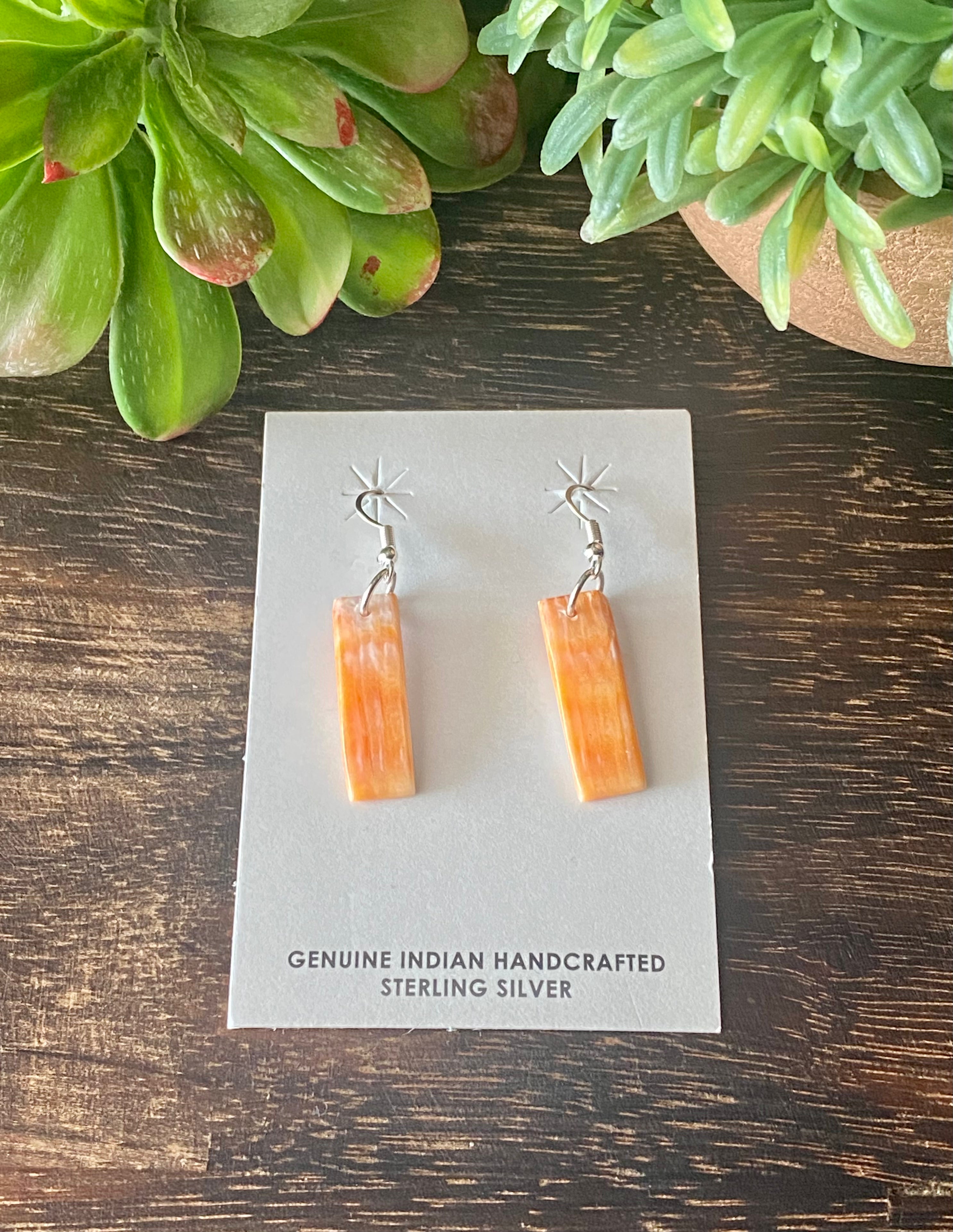 Navajo Made Spiny Oys & Sterling Silver Slab Dangle Earrings. They measure just under 2 inches long and 3/8 of an inch wide.