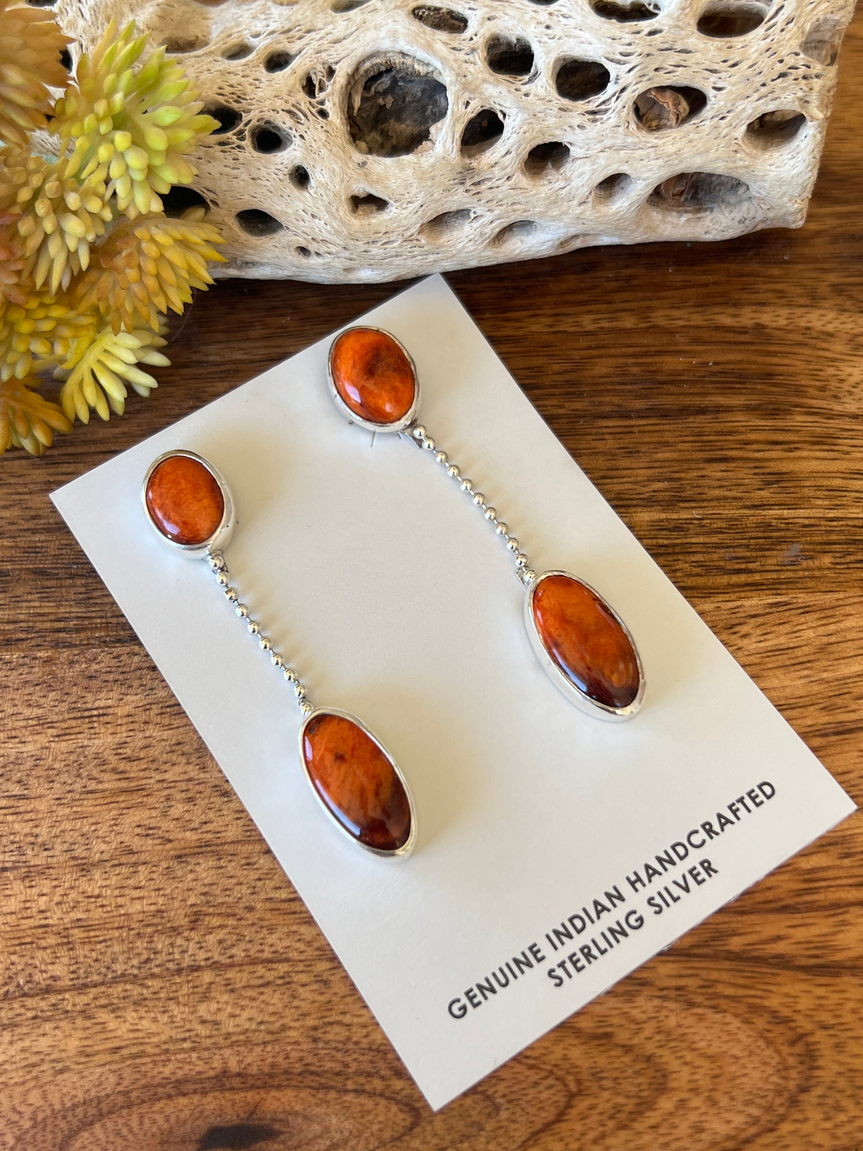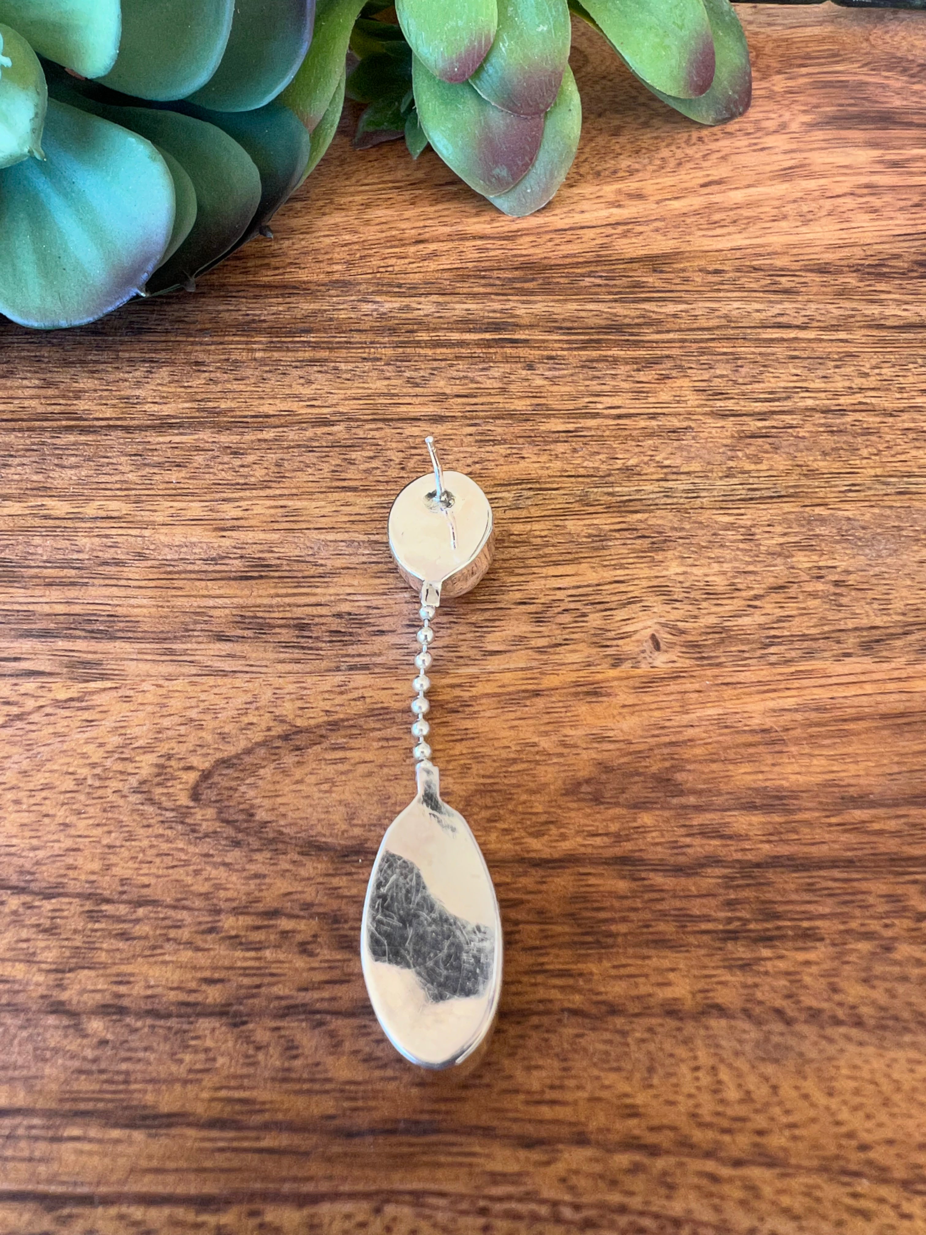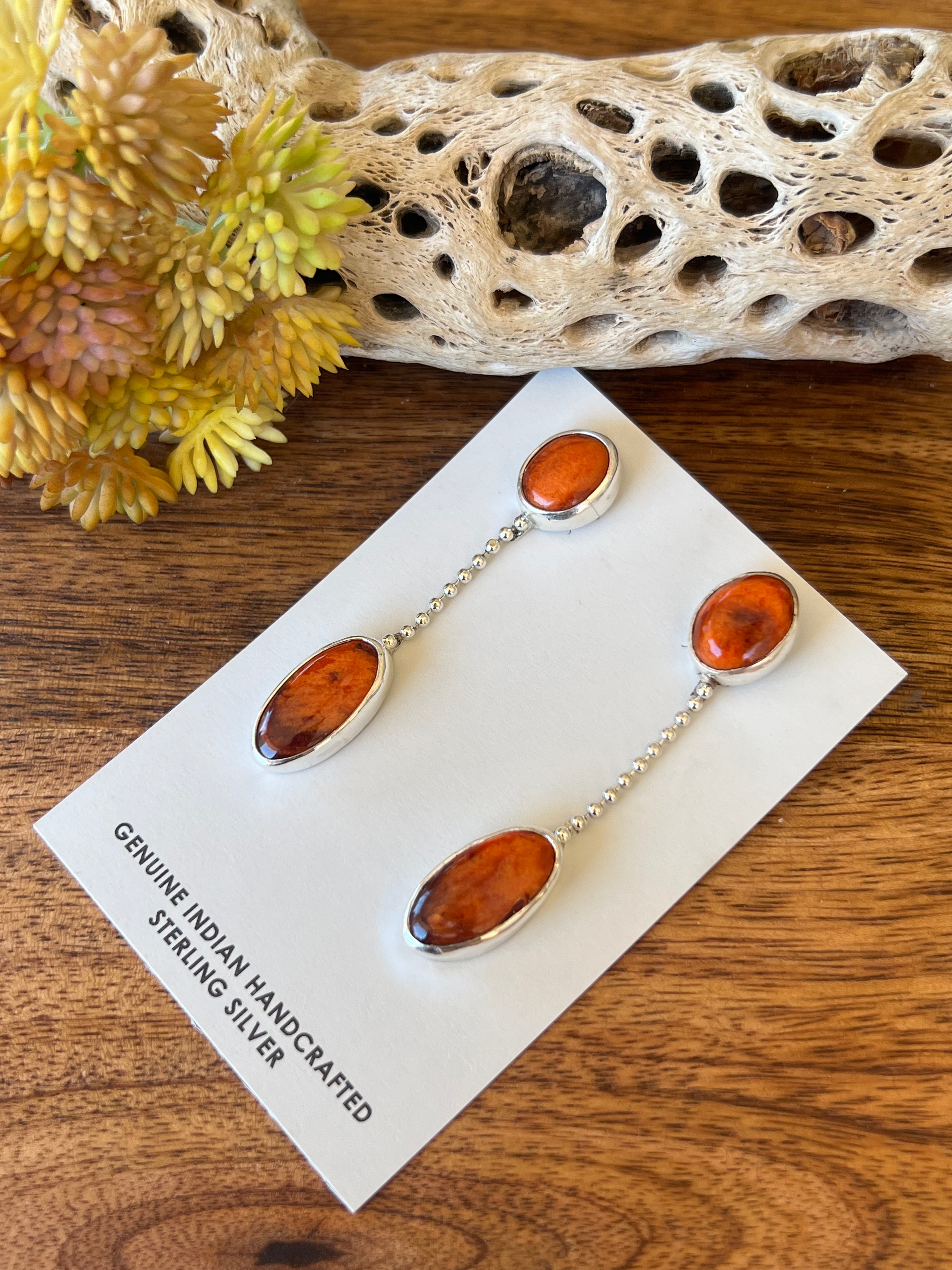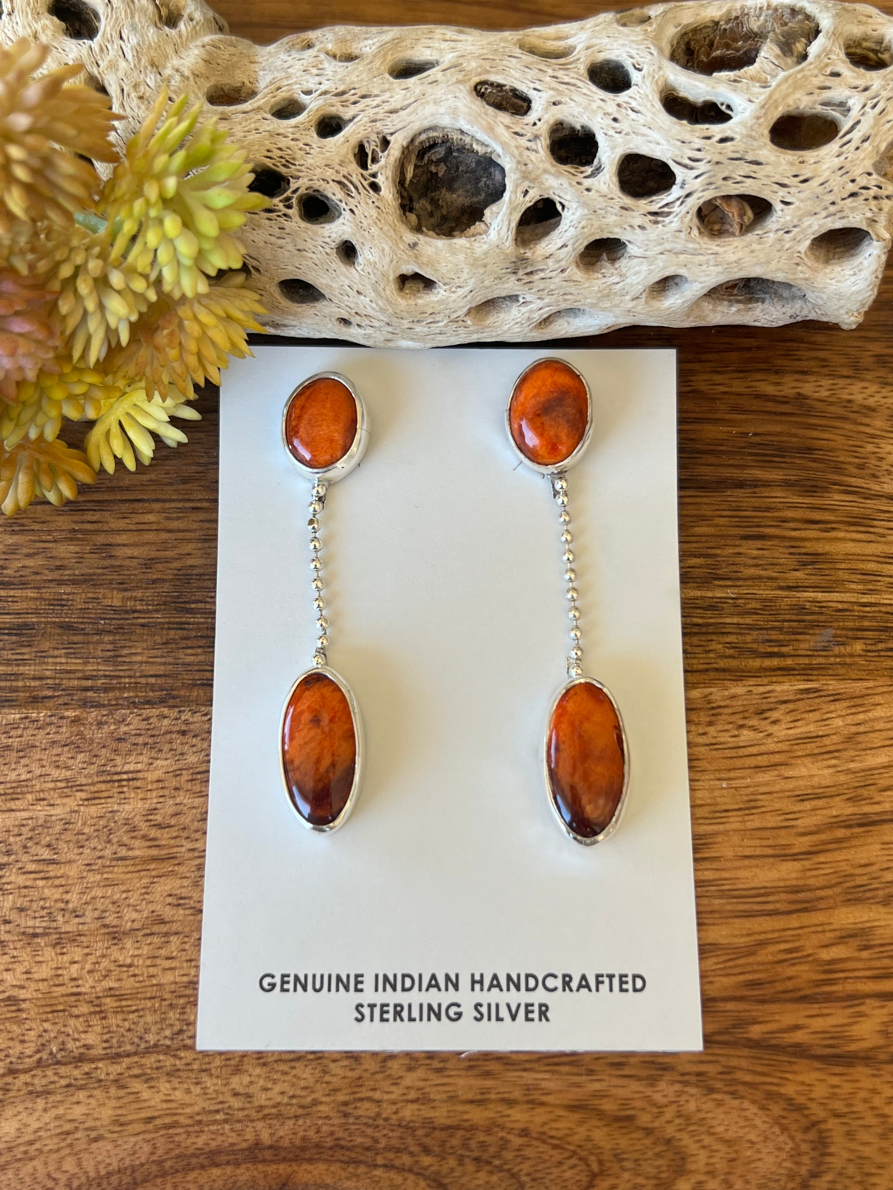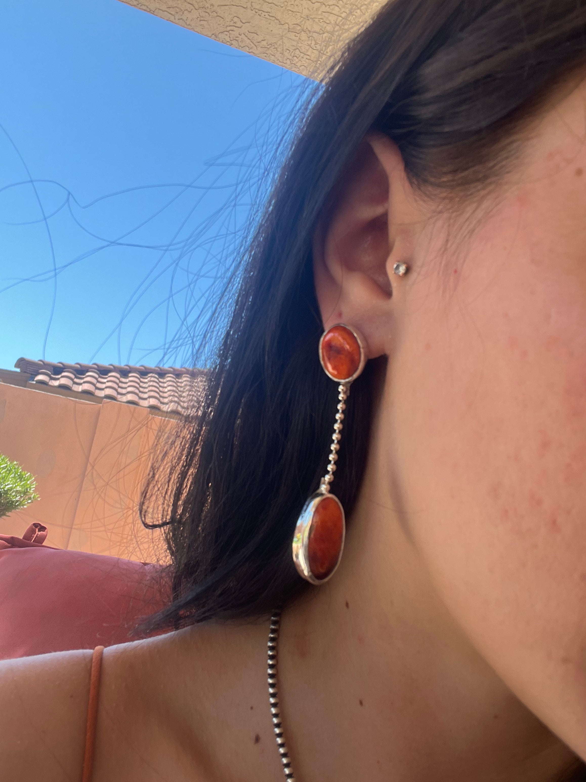 Navajo Made Spiny Oyster Post Earrings. It measures 2 1/2 inch long and 3/8 of an inch wide.
