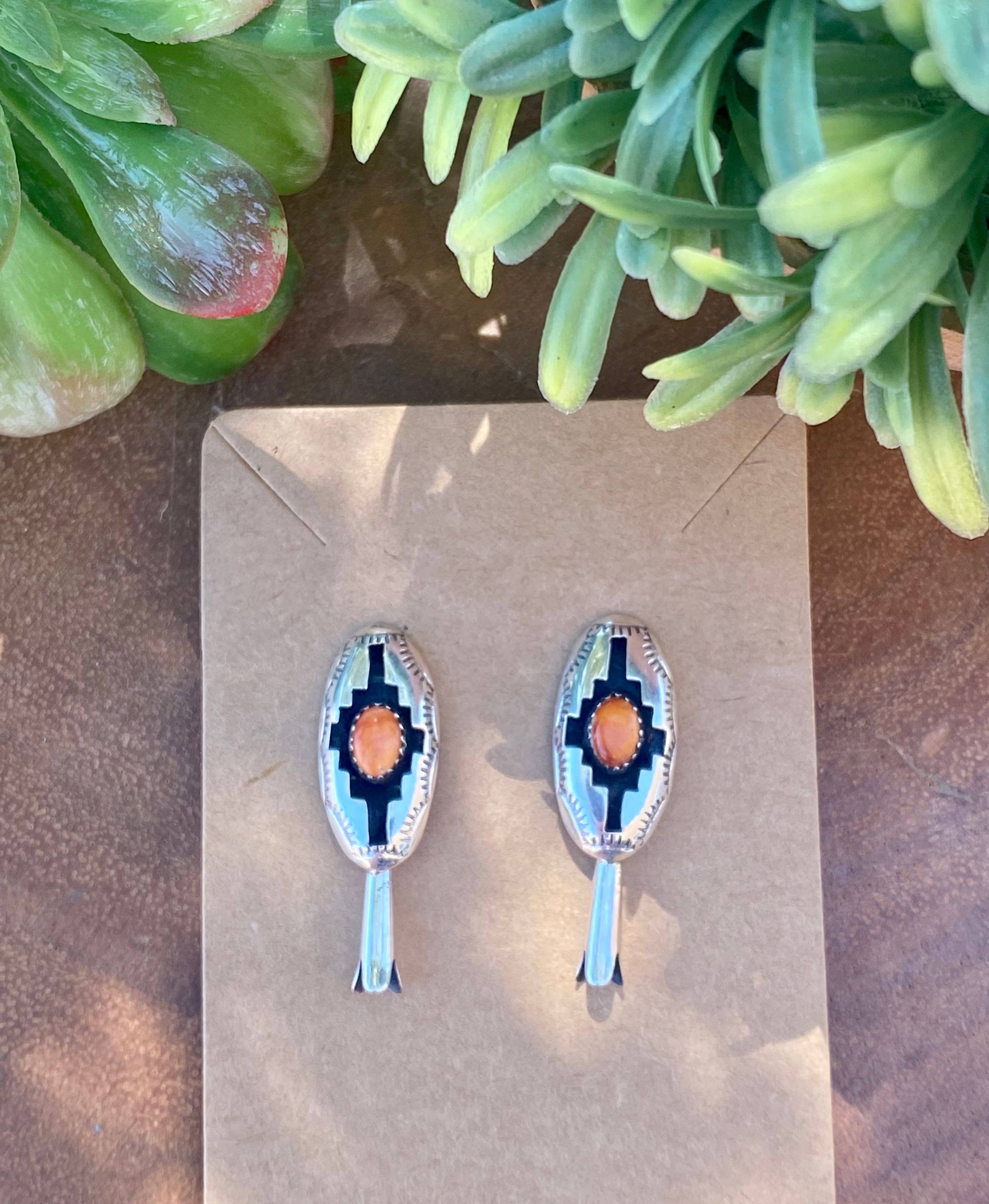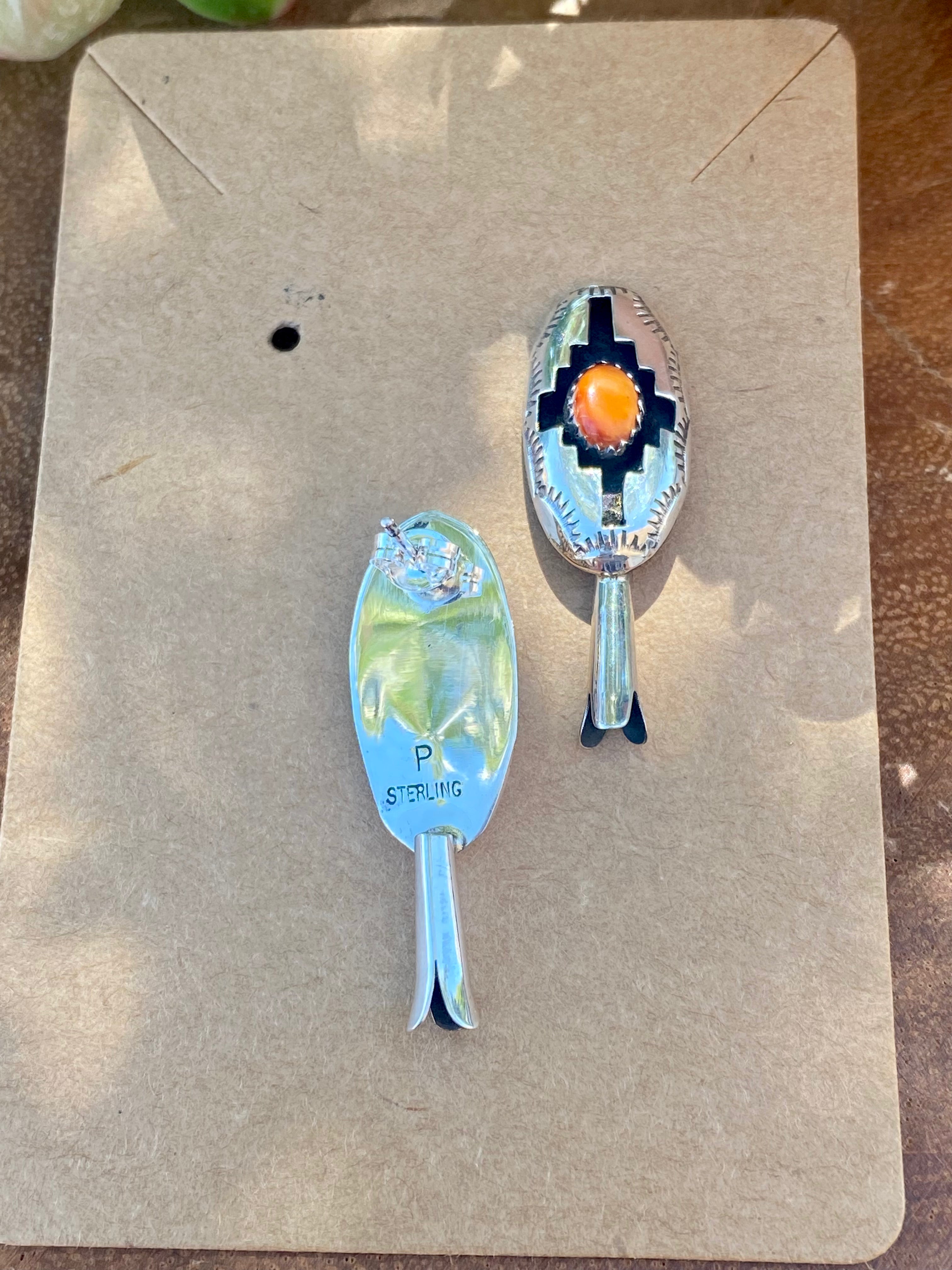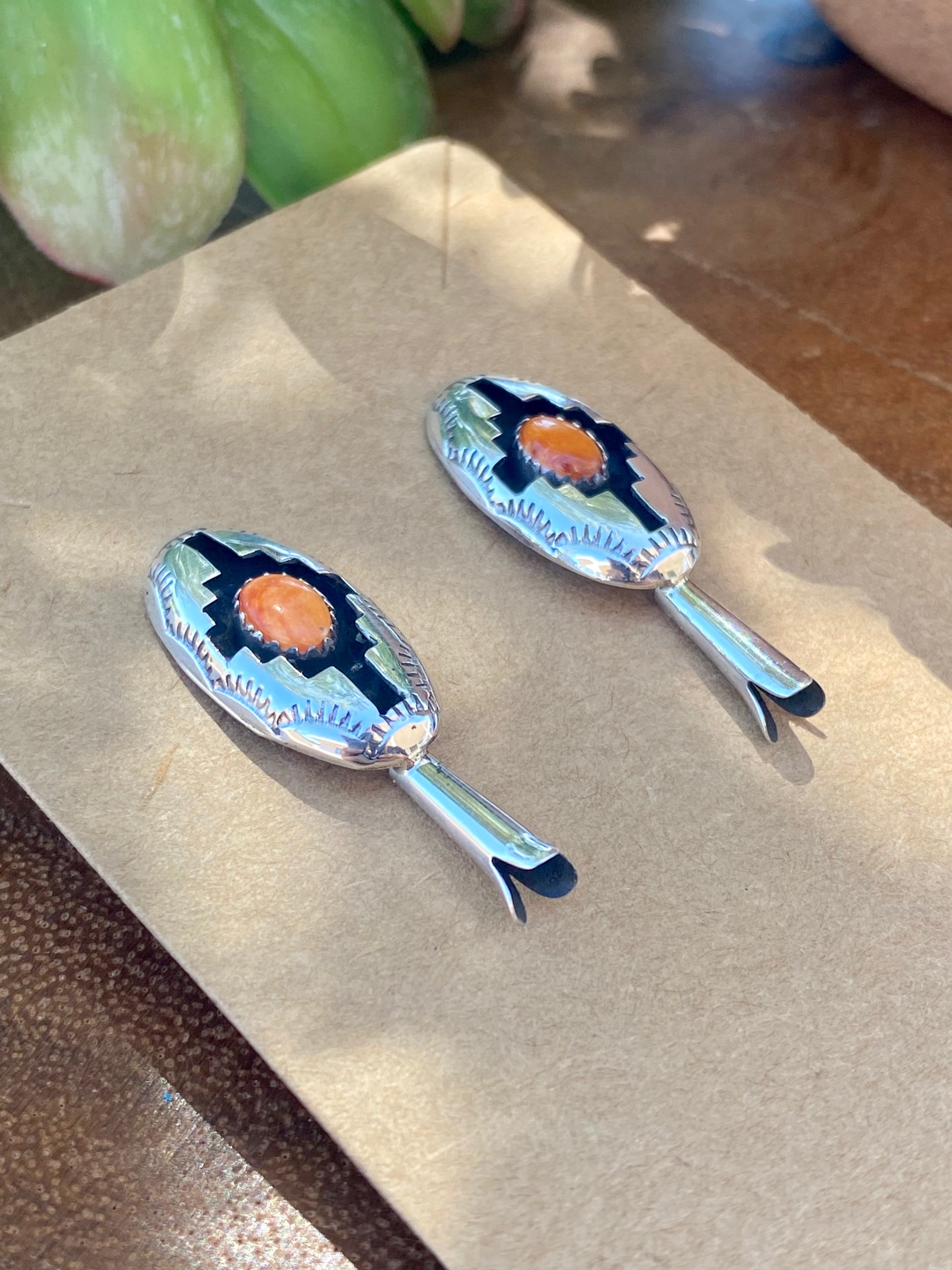 Navajo Made Spiny Oyster & Sterling Silver Blossom Post Dangle Earrings. They measure 1 3/8 inches long and 1/2 of an inch wide. Signed by the artist and stamped sterling silver.