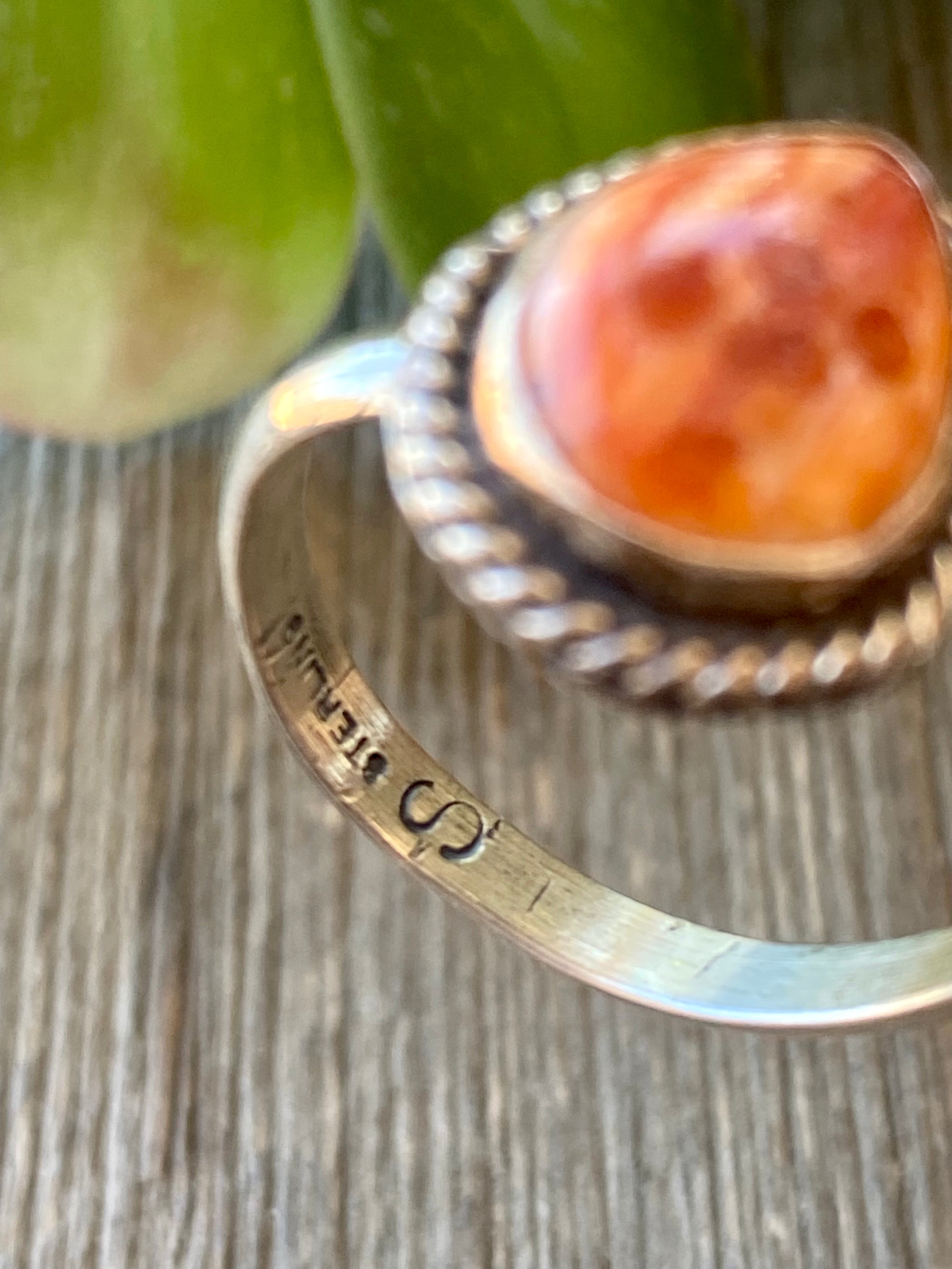 Navajo Made Spiny Oyster & Sterling Silver Knuckle Adjustable Ring. It measures 3/4 of an inch long and 1 5/8 inches wide. Signed by the artist and stamped sterling silver.