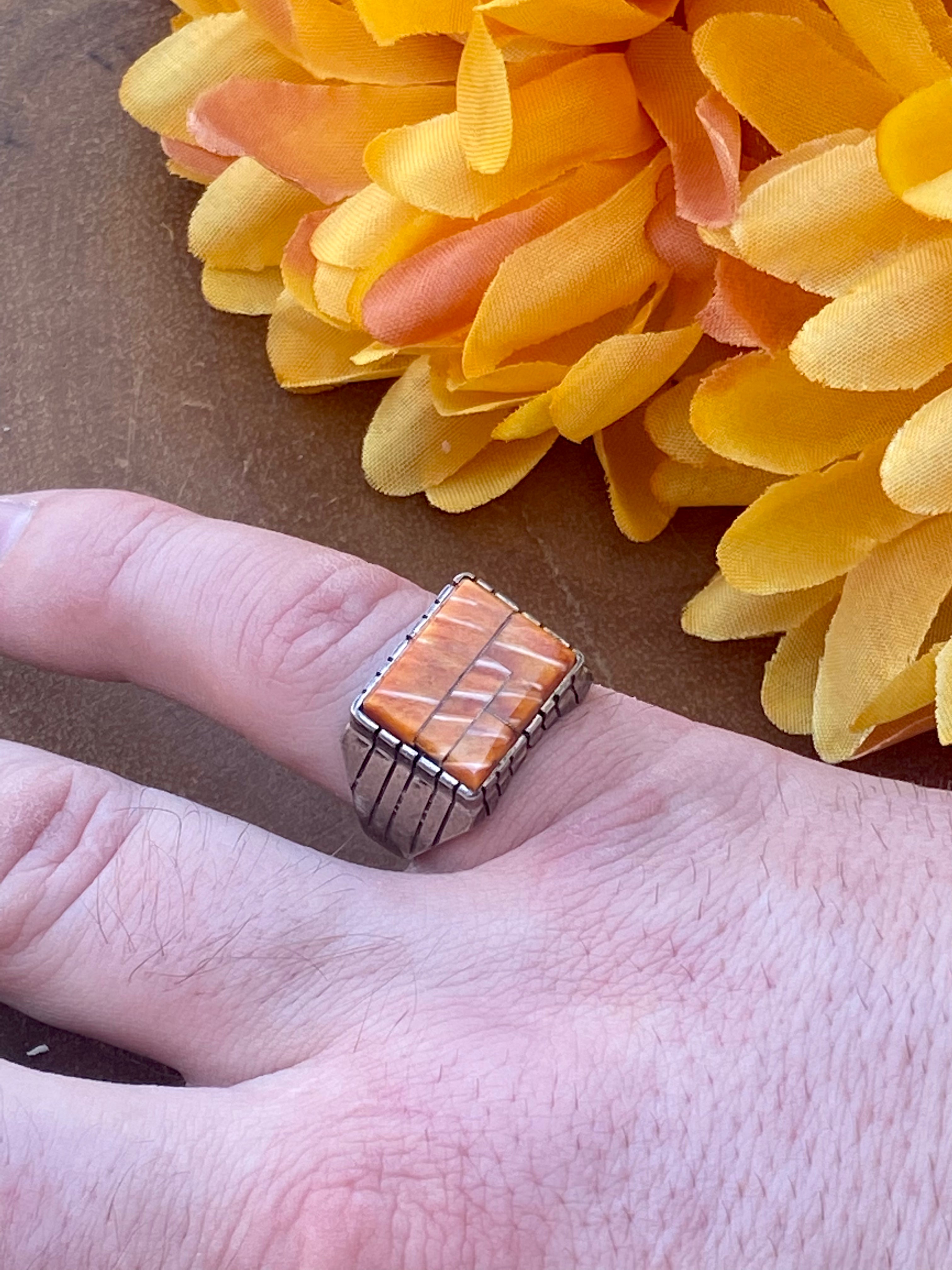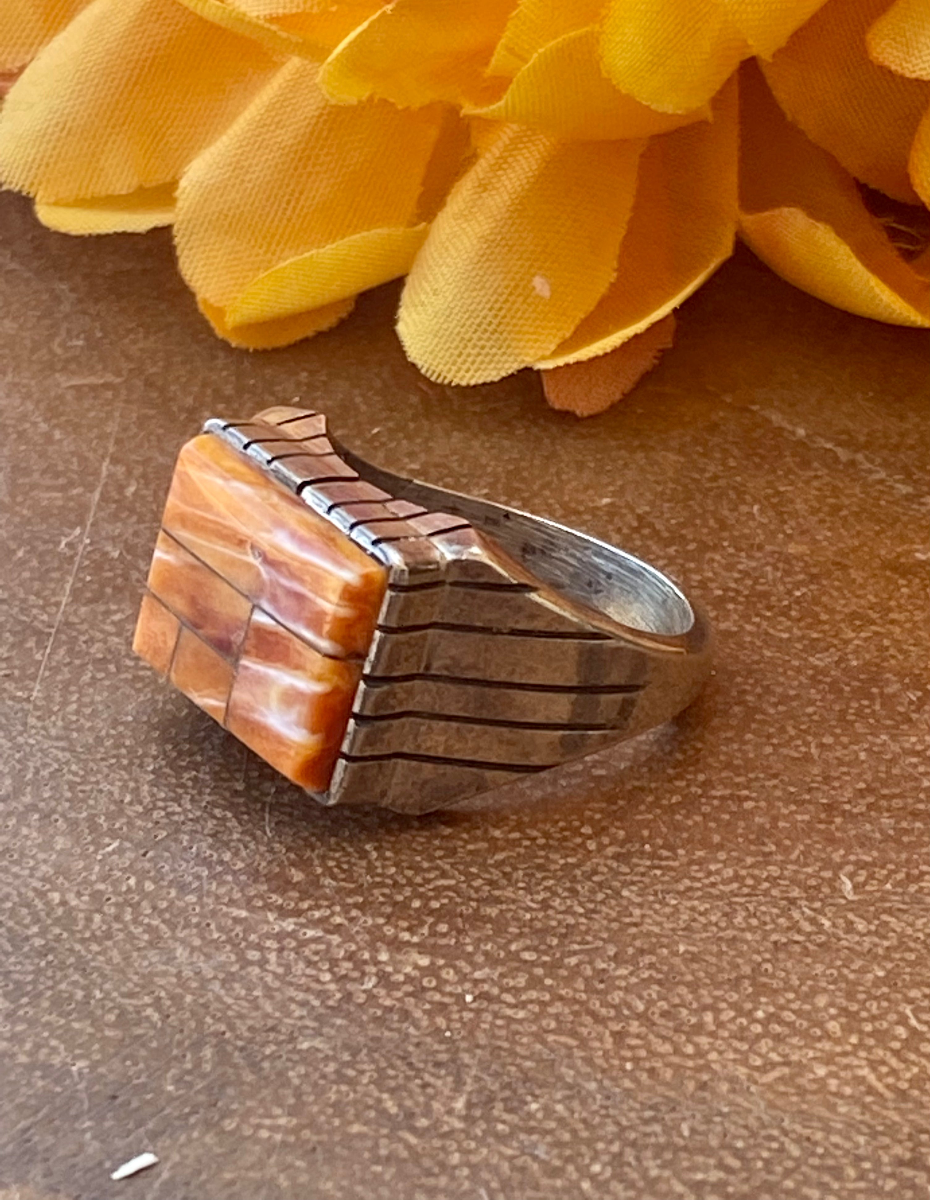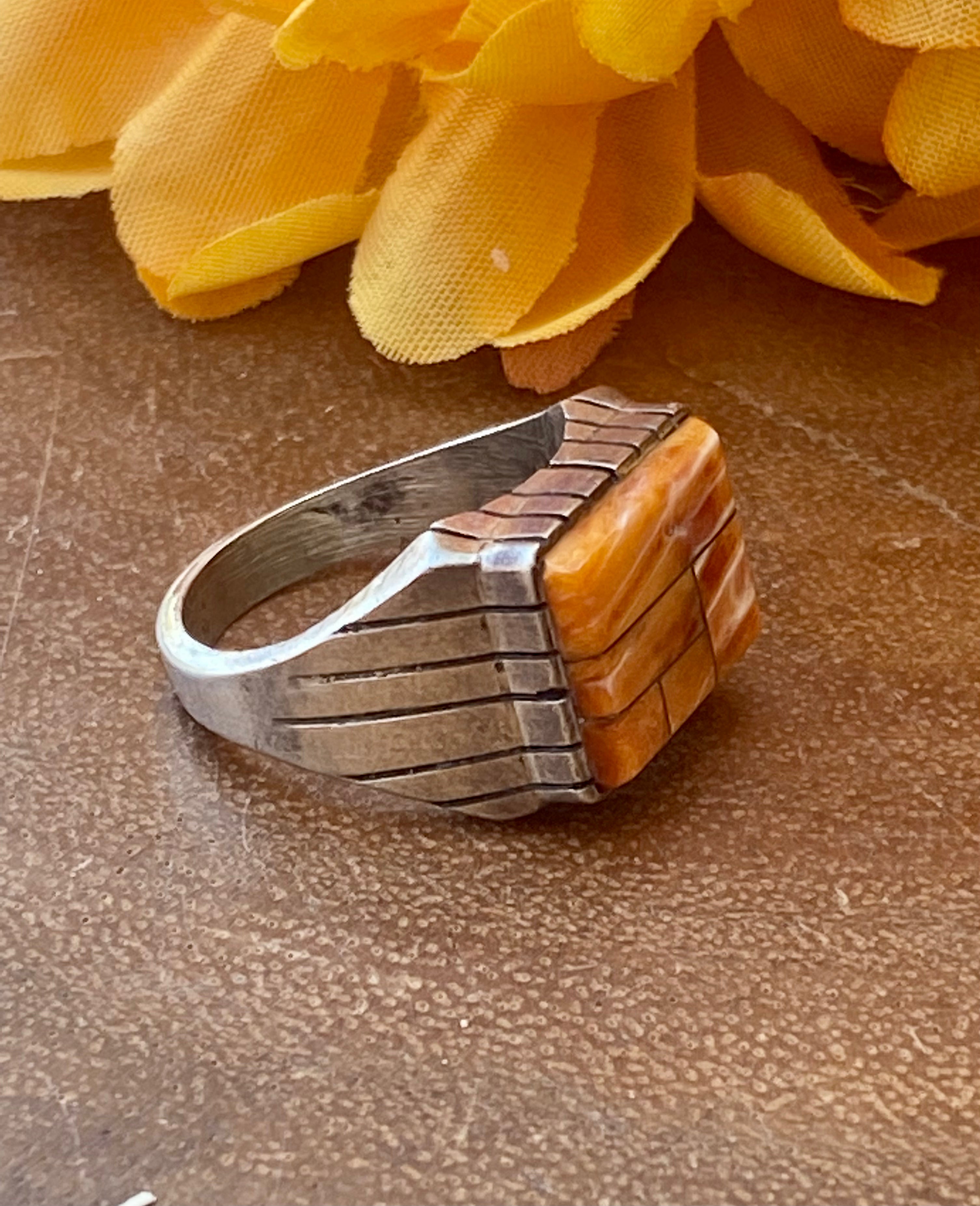 Navajo Made Spiny Oyster & Sterling Silver Men’s Inlay Ring Size 9