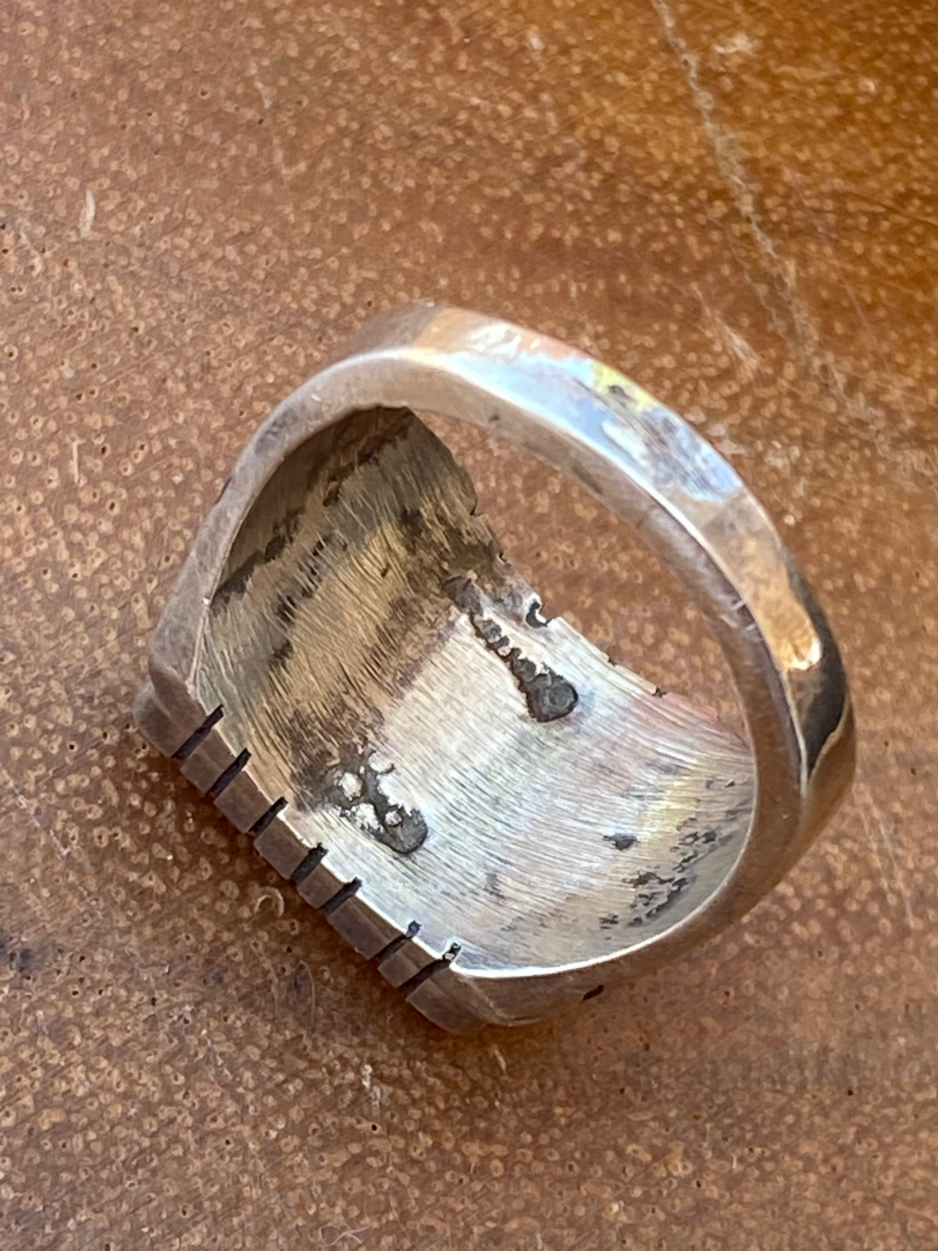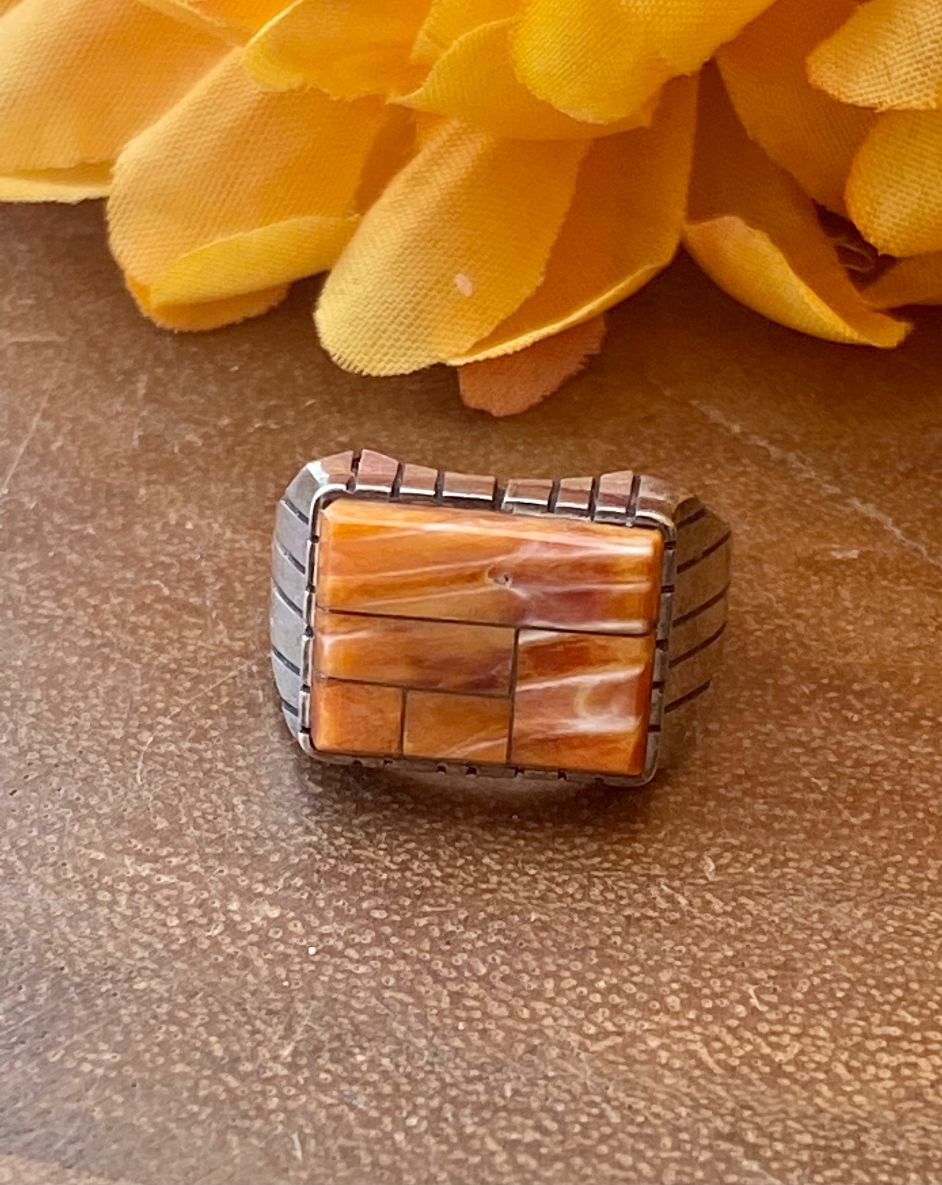 Navajo Made Spiny Oyster & Sterling Silver Men’s Inlay Ring Size 9. It measures just over 1/2 of an inch long and 5/8 of an inch wide. Stones may differ due to natural stones. Signed by the artist and stamped sterling silver.