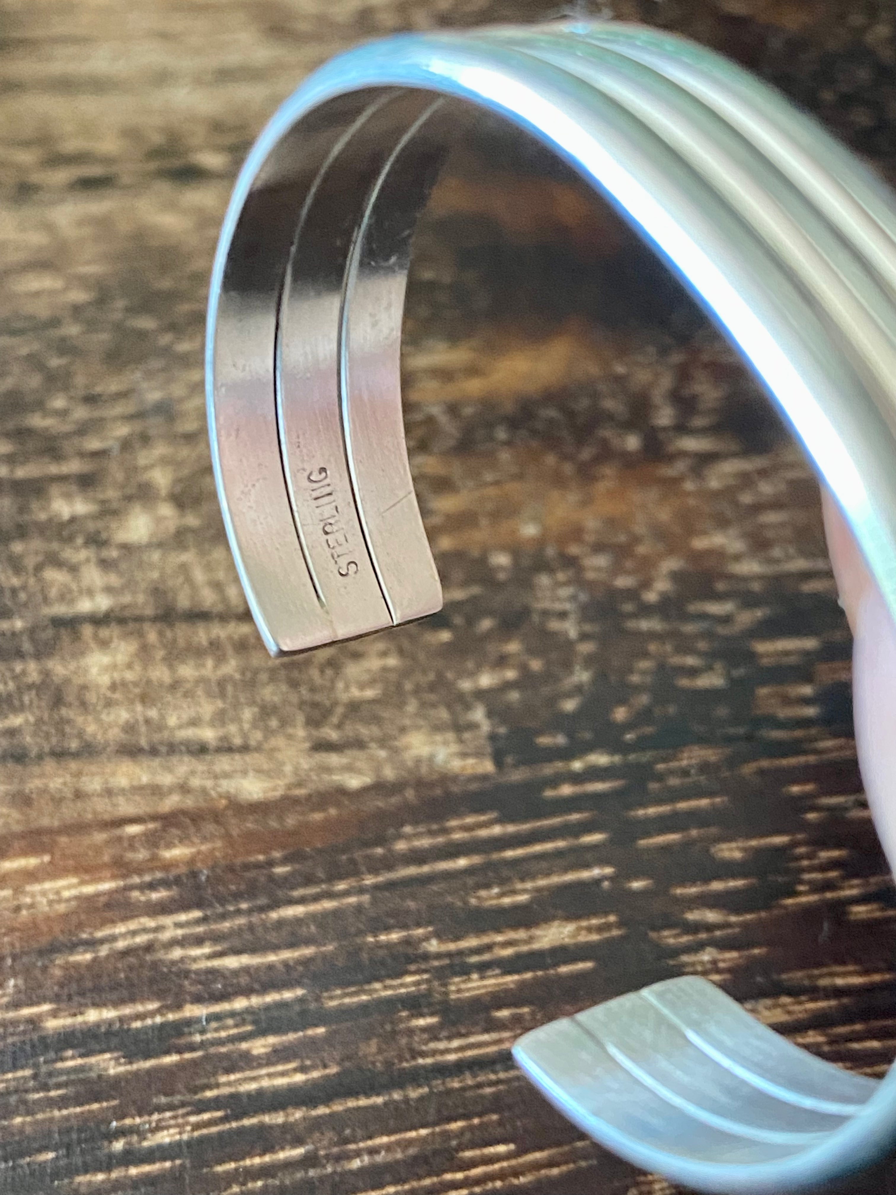 Navajo Made Sterling Silver Baby Cuff Bracelets. It measures just over 3/8 of an inch wide with an inside circumference of 3 3/4 inches and a gap of 5/8 of an inch. Cuff has flex. Stamped sterling silver.