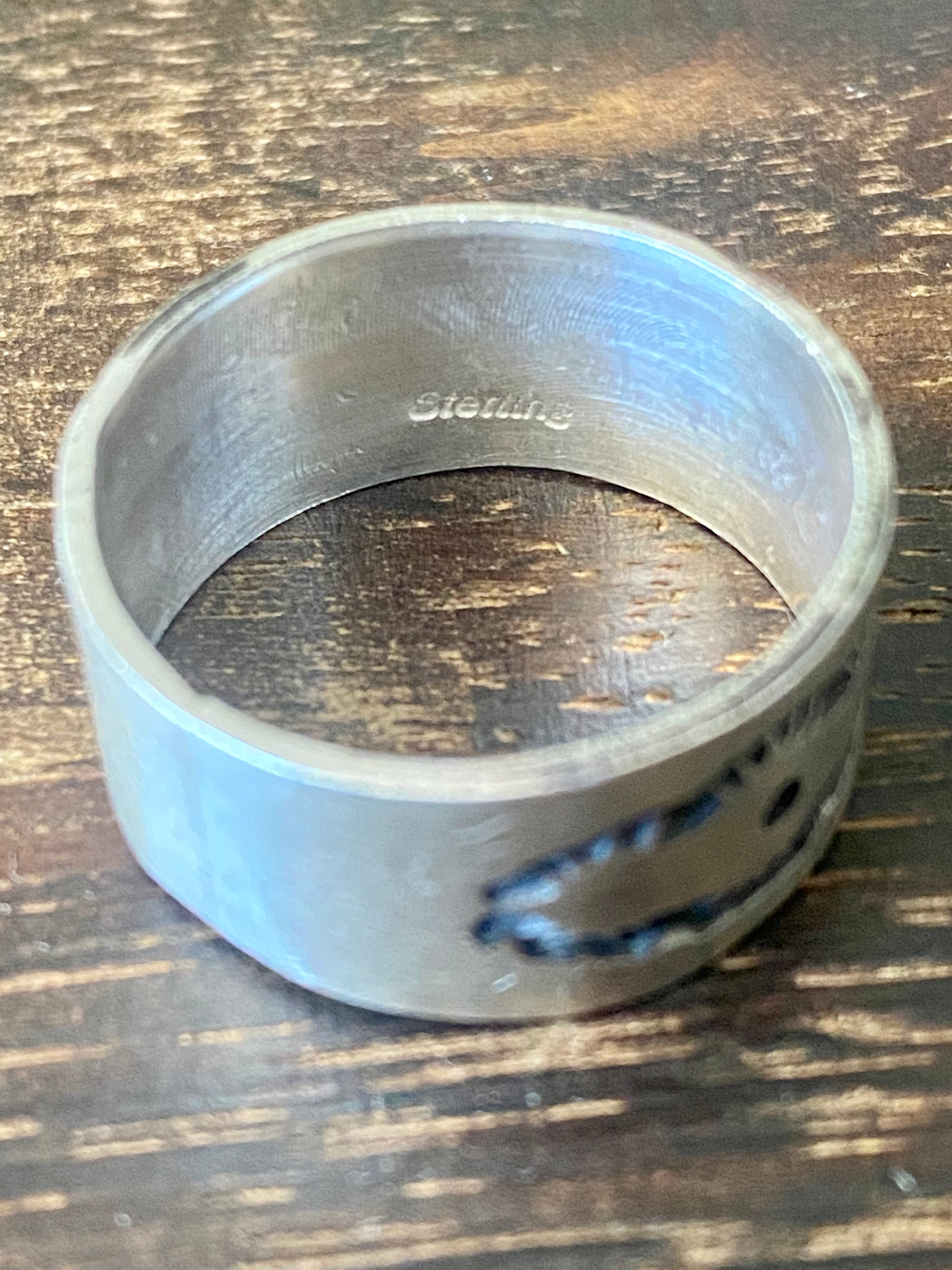 Navajo Made Sterling Silver Band Ring Size 10.5. It measures just over 3/8 of an inch long and just under 7/8 of an inch wide. Stamped sterling silver.