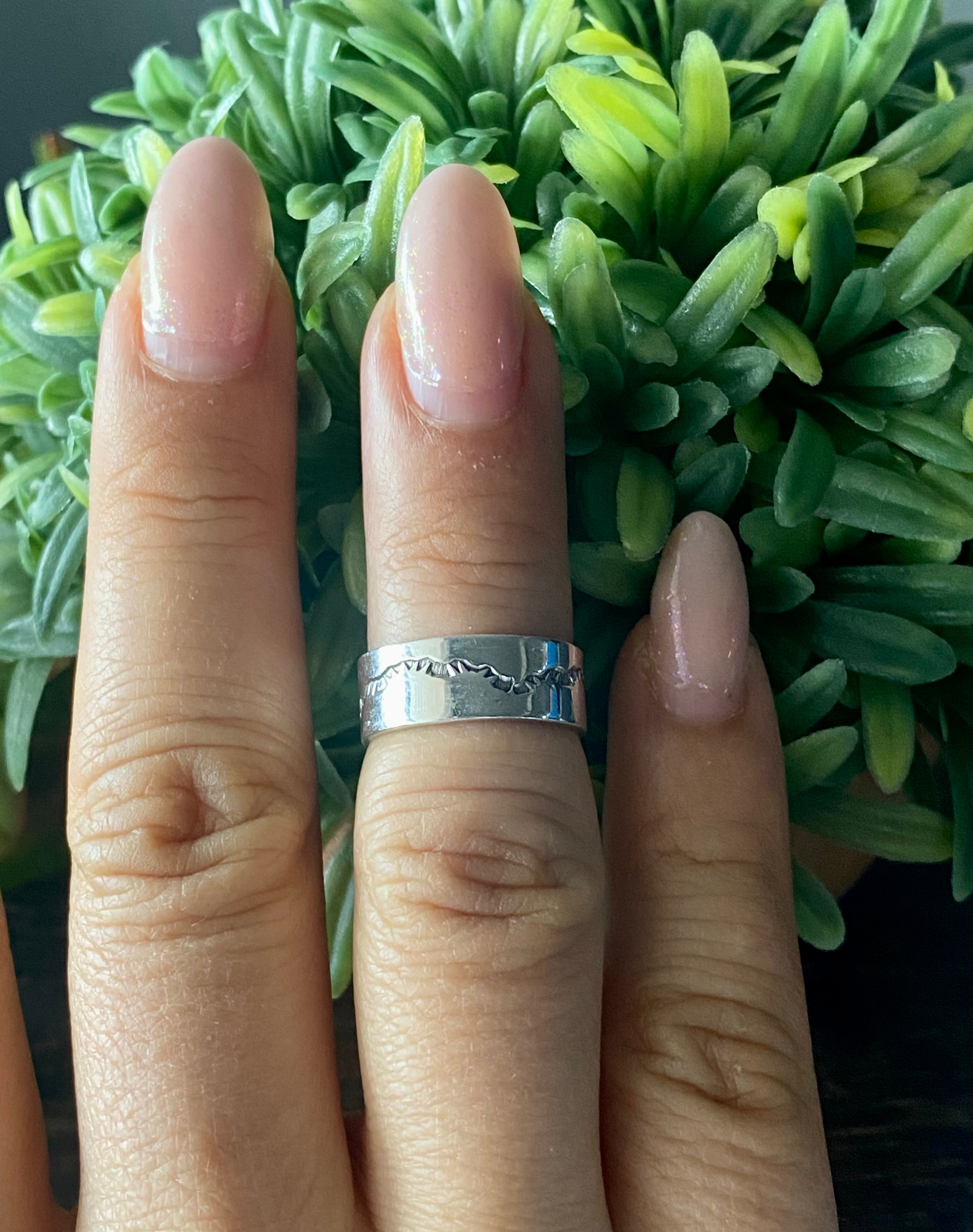 Navajo Made Sterling Silver Band Ring Size 5.5. It measures just over 1/4 of an inch long and 5/8 of an inch wide. Stamped sterling silver.