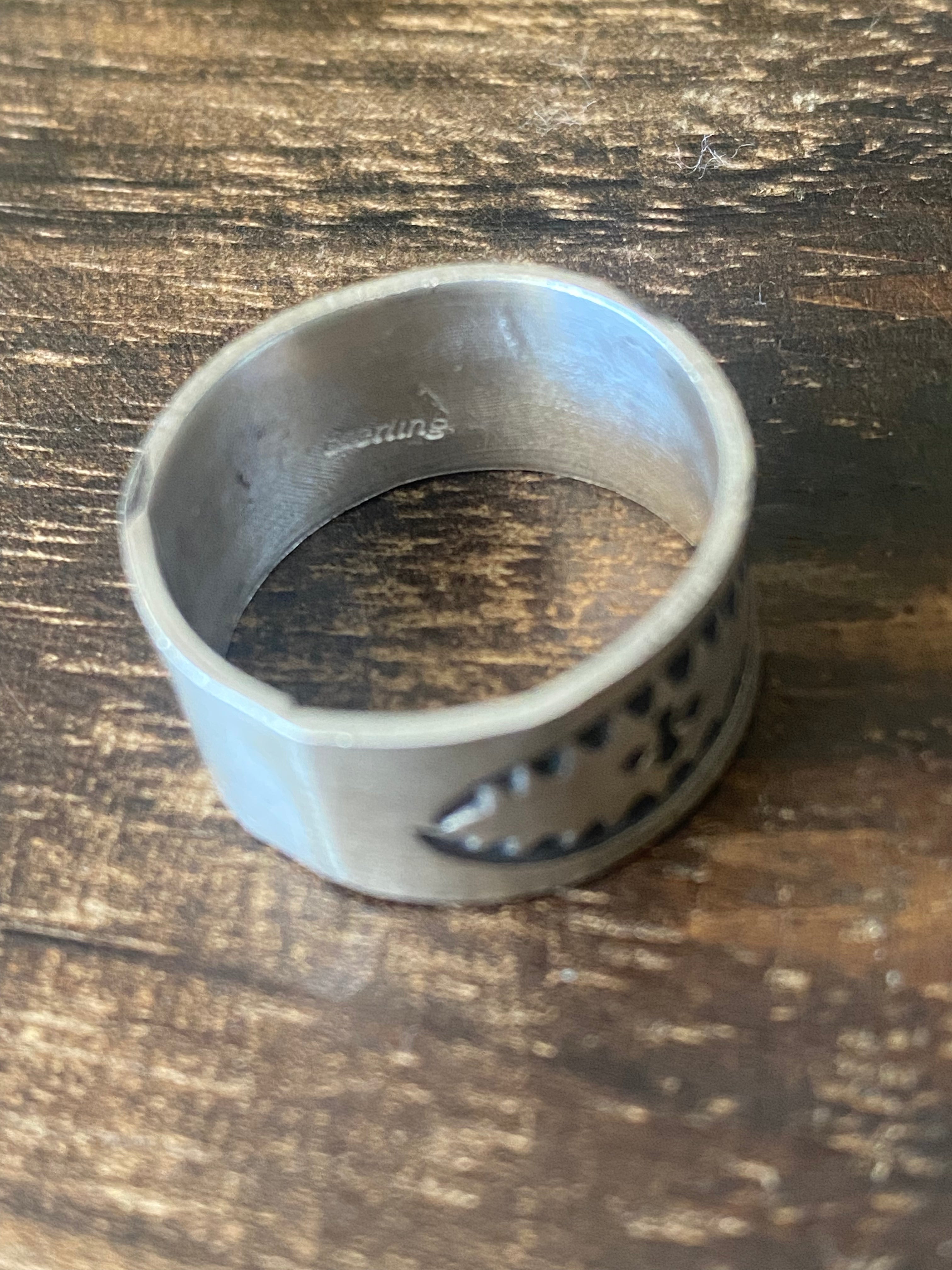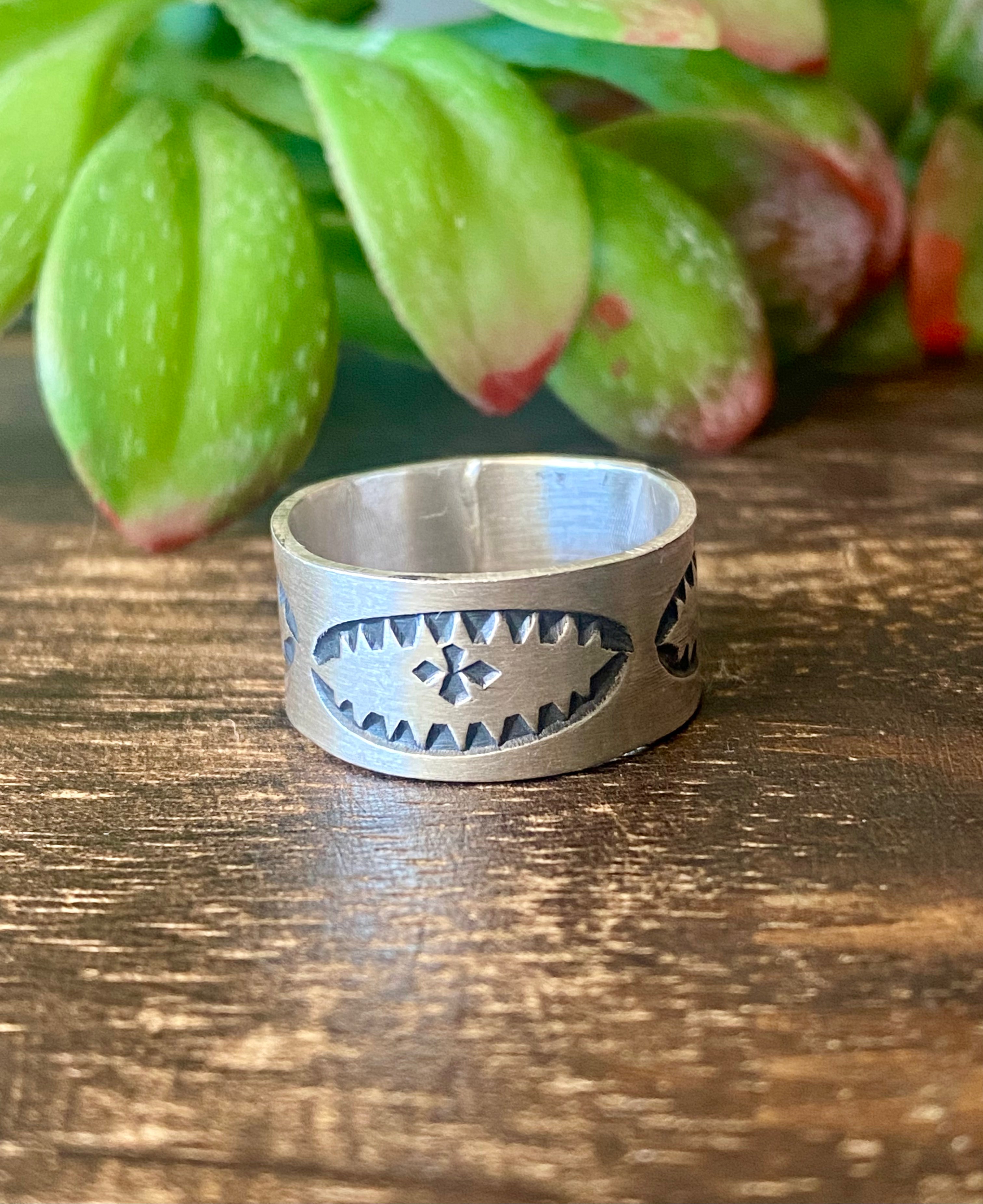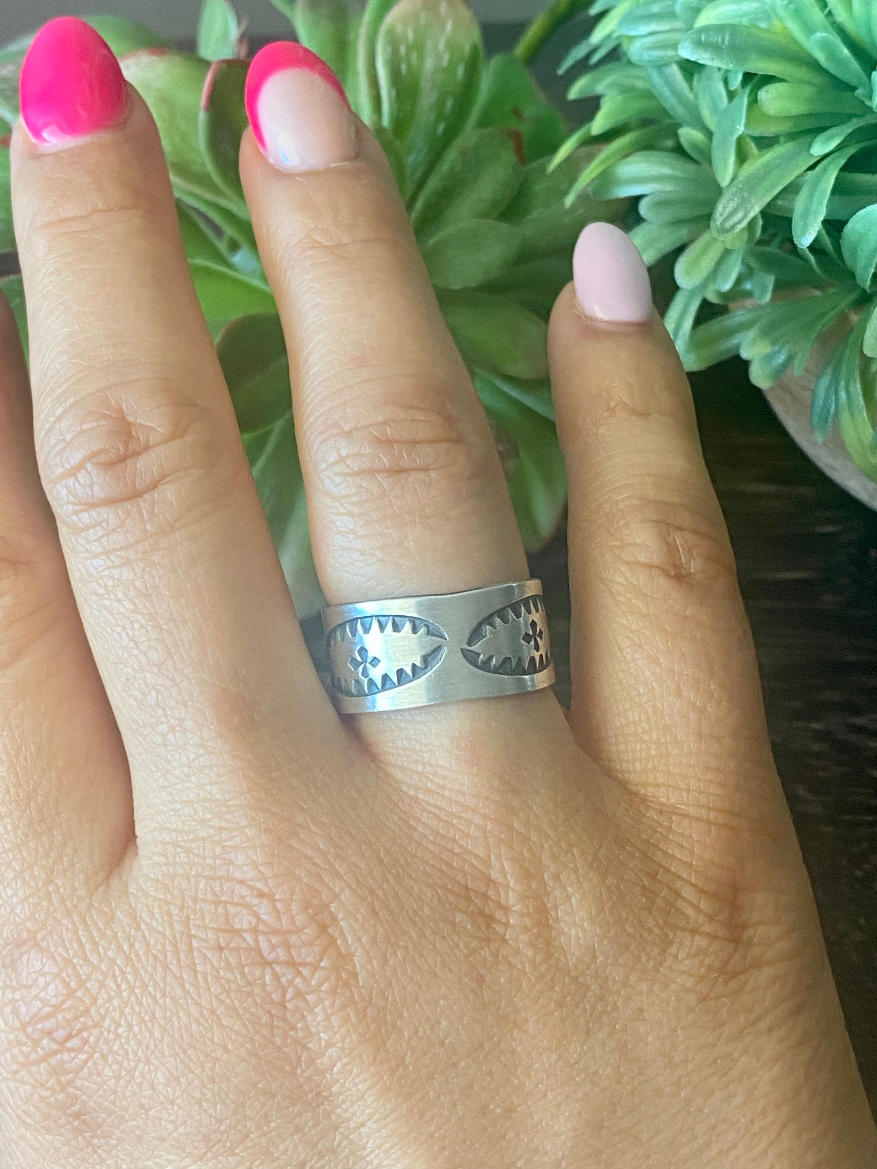 Navajo Made Sterling Silver Band Ring Size 9. It measures just over 3/8 of an inch long and 3/4 of an inch wide. Stamped sterling silver.