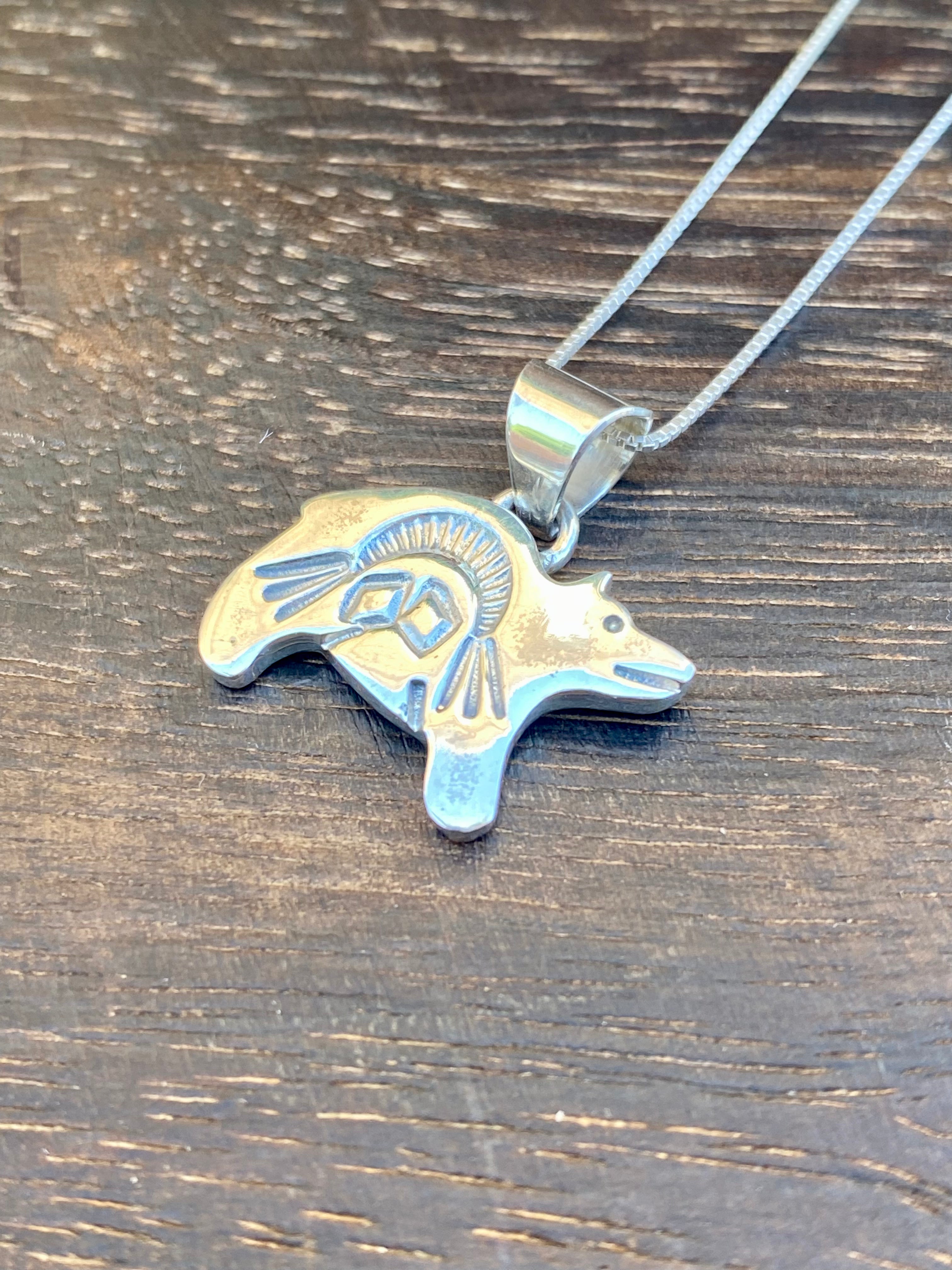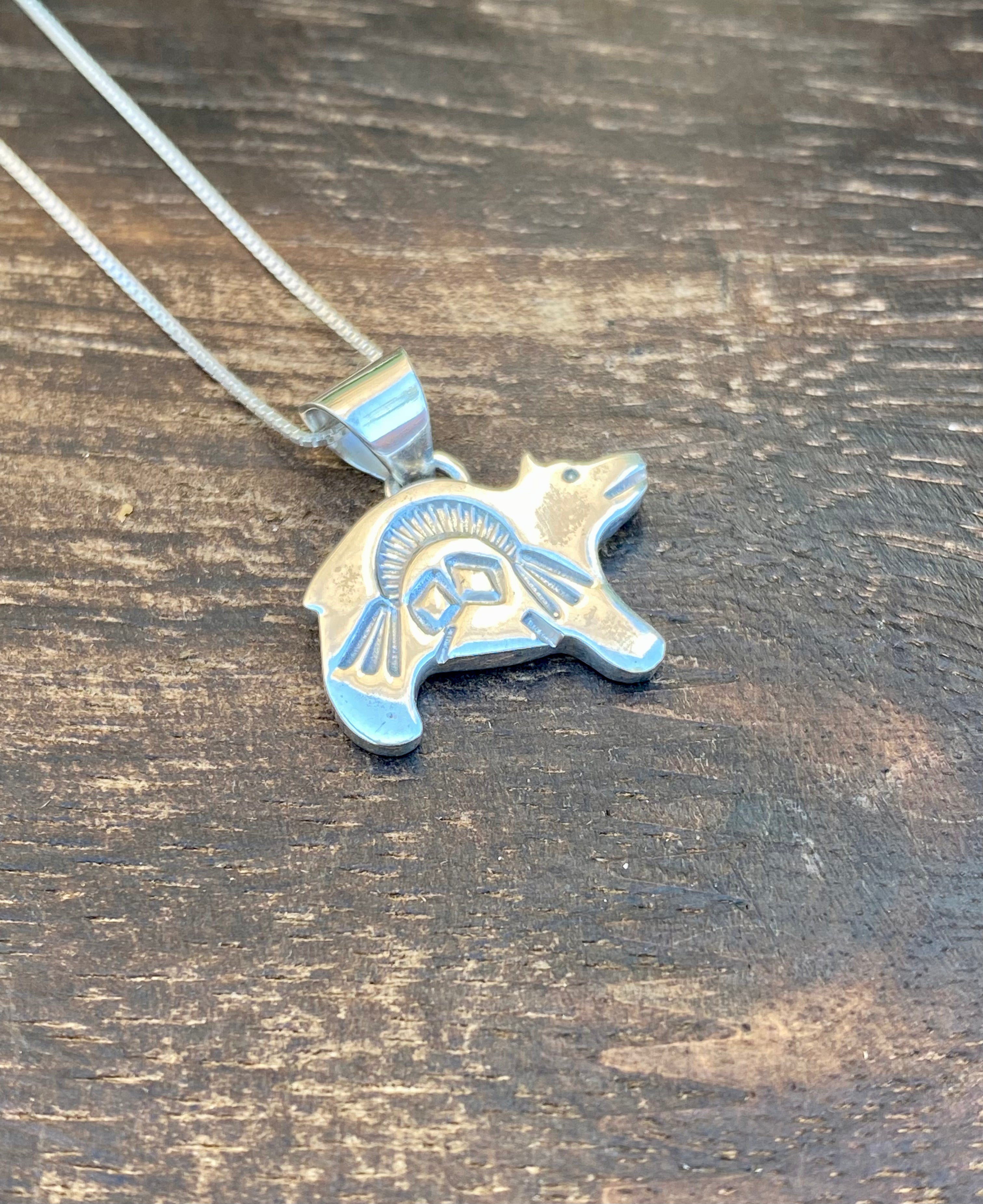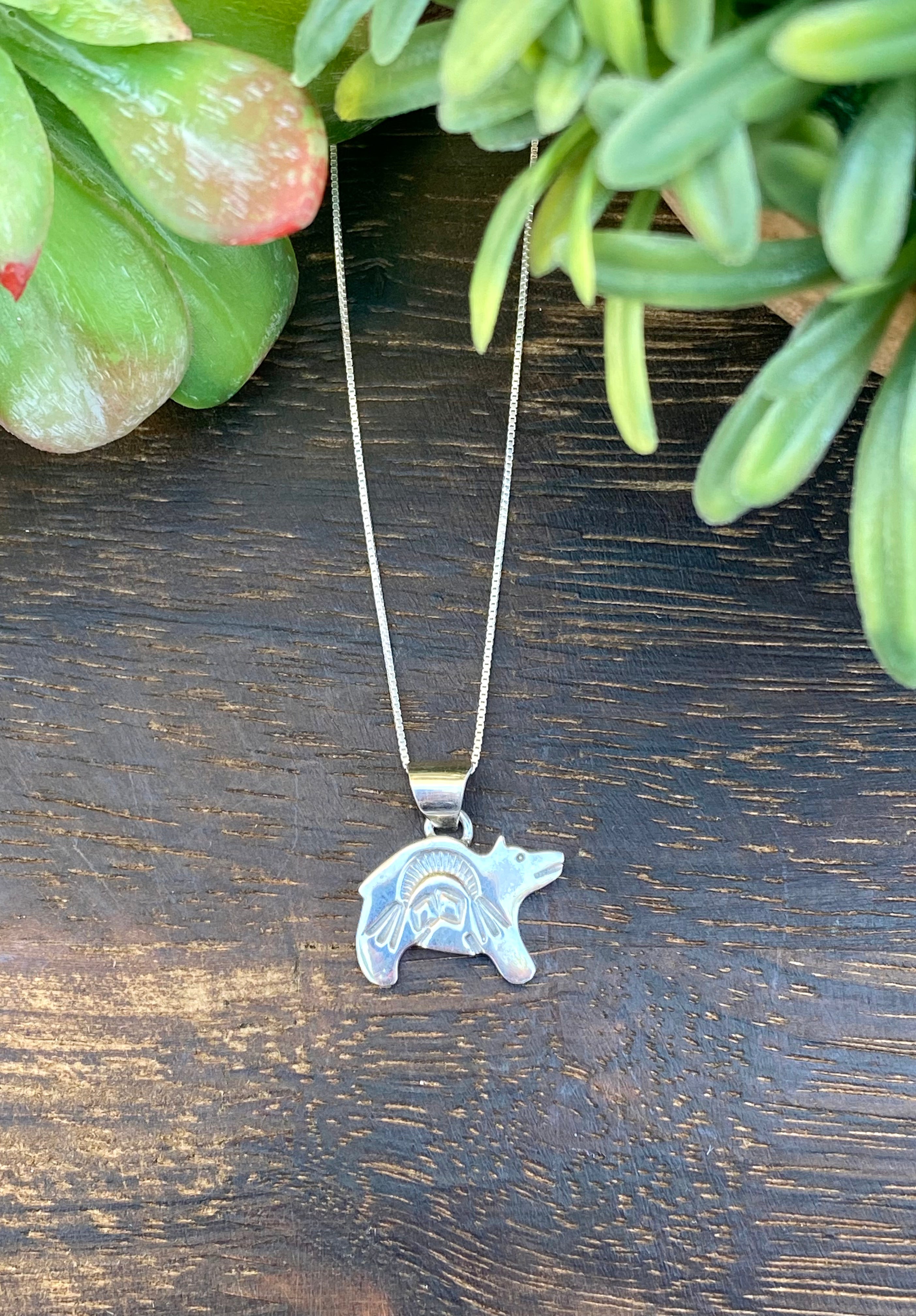 Navajo Made Sterling Silver Bear Necklace. It measures just over 19 inches long with hang while the chain by itself measures 18 inches long. Stamped sterling silver.