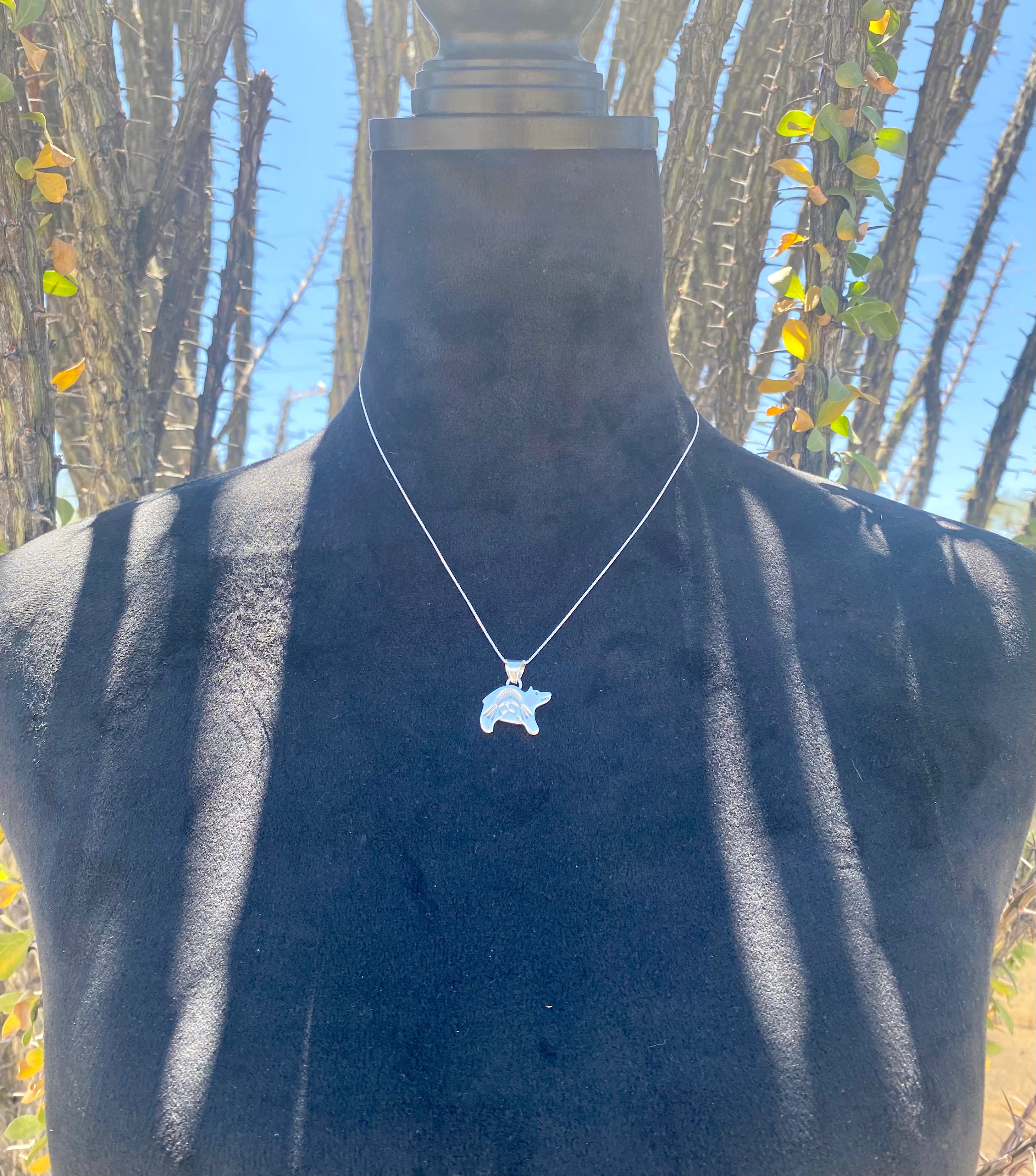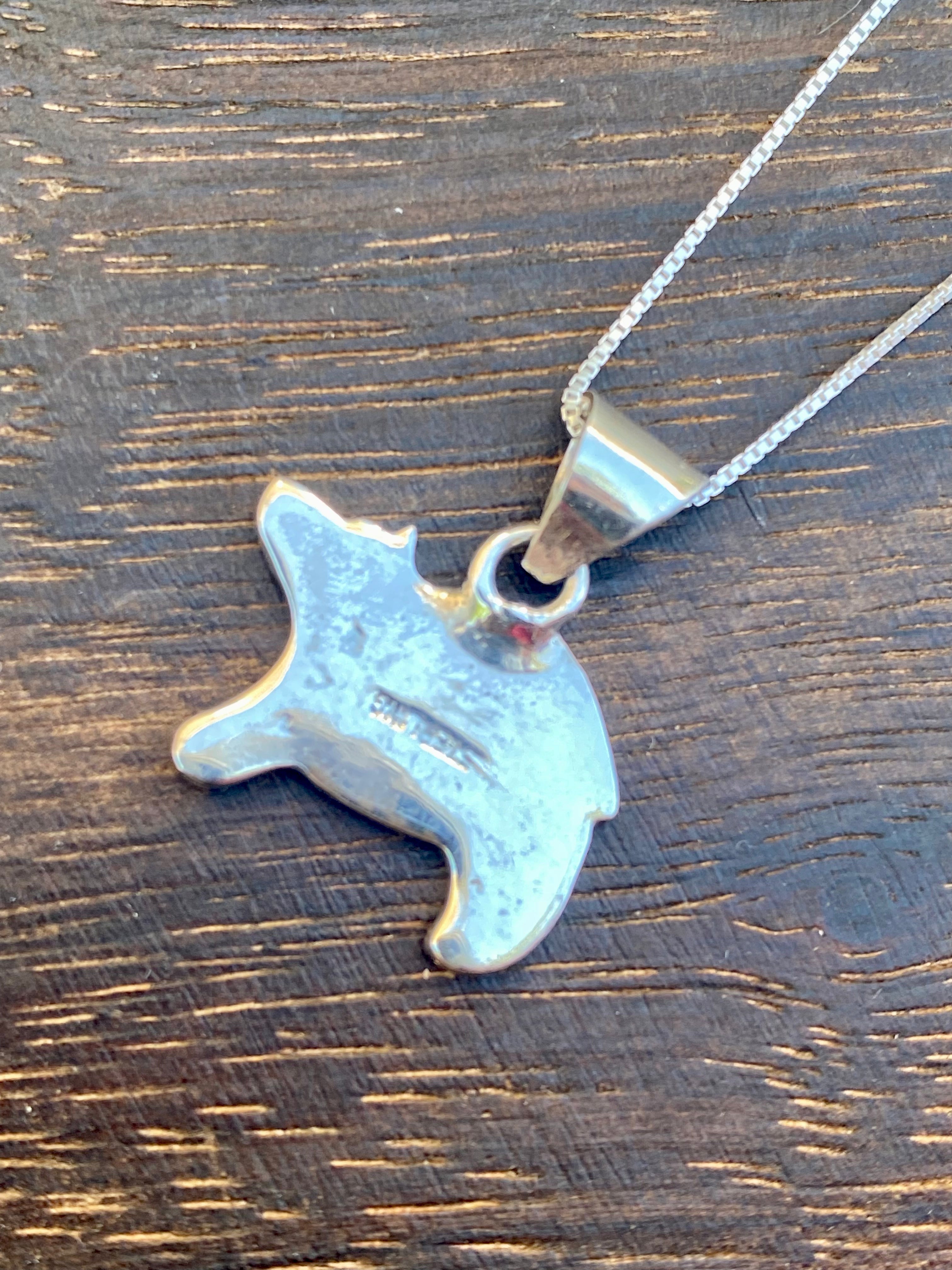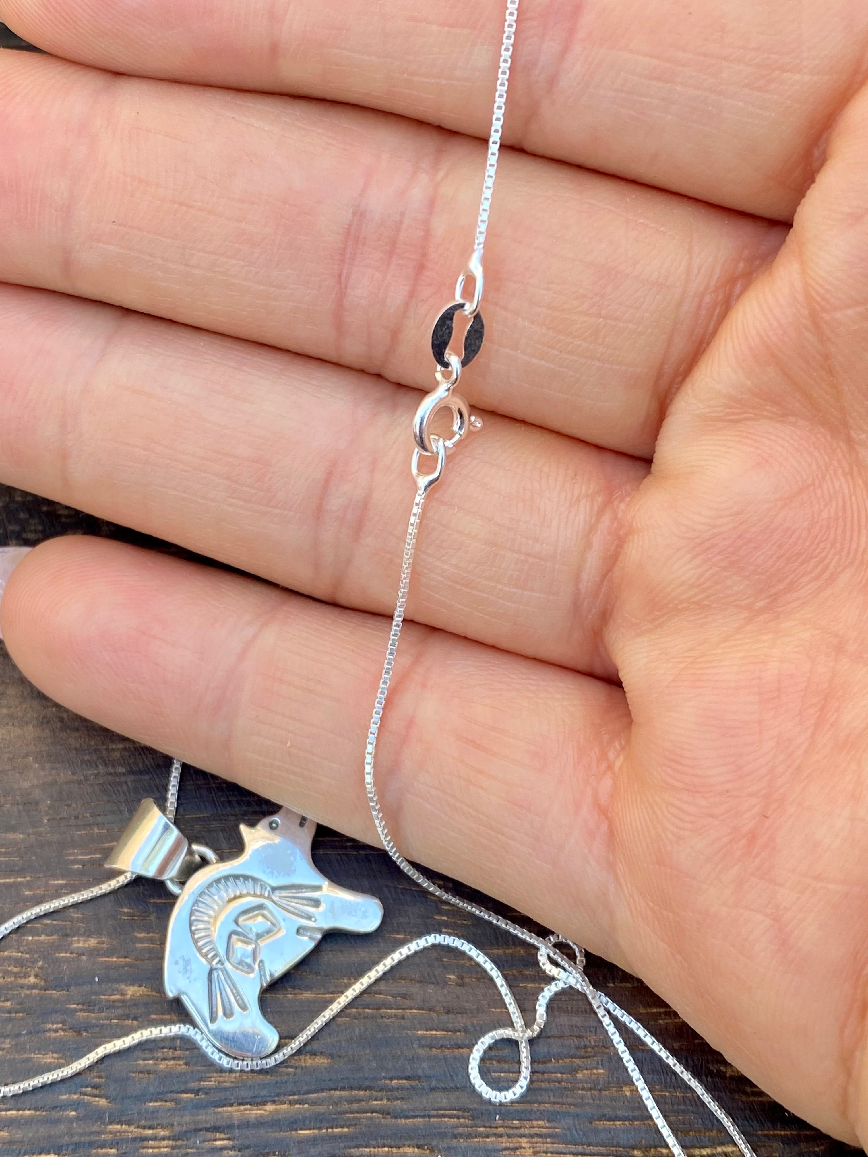 Navajo Made Sterling Silver Bear Necklace. It measures just over 19 inches long with hang while the chain by itself measures 18 inches long. Stamped sterling silver.