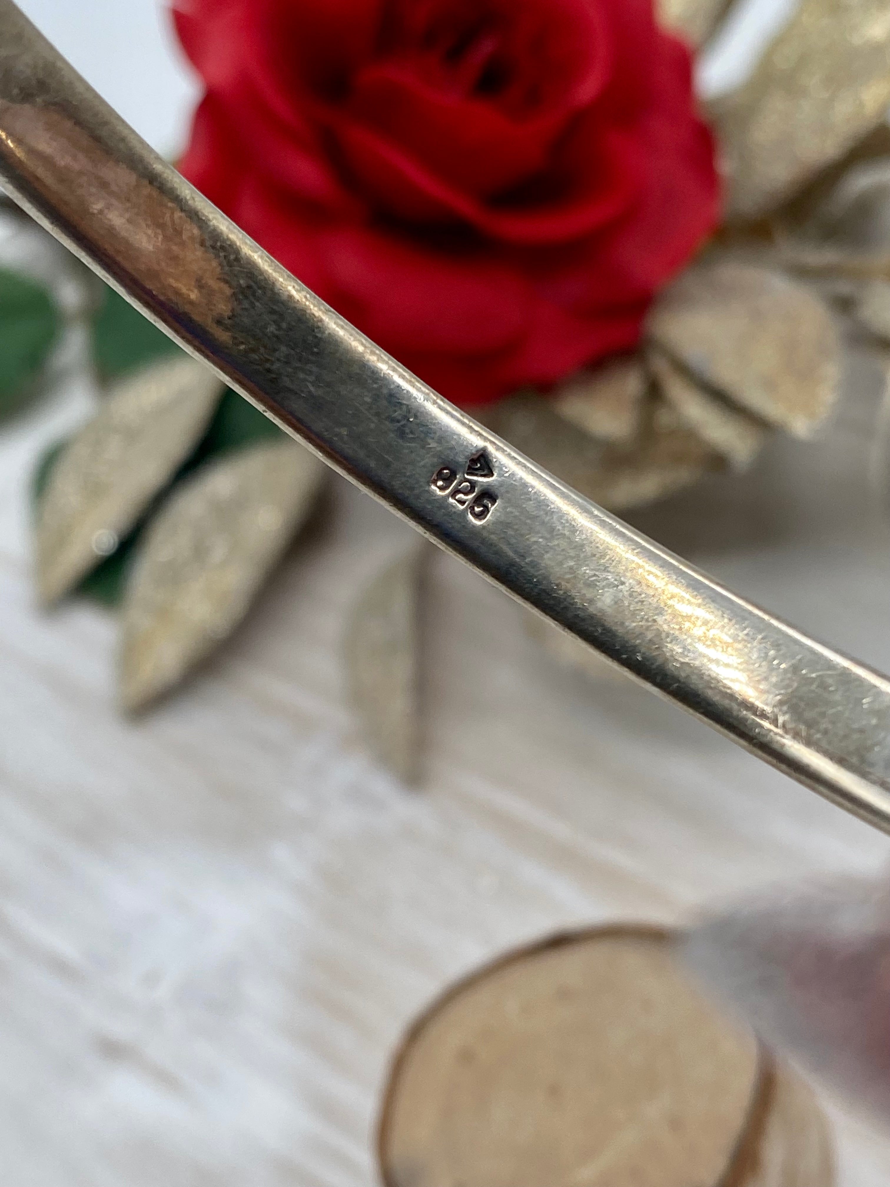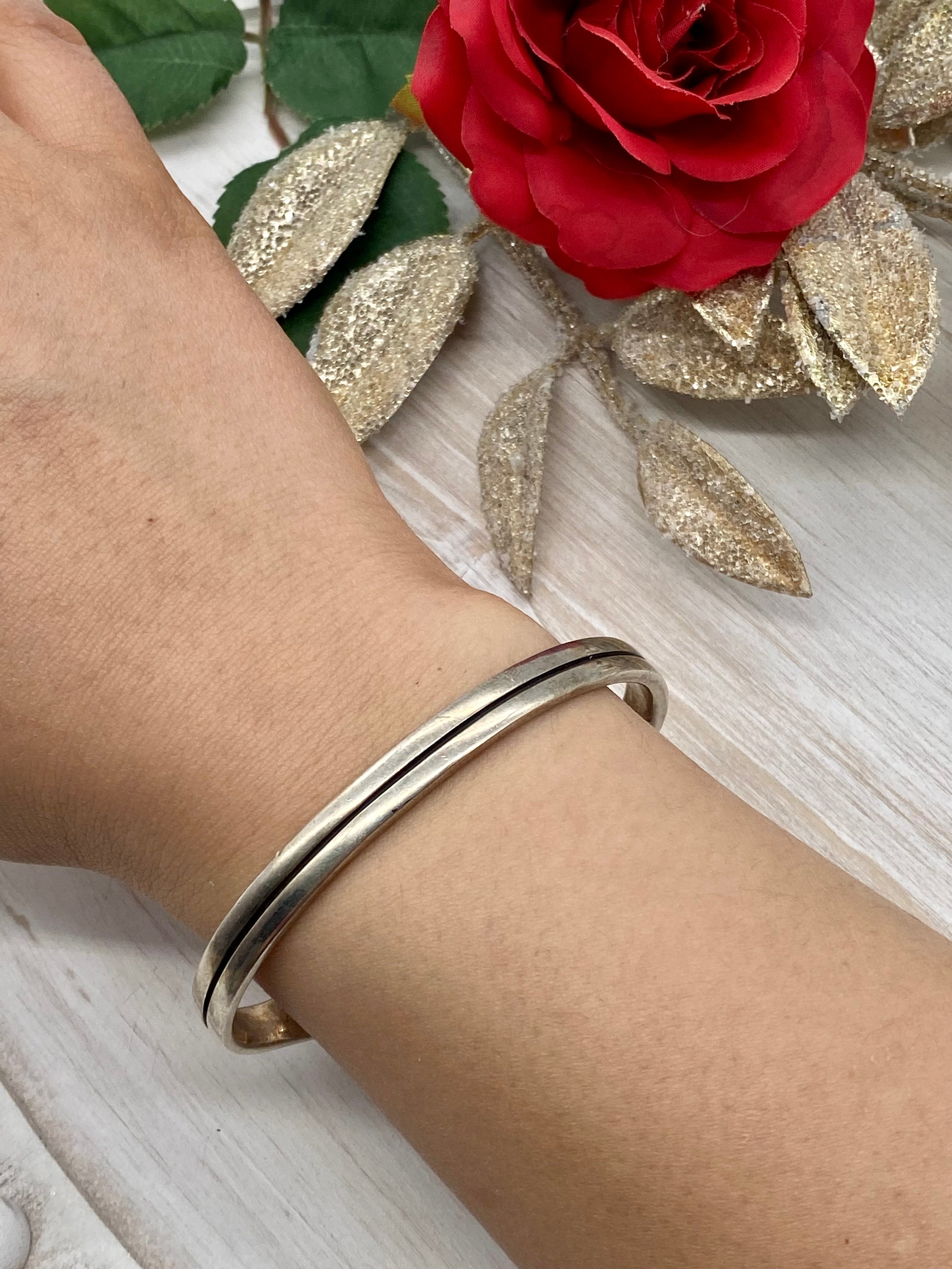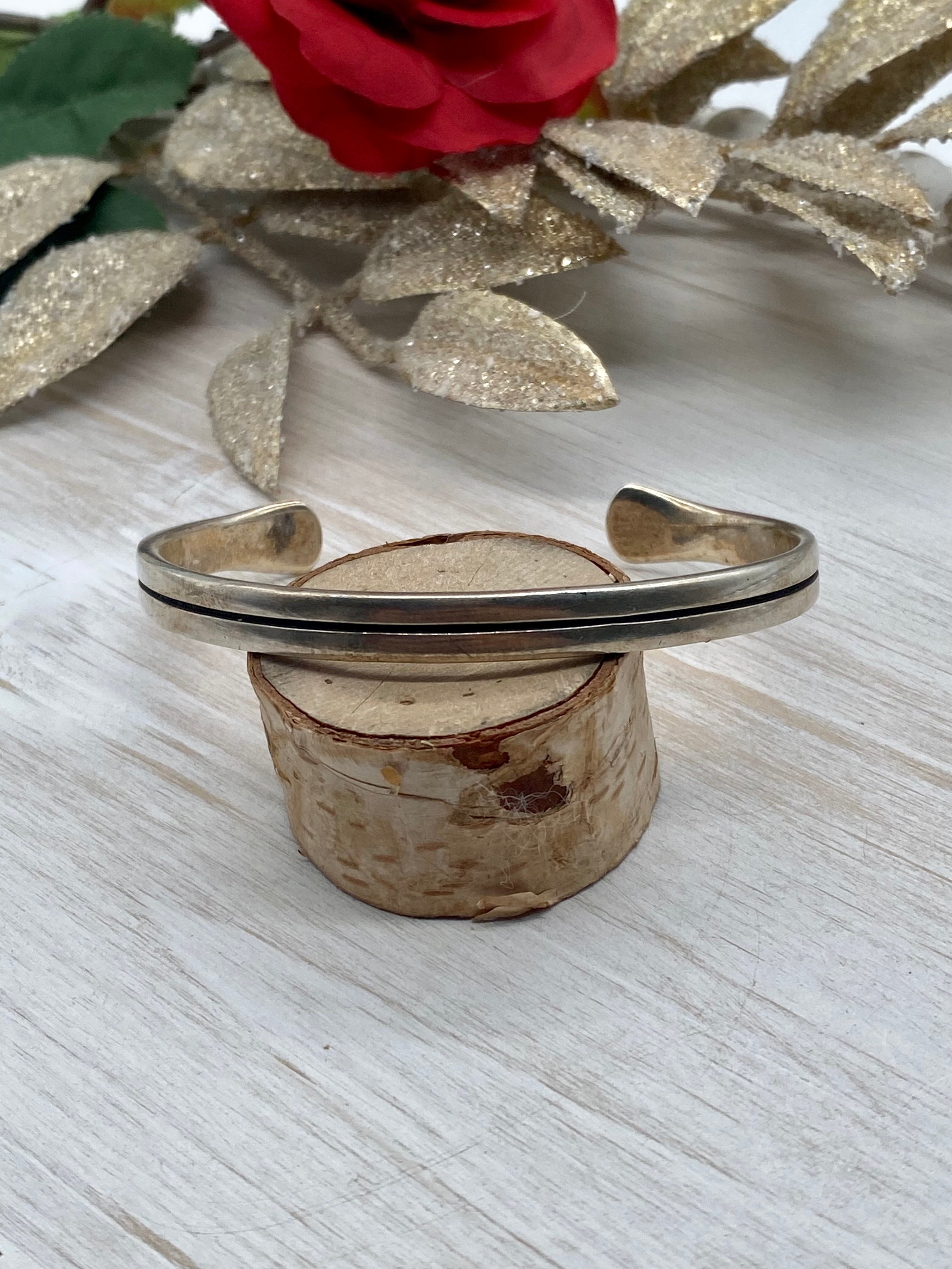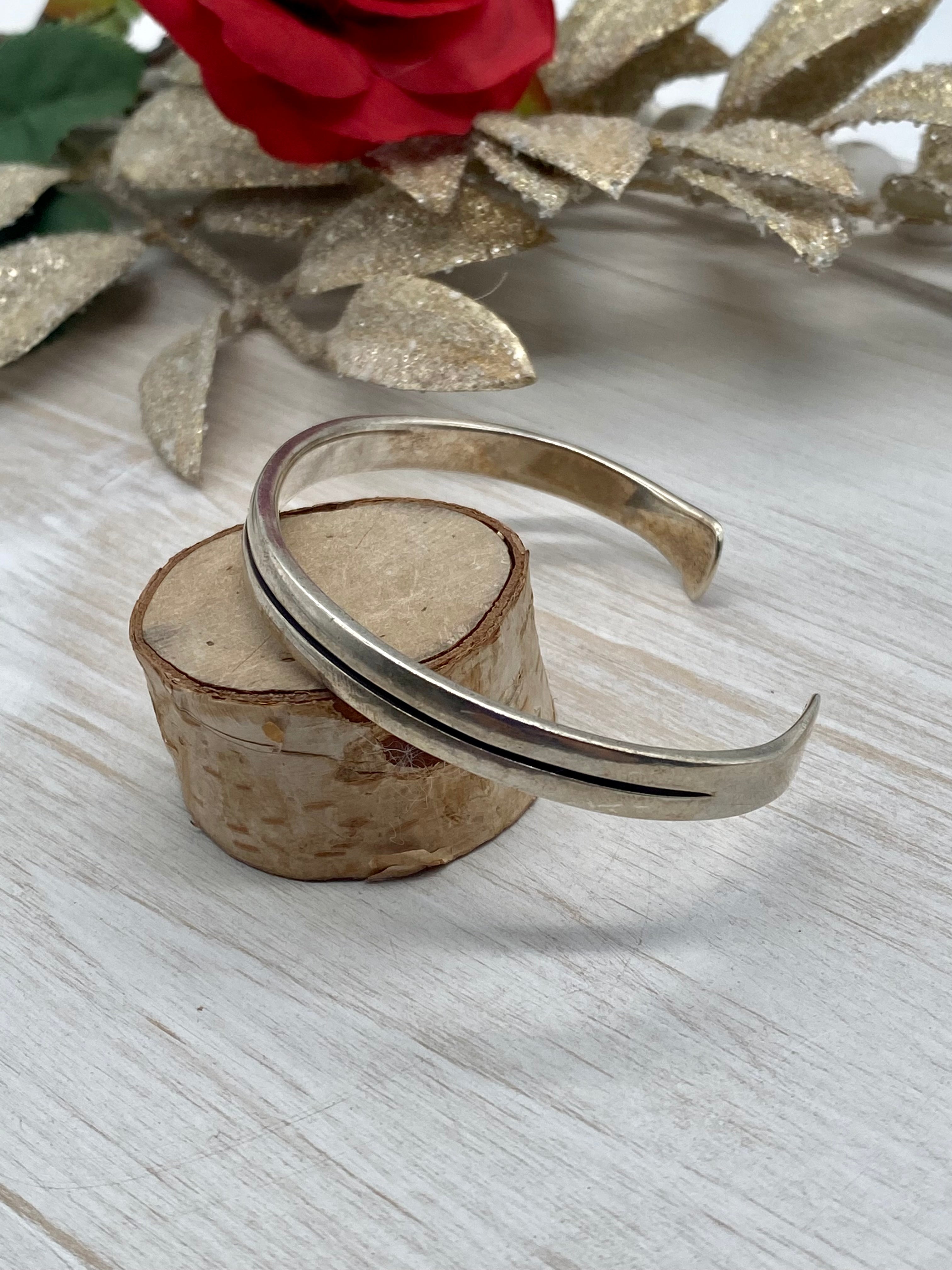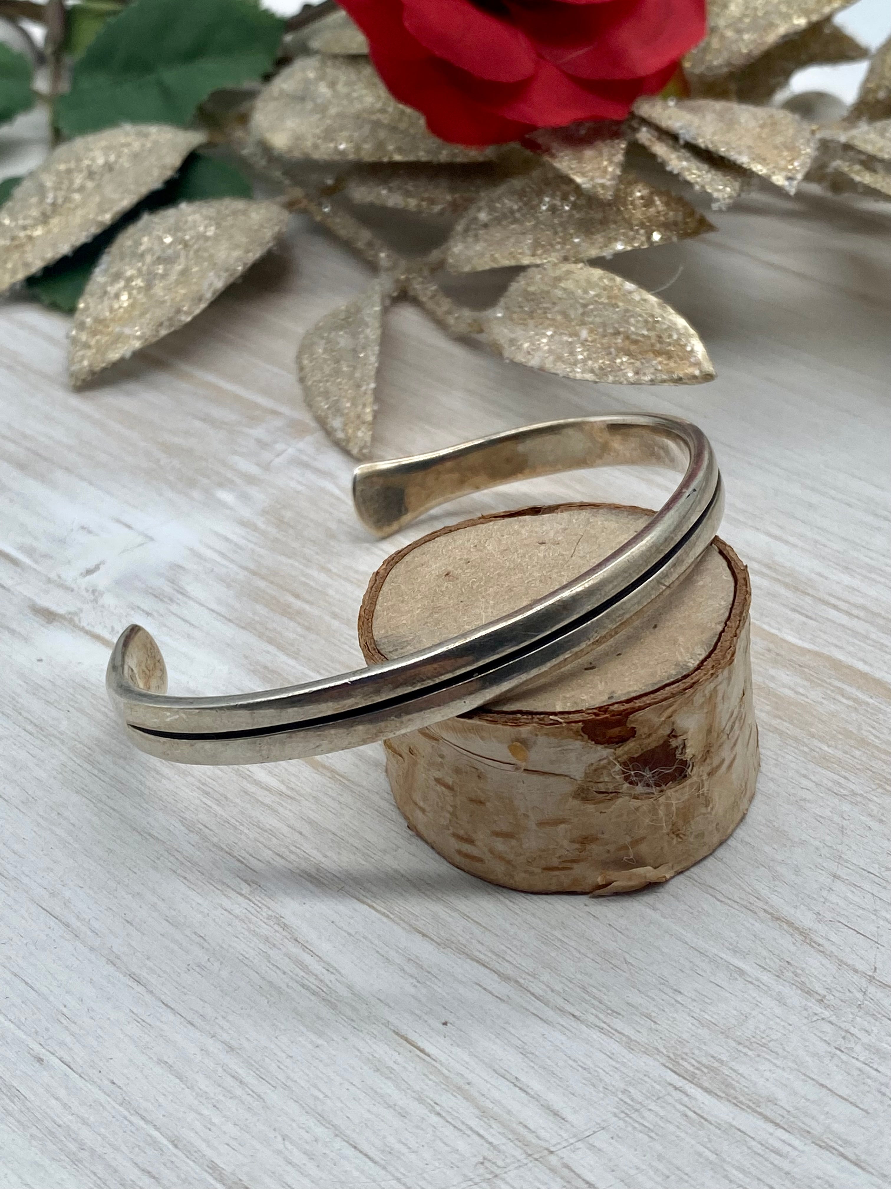 Handmade Sterling Silver Cuff Bracelet. It measures 1/4 of an inch wide with an inside circumference of 6 1/4 inches and a gap of 1 3/8 inches. Stamped sterling silver.