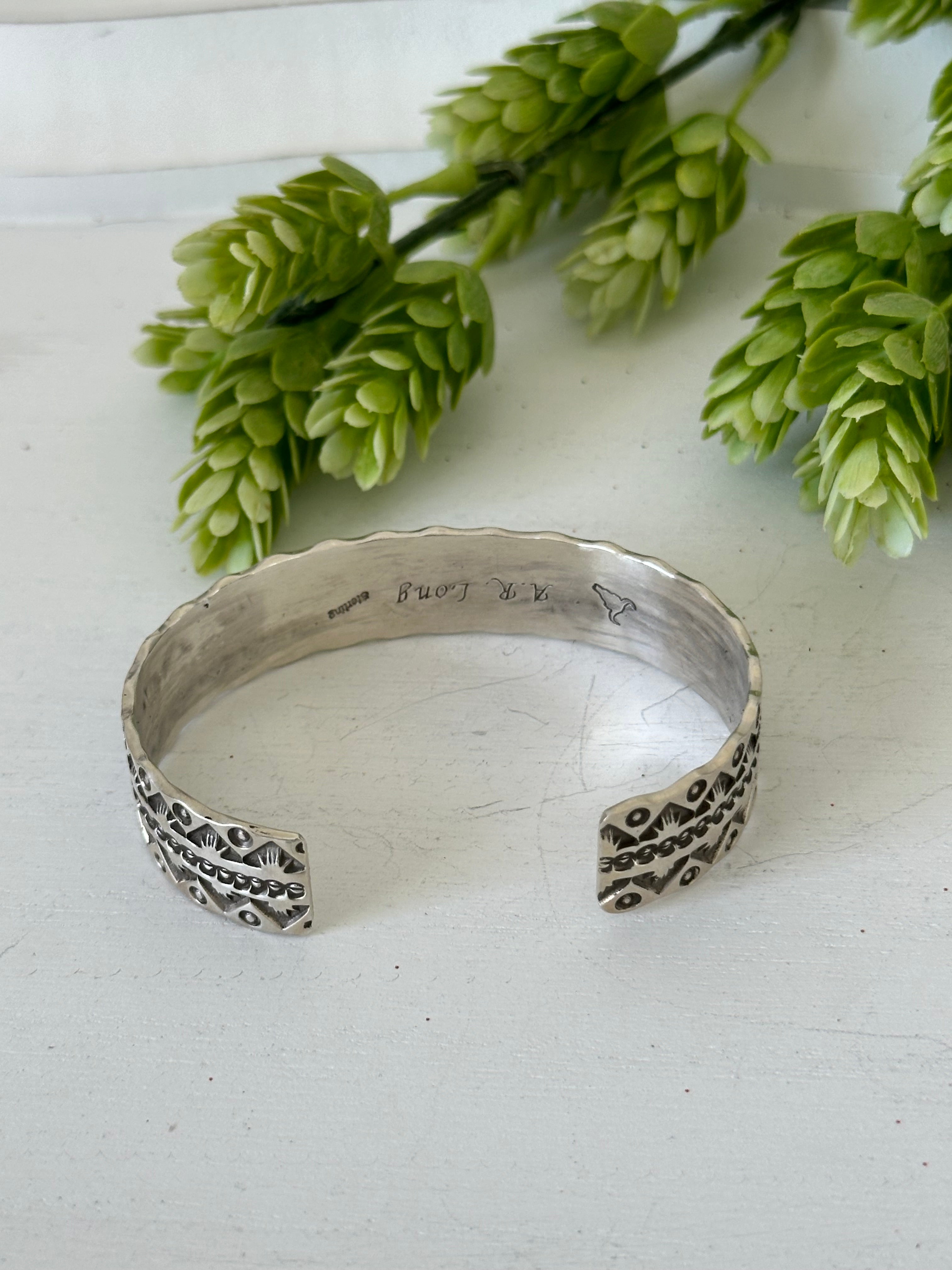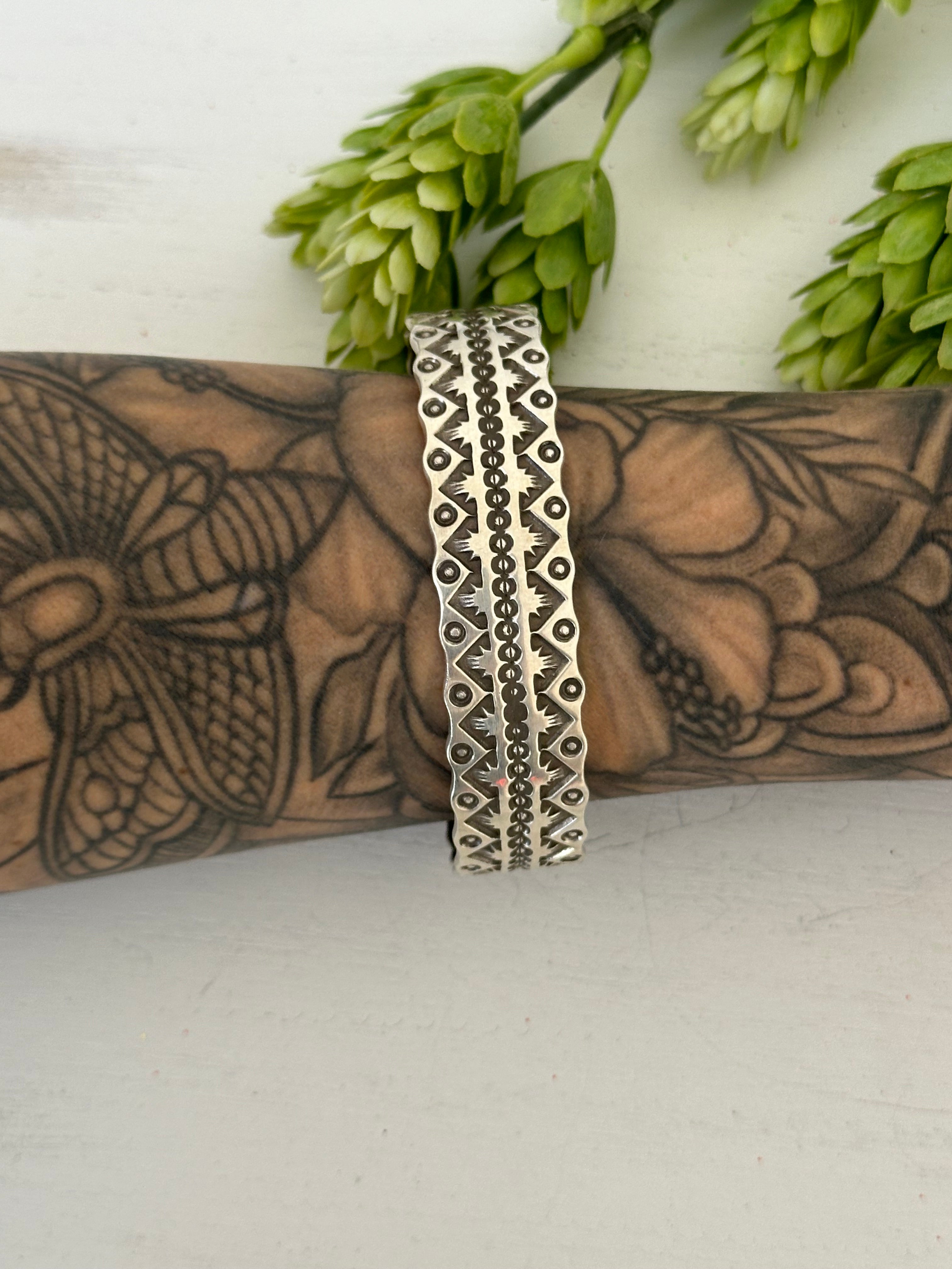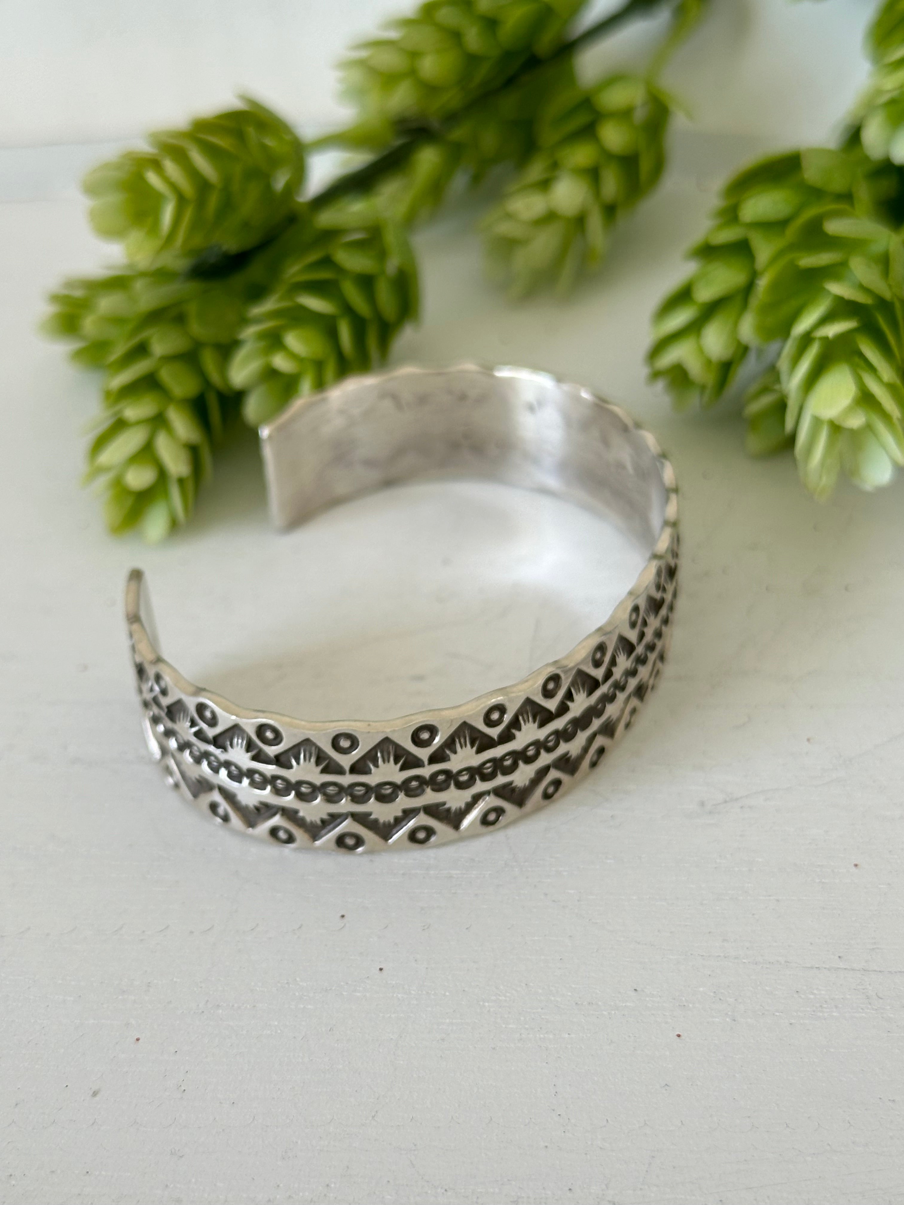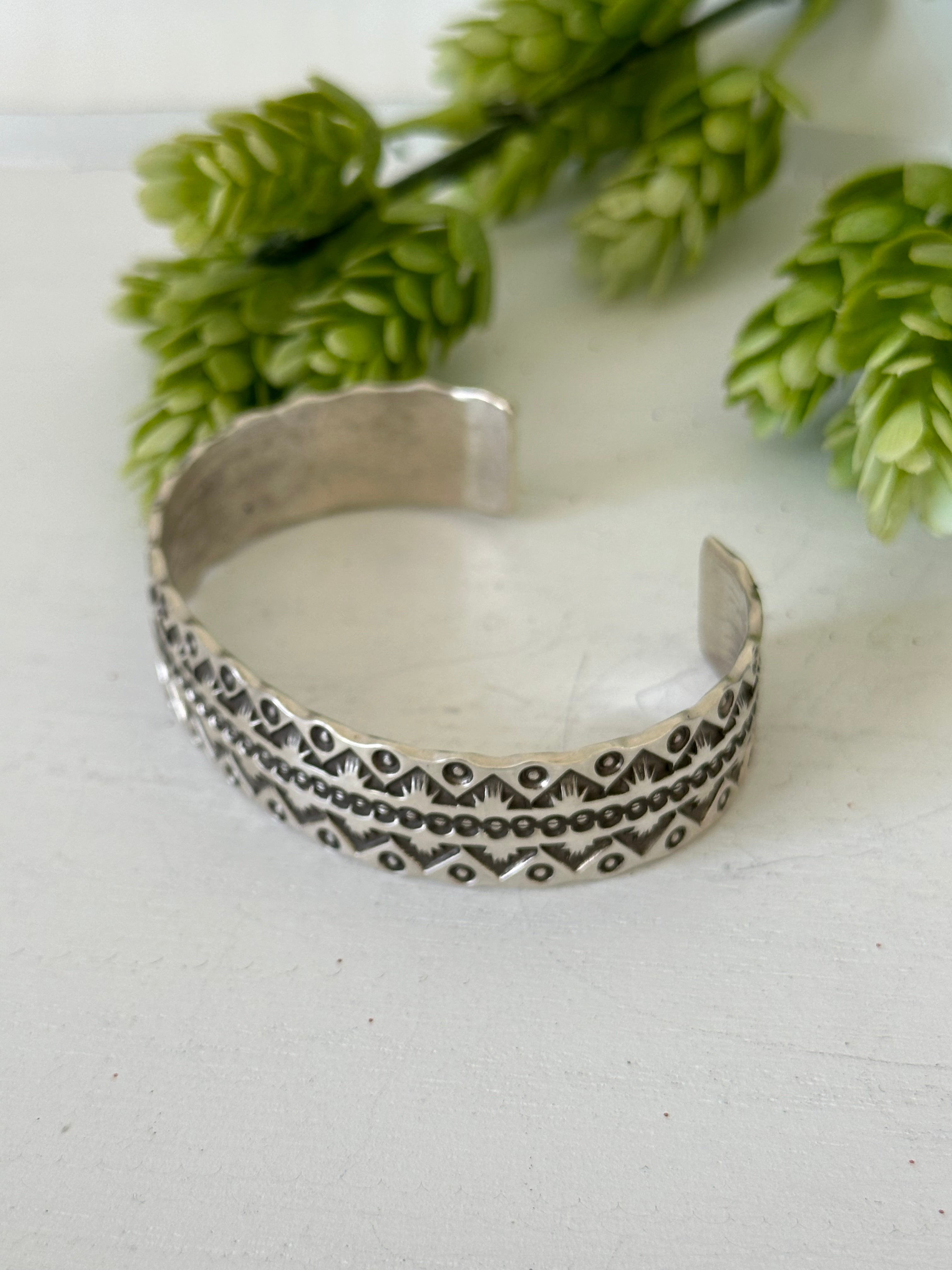 Navajo Made Sterling Silver Cuff Bracelet. It measures 5/8 of an inch wide with an inside circumference of 5 7/8 inches and a gap 1 1/8 inches. Signed by the artist and stamped sterling silver.