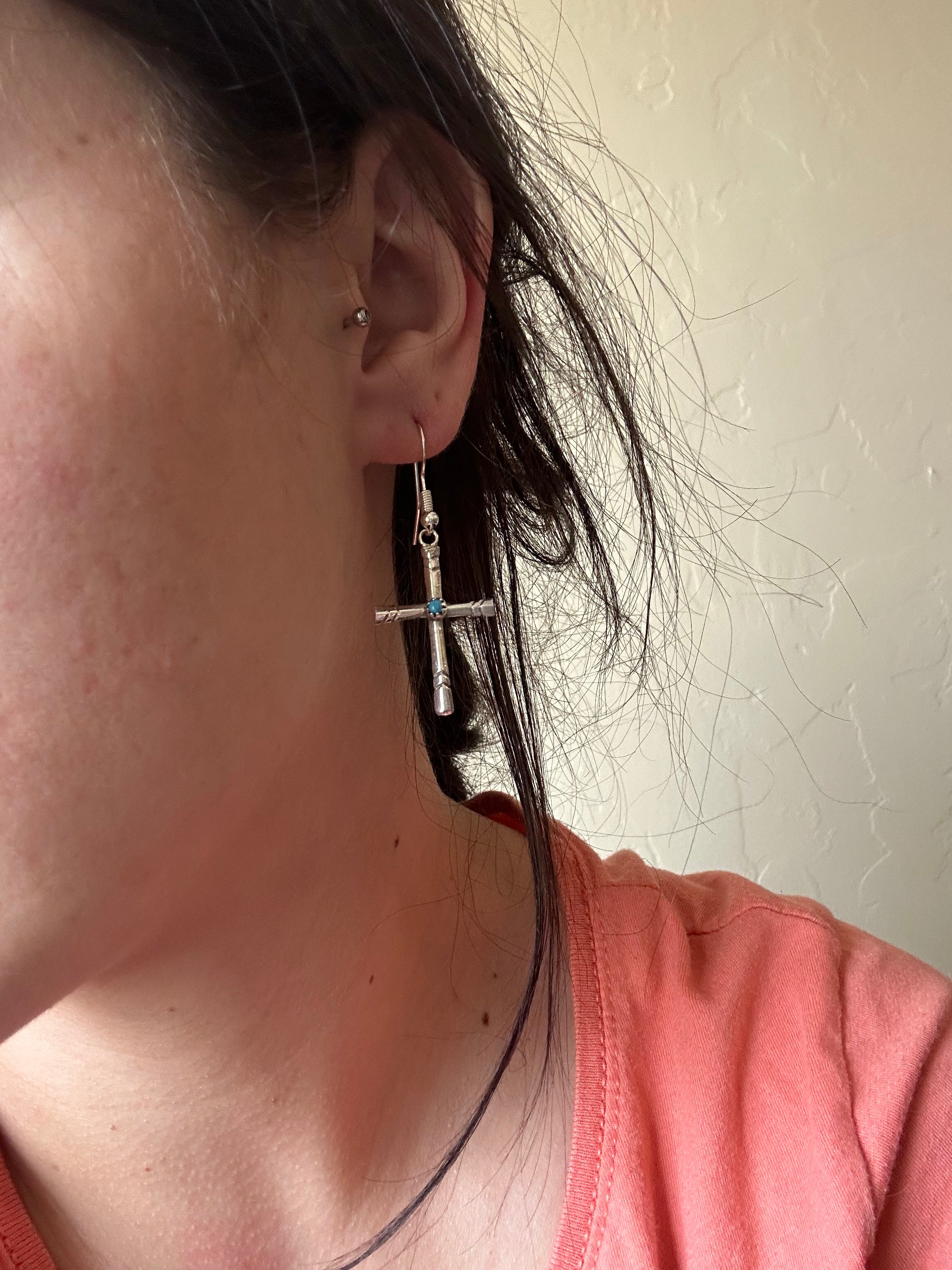 - These are must haves for your everyday wear. Navajo Made Sterling Silver Dangle Cross Earrings. It measures 1 7/8 inches long and 3/4 of an inch wide. Signed by the artist and stamped sterling silver.
