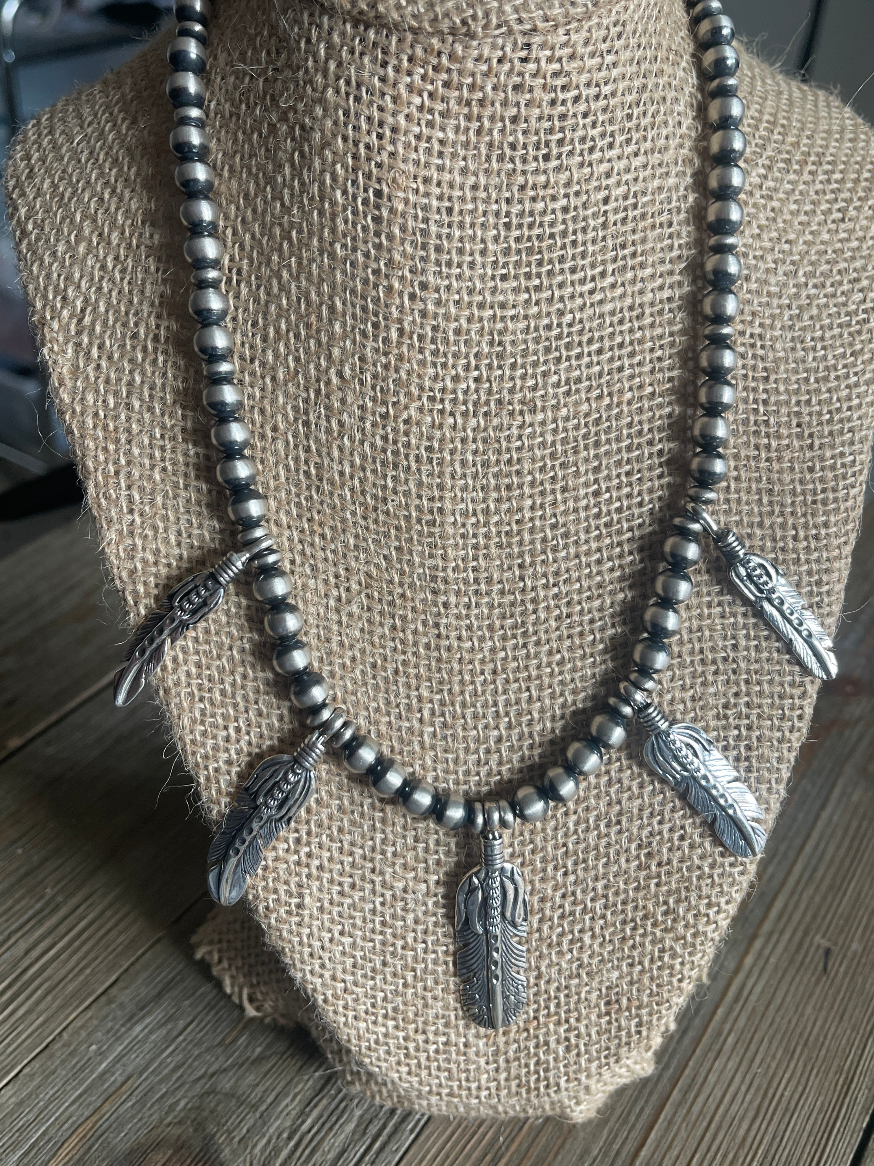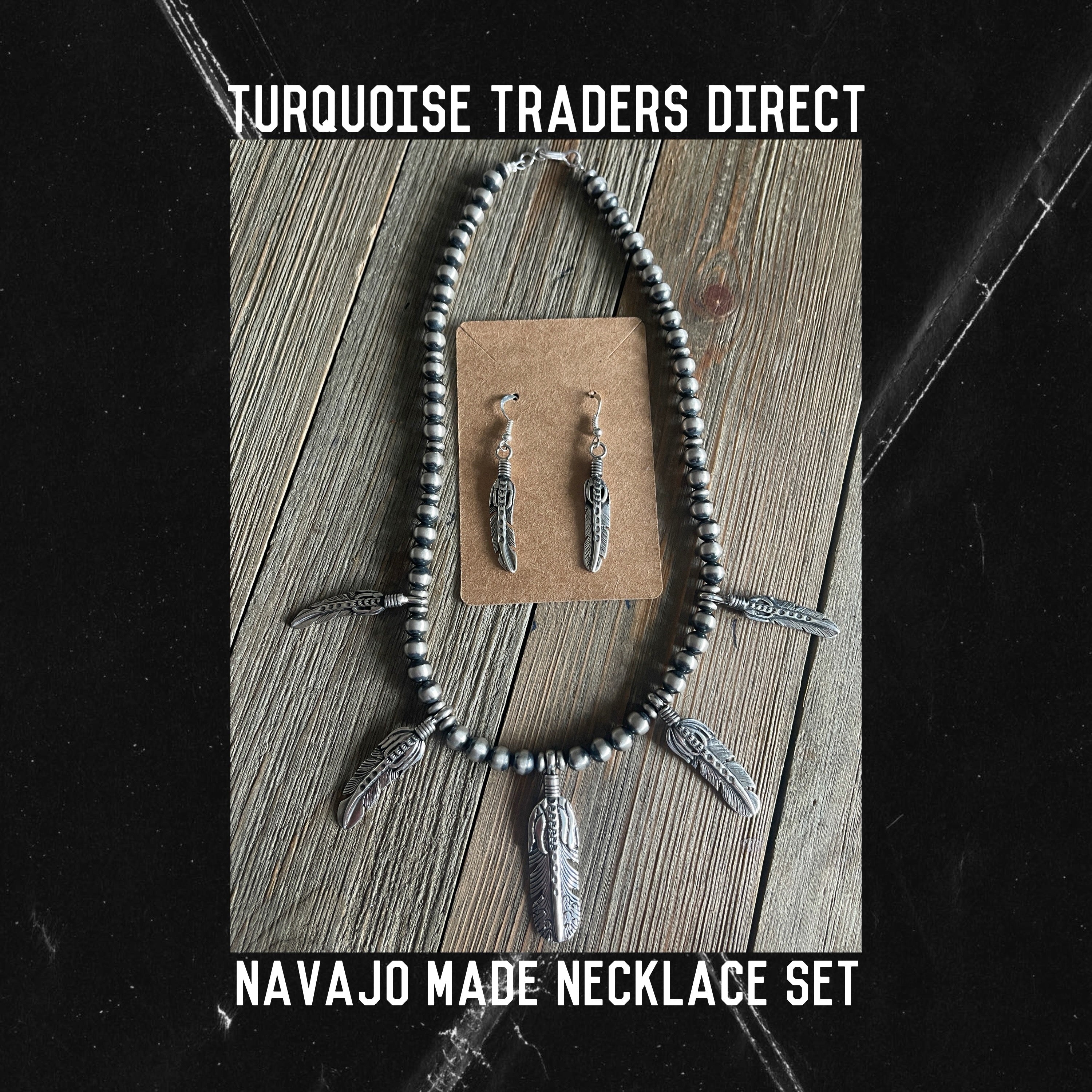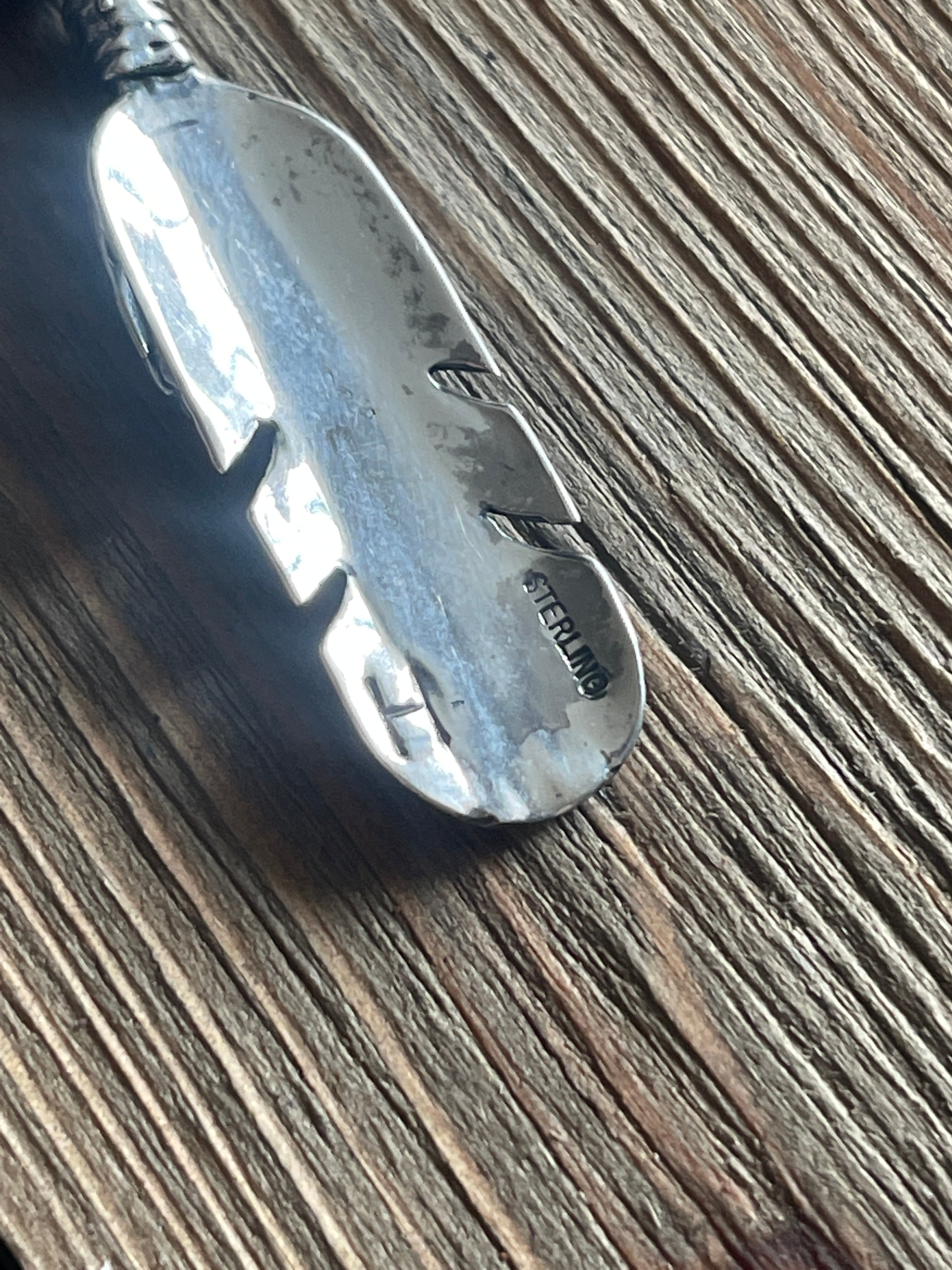 Navajo Made Sterling Silver Feather Necklace Set. The necklace measures around 21 inches long with hang while the earrings are 2 1/4 inches long. Signed by the artist and stamped sterling silver.