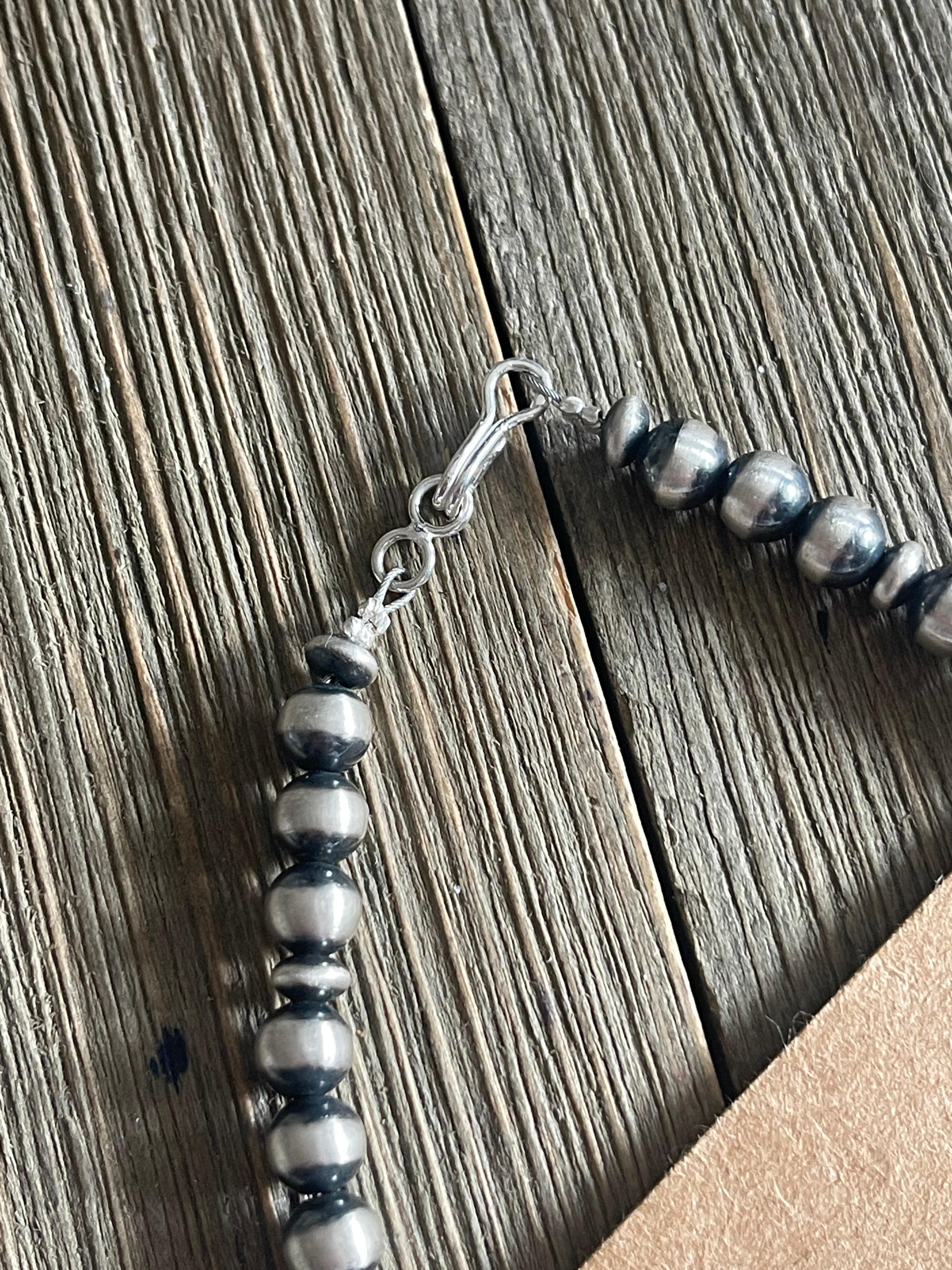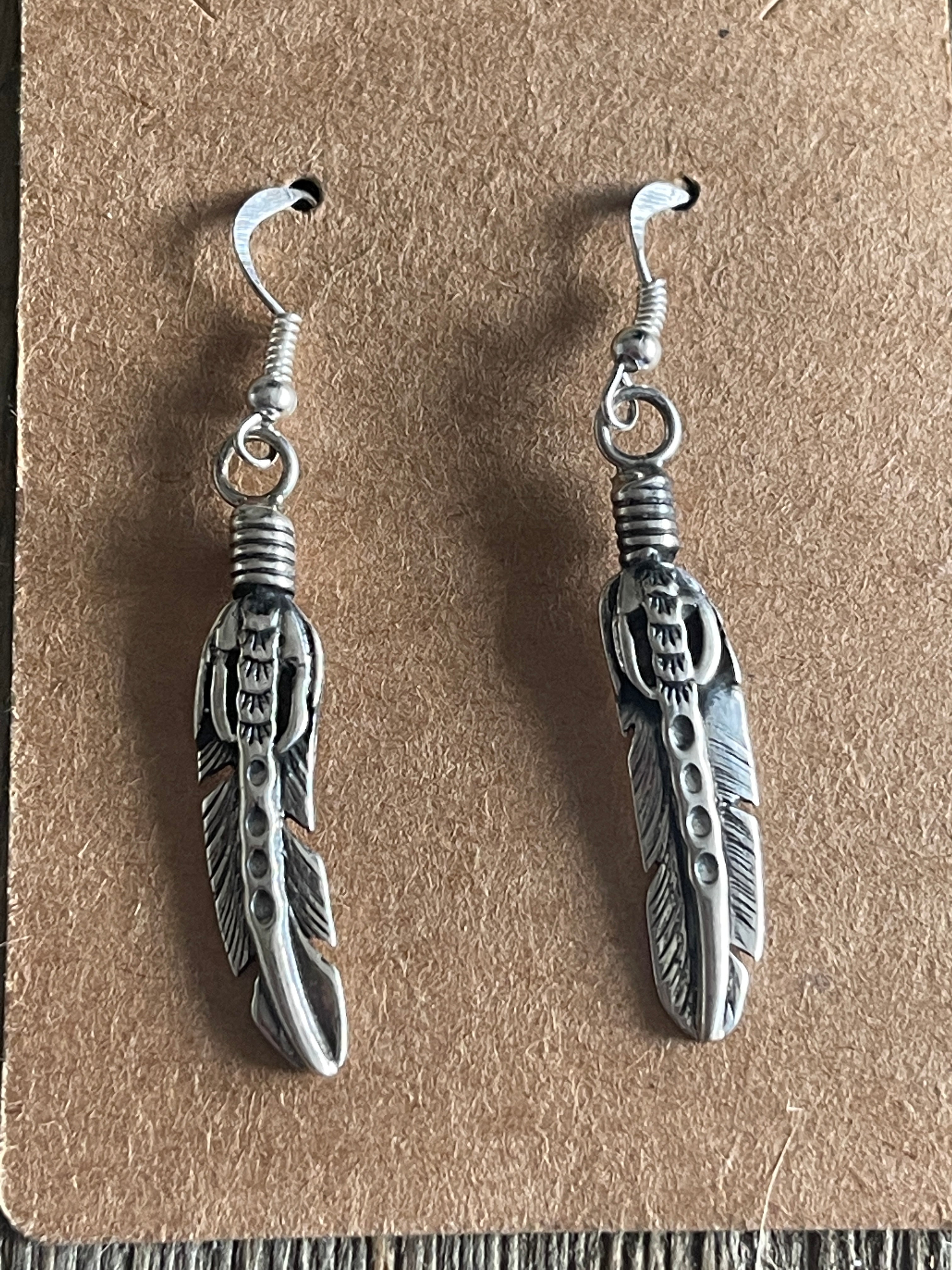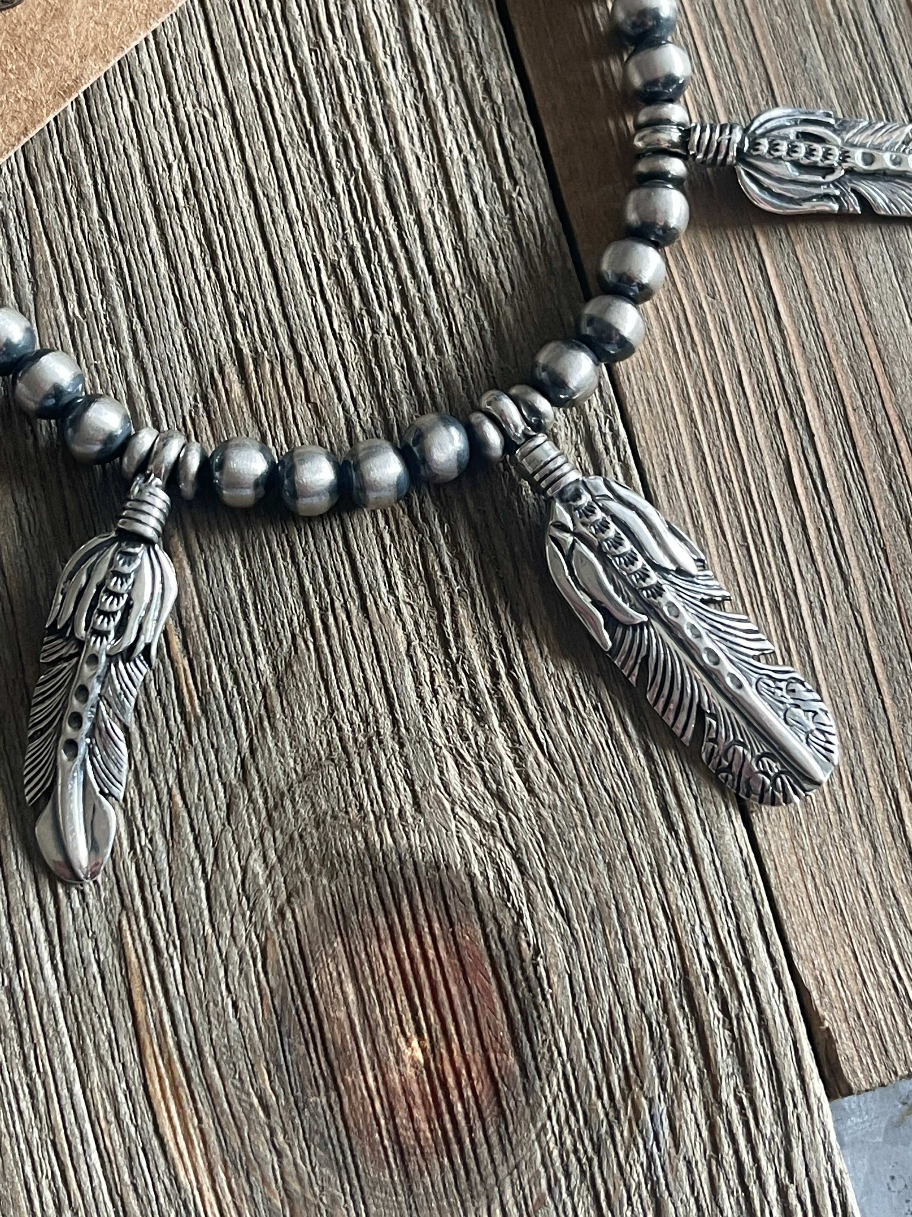 Navajo Made Sterling Silver Feather Necklace Set. The necklace measures around 21 inches long with hang while the earrings are 2 1/4 inches long. Signed by the artist and stamped sterling silver.