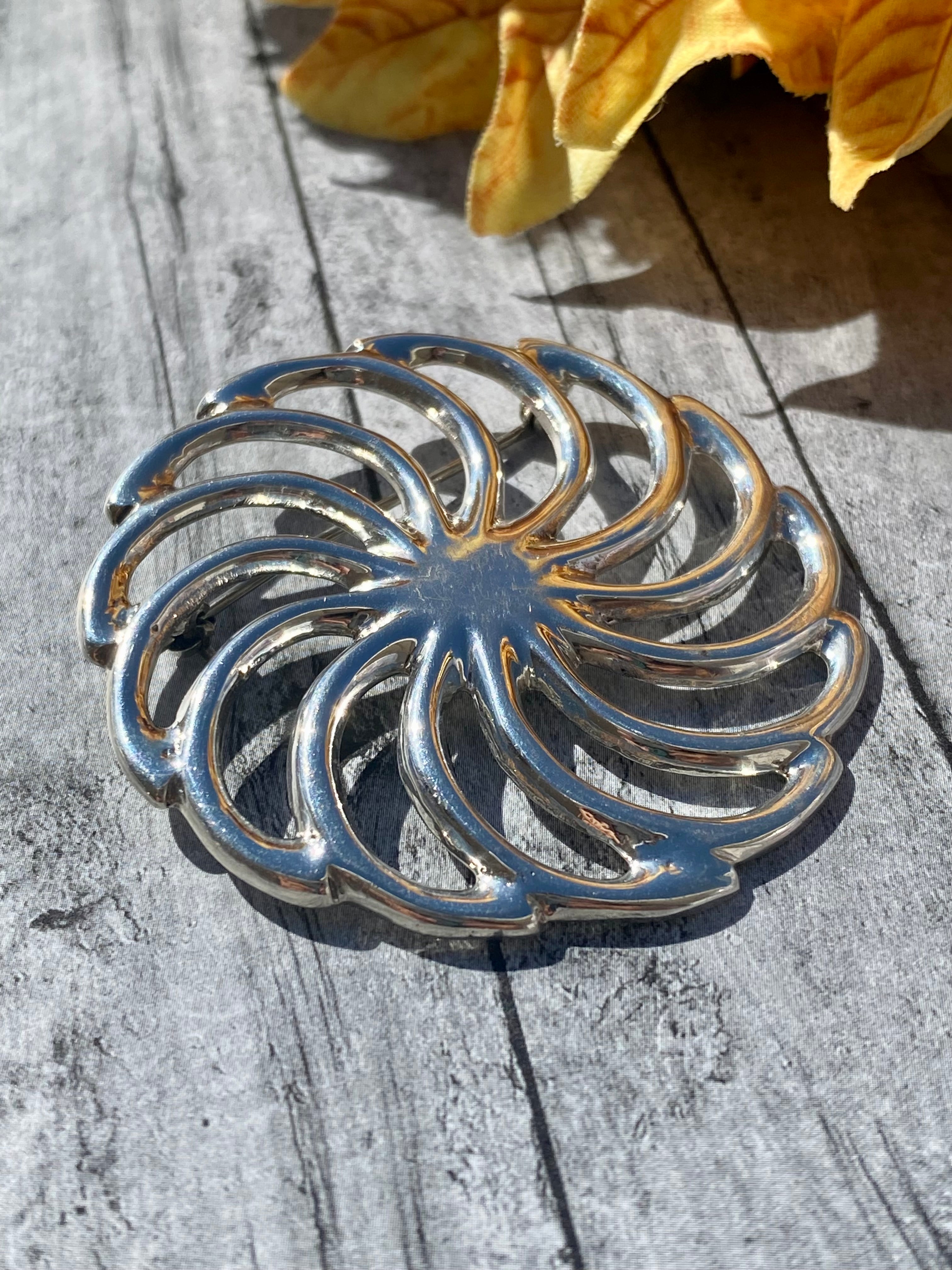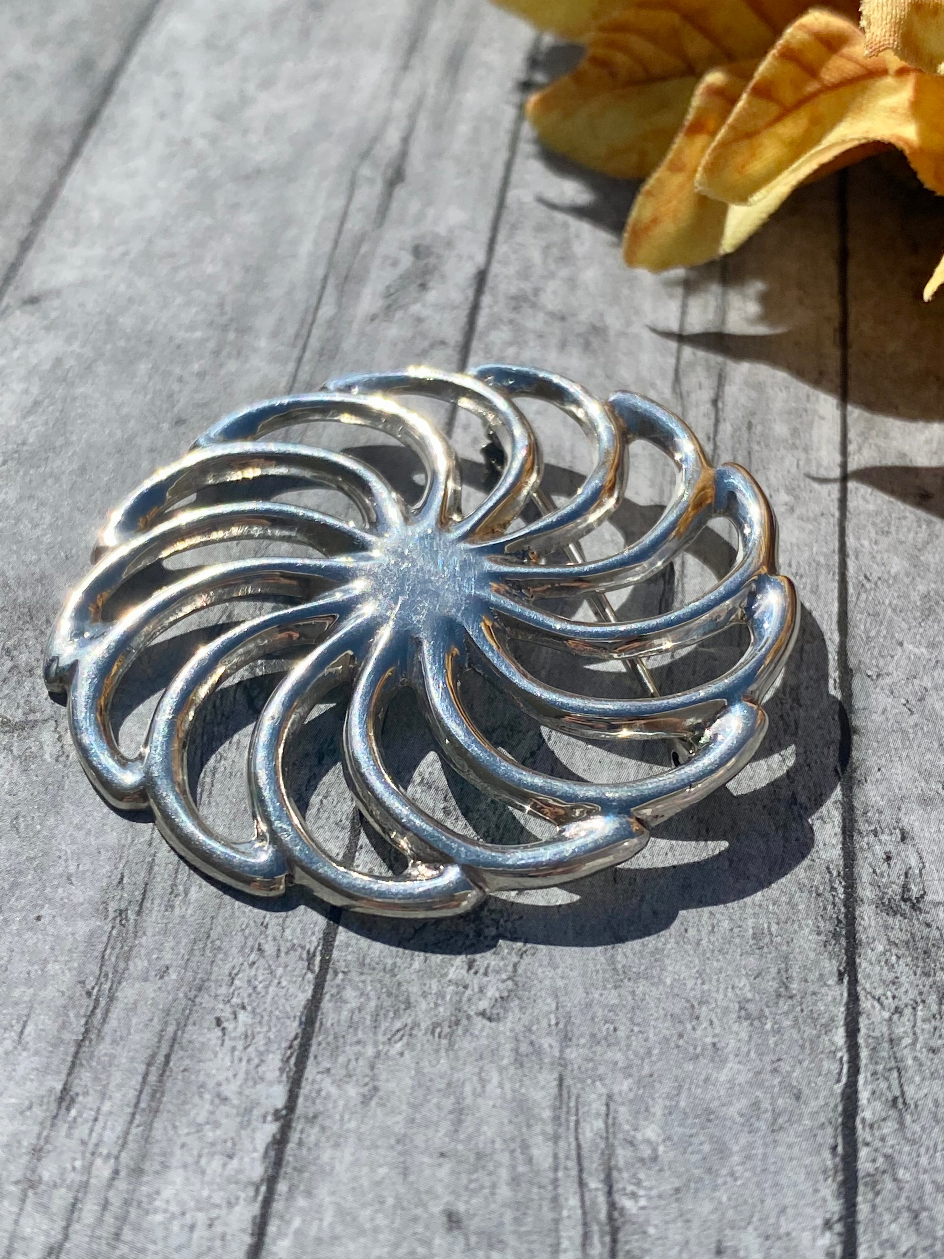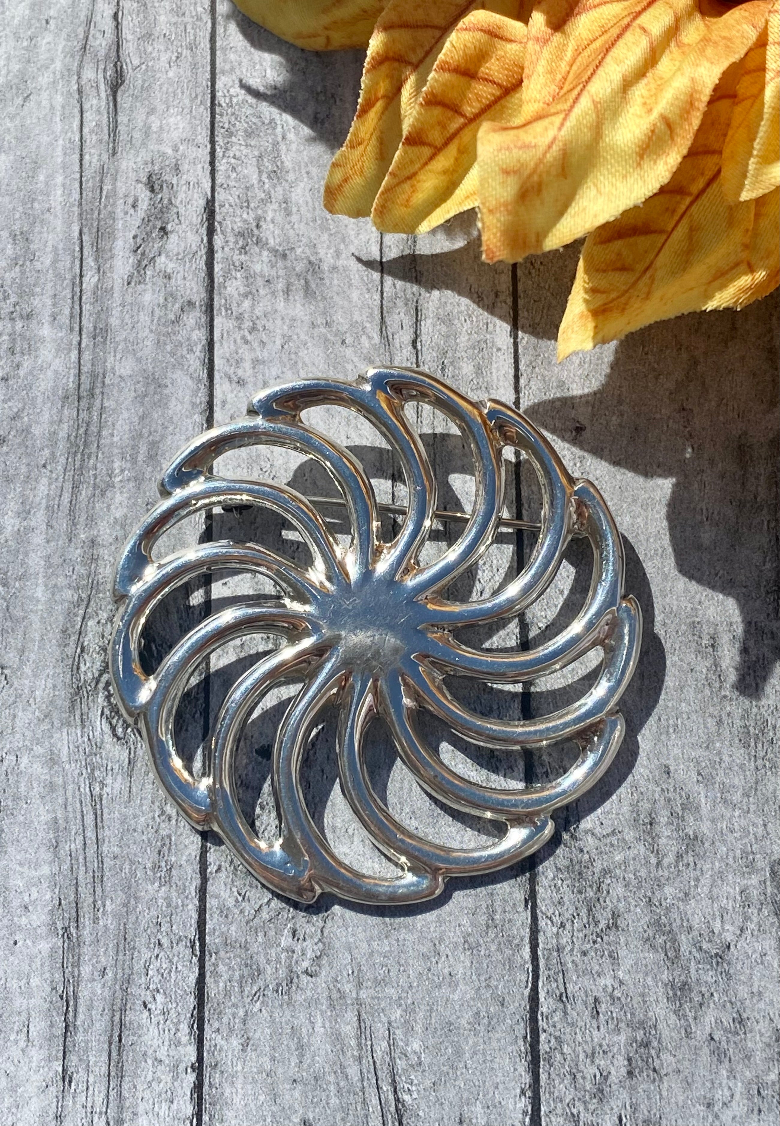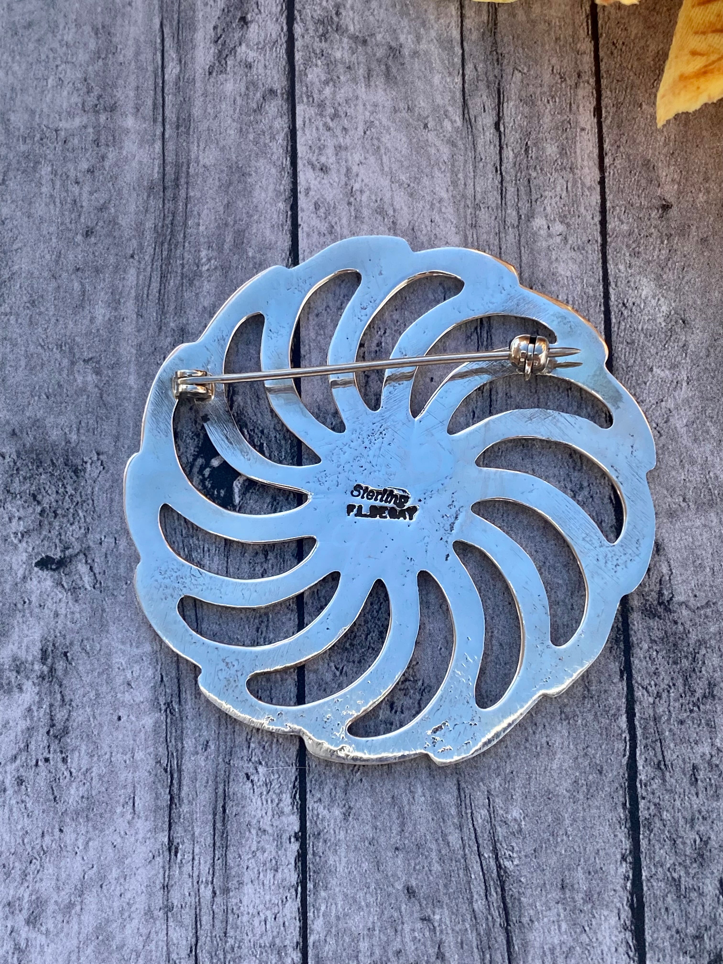 Navajo Made Sterling Silver Pin. It measures 2 inches round. Signed by the artist and stamped sterling silver.