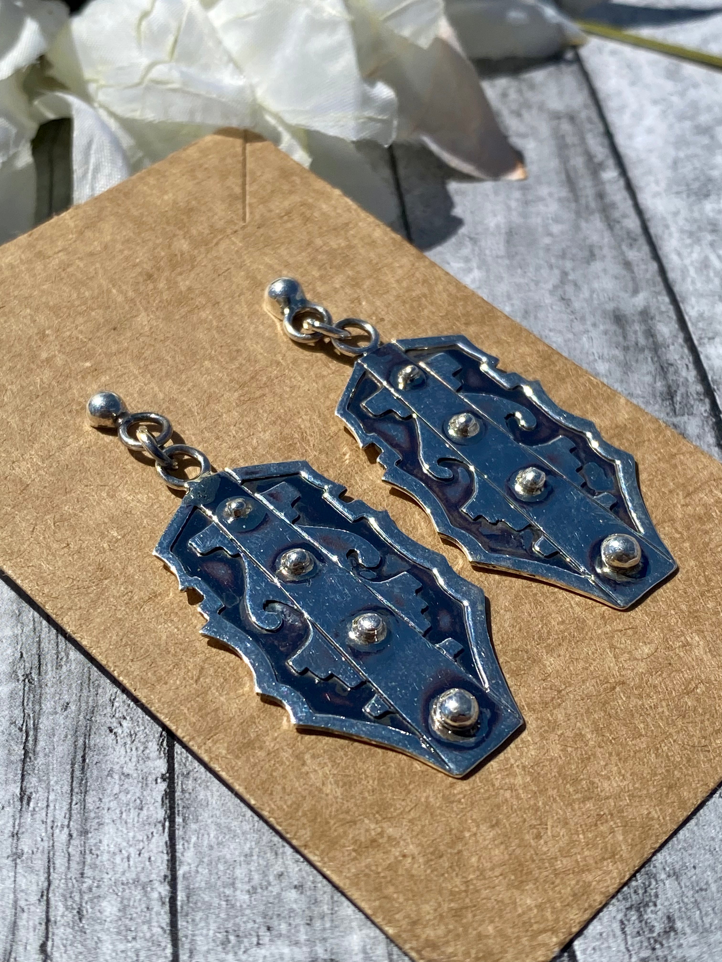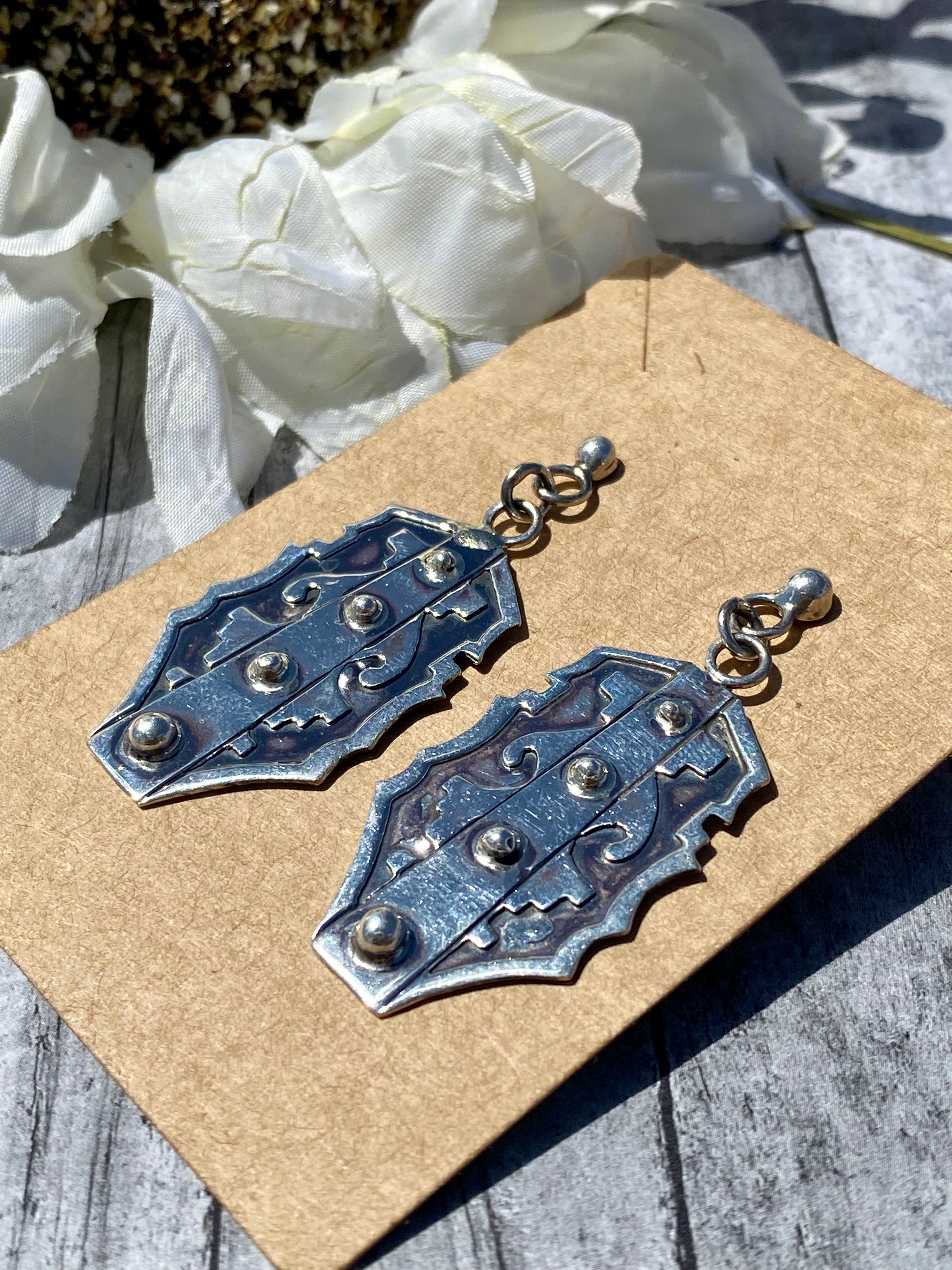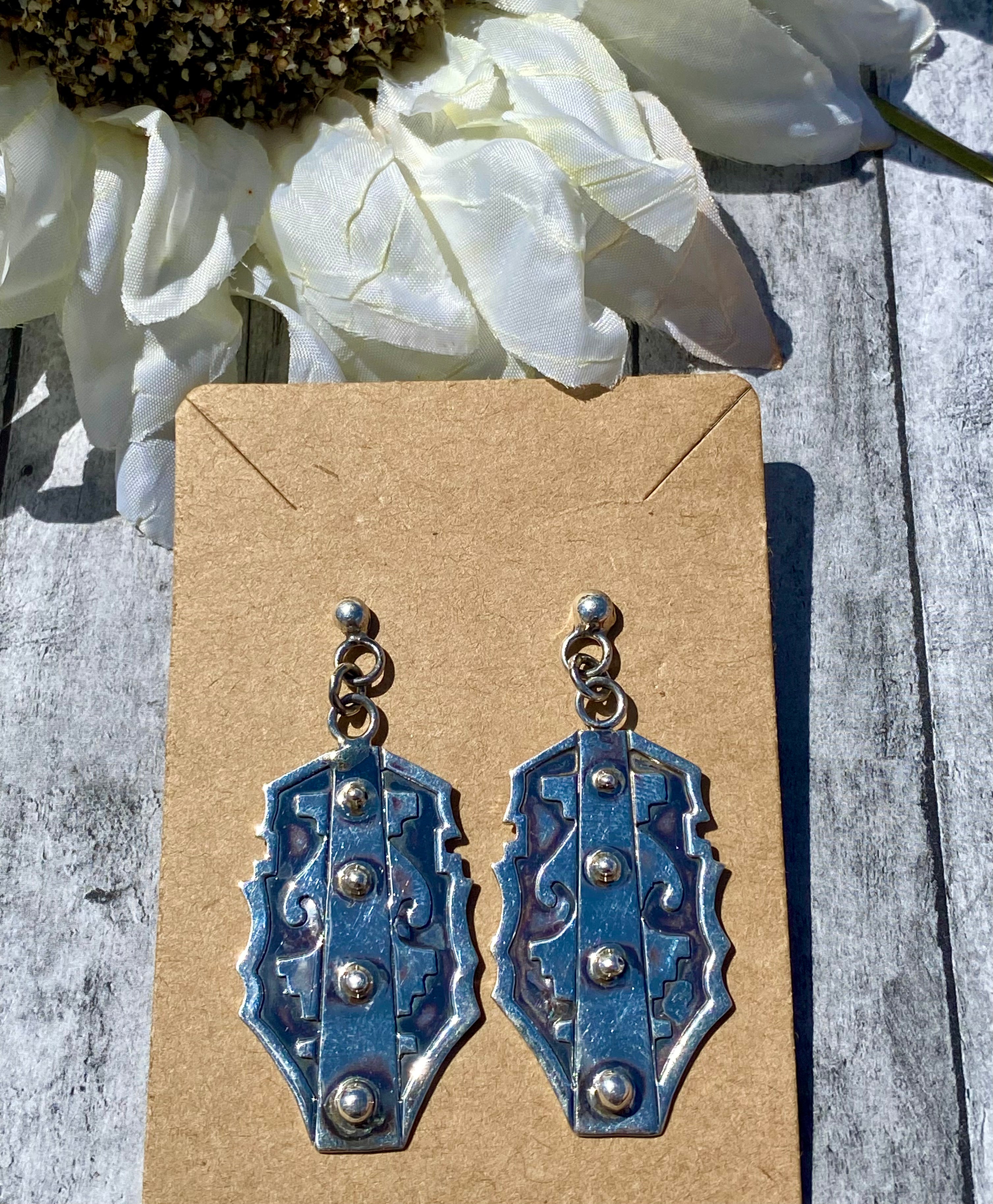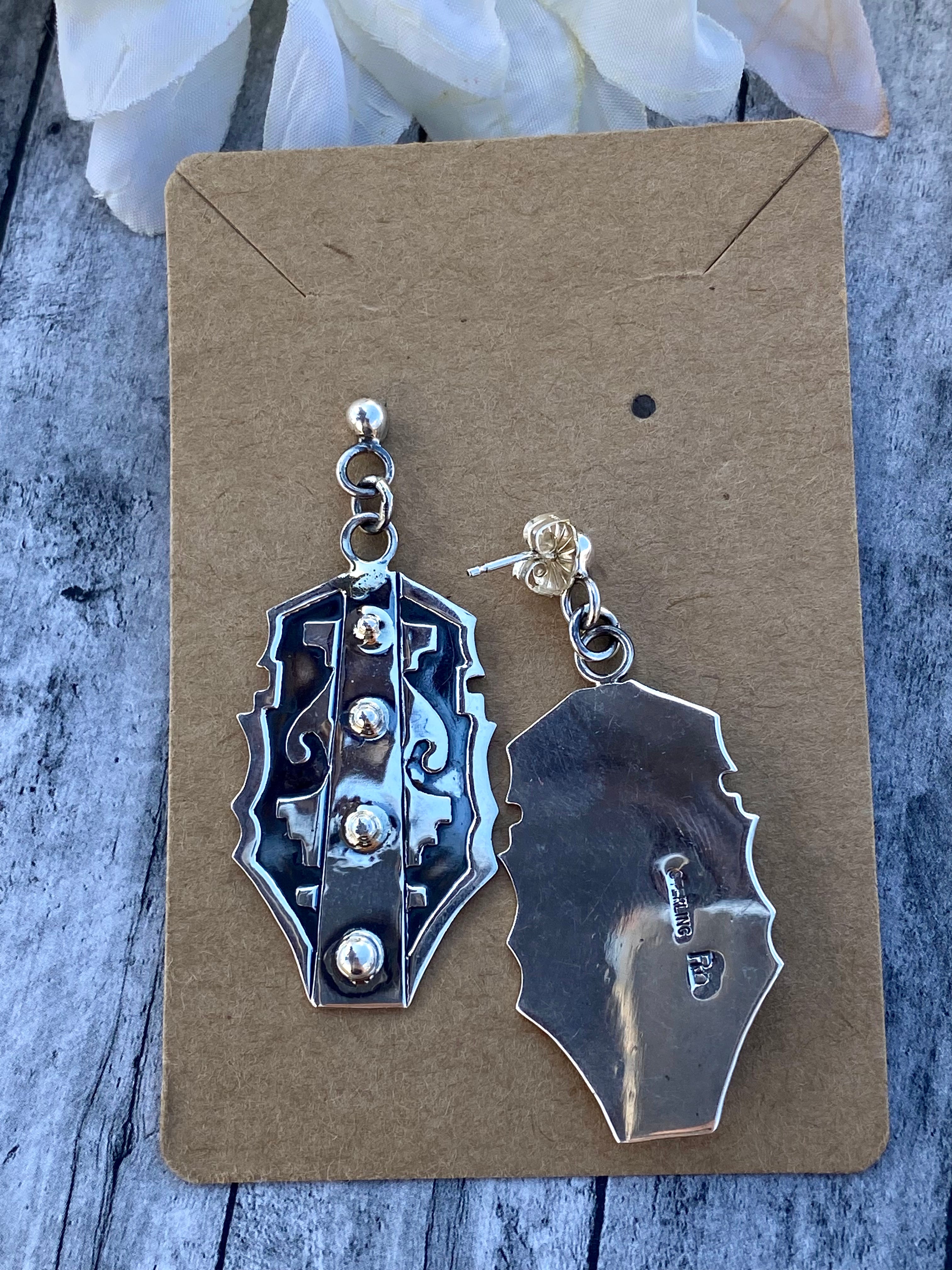 Navajo Made Sterling Silver Post Dangle Earrings. They measures 2 inches long and 7/8 of an inch wide. Signed by the artist and stamped sterling silver.