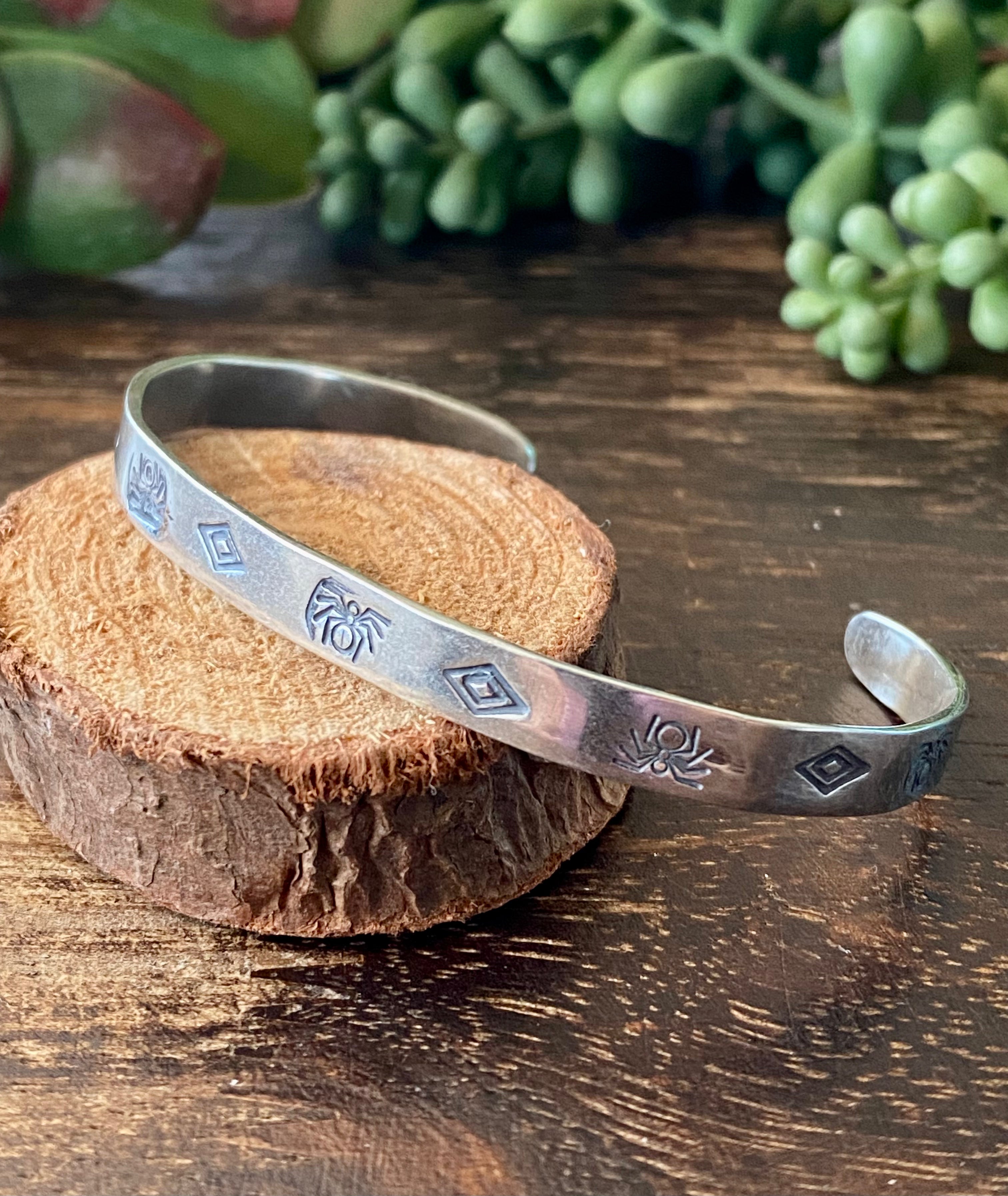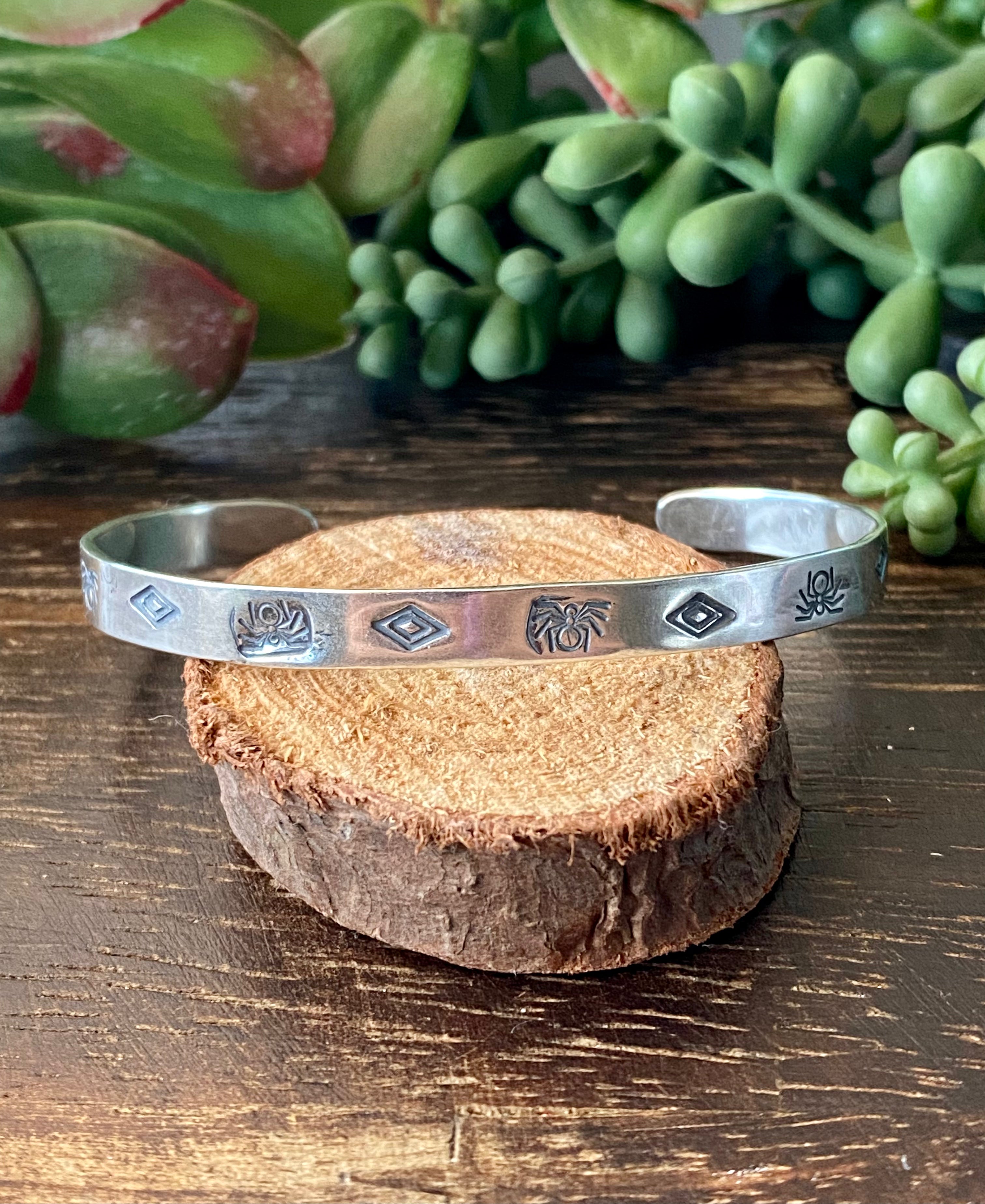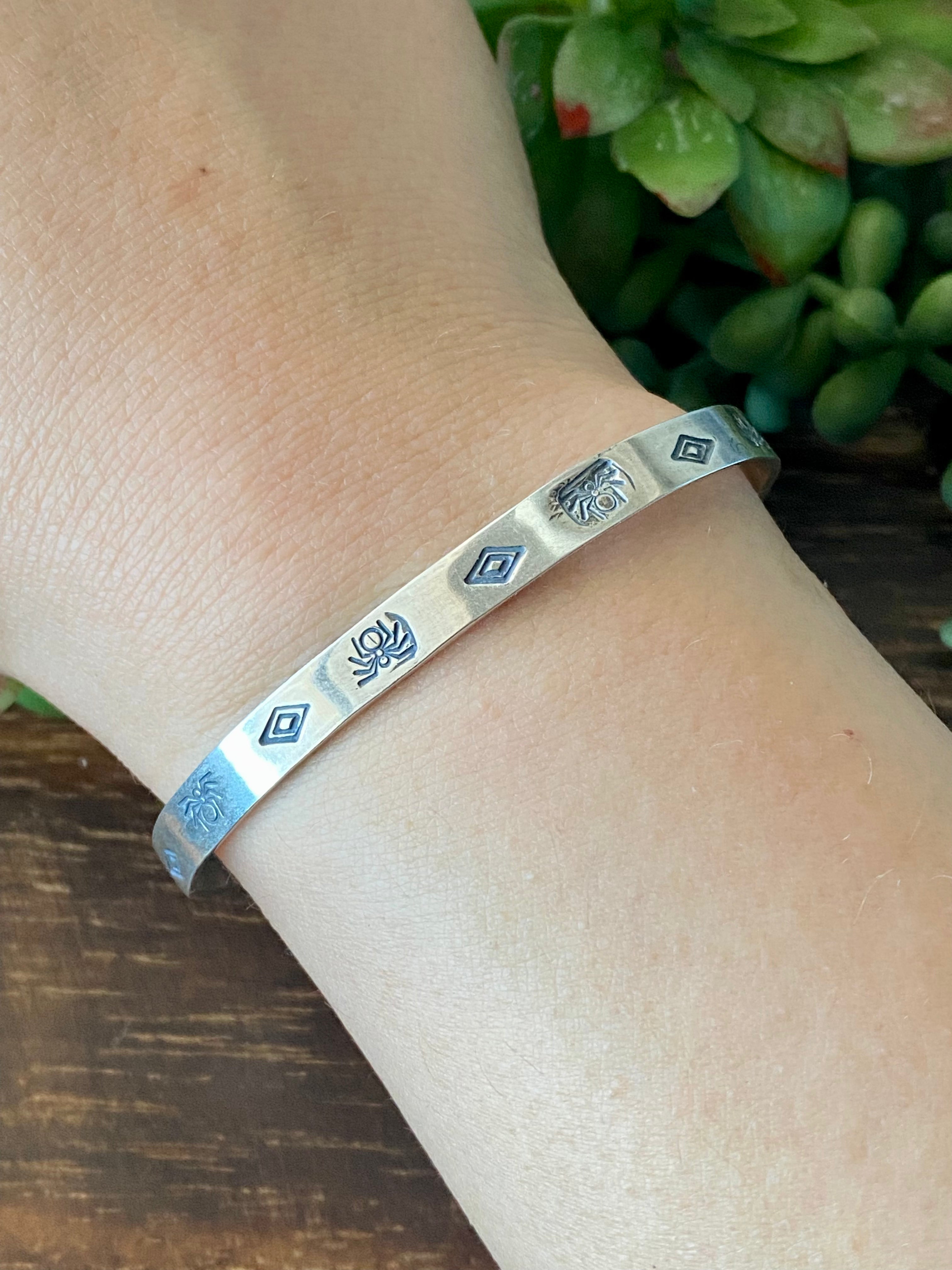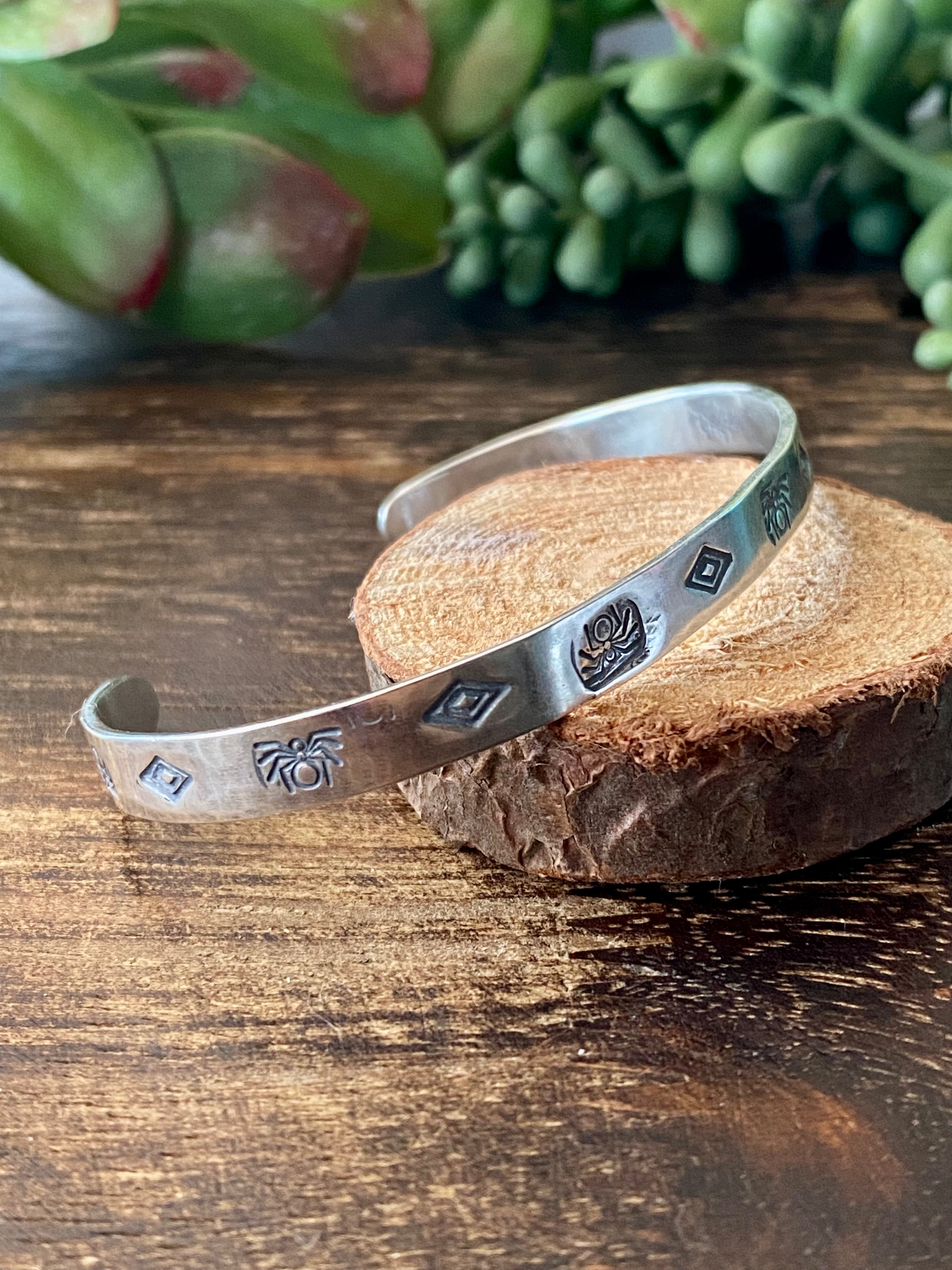 Navajo Made Sterling Silver Stacking Cuff Bracelet. It measures 1/4 of an inch wide with an inside circumference of 5 3/8 inches and a gap of 1 1/8 inches. Signed by the artist and stamped sterling silver.
